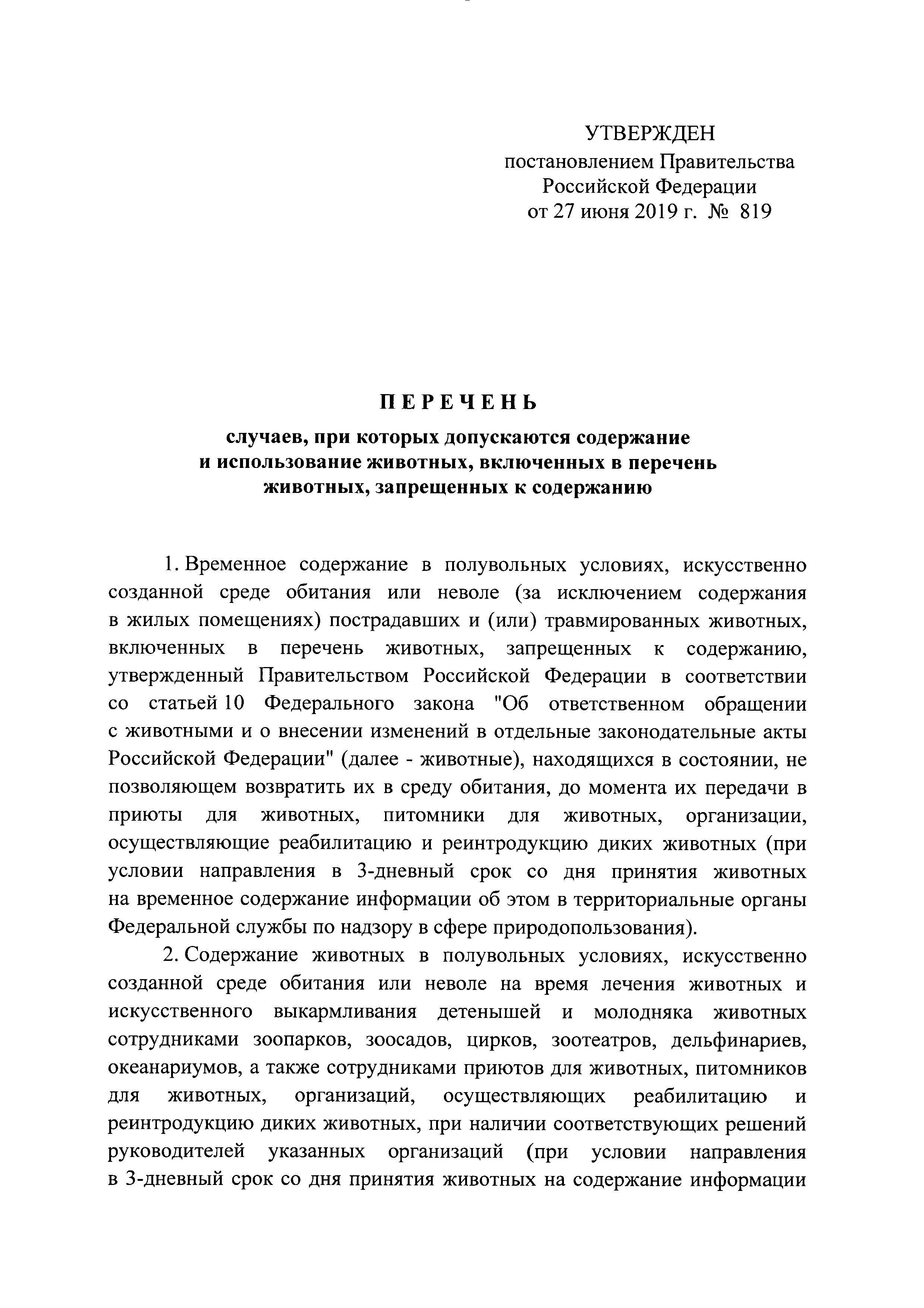 Перечень случаев, при которых допускаются содержание и использование животных, включенных в перечень животных, запрещенных к содержанию| Статус: | действует | | Название рус.: | Перечень случаев, при которых допускаются содержание и использование животных, включенных в перечень животных, запрещенных к содержанию | | Дата добавления в базу: | 01.02.2020 | | Дата актуализации: | 01.01.2021 | | Дата введения: | 06.07.2019 | | Утверждён: | 27.06.2019 Правительство Российской Федерации (819)