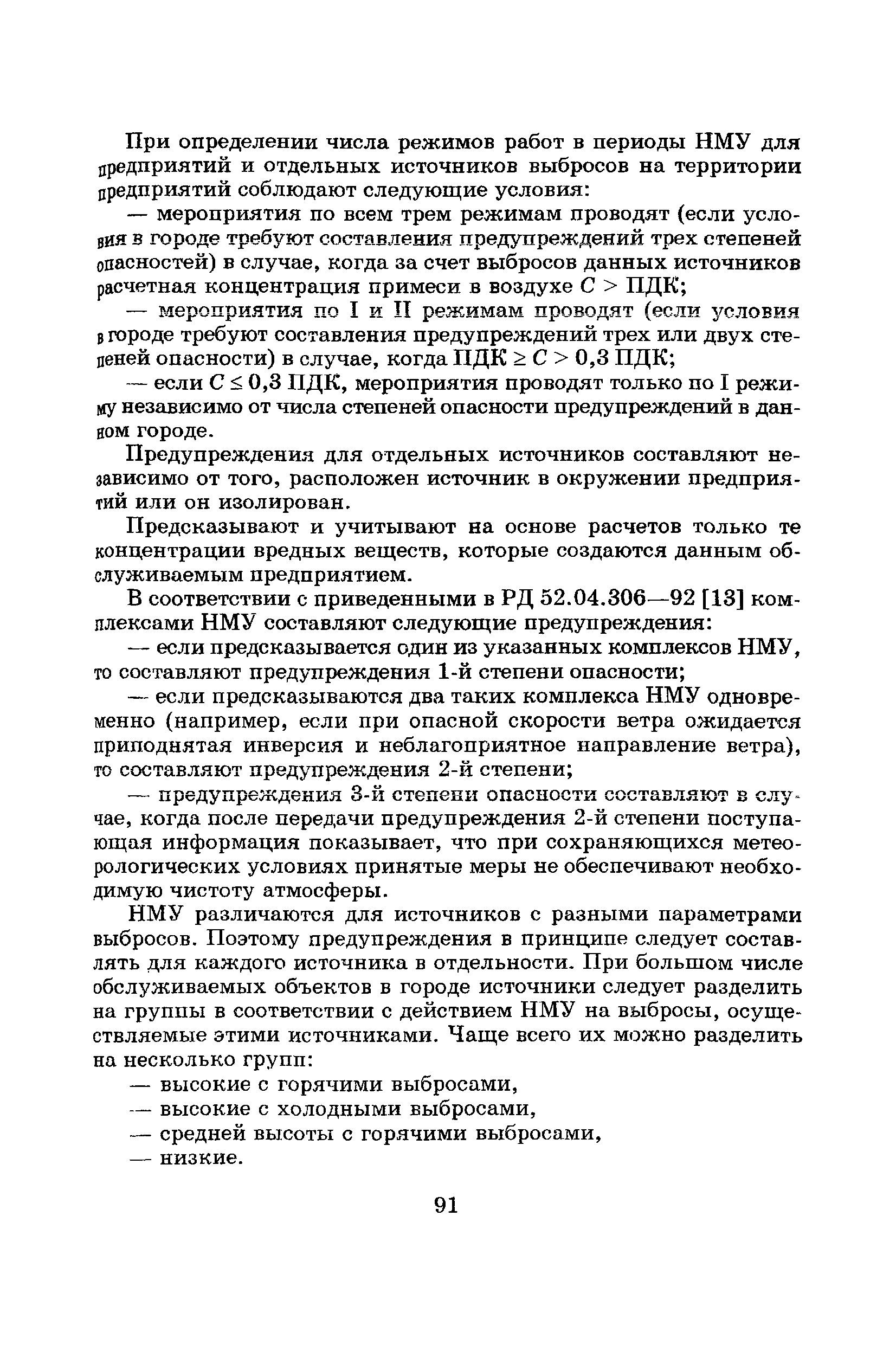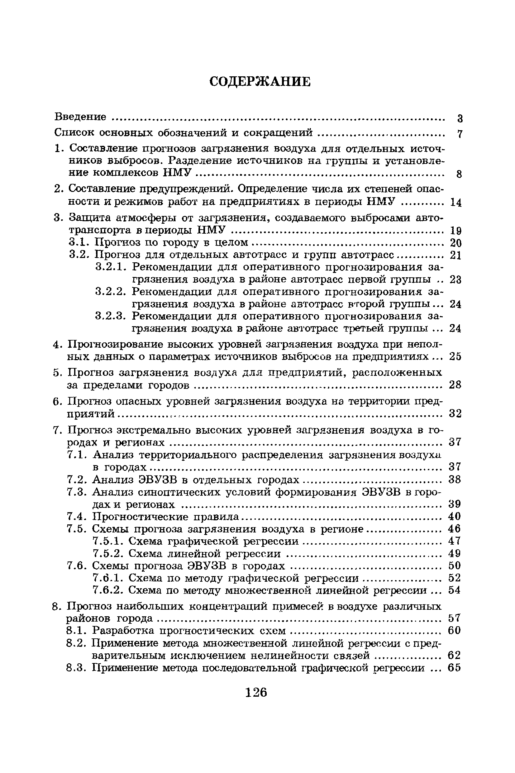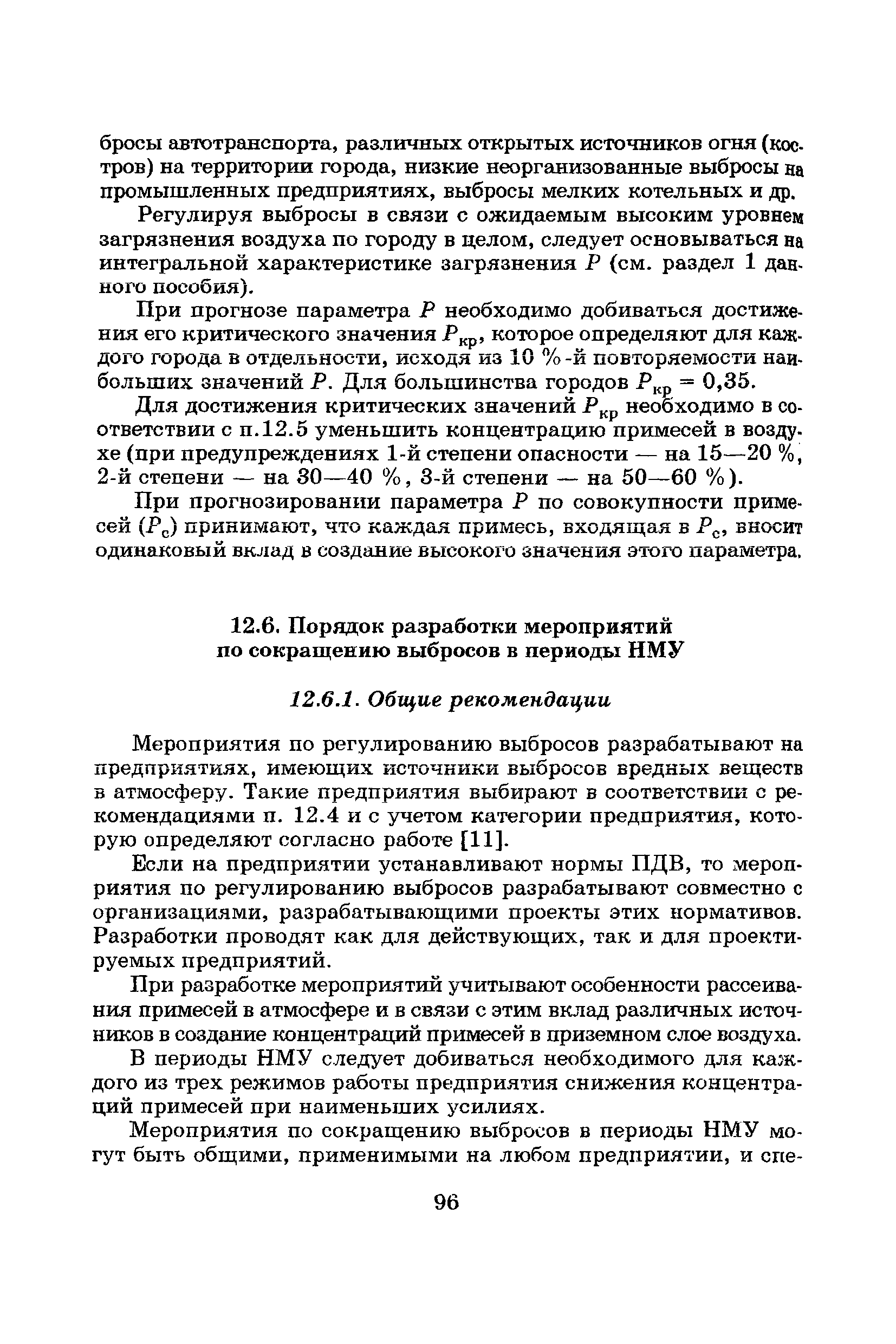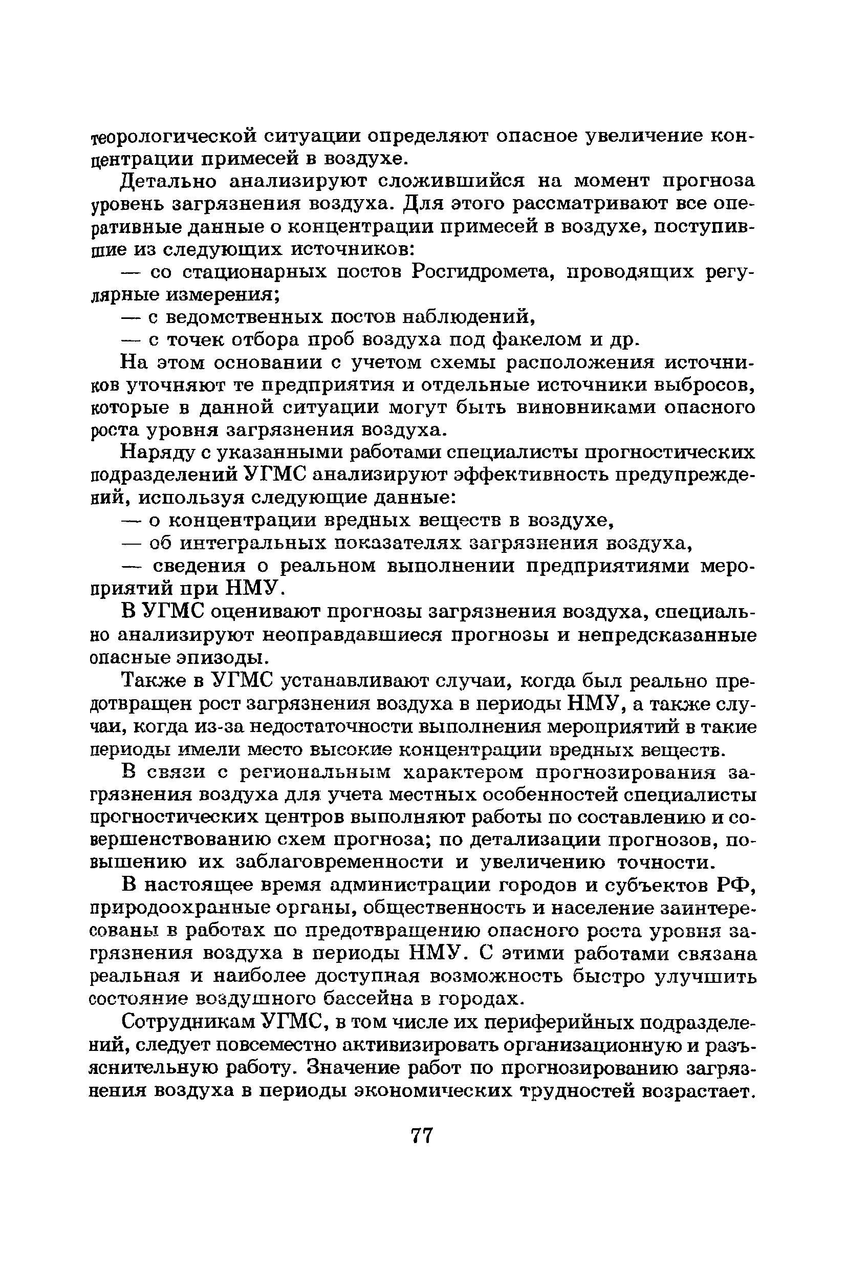 | Оглавление: | Введение Список основных обозначений и сокращений 1 Составление прогнозов загрязнения воздуха для отдельных источников выбросов. Разделение источников на группы и установление комплексов НМУ 2 Составление предупреждений. Определение числа их степеней опасности и режимов работ на предприятиях в периоды НМУ 3 Защита атмосферы от загрязнения, создаваемого выбросами автотранспорта в периоды НМУ 3.1. Прогноз по городу в целом 3.2. Прогноз для отдельных автотрасс и групп автотрасс 3.2.1. Рекомендации для оперативного прогнозирования загрязнения воздуха в районе автотрасс первой группы 3.2.2. Рекомендации для оперативного прогнозирования загрязнения воздуха в районе автотрасс второй группы 3.2.3. Рекомендации для оперативного прогнозирования загрязнения воздуха в районе автотрасс третьей группы 4 Прогнозирование высоких уровней загрязнения воздуха при неполных данных о параметрах источников выбросов на предприятиях 5 Прогноз загрязнения воздуха для предприятий, расположенных за пределами городов 6 Прогноз опасных уровней загрязнения воздуха на территории предприятий 7 Прогноз экстремально высоких уровней загрязнения воздуха в городах и регионах 7.1. Анализ территориального распределения загрязнения воздуха в городах 7.2. Анализ ЭВУЗВ в отдельных городах 7.3. Анализ синоптических условий формирования ЭВУЗВ в городах регионах 7.4. Прогностические правила 7.5. Схемы прогноза загрязнения воздуха в регионе 7.5.1. Схема графической регрессии 7.5.2. Схема линейной регрессии 7.6. Схемы прогноза ЭВУЗВ в городах 7.6.1. Схема по методу графической регрессии 7.6.2. Схема по методу множественной линейной регрессии 8 Прогноз наибольших концентраций примесей в воздухе различных районов города 8.1. Разработка прогностических схем 8.2. Применение метода множественной линейкой регрессии с предварительным исключением нелинейности связей 8.3. Применение метода последовательной графической репрессии 9 Прогноз загрязнения воздуха в городе с заблаговременностью трое суток 10 Организация работ, взаимодействие различных ведомств и учреждений в периоды НМУ 10.1. Работы, выполняемые Росгидрометом 10.2. Работы, выполняемые промышленными и транспортными предприятиями 10.3. Совместные работы подразделений Росгидромета и предприятий 10.4. Работы, выполняемые комитетами охраны природы 10.5. Работы, выполняемые Санэпидемнадзором 10.6. Работы, выполняемые ГАИ 10.7. Работы, выполняемые радиокомитетами 10.8. Работы, выполняемые администрацией субъекта РФ и города 11 Учет НМУ при разработке проекта тома ПДВ 12 Регулирование выбросов при НМУ 12.1. Общие положения 12.2. Основные принципы разработки мероприятий по регулированию выбросов 12.3. Составление предупреждений о повышении уровня загрязнения воздуха 12.3.1. Составление предупреждений для предприятий и отдельных источников 12.3.2. Составление предупреждений по городу в целом 12.4. Выбор городов и предприятий. Установление примесей, выбросы которых следует сокращать в периоды НМУ 12.5. Определение необходимого снижения концентраций примесей в воздухе и выбросов в периоды НМУ 12.5.1. Определение снижения концентраций примесей, создаваемых отдельными источниками выбросов 12.5.2. Определение необходимого снижения концентрации примесей по городу в целом 12.6. Порядок разработки мероприятий по сокращению выбросов в периоды НМУ 12.6.1. 