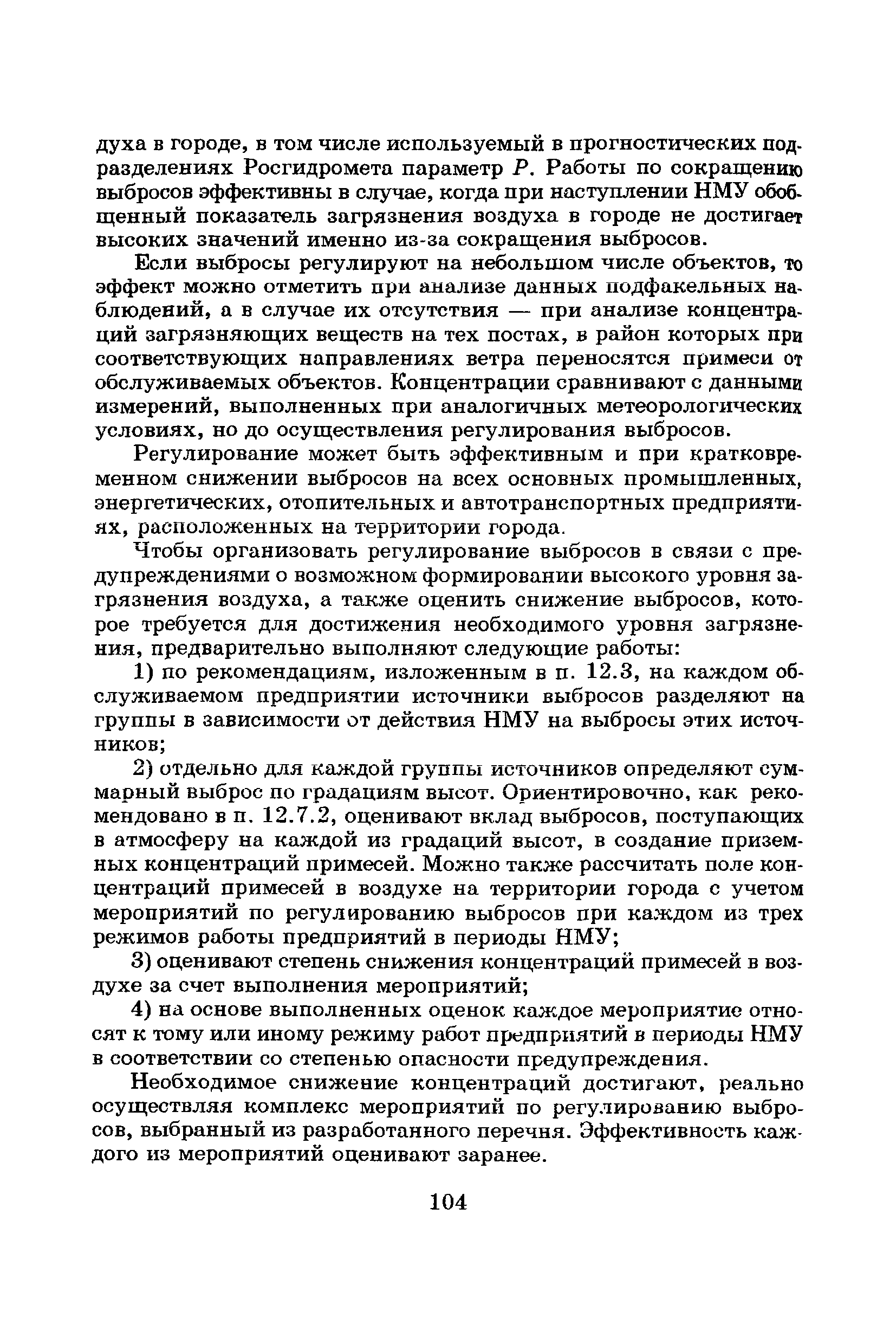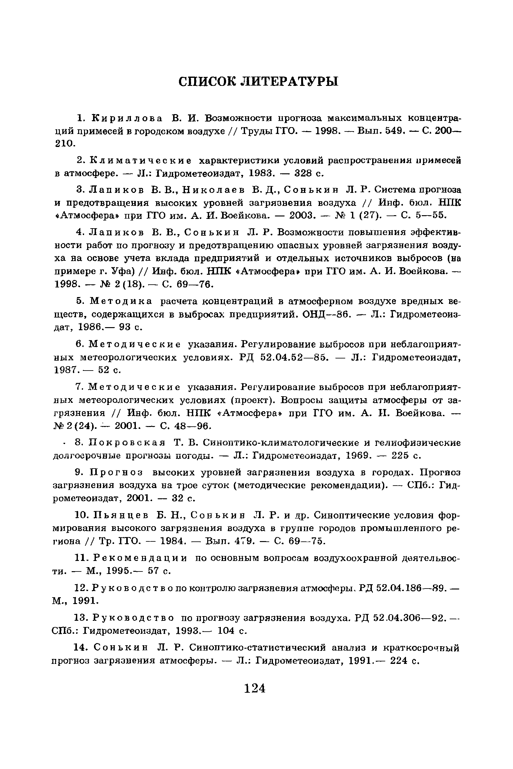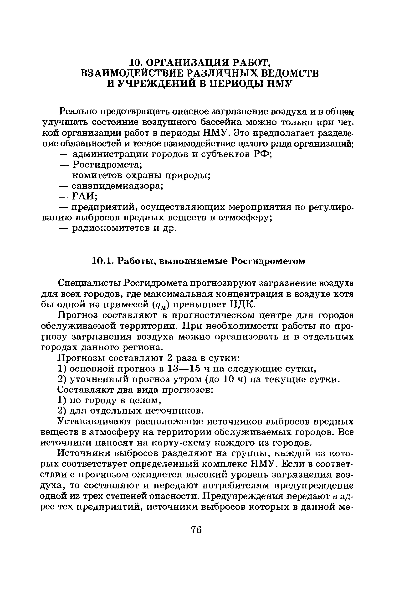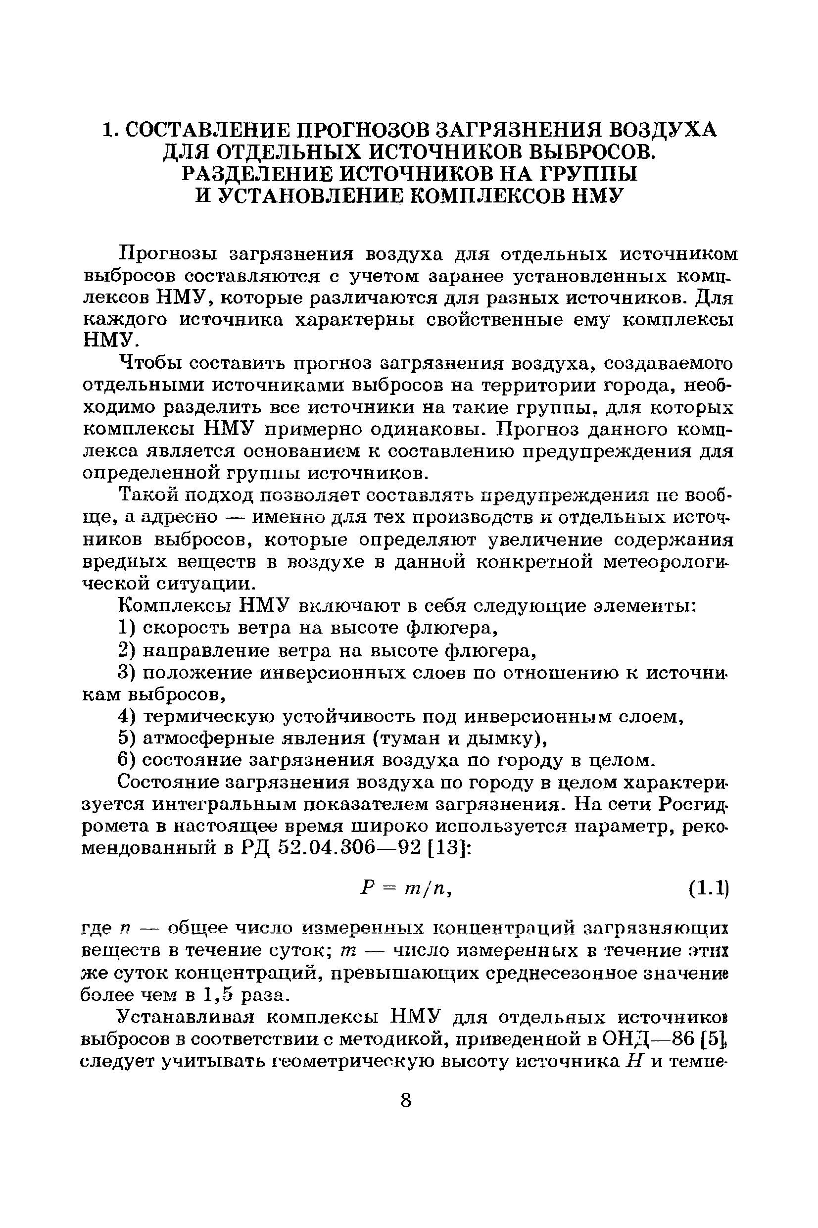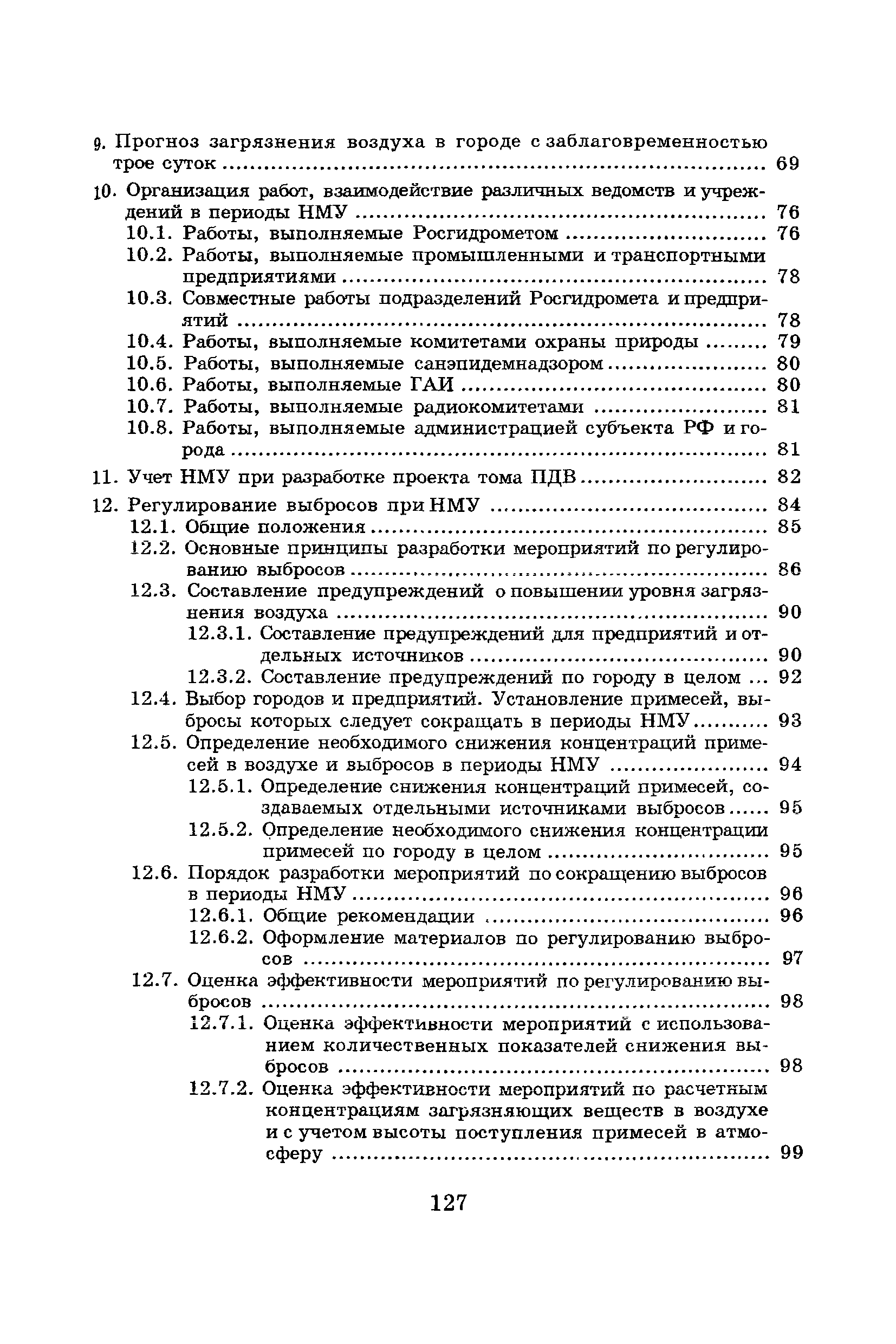 | Оглавление: | Введение Список основных обозначений и сокращений 1 Составление прогнозов загрязнения воздуха для отдельных источников выбросов. Разделение источников на группы и установление комплексов НМУ 2 Составление предупреждений. Определение числа их степеней опасности и режимов работ на предприятиях в периоды НМУ 3 Защита атмосферы от загрязнения, создаваемого выбросами автотранспорта в периоды НМУ 3.1. Прогноз по городу в целом 3.2. Прогноз для отдельных автотрасс и групп автотрасс 3.2.1. Рекомендации для оперативного прогнозирования загрязнения воздуха в районе автотрасс первой группы 3.2.2. Рекомендации для оперативного прогнозирования загрязнения воздуха в районе автотрасс второй группы 3.2.3. Рекомендации для оперативного прогнозирования загрязнения воздуха в районе автотрасс третьей группы 4 Прогнозирование высоких уровней загрязнения воздуха при неполных данных о параметрах источников выбросов на предприятиях 5 Прогноз загрязнения воздуха для предприятий, расположенных за пределами городов 6 Прогноз опасных уровней загрязнения воздуха на территории предприятий 7 Прогноз экстремально высоких уровней загрязнения воздуха в городах и регионах 7.1. Анализ территориального распределения загрязнения воздуха в городах 7.2. Анализ ЭВУЗВ в отдельных городах 7.3. Анализ синоптических условий формирования ЭВУЗВ в городах регионах 7.4. Прогностические правила 7.5. Схемы прогноза загрязнения воздуха в регионе 7.5.1. Схема графической регрессии 7.5.2. Схема линейной регрессии 7.6. Схемы прогноза ЭВУЗВ в городах 7.6.1. Схема по методу графической регрессии 7.6.2. Схема по методу множественной линейной регрессии 8 Прогноз наибольших концентраций примесей в воздухе различных районов города 8.1. Разработка прогностических схем 8.2. Применение метода множественной линейкой регрессии с предварительным исключением нелинейности связей 8.3. Применение метода последовательной графической репрессии 9 Прогноз загрязнения воздуха в городе с заблаговременностью трое суток 10 Организация работ, взаимодействие различных ведомств и учреждений в периоды НМУ 10.1. Работы, выполняемые Росгидрометом 10.2. Работы, выполняемые промышленными и транспортными предприятиями 10.3. Совместные работы подразделений Росгидромета и предприятий 10.4. Работы, выполняемые комитетами охраны природы 10.5. Работы, выполняемые Санэпидемнадзором 10.6. Работы, выполняемые ГАИ 10.7. Работы, выполняемые радиокомитетами 10.8. Работы, выполняемые администрацией субъекта РФ и города 11 Учет НМУ при разработке проекта тома ПДВ 12 Регулирование выбросов при НМУ 12.1. Общие положения 12.2. Основные принципы разработки мероприятий по регулированию выбросов 12.3. Составление предупреждений о повышении уровня загрязнения воздуха 12.3.1. Составление предупреждений для предприятий и отдельных источников 12.3.2. Составление предупреждений по городу в целом 12.4. Выбор городов и предприятий. Установление примесей, выбросы которых следует сокращать в периоды НМУ 12.5. Определение необходимого снижения концентраций примесей в воздухе и выбросов в периоды НМУ 12.5.1. Определение снижения концентраций примесей, создаваемых отдельными источниками выбросов 12.5.2. Определение необходимого снижения концентрации примесей по городу в целом 12.6. Порядок разработки мероприятий по сокращению выбросов в периоды НМУ 12.6.1. 