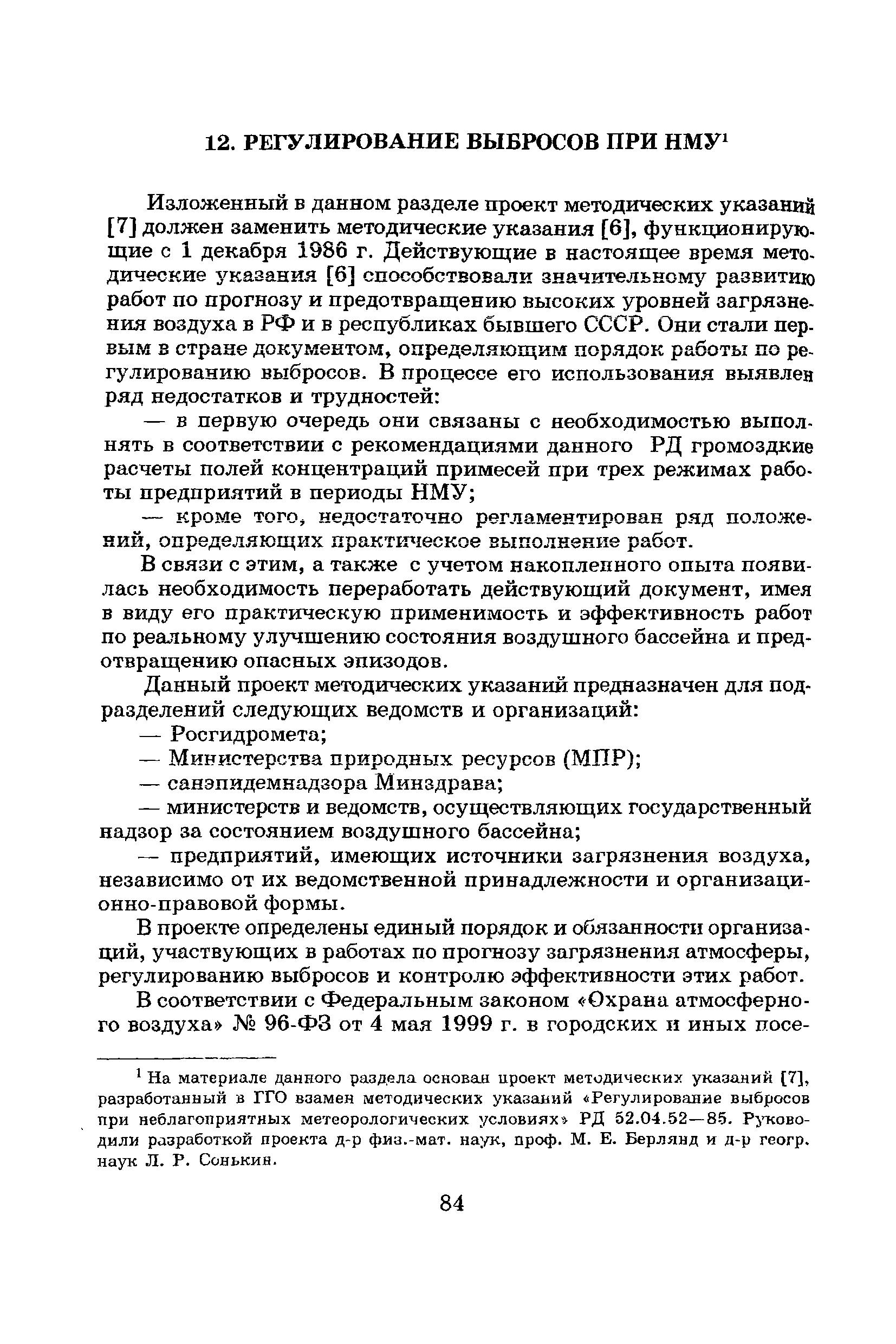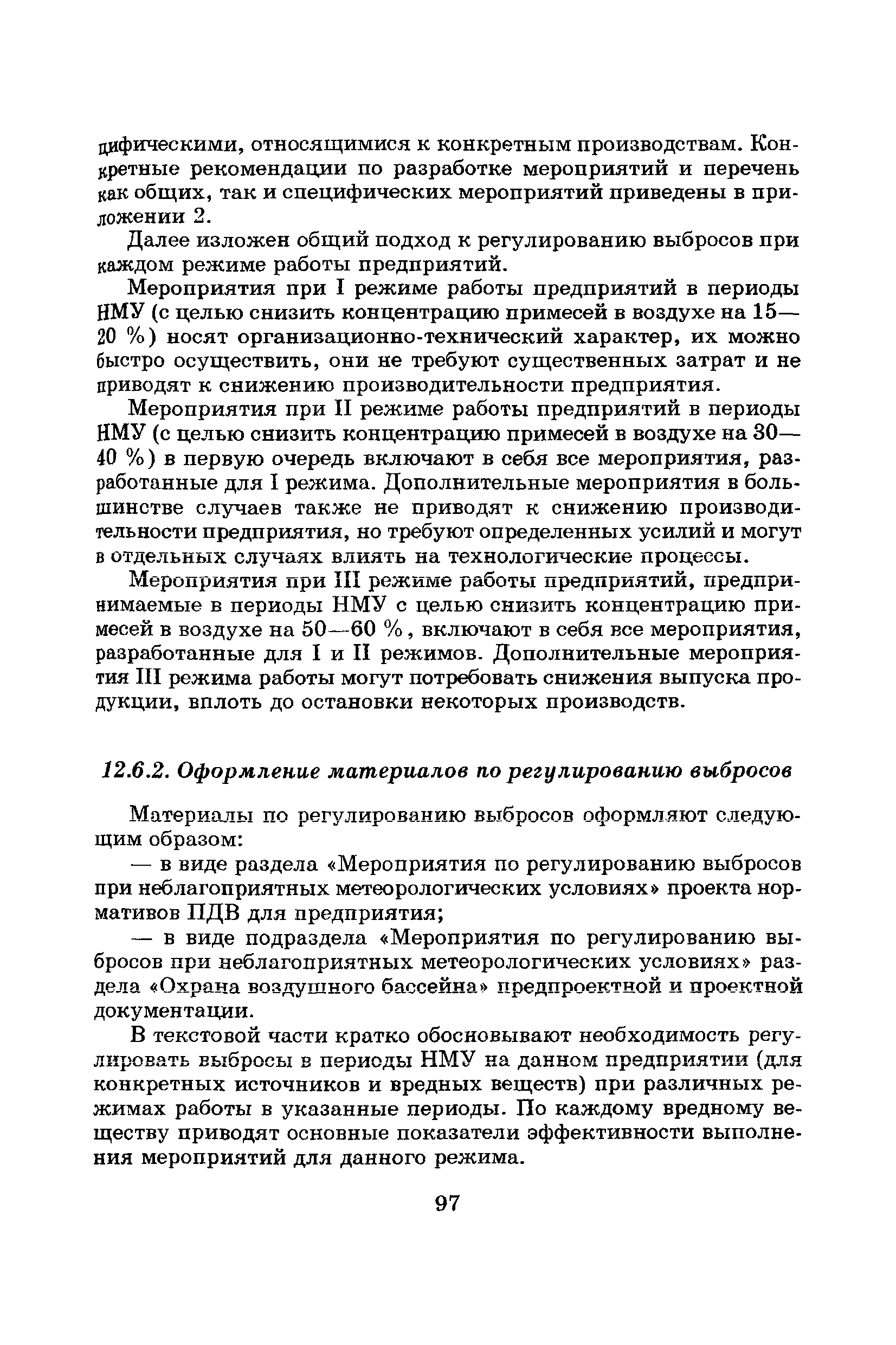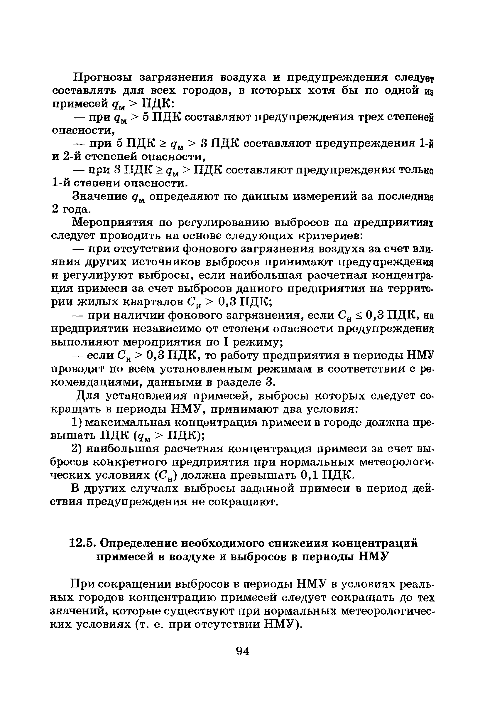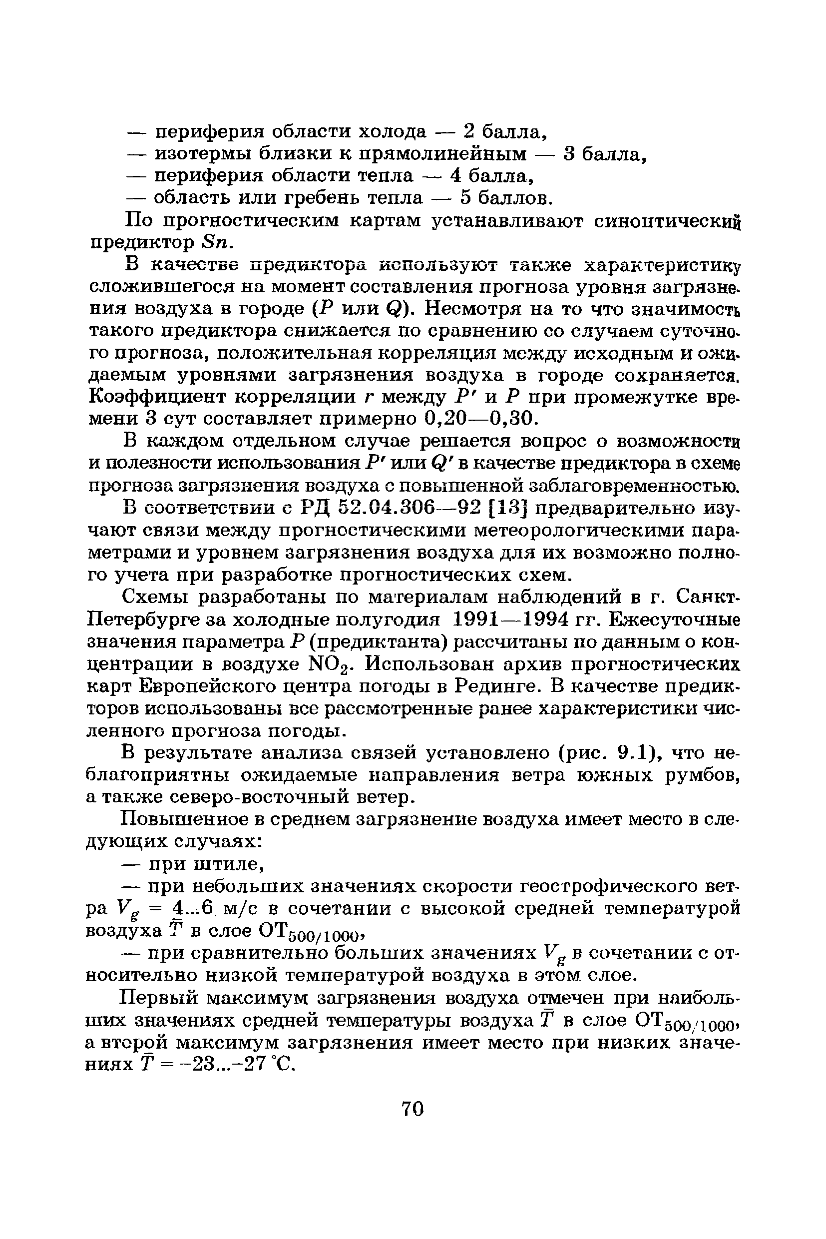 | Оглавление: | Введение Список основных обозначений и сокращений 1 Составление прогнозов загрязнения воздуха для отдельных источников выбросов. Разделение источников на группы и установление комплексов НМУ 2 Составление предупреждений. Определение числа их степеней опасности и режимов работ на предприятиях в периоды НМУ 3 Защита атмосферы от загрязнения, создаваемого выбросами автотранспорта в периоды НМУ 3.1. Прогноз по городу в целом 3.2. Прогноз для отдельных автотрасс и групп автотрасс 3.2.1. Рекомендации для оперативного прогнозирования загрязнения воздуха в районе автотрасс первой группы 3.2.2. Рекомендации для оперативного прогнозирования загрязнения воздуха в районе автотрасс второй группы 3.2.3. Рекомендации для оперативного прогнозирования загрязнения воздуха в районе автотрасс третьей группы 4 Прогнозирование высоких уровней загрязнения воздуха при неполных данных о параметрах источников выбросов на предприятиях 5 Прогноз загрязнения воздуха для предприятий, расположенных за пределами городов 6 Прогноз опасных уровней загрязнения воздуха на территории предприятий 7 Прогноз экстремально высоких уровней загрязнения воздуха в городах и регионах 7.1. Анализ территориального распределения загрязнения воздуха в городах 7.2. Анализ ЭВУЗВ в отдельных городах 7.3. Анализ синоптических условий формирования ЭВУЗВ в городах регионах 7.4. Прогностические правила 7.5. Схемы прогноза загрязнения воздуха в регионе 7.5.1. Схема графической регрессии 7.5.2. Схема линейной регрессии 7.6. Схемы прогноза ЭВУЗВ в городах 7.6.1. Схема по методу графической регрессии 7.6.2. Схема по методу множественной линейной регрессии 8 Прогноз наибольших концентраций примесей в воздухе различных районов города 8.1. Разработка прогностических схем 8.2. Применение метода множественной линейкой регрессии с предварительным исключением нелинейности связей 8.3. Применение метода последовательной графической репрессии 9 Прогноз загрязнения воздуха в городе с заблаговременностью трое суток 10 Организация работ, взаимодействие различных ведомств и учреждений в периоды НМУ 10.1. Работы, выполняемые Росгидрометом 10.2. Работы, выполняемые промышленными и транспортными предприятиями 10.3. Совместные работы подразделений Росгидромета и предприятий 10.4. Работы, выполняемые комитетами охраны природы 10.5. Работы, выполняемые Санэпидемнадзором 10.6. Работы, выполняемые ГАИ 10.7. Работы, выполняемые радиокомитетами 10.8. Работы, выполняемые администрацией субъекта РФ и города 11 Учет НМУ при разработке проекта тома ПДВ 12 Регулирование выбросов при НМУ 12.1. Общие положения 12.2. Основные принципы разработки мероприятий по регулированию выбросов 12.3. Составление предупреждений о повышении уровня загрязнения воздуха 12.3.1. Составление предупреждений для предприятий и отдельных источников 12.3.2. Составление предупреждений по городу в целом 12.4. Выбор городов и предприятий. Установление примесей, выбросы которых следует сокращать в периоды НМУ 12.5. Определение необходимого снижения концентраций примесей в воздухе и выбросов в периоды НМУ 12.5.1. Определение снижения концентраций примесей, создаваемых отдельными источниками выбросов 12.5.2. Определение необходимого снижения концентрации примесей по городу в целом 12.6. Порядок разработки мероприятий по сокращению выбросов в периоды НМУ 12.6.1. 