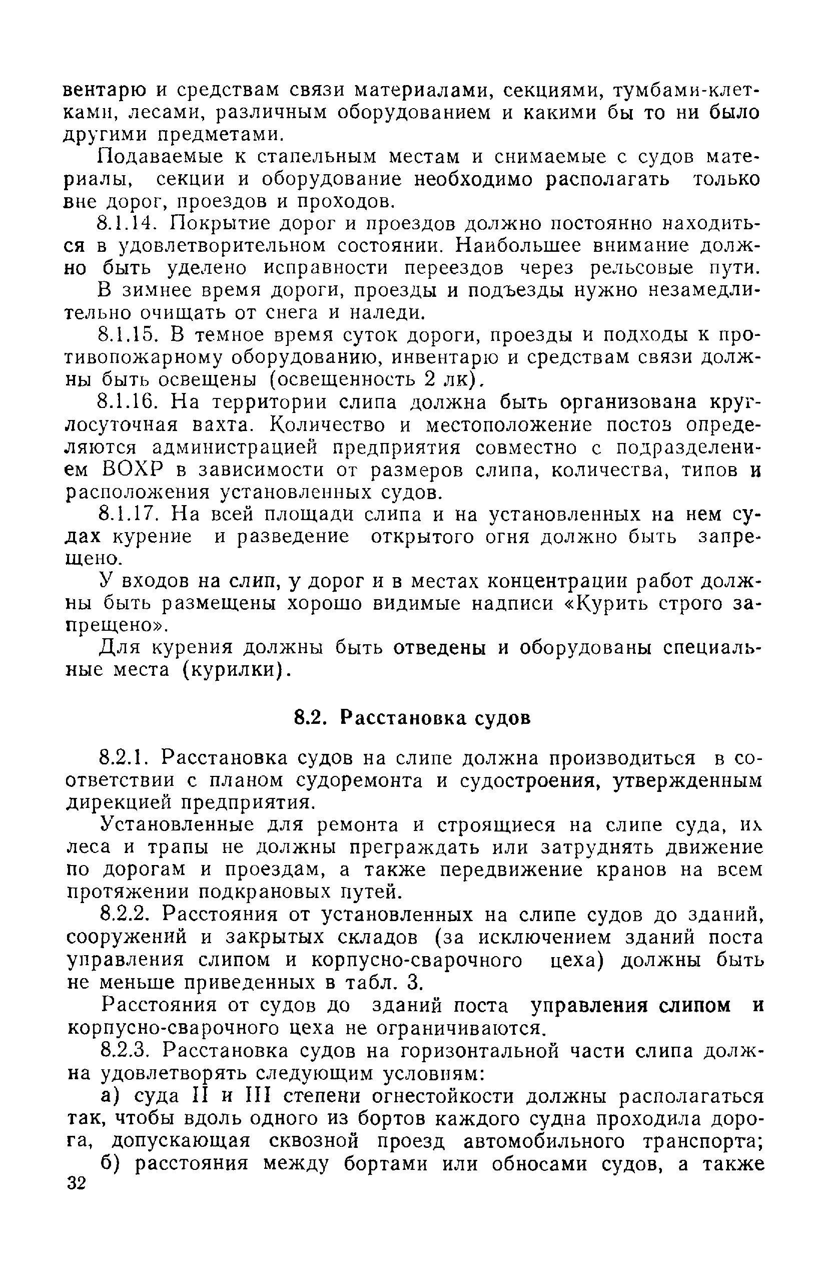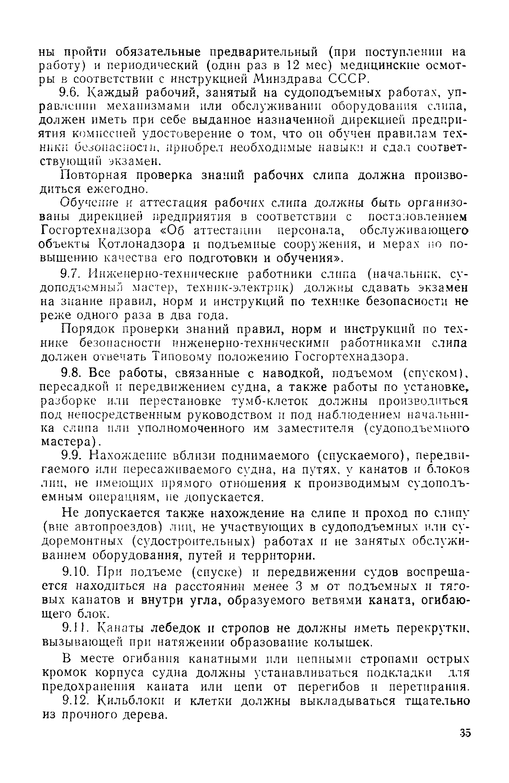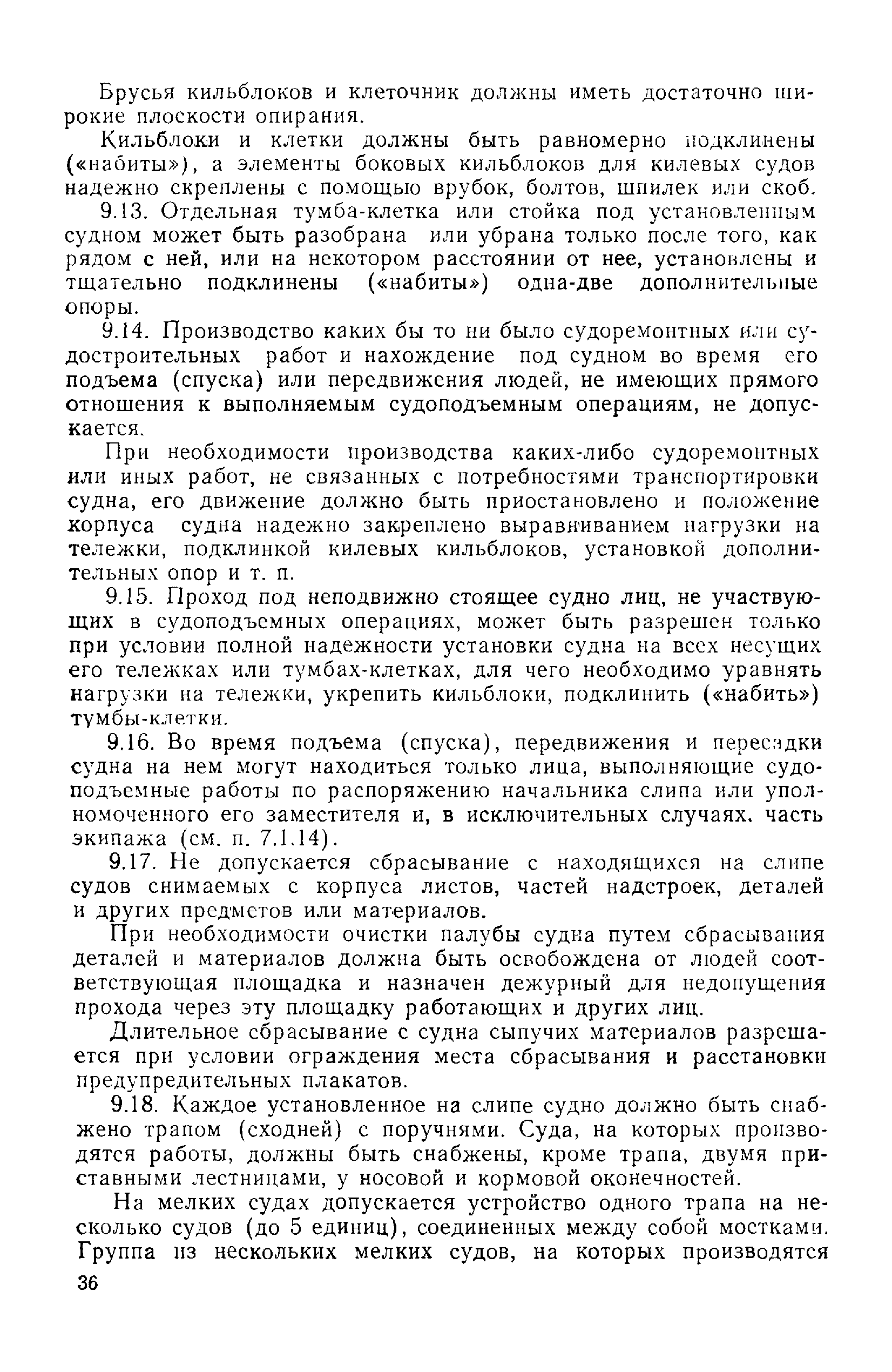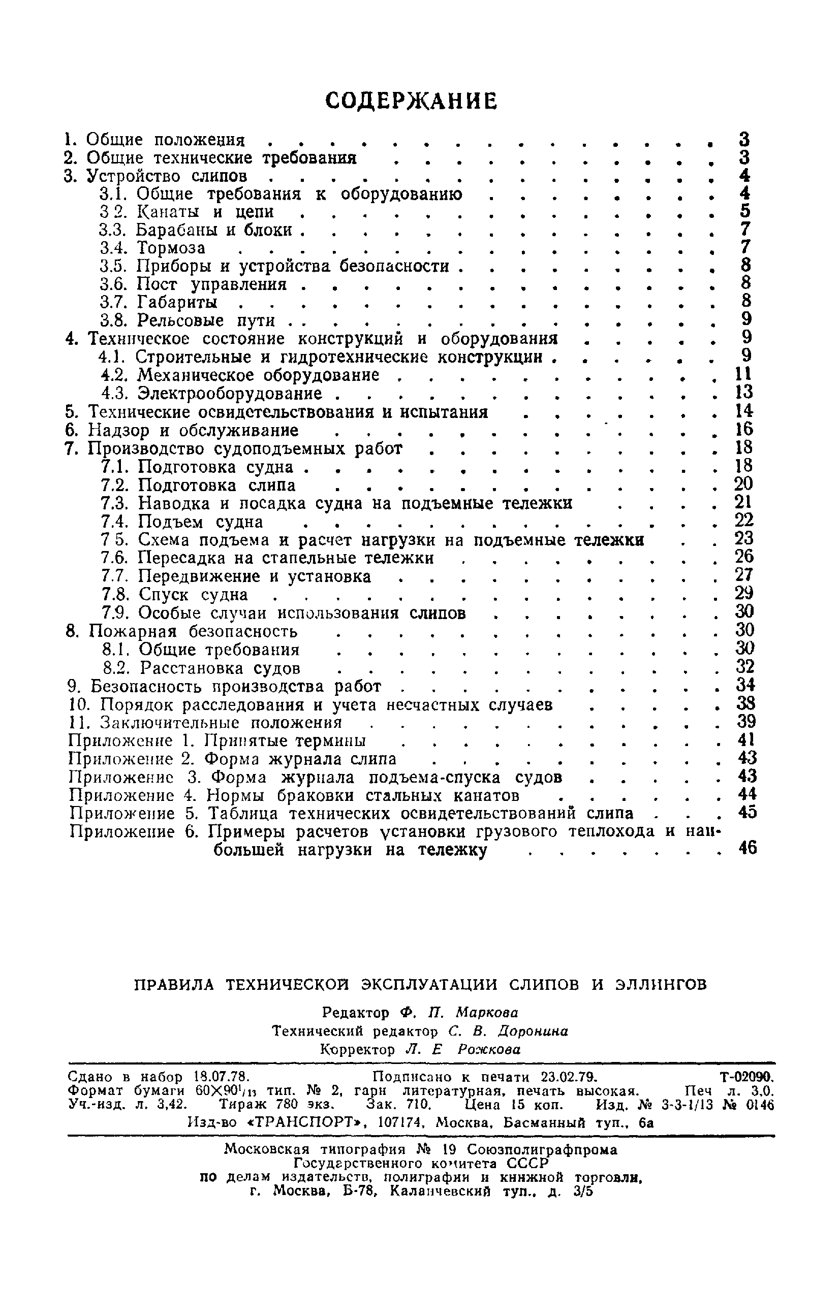 | Оглавление: | 1 Общие положения 2 Общие технические требования 3 Устройство слипов 3.1. Общие требования к оборудованию 3.2. Канаты и цепи 3.3. Барабаны и блоки 3.4. Тормоза 3.5. Приборы и устройства безопасности 3.6. Пост управления 3.7. Габариты 3.8. Рельсовые пути 4. Техническое состояние конструкций и оборудования 4.1. Строительные и гидротехнические конструкции 4.2. Механическое оборудование 4.3. Электрооборудование 5 Технические освидетельствования и испытания 6 Надзор и обслуживание 7 Производство судоподъемных работ 7.1. Подготовка судна 7.2. Подготовка слипа 7.3. Наводка и посадка судна на подъемные тележки 7.4. Подъем судна 7 5. Схема подъема и расчет нагрузки на подъемные тележки 7.6. Пересадка на стапельные тележки 7.7. Передвижение н установка 7.8. Спуск судна 7.9. Особые случаи использования слипов 8 Пожарная безопасность 8.1. Общие требования 8.2. Расстановка судов 9 Безопасность производства работ 10 Порядок расследовании и учета несчастных случаев 11 Заключительные положения Приложение 1. Принятые термины Приложение 2. Форма журнала слипа Приложение 3. Форма журнала подъема-спуска судов Приложение 4. Нормы браковки стальных канатов Приложение 5. Таблица технических освидетельствований слипа Приложение 6. Примеры расчетов установки грузового теплохода и наибольшей нагрузки на тележку |