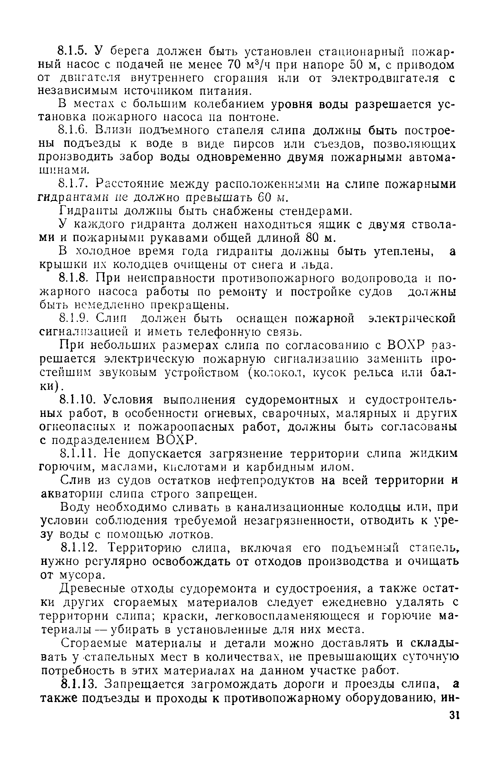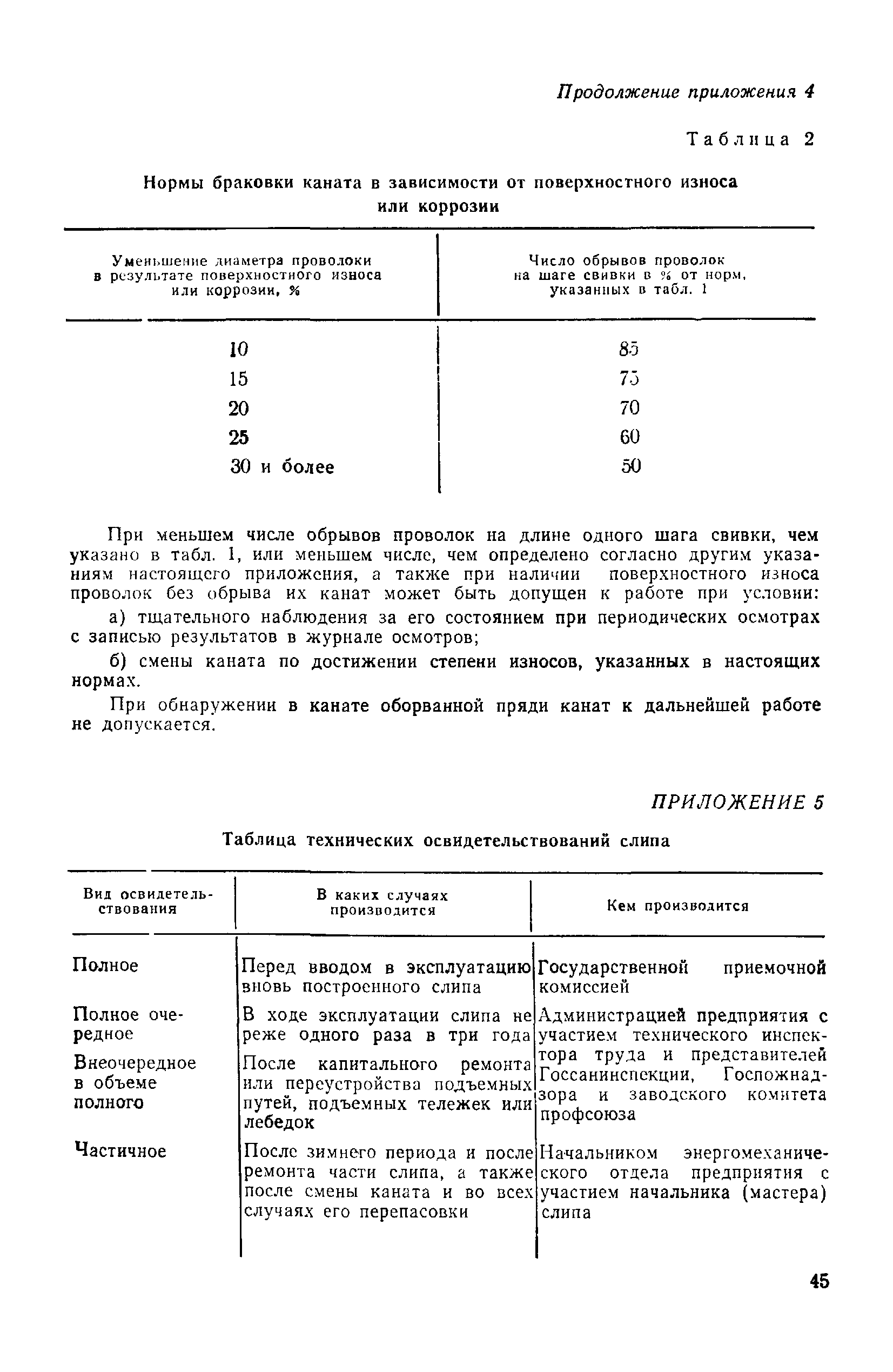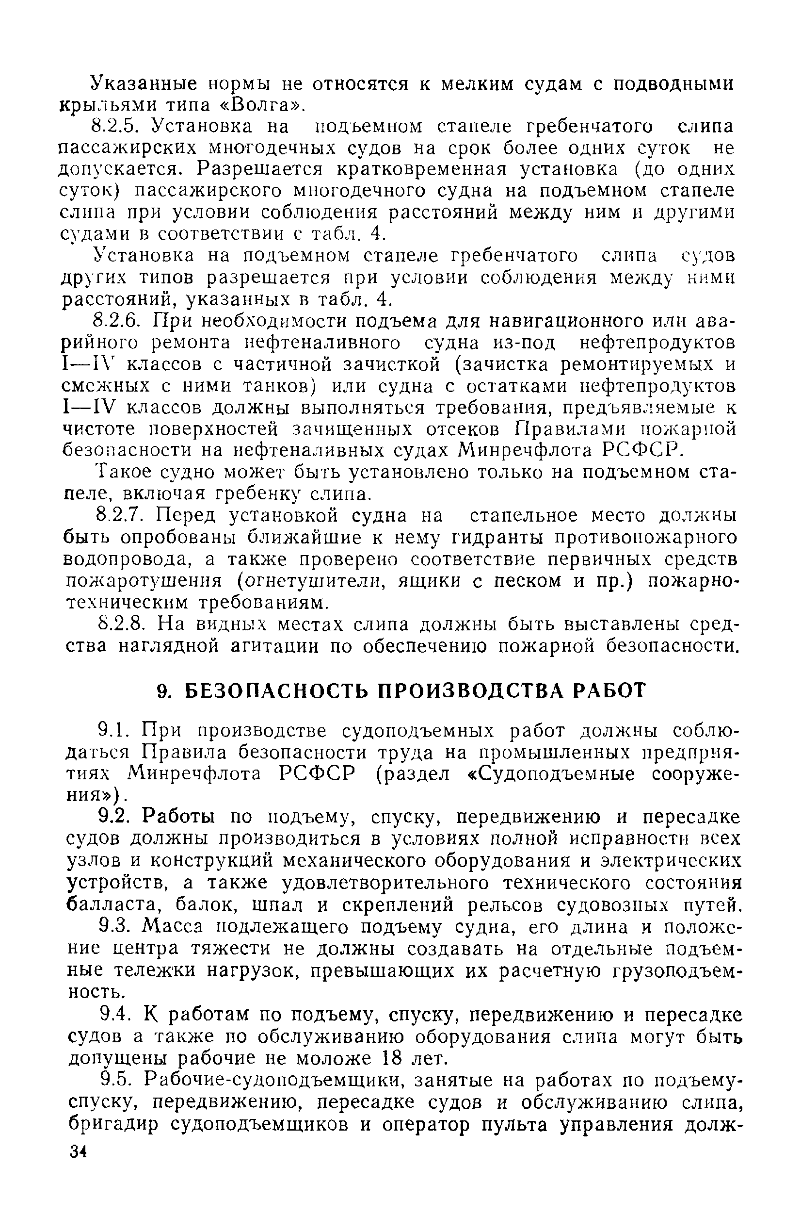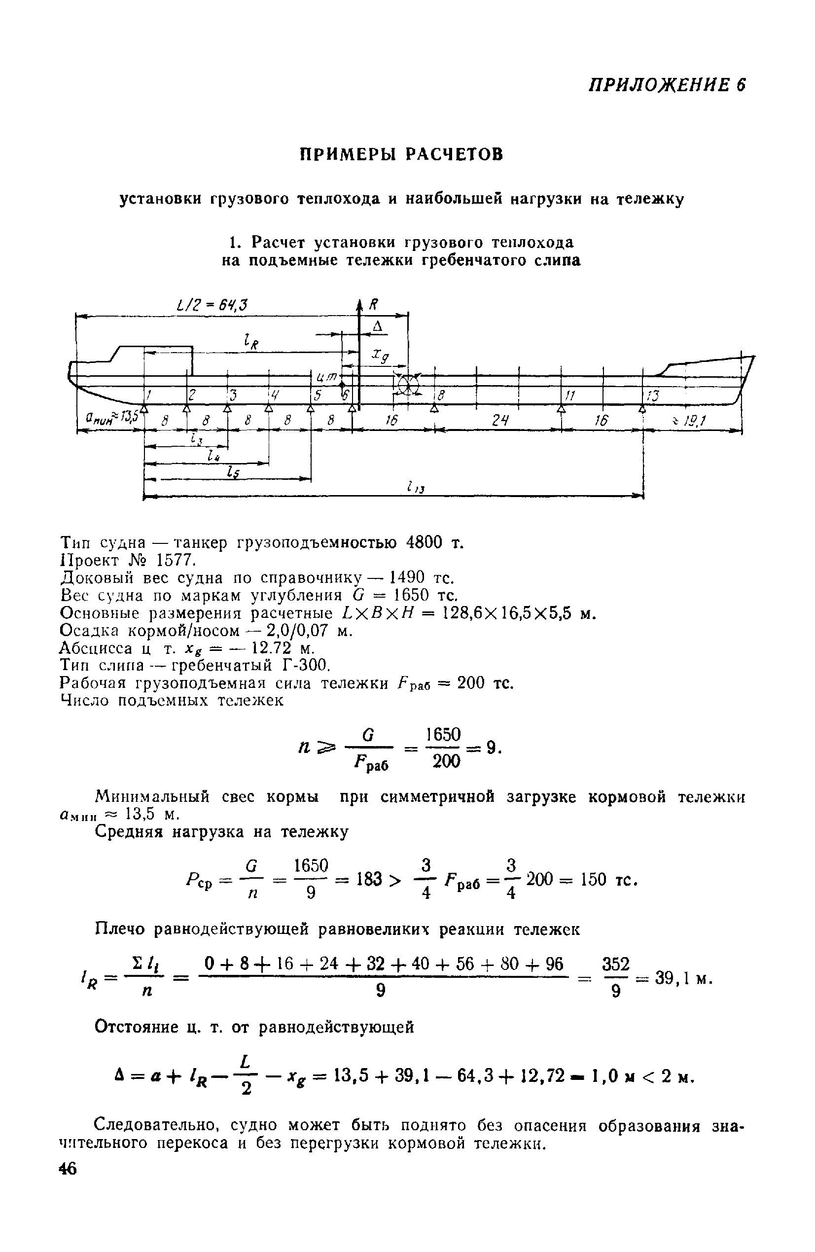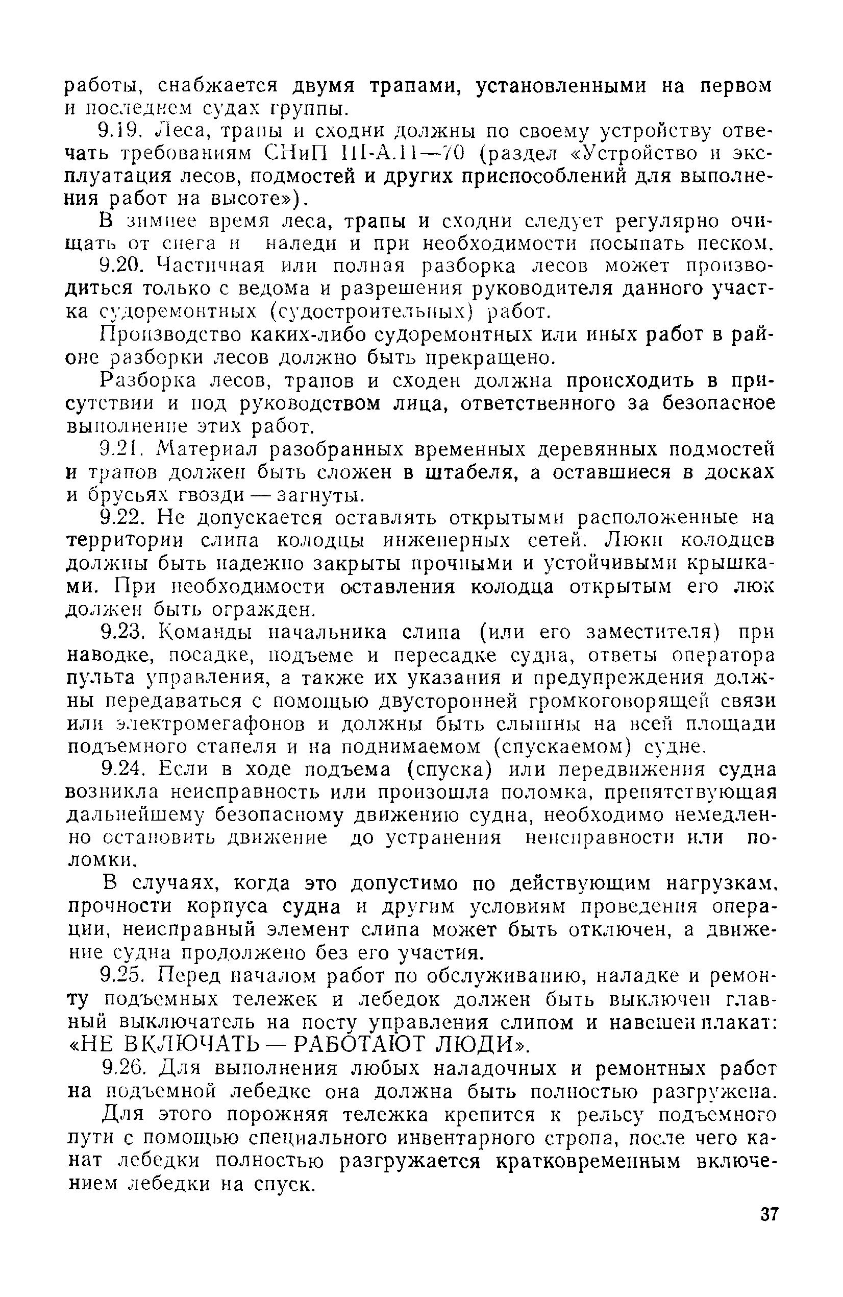 | Оглавление: | 1 Общие положения 2 Общие технические требования 3 Устройство слипов 3.1. Общие требования к оборудованию 3.2. Канаты и цепи 3.3. Барабаны и блоки 3.4. Тормоза 3.5. Приборы и устройства безопасности 3.6. Пост управления 3.7. Габариты 3.8. Рельсовые пути 4. Техническое состояние конструкций и оборудования 4.1. Строительные и гидротехнические конструкции 4.2. Механическое оборудование 4.3. Электрооборудование 5 Технические освидетельствования и испытания 6 Надзор и обслуживание 7 Производство судоподъемных работ 7.1. Подготовка судна 7.2. Подготовка слипа 7.3. Наводка и посадка судна на подъемные тележки 7.4. Подъем судна 7 5. Схема подъема и расчет нагрузки на подъемные тележки 7.6. Пересадка на стапельные тележки 7.7. Передвижение н установка 7.8. Спуск судна 7.9. Особые случаи использования слипов 8 Пожарная безопасность 8.1. Общие требования 8.2. Расстановка судов 9 Безопасность производства работ 10 Порядок расследовании и учета несчастных случаев 11 Заключительные положения Приложение 1. Принятые термины Приложение 2. Форма журнала слипа Приложение 3. Форма журнала подъема-спуска судов Приложение 4. Нормы браковки стальных канатов Приложение 5. Таблица технических освидетельствований слипа Приложение 6. Примеры расчетов установки грузового теплохода и наибольшей нагрузки на тележку |