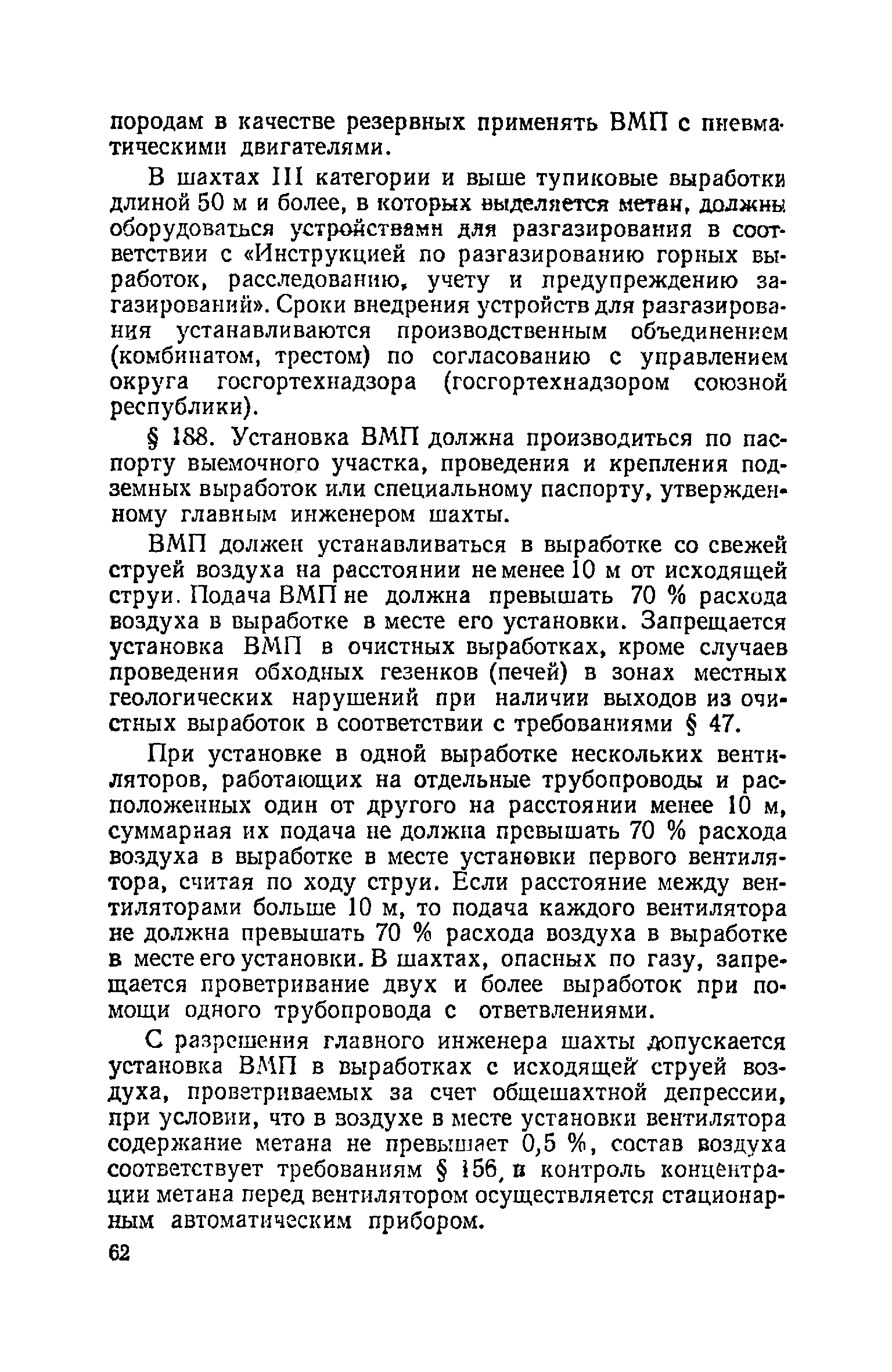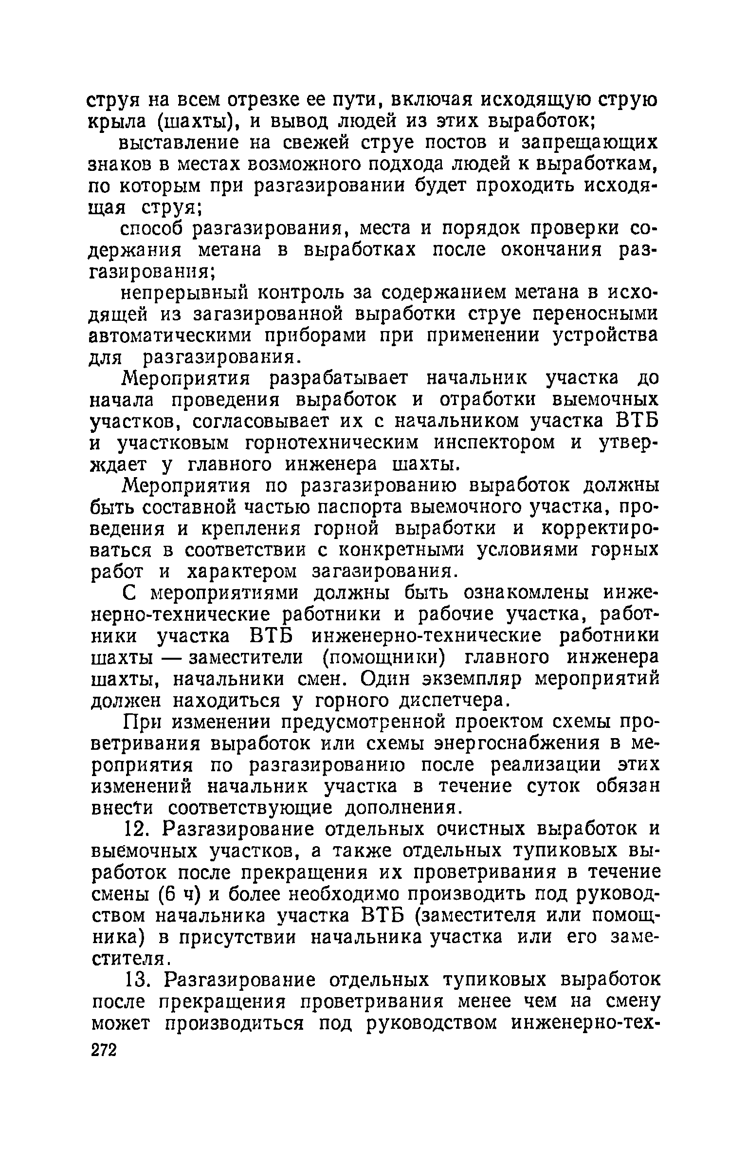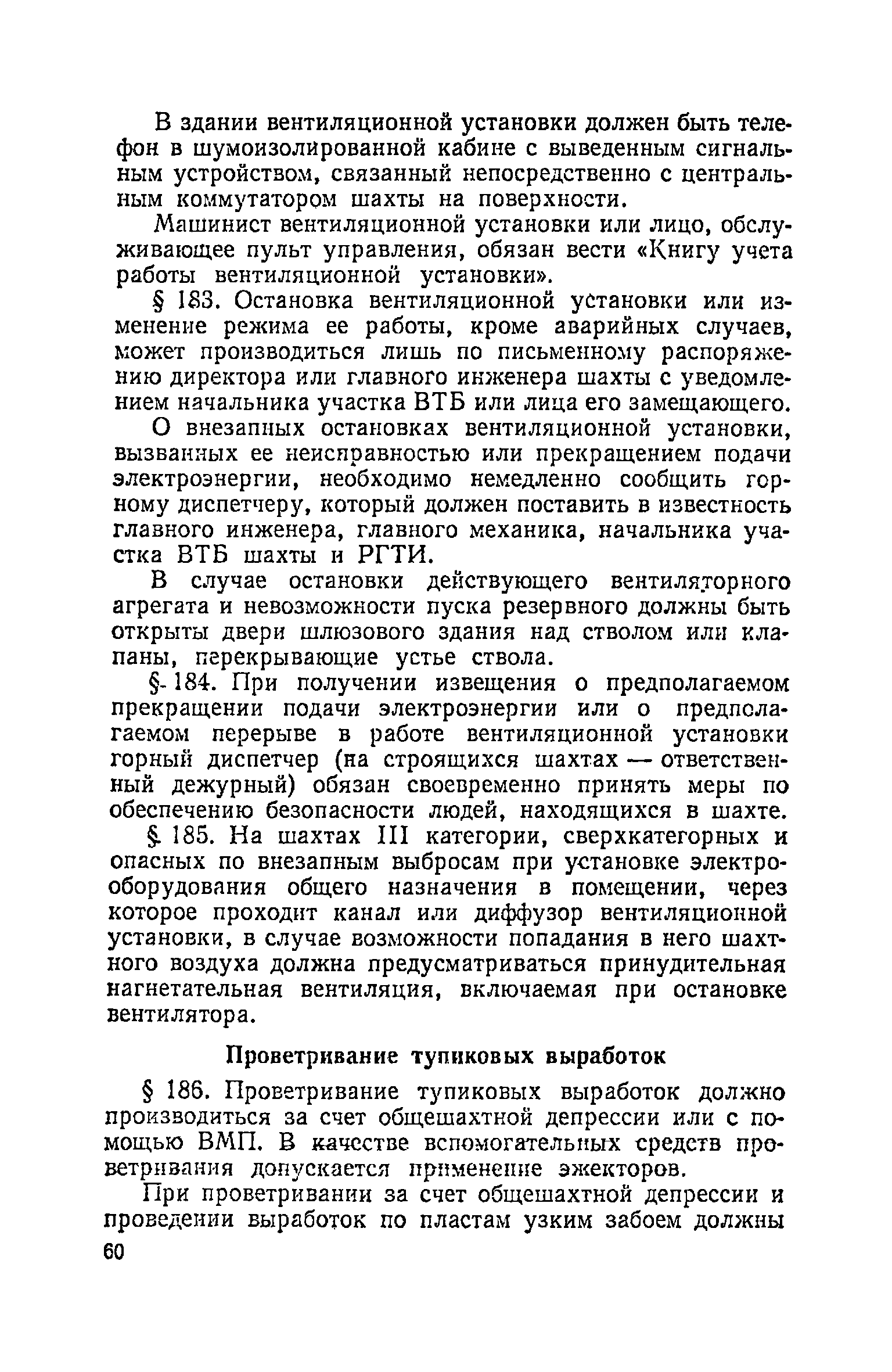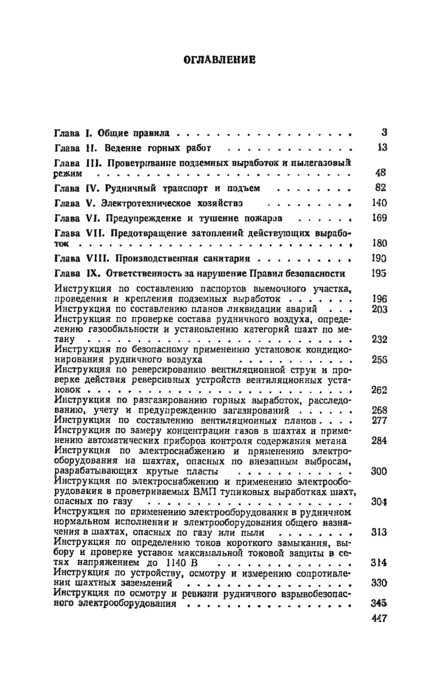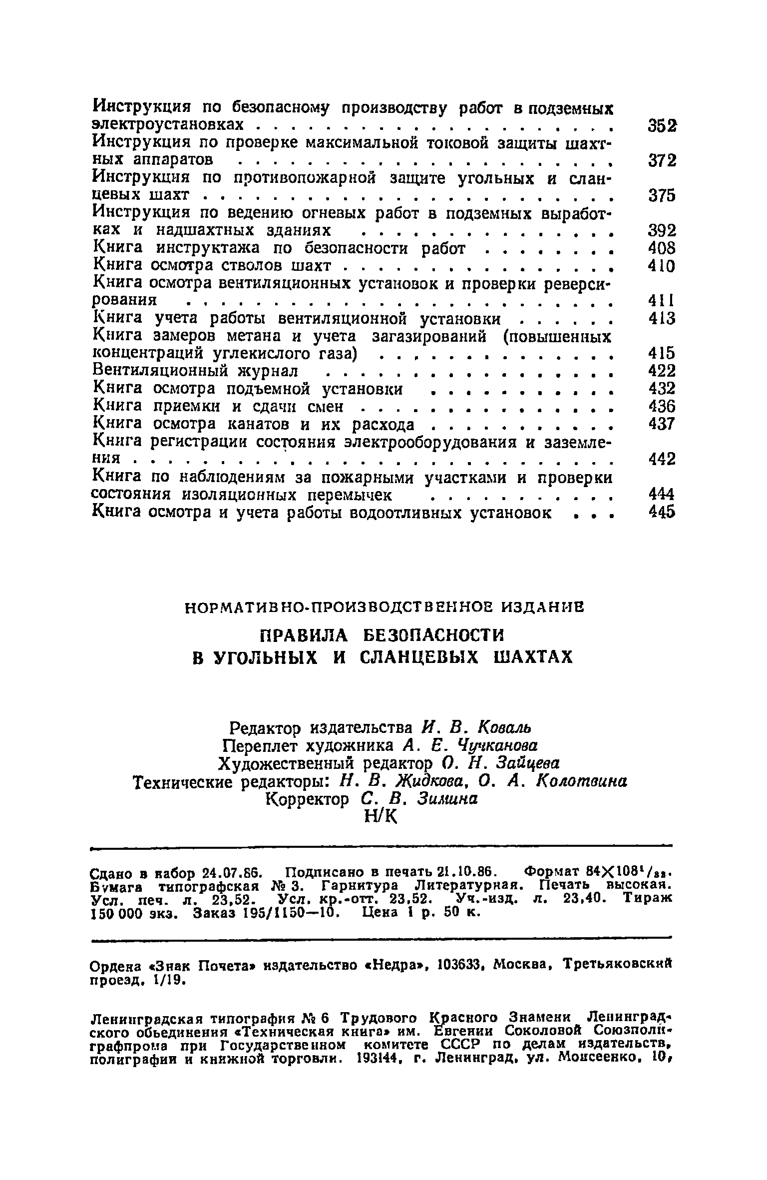 | Оглавление: | Глава I. Общие правила Глава II. Ведение горных работ Глава III. Проветривание подземных выработок и пылегазовый режим Глава IV. Рудничный транспорт и подъем Глава V. Электротехническое хозяйства Глава VI. Предупреждение и тушение пожара Глава VII. Предотвращение затоплении действующих выработок Глава VIII. Производственная санитария Глава IХ. Ответственность за нарушение Правил безопасности Инструкция по составлению паспортов выемочного участка, проведения и крепления подземных выработок Инструкция по составлению планов ликвидации аварий Инструкция по проверке состава рудничного воздуха, определению газообильности и установлению категорий шахт по метану Инструкция по безопасному применению установок кондиционирования рудничного воздуха Инструкция по реверсированию вентиляционной струн и проверке действия реверсивных устройств вентиляционных установок Инструкция по разгазированию горных выработок, расследованию, учету и предупреждению загазирований Инструкция по составлению вентиляционных платов Инструкция по замеру концентрации газов в шахтах и применению автоматических приборов контроля содержания метана Инструкция по электроснабжению и применению электрооборудования на шахтах, опасных по внезапным выбросам, разрабатывающих крутые пласты Инструкция по электроснабжению и применению электрооборудования в проветриваемых ВМП тупиковых выработках шахт, опасных по газу Инструкция по применению электрооборудования в рудничном нормальном исполнении и электрооборудования общего назначения в шахтах, опасных по газу или пыли Инструкция по определению токов короткого замыкания, выбору и проверке уставок максимальной токовой защиты в сетях напряжением до 1140 В Инструкция по устройству, осмотру и измерению сопротивления шахтных заземлений Инструкция по осмотру и ревизии рудничного взрывобезопасного электрооборудования Инструкция по безопасному производству работ в подземных электроустановках Инструкция по проверке максимальной токовой защиты шахтных аппаратов Инструкция по противопожарной защите угольных и сланцевых шахт Инструкция по ведению огневых работ в подземных выработках н надшахтных зданиях Книга инструктажа по безопасности работ Книга осмотра стволов шахт Книга осмотра вентиляционных установок и проверки реверсирования Книга учета работы вентиляционной установки Книга замеров метана и учета загазирований (повышенных концентраций углекислого газа) Вентиляционный журнал Книга осмотра подъемной установки Книга приемки и сдачи смен Книга осмотра канатов и их расхода Книга регистрации состояния электрооборудования и заземления Книга по наблюдениям за пожарными участками и проверки состояния изоляционных перемычек Книга осмотра и учета работы водоотливных установок |