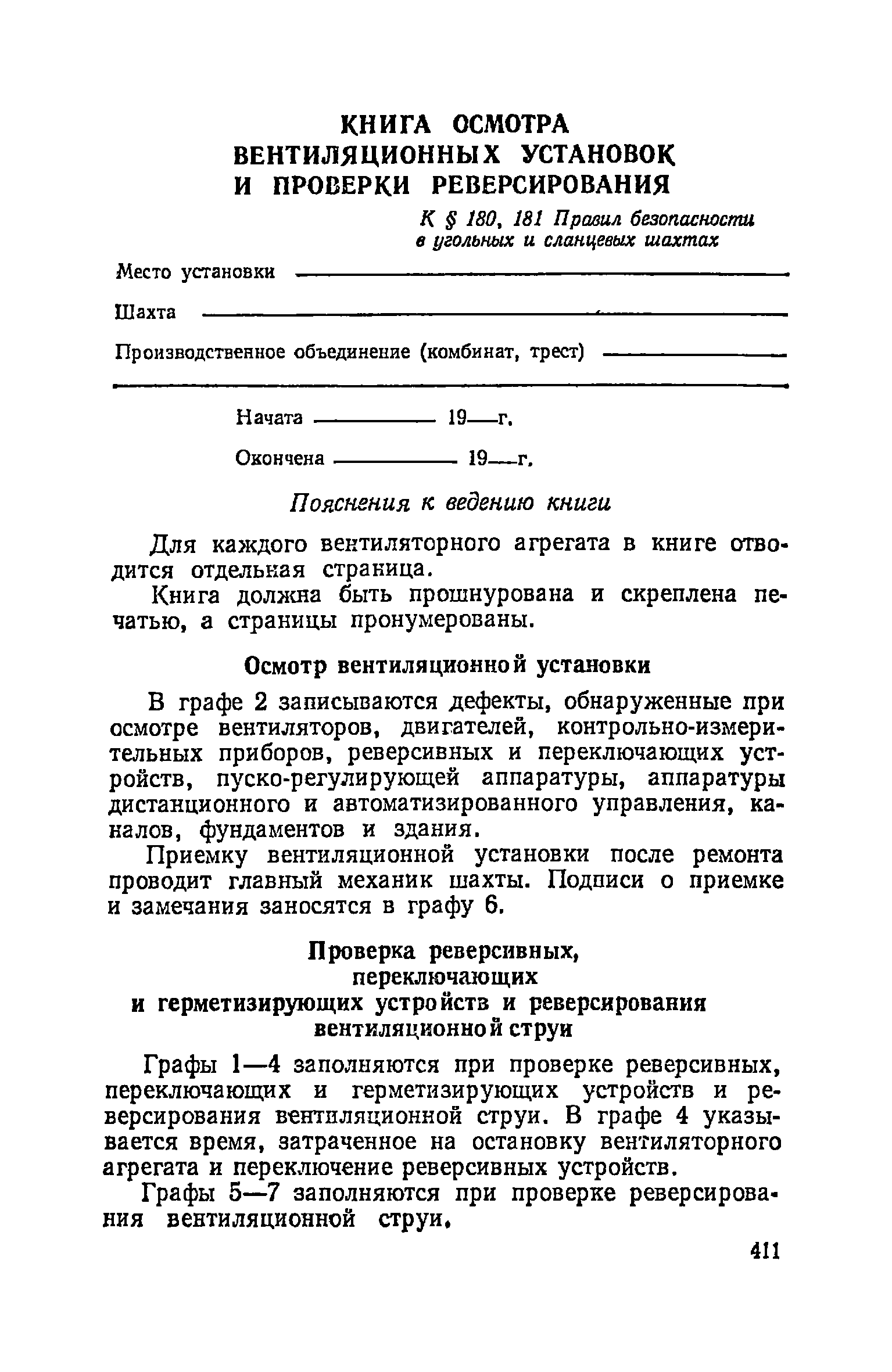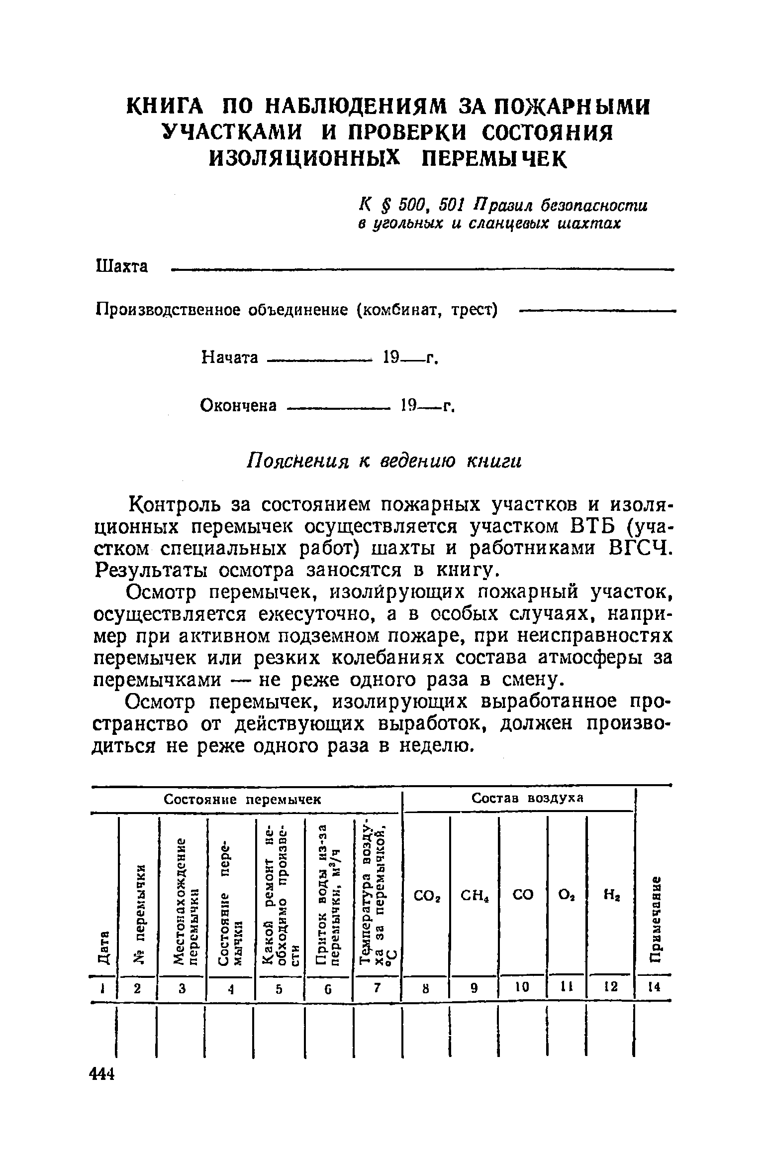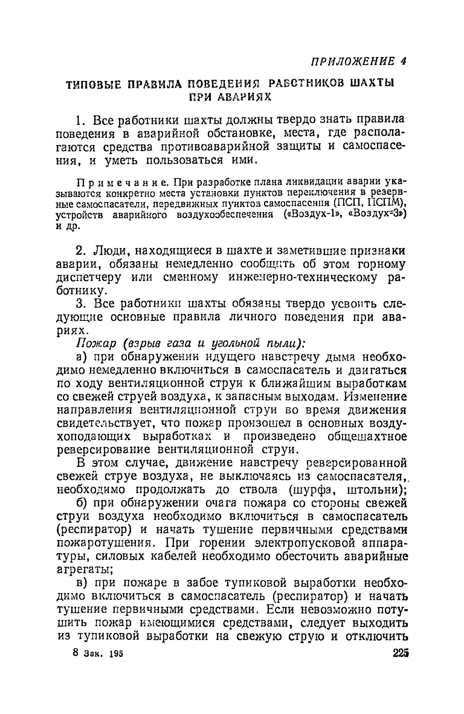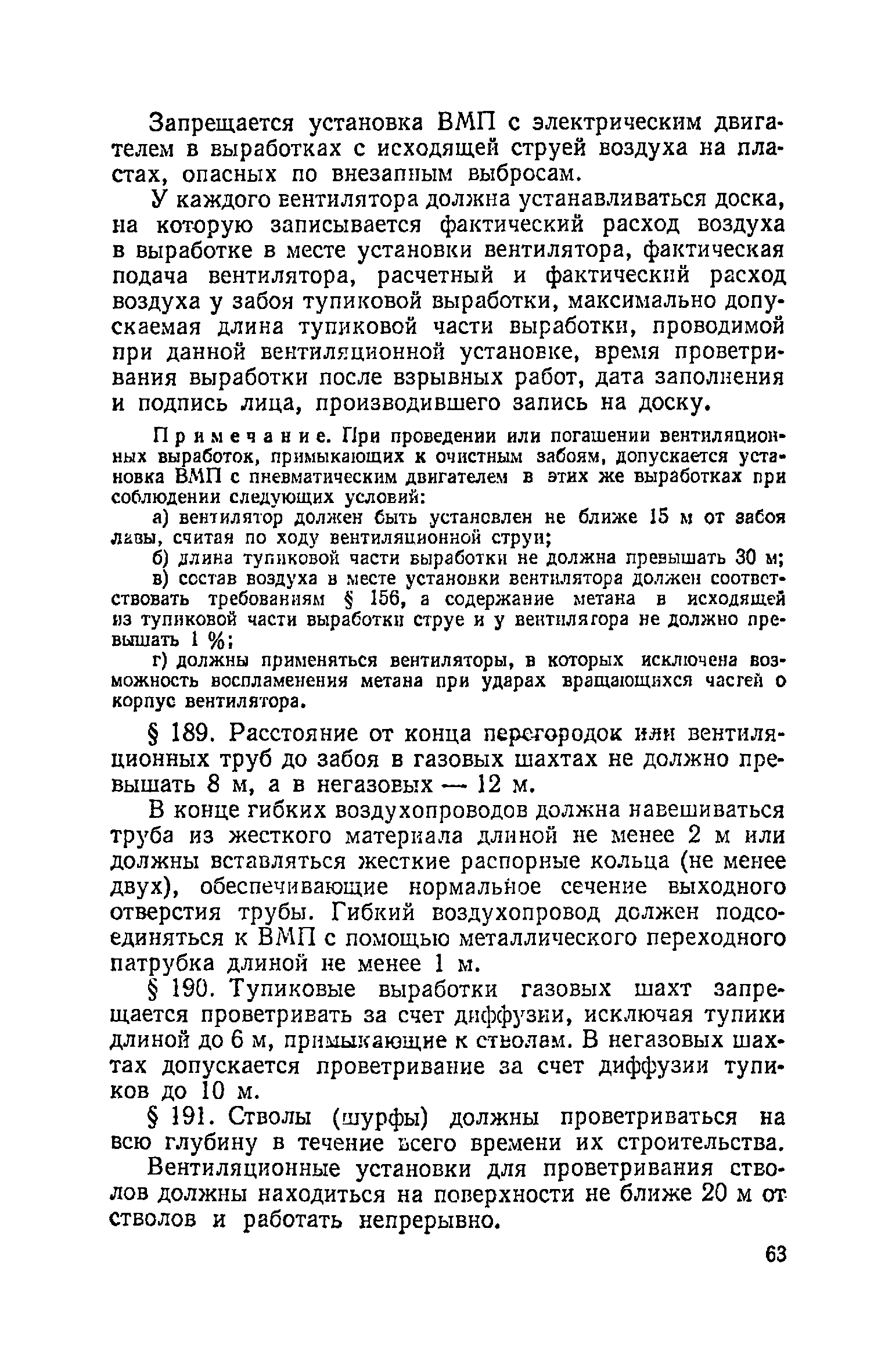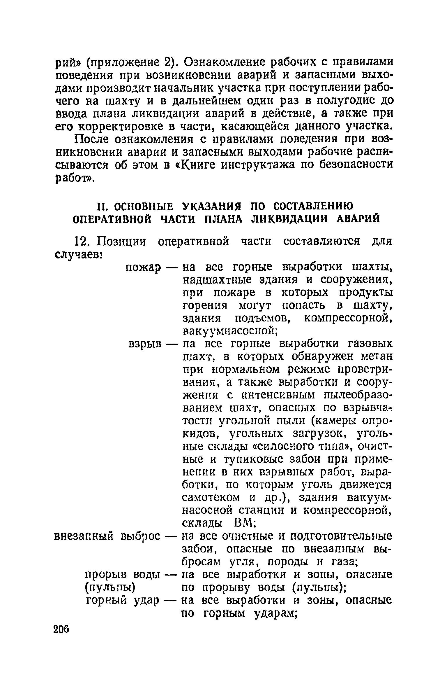 | Оглавление: | Глава I. Общие правила Глава II. Ведение горных работ Глава III. Проветривание подземных выработок и пылегазовый режим Глава IV. Рудничный транспорт и подъем Глава V. Электротехническое хозяйства Глава VI. Предупреждение и тушение пожара Глава VII. Предотвращение затоплении действующих выработок Глава VIII. Производственная санитария Глава IХ. Ответственность за нарушение Правил безопасности Инструкция по составлению паспортов выемочного участка, проведения и крепления подземных выработок Инструкция по составлению планов ликвидации аварий Инструкция по проверке состава рудничного воздуха, определению газообильности и установлению категорий шахт по метану Инструкция по безопасному применению установок кондиционирования рудничного воздуха Инструкция по реверсированию вентиляционной струн и проверке действия реверсивных устройств вентиляционных установок Инструкция по разгазированию горных выработок, расследованию, учету и предупреждению загазирований Инструкция по составлению вентиляционных платов Инструкция по замеру концентрации газов в шахтах и применению автоматических приборов контроля содержания метана Инструкция по электроснабжению и применению электрооборудования на шахтах, опасных по внезапным выбросам, разрабатывающих крутые пласты Инструкция по электроснабжению и применению электрооборудования в проветриваемых ВМП тупиковых выработках шахт, опасных по газу Инструкция по применению электрооборудования в рудничном нормальном исполнении и электрооборудования общего назначения в шахтах, опасных по газу или пыли Инструкция по определению токов короткого замыкания, выбору и проверке уставок максимальной токовой защиты в сетях напряжением до 1140 В Инструкция по устройству, осмотру и измерению сопротивления шахтных заземлений Инструкция по осмотру и ревизии рудничного взрывобезопасного электрооборудования Инструкция по безопасному производству работ в подземных электроустановках Инструкция по проверке максимальной токовой защиты шахтных аппаратов Инструкция по противопожарной защите угольных и сланцевых шахт Инструкция по ведению огневых работ в подземных выработках н надшахтных зданиях Книга инструктажа по безопасности работ Книга осмотра стволов шахт Книга осмотра вентиляционных установок и проверки реверсирования Книга учета работы вентиляционной установки Книга замеров метана и учета загазирований (повышенных концентраций углекислого газа) Вентиляционный журнал Книга осмотра подъемной установки Книга приемки и сдачи смен Книга осмотра канатов и их расхода Книга регистрации состояния электрооборудования и заземления Книга по наблюдениям за пожарными участками и проверки состояния изоляционных перемычек Книга осмотра и учета работы водоотливных установок |