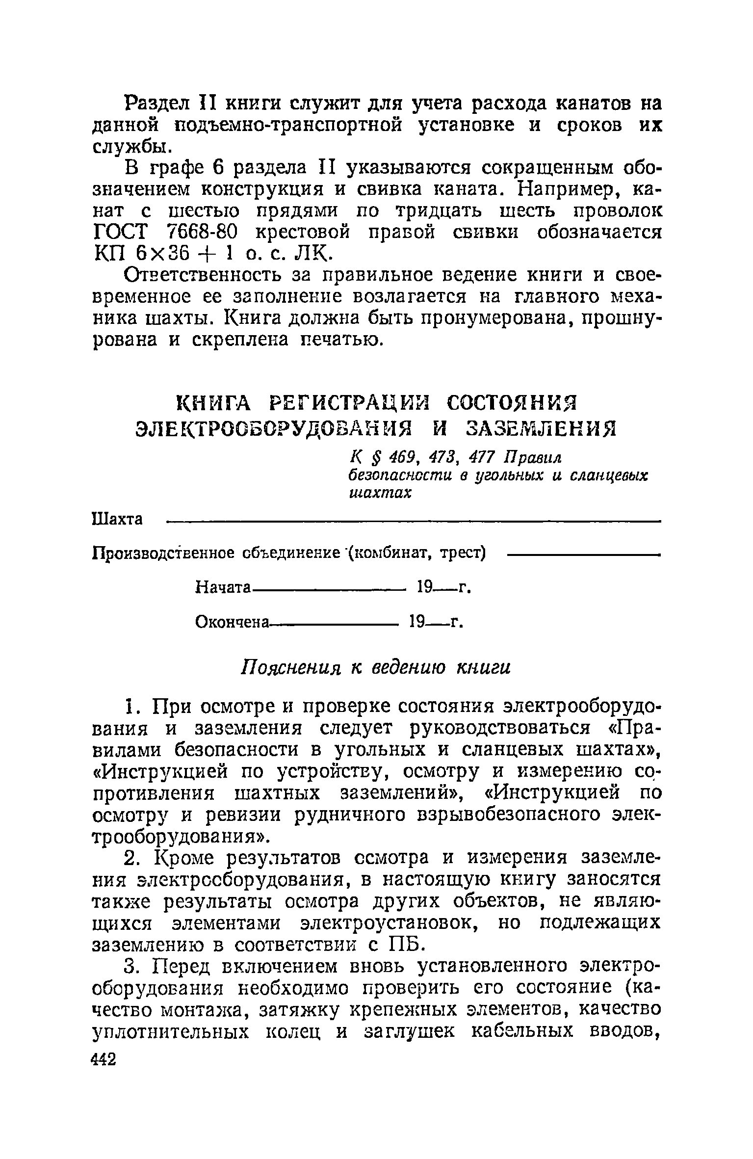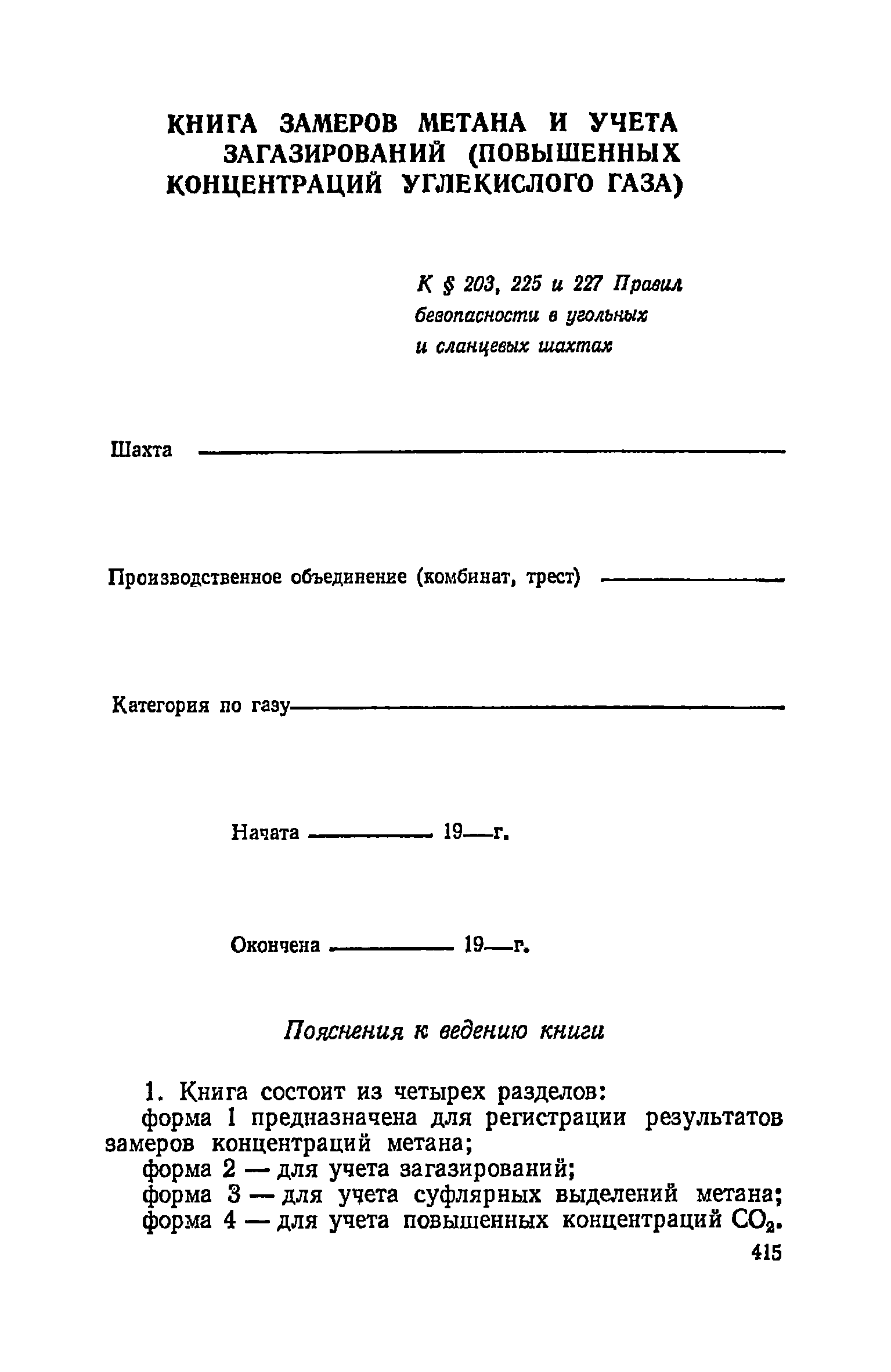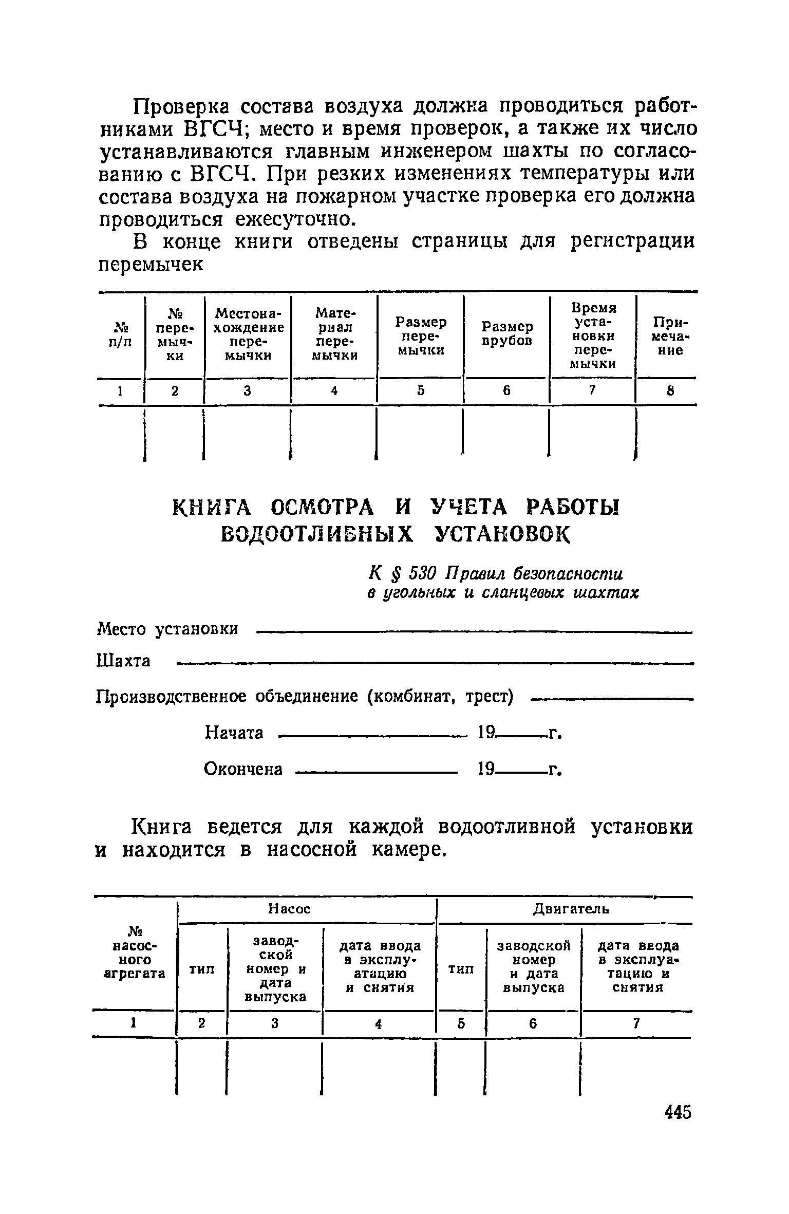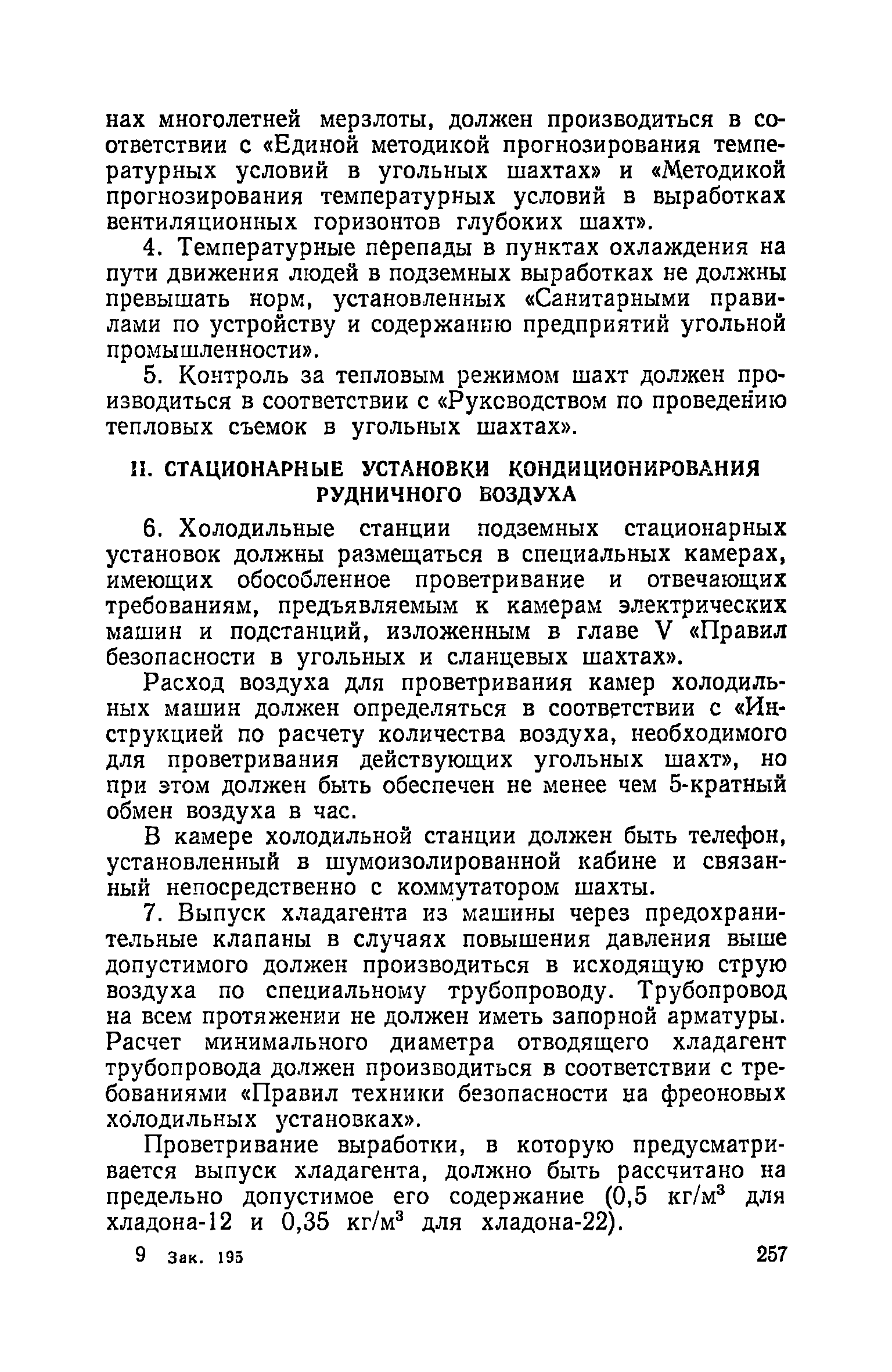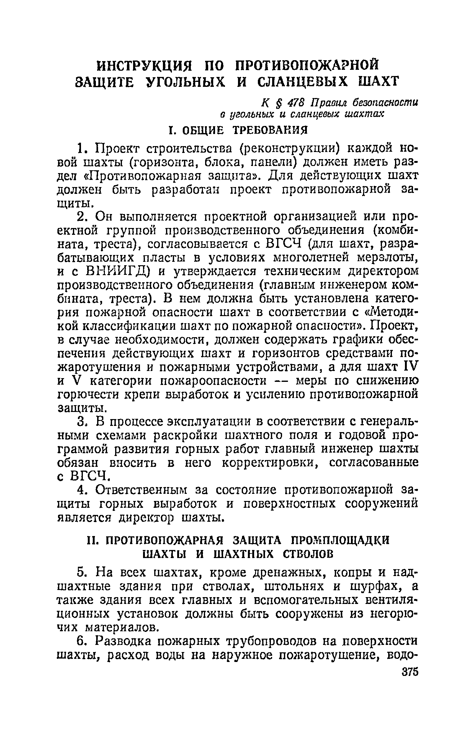 | Оглавление: | Глава I. Общие правила Глава II. Ведение горных работ Глава III. Проветривание подземных выработок и пылегазовый режим Глава IV. Рудничный транспорт и подъем Глава V. Электротехническое хозяйства Глава VI. Предупреждение и тушение пожара Глава VII. Предотвращение затоплении действующих выработок Глава VIII. Производственная санитария Глава IХ. Ответственность за нарушение Правил безопасности Инструкция по составлению паспортов выемочного участка, проведения и крепления подземных выработок Инструкция по составлению планов ликвидации аварий Инструкция по проверке состава рудничного воздуха, определению газообильности и установлению категорий шахт по метану Инструкция по безопасному применению установок кондиционирования рудничного воздуха Инструкция по реверсированию вентиляционной струн и проверке действия реверсивных устройств вентиляционных установок Инструкция по разгазированию горных выработок, расследованию, учету и предупреждению загазирований Инструкция по составлению вентиляционных платов Инструкция по замеру концентрации газов в шахтах и применению автоматических приборов контроля содержания метана Инструкция по электроснабжению и применению электрооборудования на шахтах, опасных по внезапным выбросам, разрабатывающих крутые пласты Инструкция по электроснабжению и применению электрооборудования в проветриваемых ВМП тупиковых выработках шахт, опасных по газу Инструкция по применению электрооборудования в рудничном нормальном исполнении и электрооборудования общего назначения в шахтах, опасных по газу или пыли Инструкция по определению токов короткого замыкания, выбору и проверке уставок максимальной токовой защиты в сетях напряжением до 1140 В Инструкция по устройству, осмотру и измерению сопротивления шахтных заземлений Инструкция по осмотру и ревизии рудничного взрывобезопасного электрооборудования Инструкция по безопасному производству работ в подземных электроустановках Инструкция по проверке максимальной токовой защиты шахтных аппаратов Инструкция по противопожарной защите угольных и сланцевых шахт Инструкция по ведению огневых работ в подземных выработках н надшахтных зданиях Книга инструктажа по безопасности работ Книга осмотра стволов шахт Книга осмотра вентиляционных установок и проверки реверсирования Книга учета работы вентиляционной установки Книга замеров метана и учета загазирований (повышенных концентраций углекислого газа) Вентиляционный журнал Книга осмотра подъемной установки Книга приемки и сдачи смен Книга осмотра канатов и их расхода Книга регистрации состояния электрооборудования и заземления Книга по наблюдениям за пожарными участками и проверки состояния изоляционных перемычек Книга осмотра и учета работы водоотливных установок |