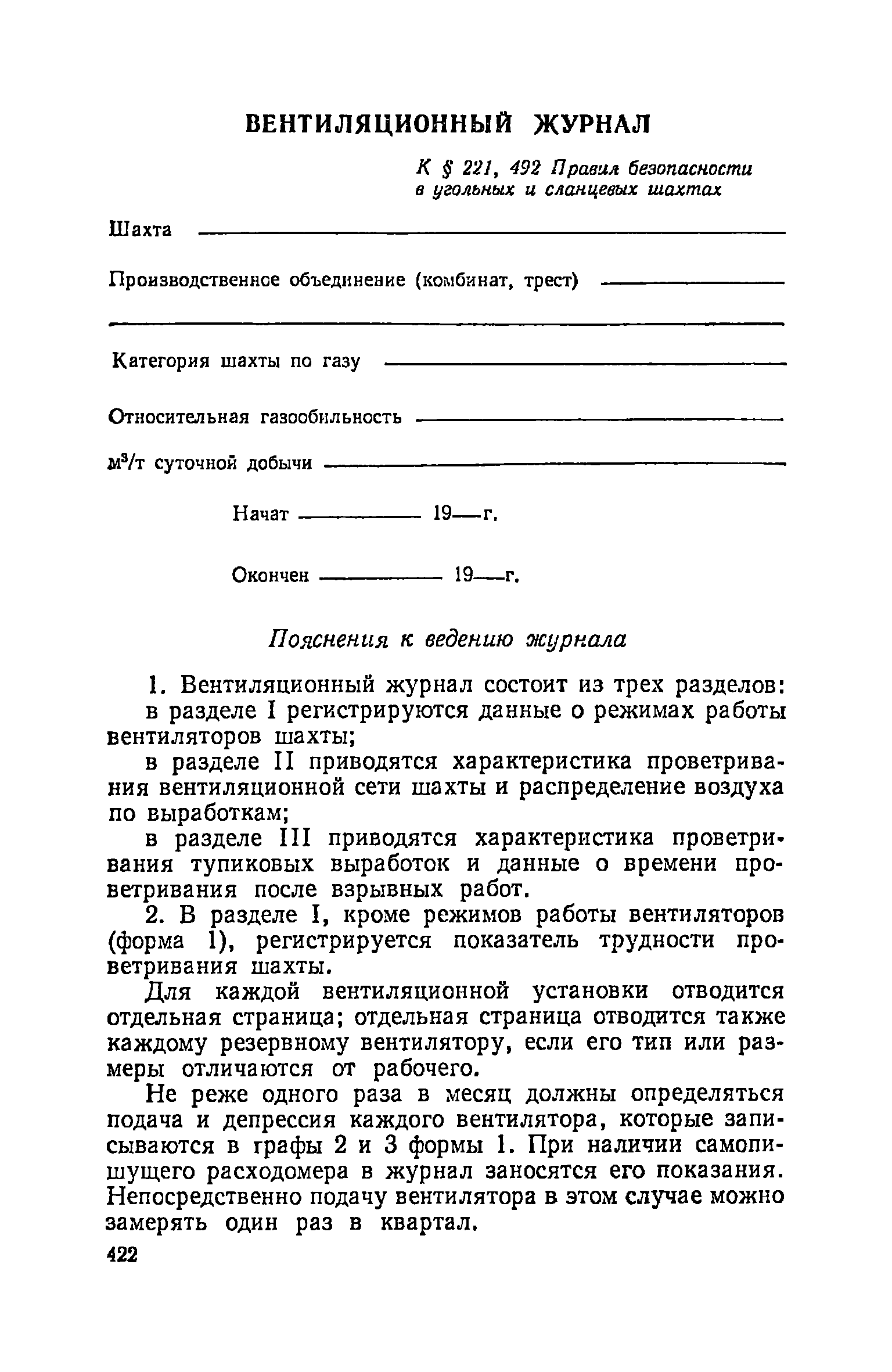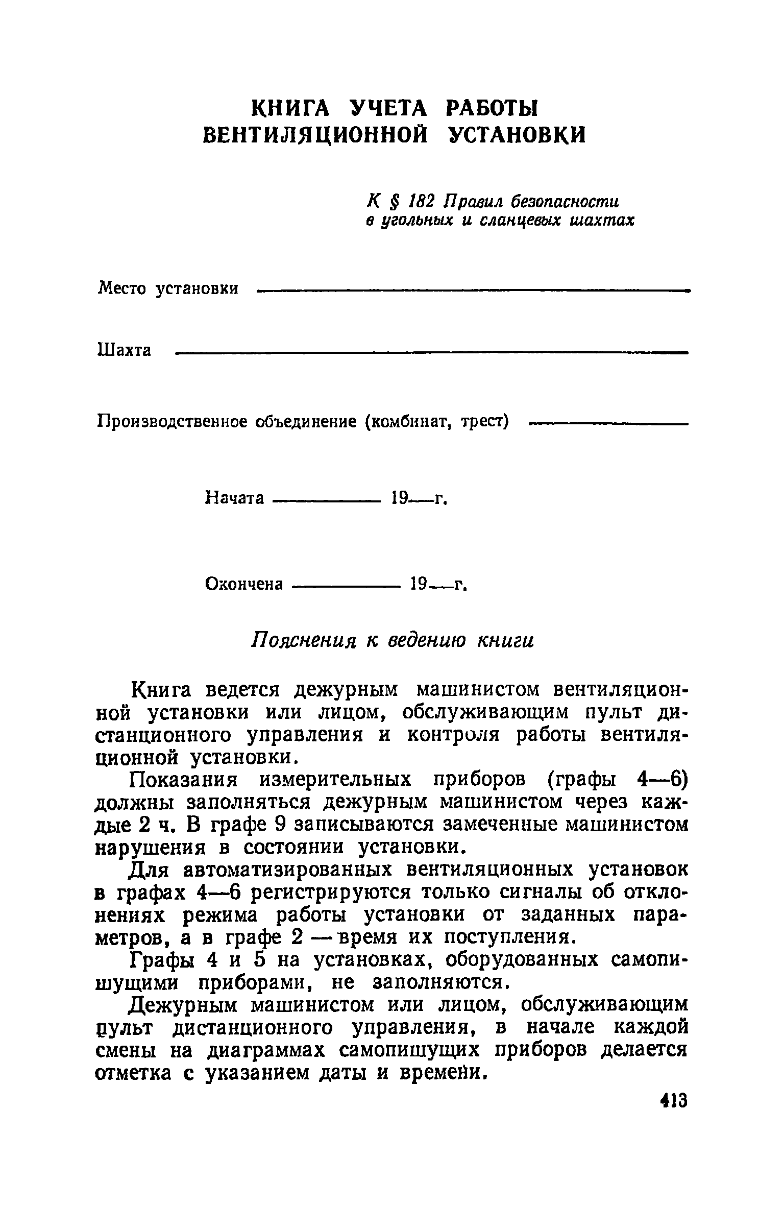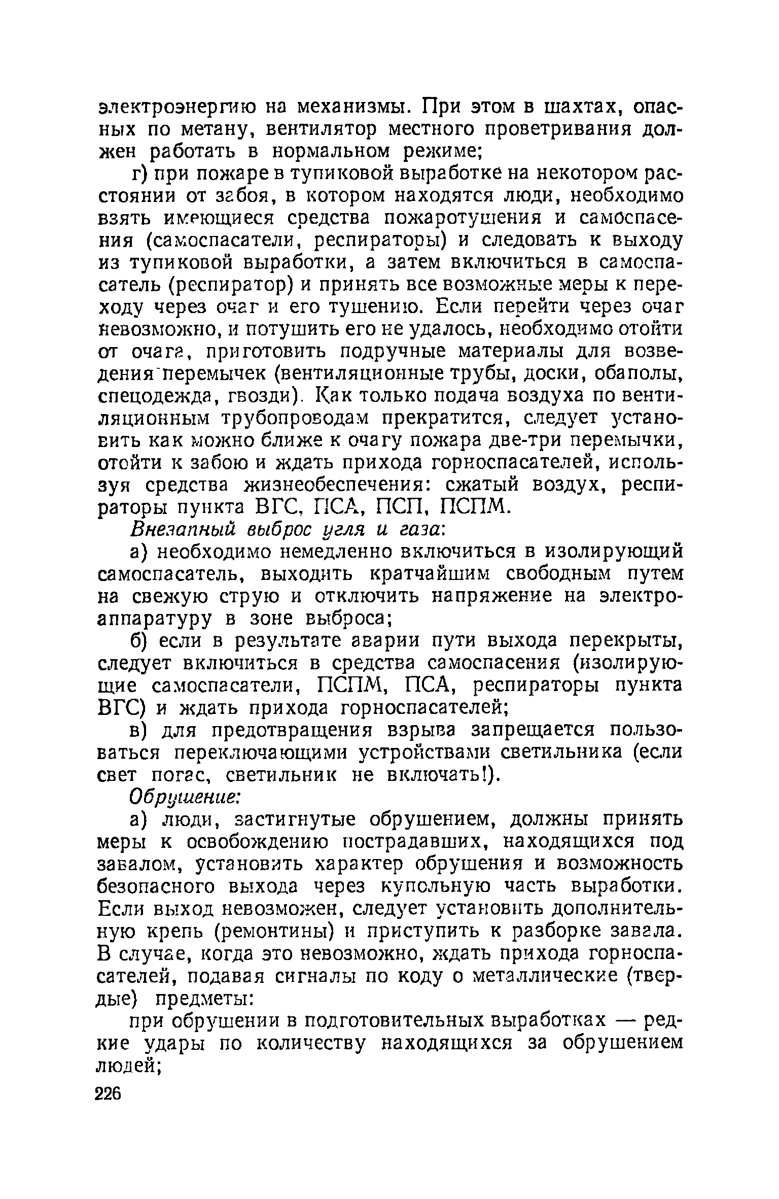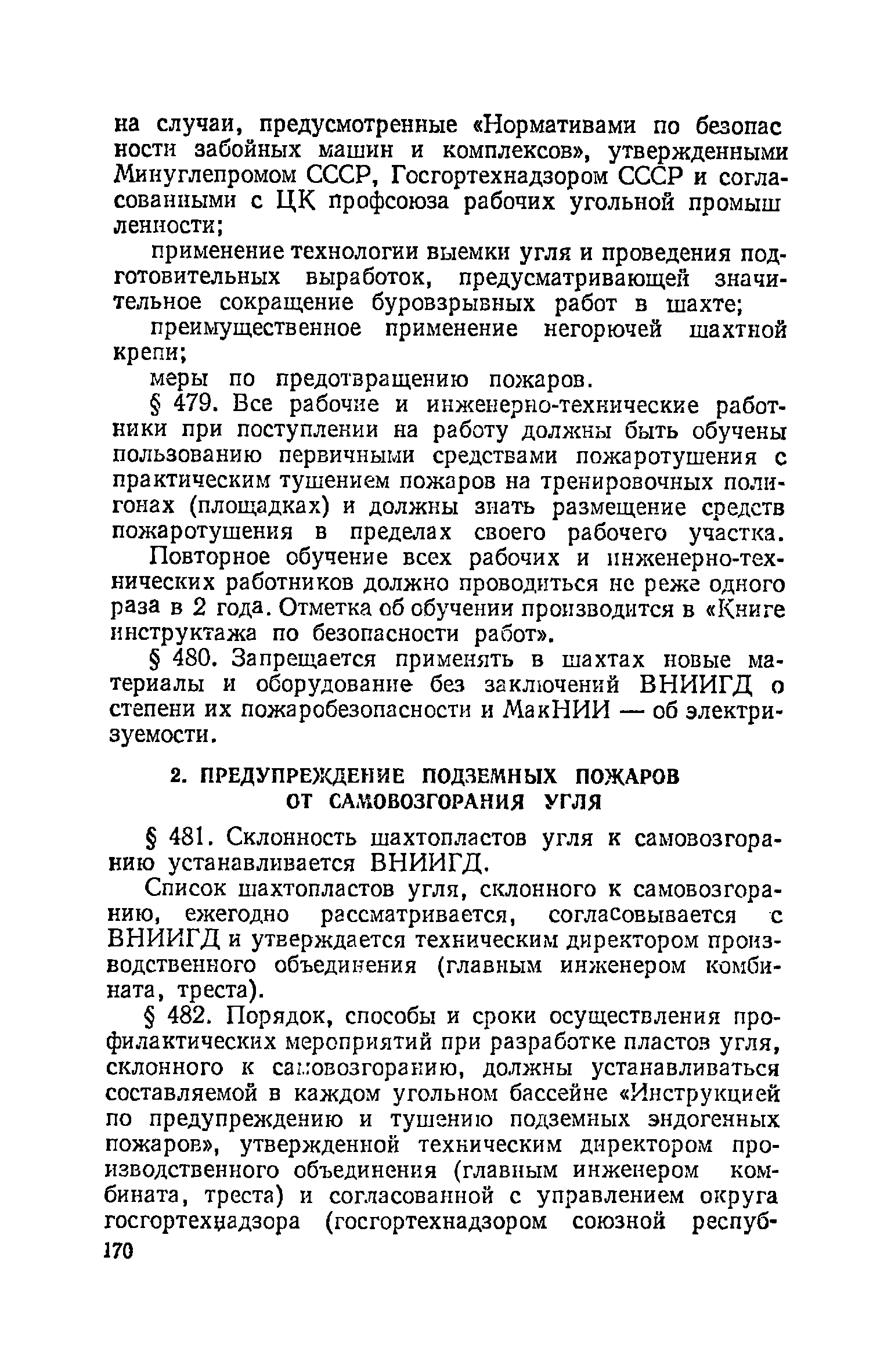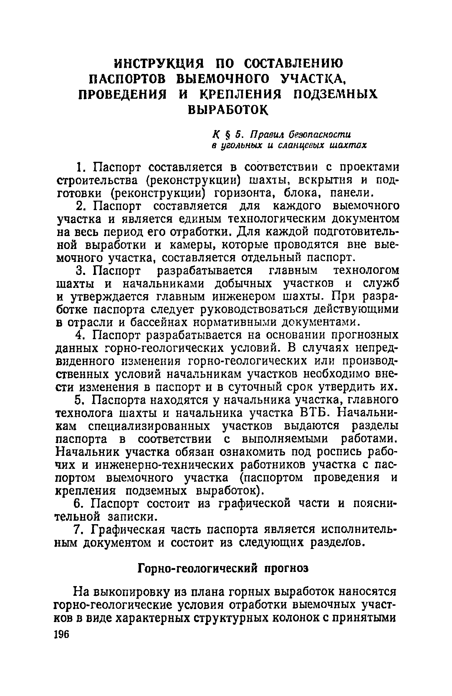 | Оглавление: | Глава I. Общие правила Глава II. Ведение горных работ Глава III. Проветривание подземных выработок и пылегазовый режим Глава IV. Рудничный транспорт и подъем Глава V. Электротехническое хозяйства Глава VI. Предупреждение и тушение пожара Глава VII. Предотвращение затоплении действующих выработок Глава VIII. Производственная санитария Глава IХ. Ответственность за нарушение Правил безопасности Инструкция по составлению паспортов выемочного участка, проведения и крепления подземных выработок Инструкция по составлению планов ликвидации аварий Инструкция по проверке состава рудничного воздуха, определению газообильности и установлению категорий шахт по метану Инструкция по безопасному применению установок кондиционирования рудничного воздуха Инструкция по реверсированию вентиляционной струн и проверке действия реверсивных устройств вентиляционных установок Инструкция по разгазированию горных выработок, расследованию, учету и предупреждению загазирований Инструкция по составлению вентиляционных платов Инструкция по замеру концентрации газов в шахтах и применению автоматических приборов контроля содержания метана Инструкция по электроснабжению и применению электрооборудования на шахтах, опасных по внезапным выбросам, разрабатывающих крутые пласты Инструкция по электроснабжению и применению электрооборудования в проветриваемых ВМП тупиковых выработках шахт, опасных по газу Инструкция по применению электрооборудования в рудничном нормальном исполнении и электрооборудования общего назначения в шахтах, опасных по газу или пыли Инструкция по определению токов короткого замыкания, выбору и проверке уставок максимальной токовой защиты в сетях напряжением до 1140 В Инструкция по устройству, осмотру и измерению сопротивления шахтных заземлений Инструкция по осмотру и ревизии рудничного взрывобезопасного электрооборудования Инструкция по безопасному производству работ в подземных электроустановках Инструкция по проверке максимальной токовой защиты шахтных аппаратов Инструкция по противопожарной защите угольных и сланцевых шахт Инструкция по ведению огневых работ в подземных выработках н надшахтных зданиях Книга инструктажа по безопасности работ Книга осмотра стволов шахт Книга осмотра вентиляционных установок и проверки реверсирования Книга учета работы вентиляционной установки Книга замеров метана и учета загазирований (повышенных концентраций углекислого газа) Вентиляционный журнал Книга осмотра подъемной установки Книга приемки и сдачи смен Книга осмотра канатов и их расхода Книга регистрации состояния электрооборудования и заземления Книга по наблюдениям за пожарными участками и проверки состояния изоляционных перемычек Книга осмотра и учета работы водоотливных установок |