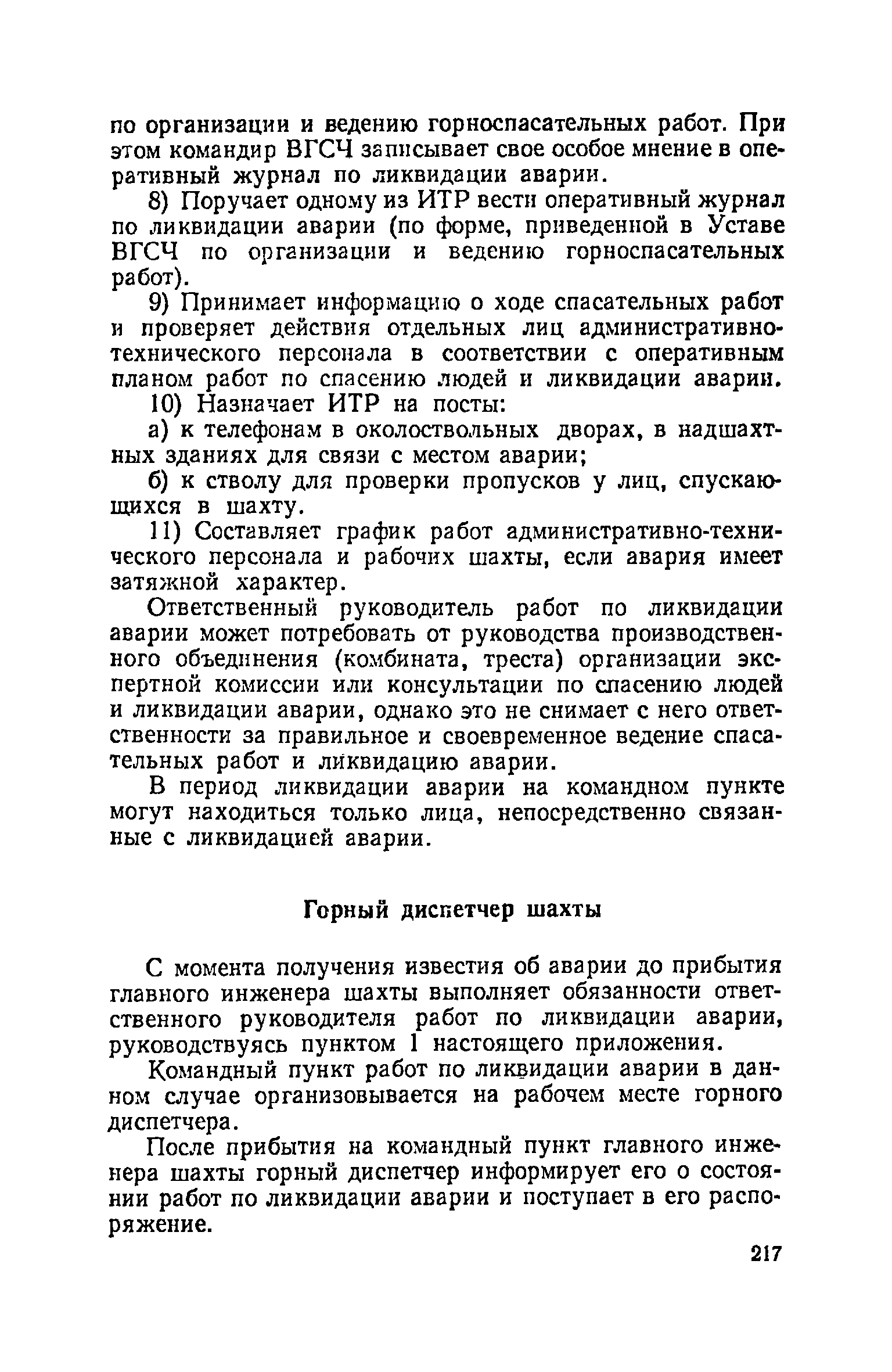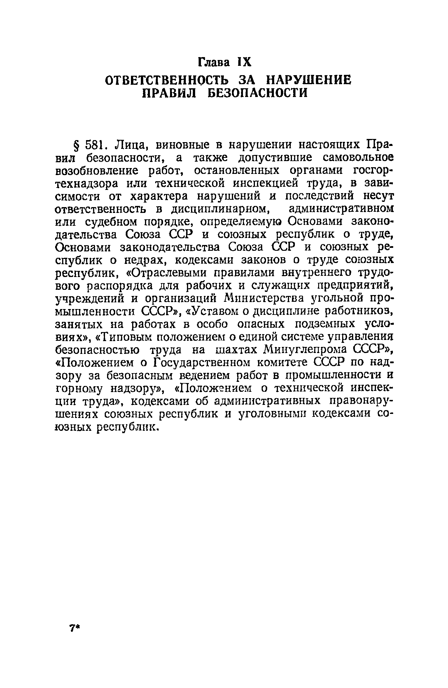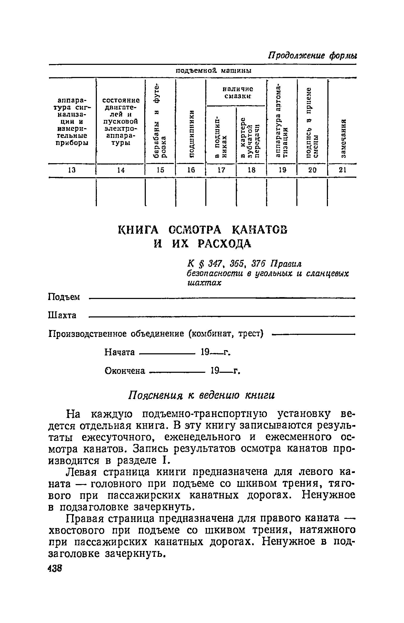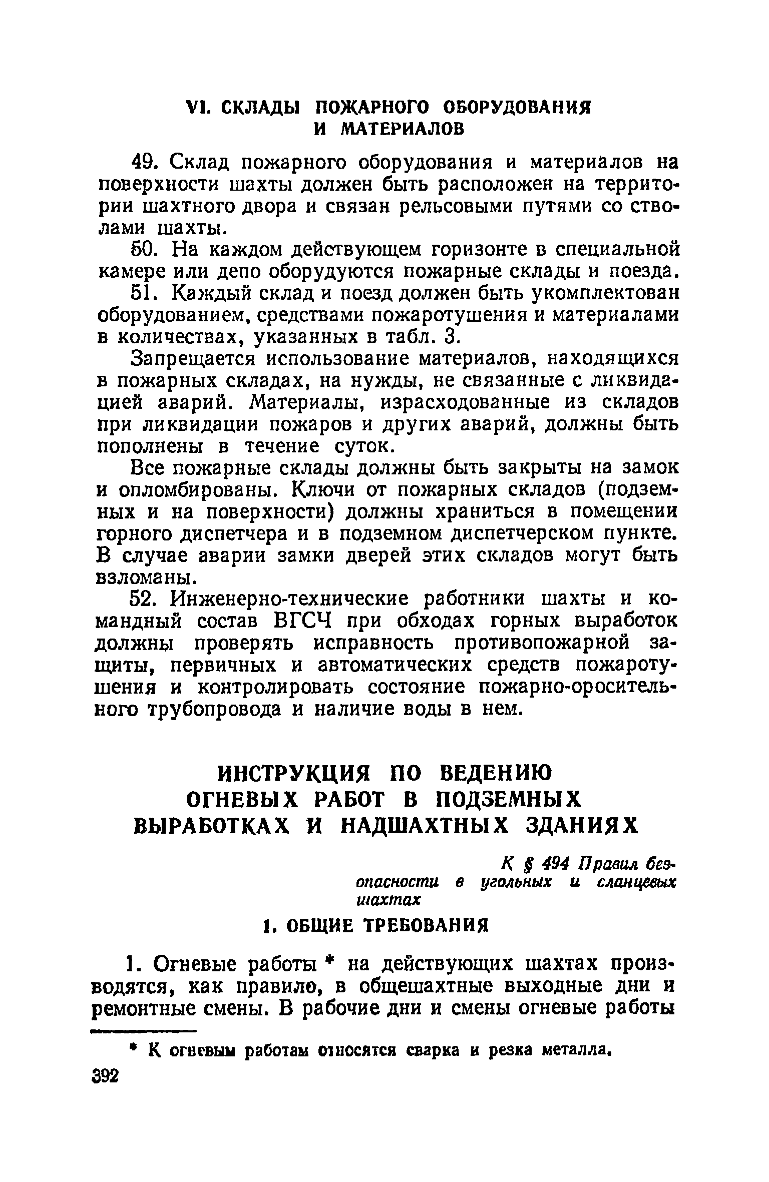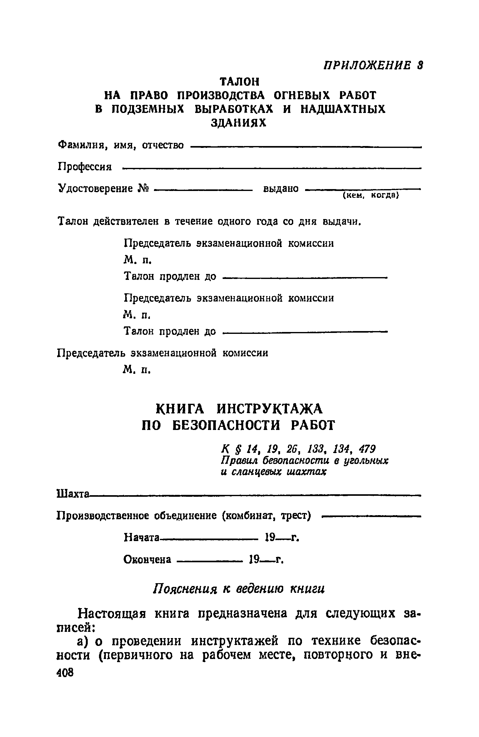 | Оглавление: | Глава I. Общие правила Глава II. Ведение горных работ Глава III. Проветривание подземных выработок и пылегазовый режим Глава IV. Рудничный транспорт и подъем Глава V. Электротехническое хозяйства Глава VI. Предупреждение и тушение пожара Глава VII. Предотвращение затоплении действующих выработок Глава VIII. Производственная санитария Глава IХ. Ответственность за нарушение Правил безопасности Инструкция по составлению паспортов выемочного участка, проведения и крепления подземных выработок Инструкция по составлению планов ликвидации аварий Инструкция по проверке состава рудничного воздуха, определению газообильности и установлению категорий шахт по метану Инструкция по безопасному применению установок кондиционирования рудничного воздуха Инструкция по реверсированию вентиляционной струн и проверке действия реверсивных устройств вентиляционных установок Инструкция по разгазированию горных выработок, расследованию, учету и предупреждению загазирований Инструкция по составлению вентиляционных платов Инструкция по замеру концентрации газов в шахтах и применению автоматических приборов контроля содержания метана Инструкция по электроснабжению и применению электрооборудования на шахтах, опасных по внезапным выбросам, разрабатывающих крутые пласты Инструкция по электроснабжению и применению электрооборудования в проветриваемых ВМП тупиковых выработках шахт, опасных по газу Инструкция по применению электрооборудования в рудничном нормальном исполнении и электрооборудования общего назначения в шахтах, опасных по газу или пыли Инструкция по определению токов короткого замыкания, выбору и проверке уставок максимальной токовой защиты в сетях напряжением до 1140 В Инструкция по устройству, осмотру и измерению сопротивления шахтных заземлений Инструкция по осмотру и ревизии рудничного взрывобезопасного электрооборудования Инструкция по безопасному производству работ в подземных электроустановках Инструкция по проверке максимальной токовой защиты шахтных аппаратов Инструкция по противопожарной защите угольных и сланцевых шахт Инструкция по ведению огневых работ в подземных выработках н надшахтных зданиях Книга инструктажа по безопасности работ Книга осмотра стволов шахт Книга осмотра вентиляционных установок и проверки реверсирования Книга учета работы вентиляционной установки Книга замеров метана и учета загазирований (повышенных концентраций углекислого газа) Вентиляционный журнал Книга осмотра подъемной установки Книга приемки и сдачи смен Книга осмотра канатов и их расхода Книга регистрации состояния электрооборудования и заземления Книга по наблюдениям за пожарными участками и проверки состояния изоляционных перемычек Книга осмотра и учета работы водоотливных установок |