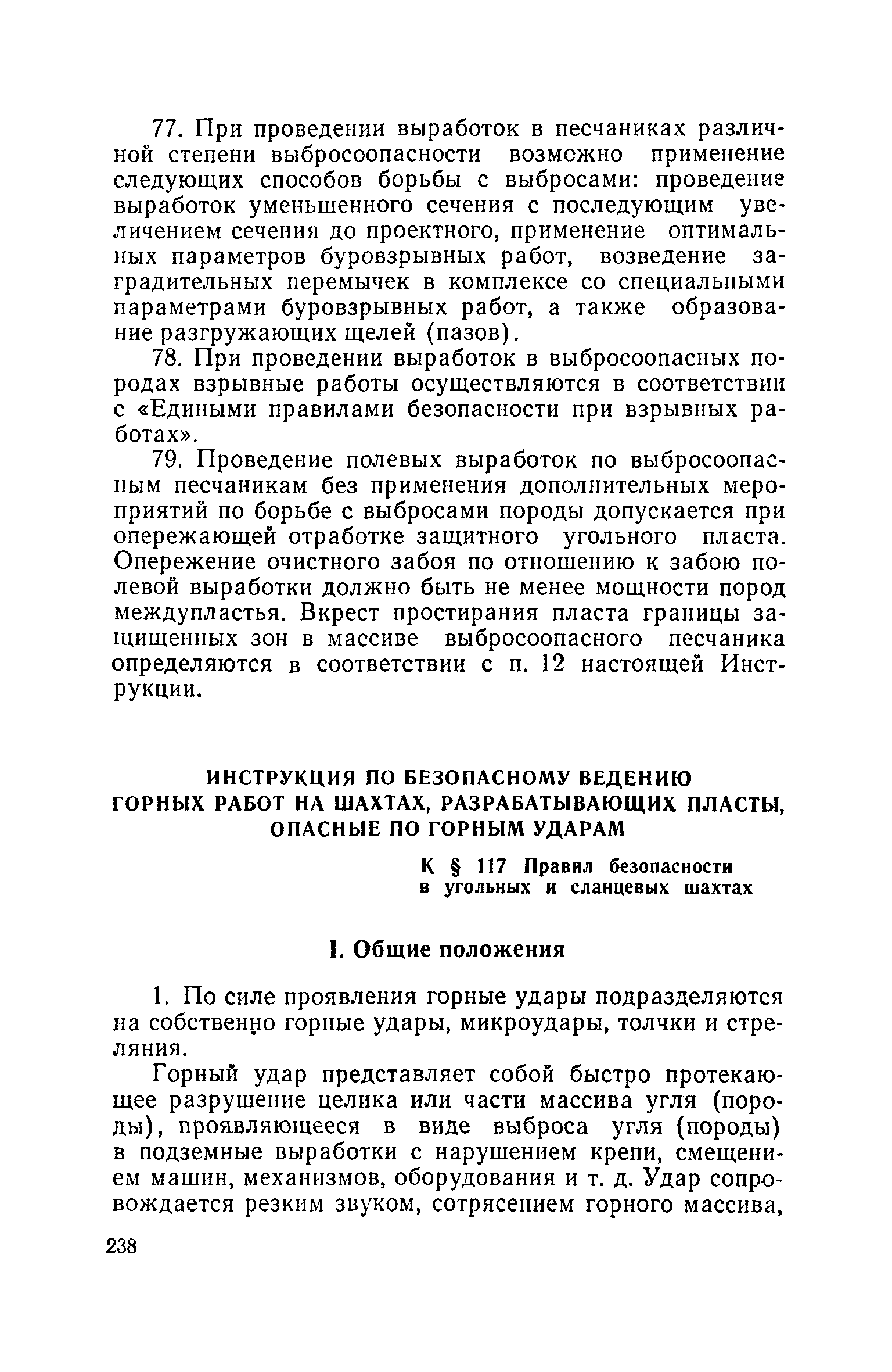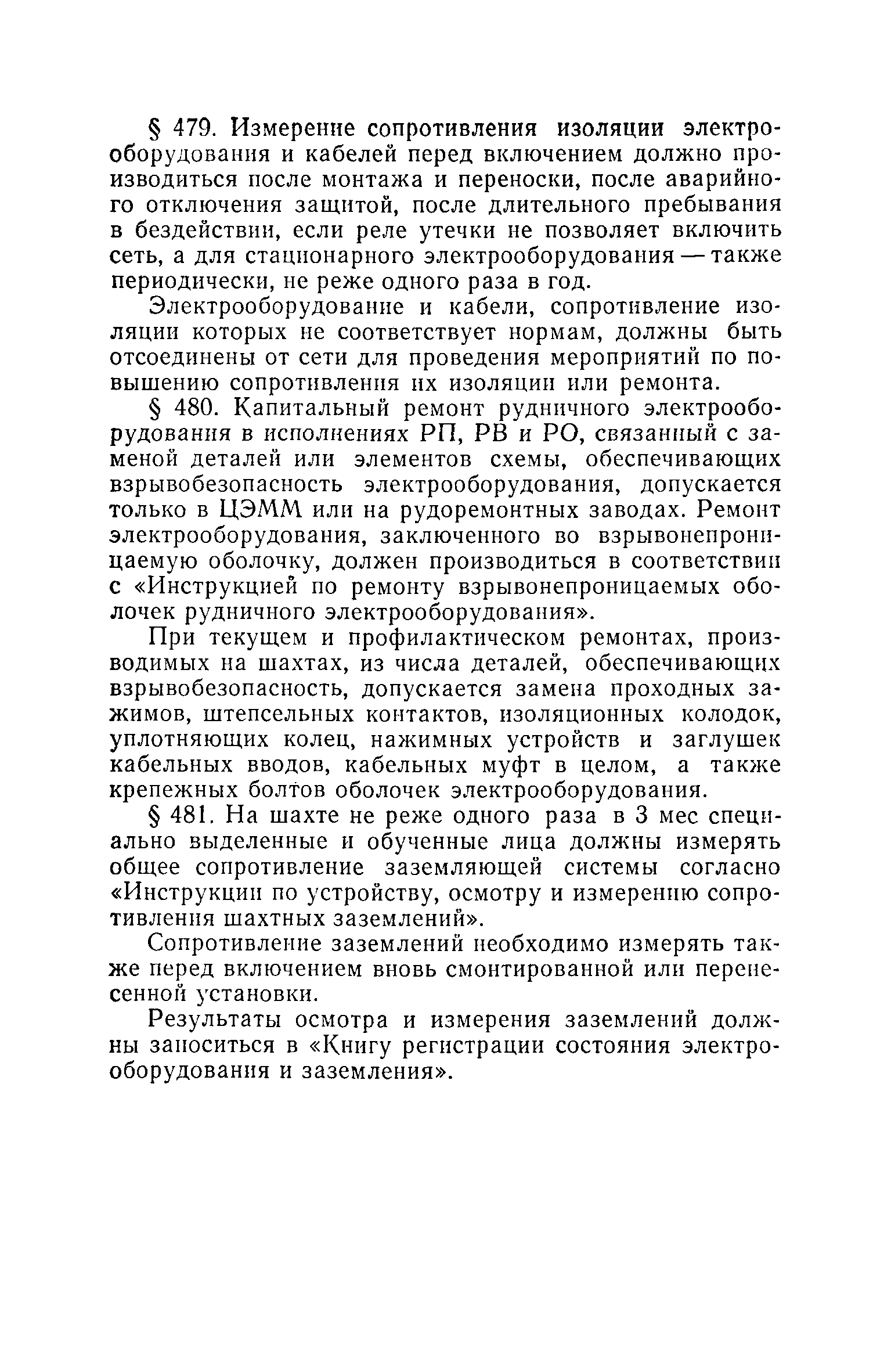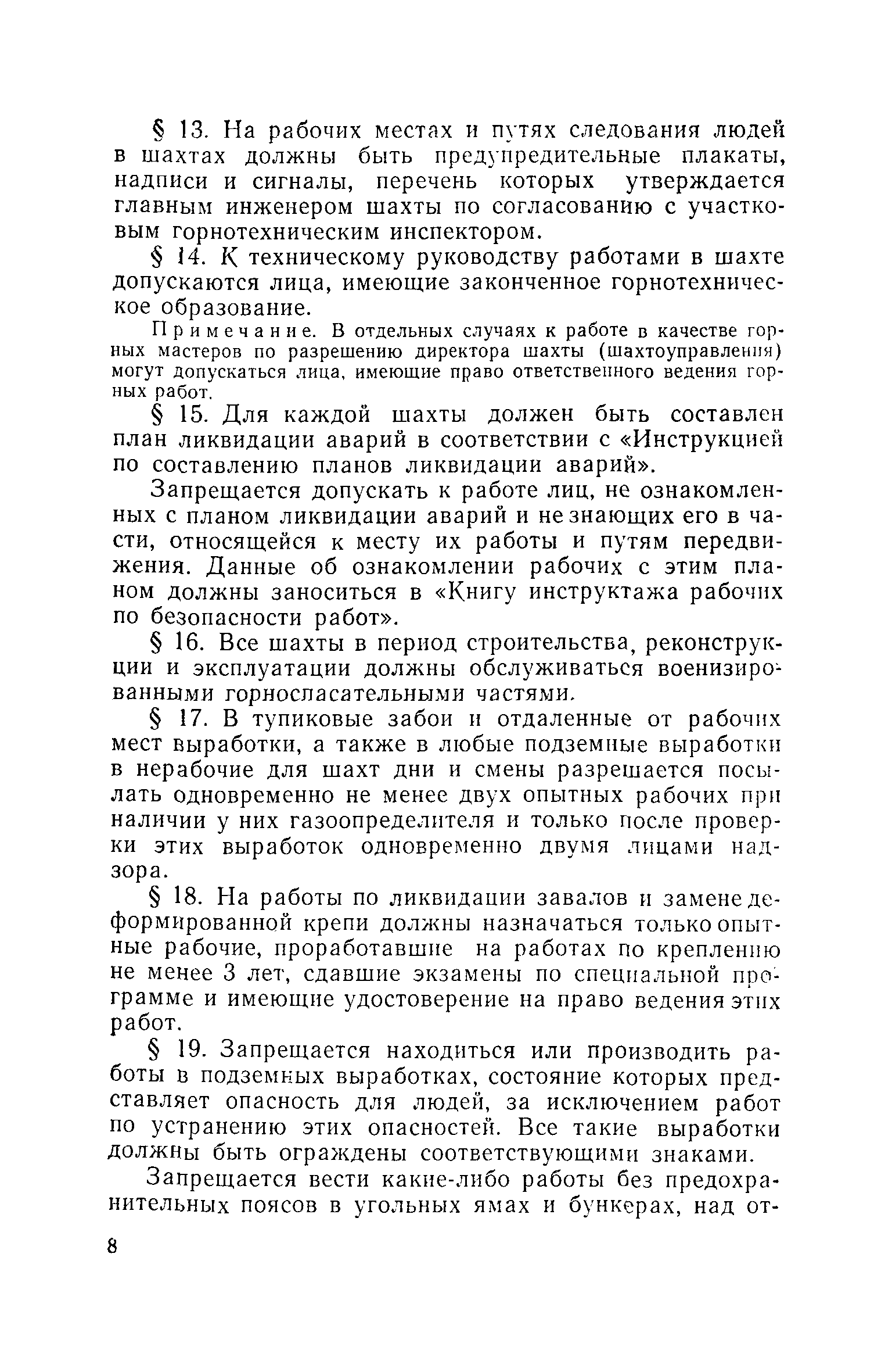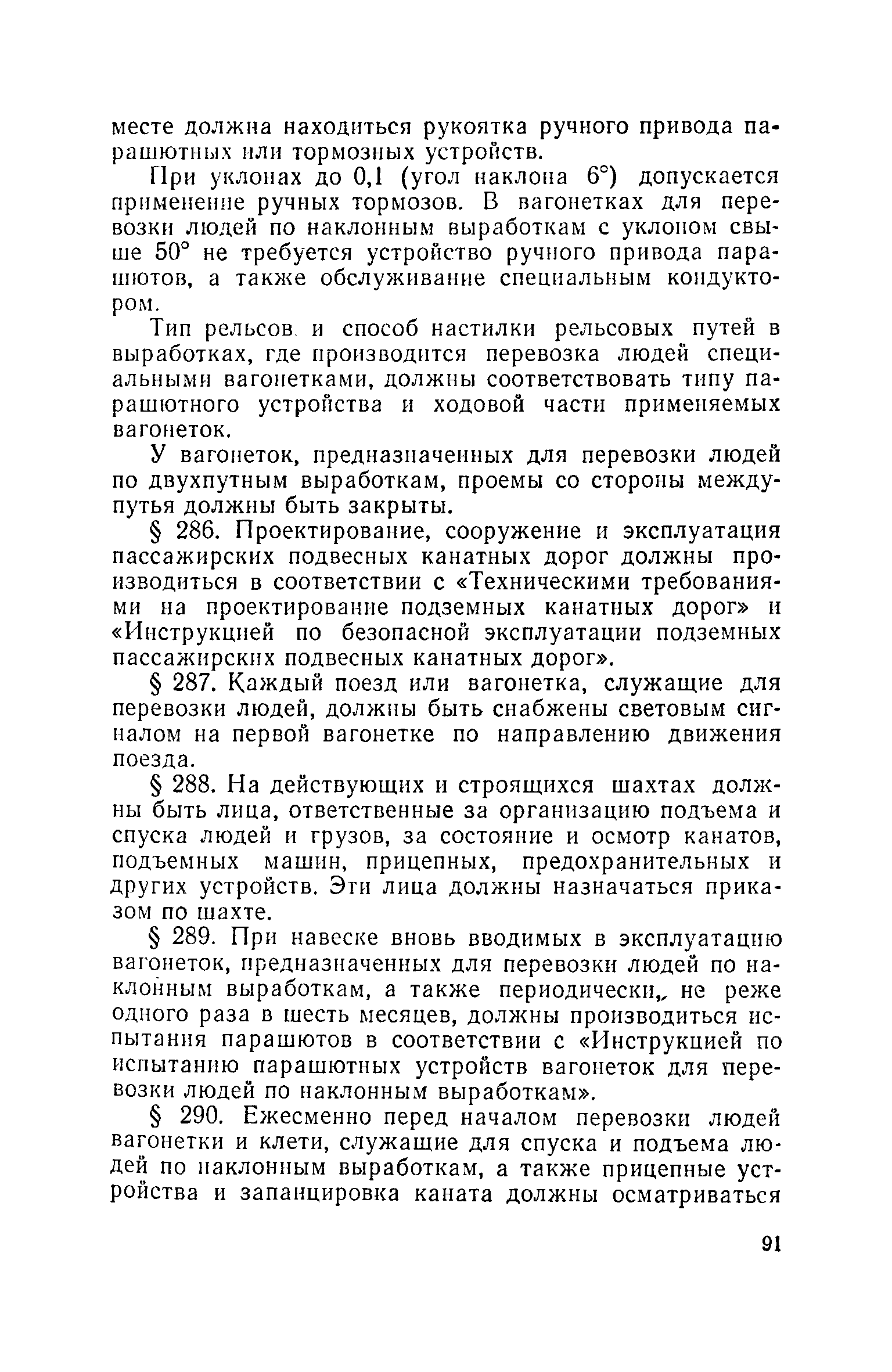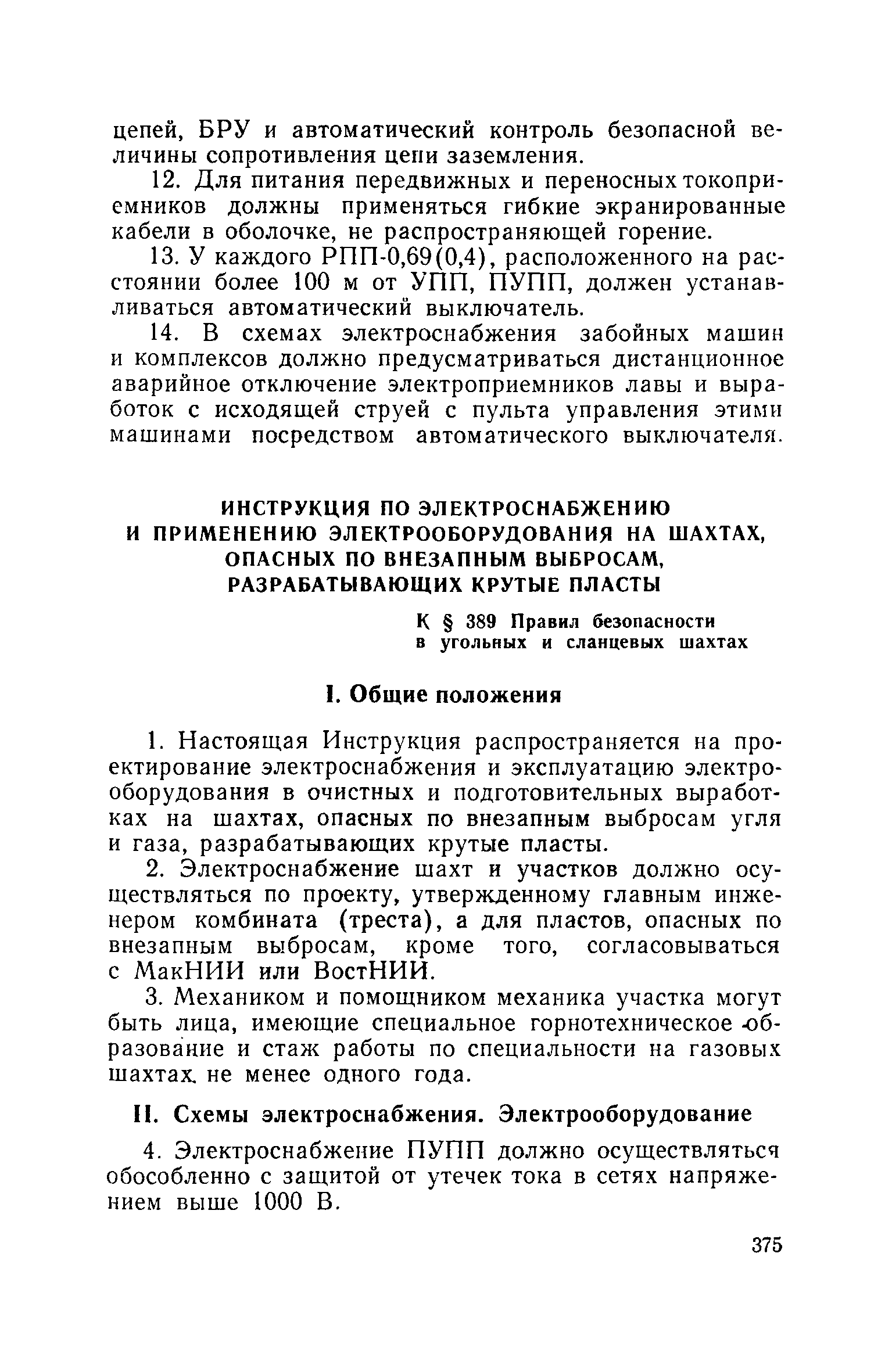 Правила безопасности в угольных и сланцевых шахтах| Статус: | не действует | | Название рус.: | Правила безопасности в угольных и сланцевых шахтах | | Дата добавления в базу: | 01.02.2020 | | Дата актуализации: | 01.01.2021 | | Область применения: | Правила обязательны для административно-технических руководителей и других должностных лиц действующих и строящихся шахт, а также для работников научно-исследовательских, проектных и других организаций и учреждений. Правила распространяются на проектирование, строительство, реконструкцию и эксплуатацию угольных и сланцевых шахт. | | Оглавление: | Глава I. Общие правила Глава II. Ведение горных работ Глава III. Проветривание подземных выработок и пылегазовый режим Глава IV. Рудничный транспорт и подъем Глава V. Электротехническое хозяйство Глава VI. Предупреждение и тушение рудничных пожаров Глава VII. Предотвращение затоплений действующих выработок Глава VIII. Промышленная санитарии Глава IХ. Ответственность за нарушение правил безопасности Инструкция по составлению планов ликвидации аварий Инструкция по составлению проектов вскрытия и подготовки выемочных участков, подготовки очистных забоев, паспортов управления кровлей, проведения и крепления подземных выработок Инструкция по безопасному ведению горных работ на пластах, склонных к внезапным выбросам угля, породы и газа Инструкция по безопасному ведению горных работ на шахтах, разрабатывающих пласты, опасные по горным ударам Инструкция по отбору проб рудничного воздуха, определению газообильности и установлению категорий шахт по метану Инструкция по безопасной эксплуатации установок кондиционирования рудничного воздуха Инструкция по реверсированию вентиляционной струи и проверке действия реверсивных устройств вентиляторных установок Инструкция по разгазированию горных выработок и борьбе со слоевыми и местными скоплениями метана Инструкция по безопасному ведению дегазационных работ на шахтах Инструкция по предупреждению и локализации взрывов угольной пыли Инструкция по составлению вентиляционных планов Инструкция по замеру концентрации газов в шахте и применению автоматических приборов контроля содержания метана Инструкция по безопасной эксплуатации подземных пассажирских подвесных канатных дорог Инструкция по электроснабжению и применению электрооборудования в тупиковых выработках, проветриваемых ВМП, в шахтах, опасных по газу Инструкция по электроснабжению и применению электрооборудования на пологих и наклонных пластах, опасных по внезапным выбросам угля и газа Инструкция по электроснабжению и применению электрооборудования на шахтах, опасных по внезапным выбросам, разрабатывающих крутые пласты Инструкция по применению электрооборудования в рудничном нормальном и общепромышленном исполнении в шахтах, опасных по газу или пыли Инструкция по выбору и проверке уставок реле максимального тока и плавких вставок предохранителей в шахтных электрических сетях Инструкция по устройству, осмотру и измерению сопротивления шахтных заземлений Инструкция по осмотру и ревизии рудничного взрывобезопасного электрооборудования Инструкция по проверке максимальной токовой защиты шахтных аппаратов Инструкция по противопожарной защите угольных и сланцевых шахт Инструкция по ведению огневых работ в подземных выработк