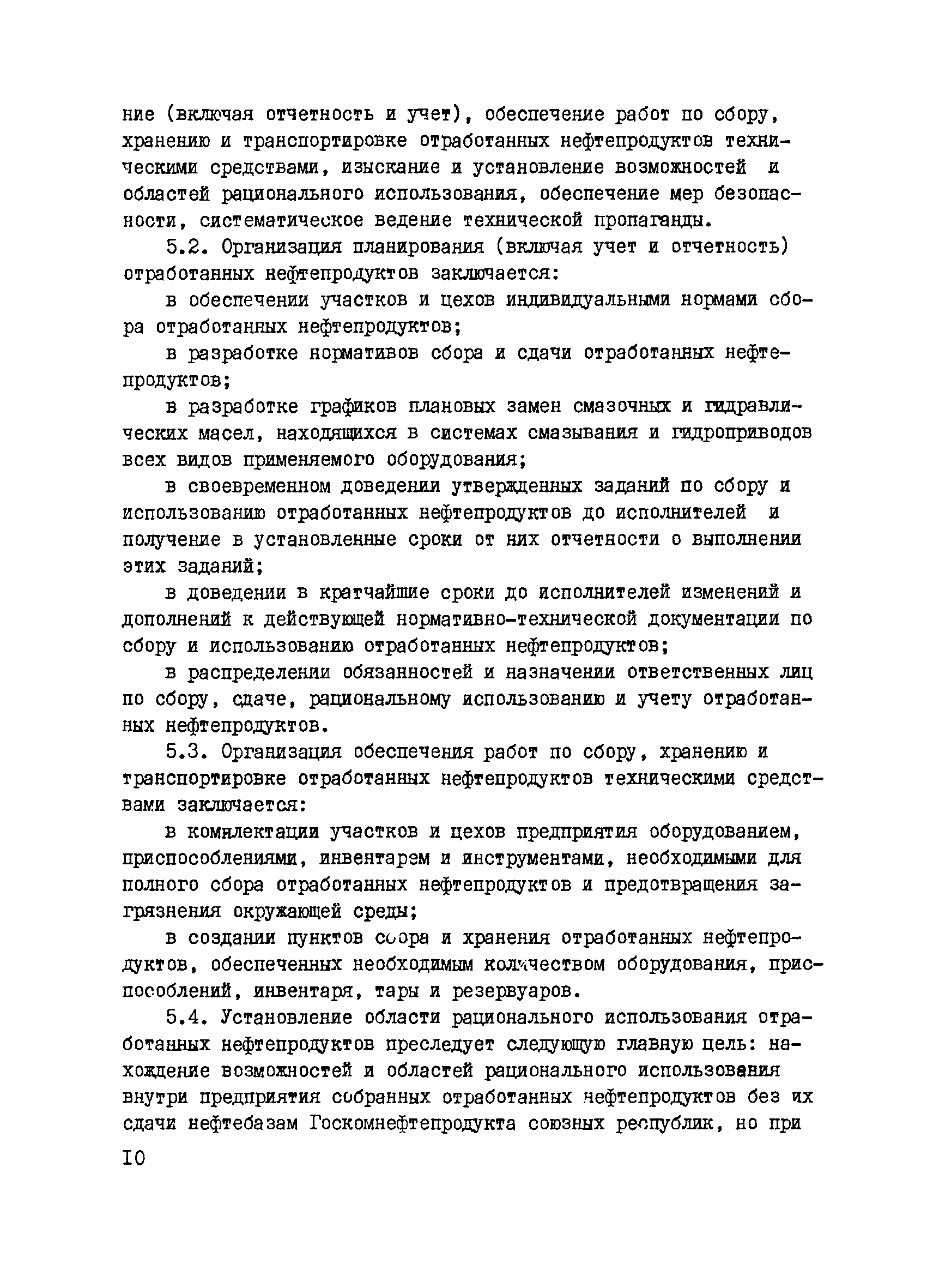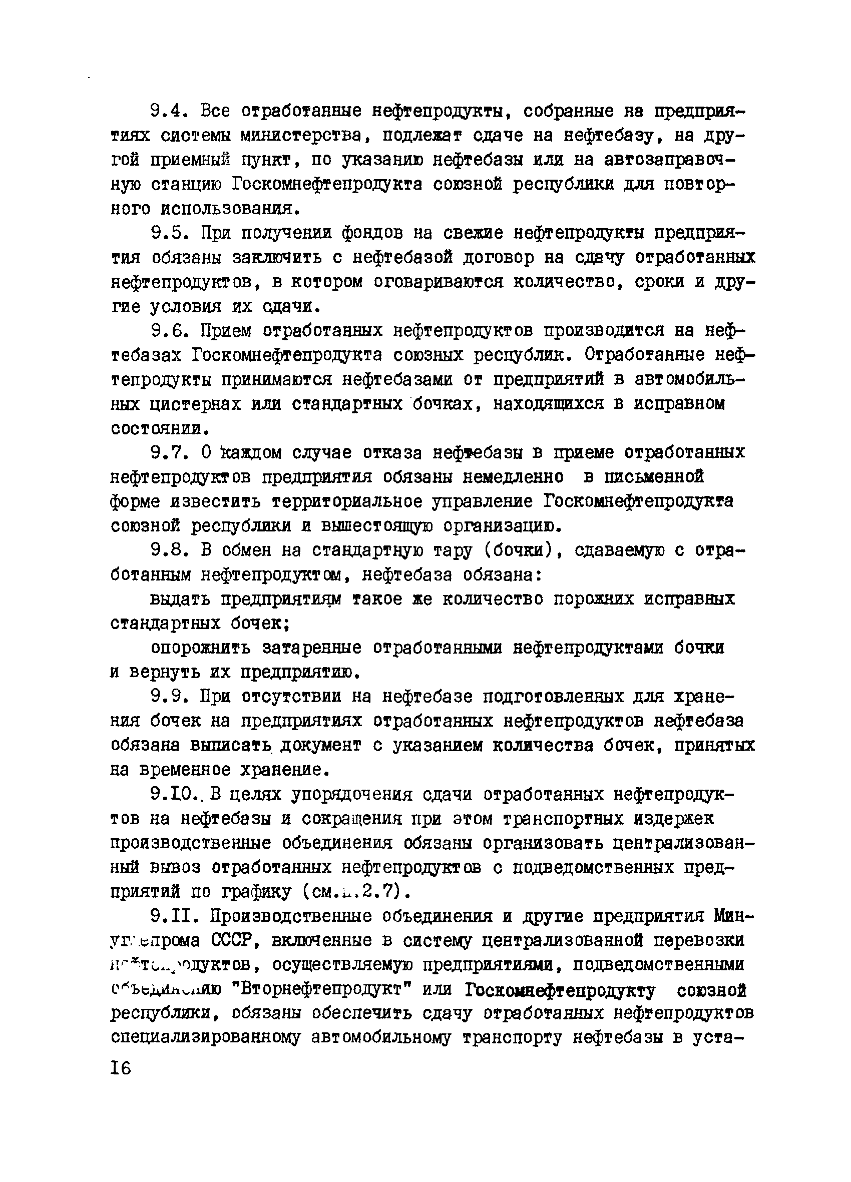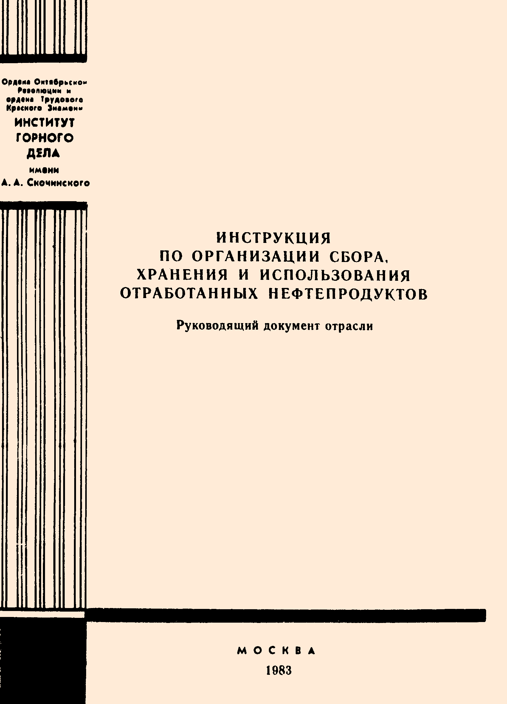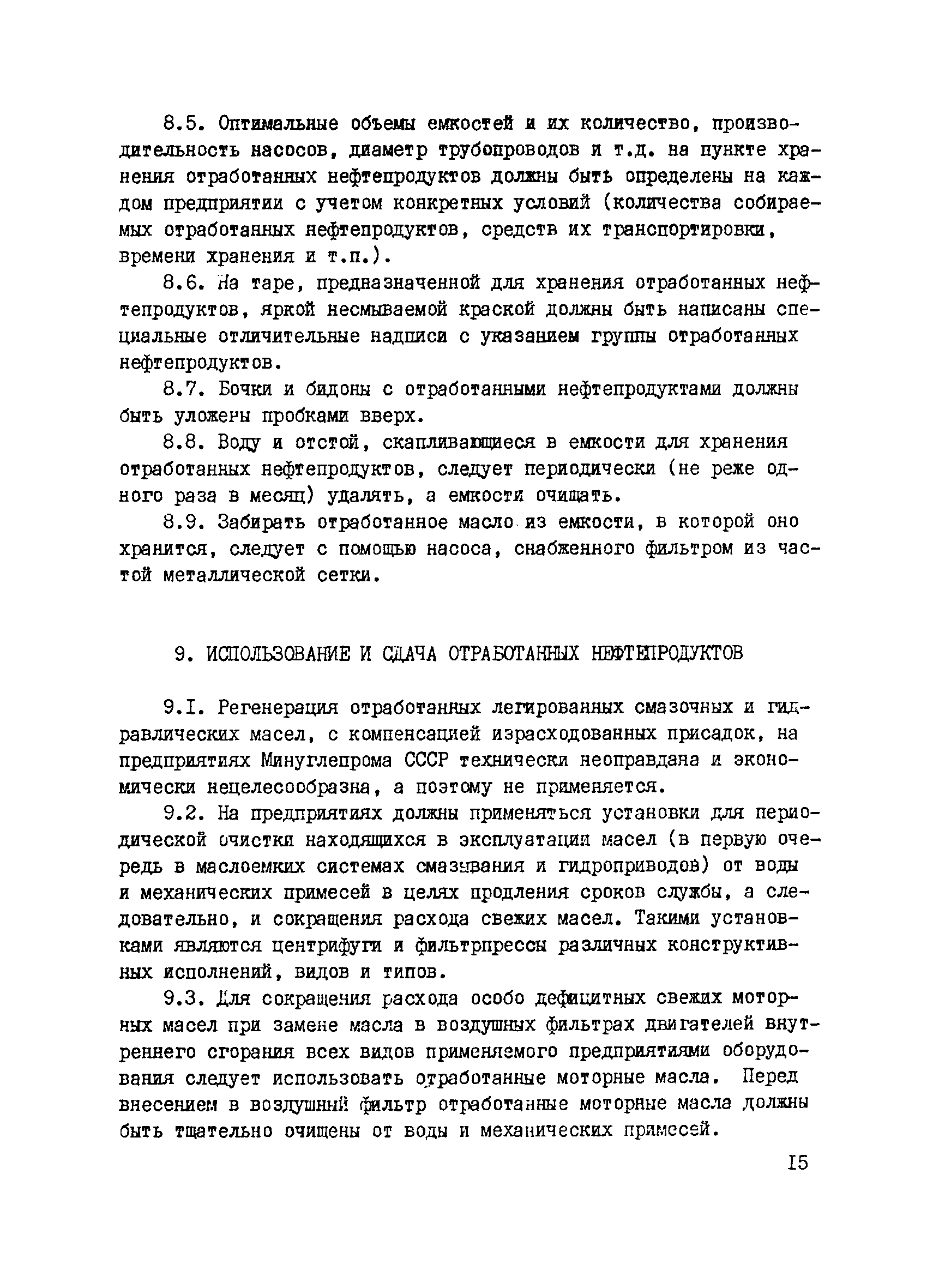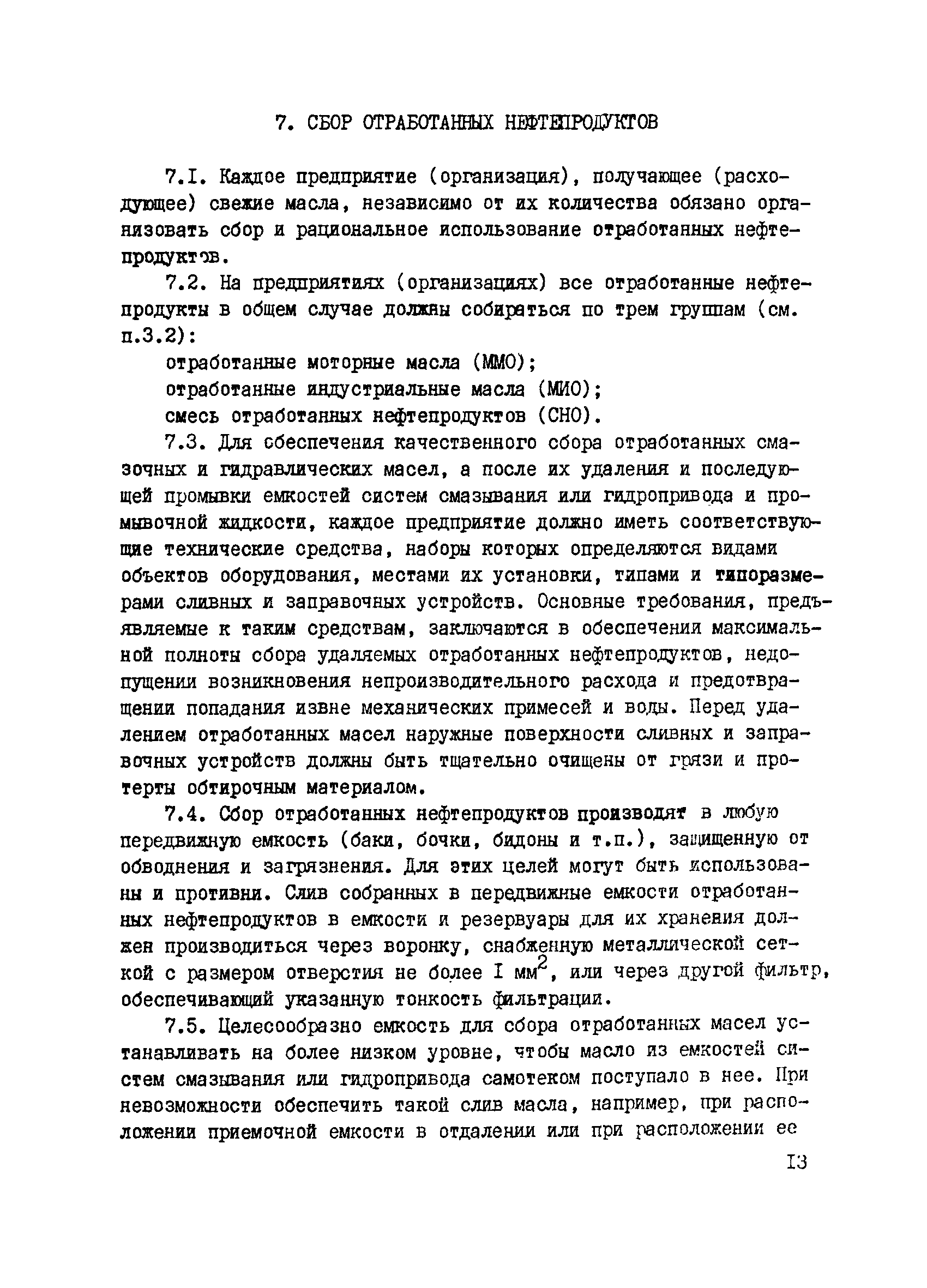 | Оглавление: | 1. Введение 2. Общие положения 3. Классификация отработанных нефтепродуктов 4. Планирование сбора отработанных нефтепродуктов 5. Организация сборе отработанных нефтепродуктов 6. Обязанности и ответственность структурных подразделение отрасли за сбор, хранение и сдачу отработанных нефтепродуктов 7. Сбор отработанных нефтепродуктов 8. Хранение отработанных нефтепродуктов 9. Использование я сдача отработанных нефтепродуктов на нефтебазы 10. Учет я отчетность при сборе и сдаче отработанных нефтепродуктов 11. Премирование персонала предприятий за сбор, использование и сдачу отработанных нефтепродуктов 12. Правила техники безопасности я противопожарной безопасности Приложение 1. Порядок отпуска свежих масел потребителям в зависимости от выполнения ими заданий по сбору и сдаче отработанных масел (извлечения) Приложение 2. Порядок отпуска потребителям отработанных нефтепродуктов и регенерированных масел Приложение 3. Дополнительный прейскурант Приложение 4. Инструкция о порядке составления отчета о выполнении заданий по сбору и использованию отработанных нефтепродуктов по форме 19-СН Приложение 5. Временное положение о порядке и условиях выплаты премий работником предприятий и организаций за сбор, хранение, регенерацию, рациональное использование и транспортировку отработанных масел и других нефтепродуктов Приложение 6. Указания мер безопасности при применении этилированного бензина |