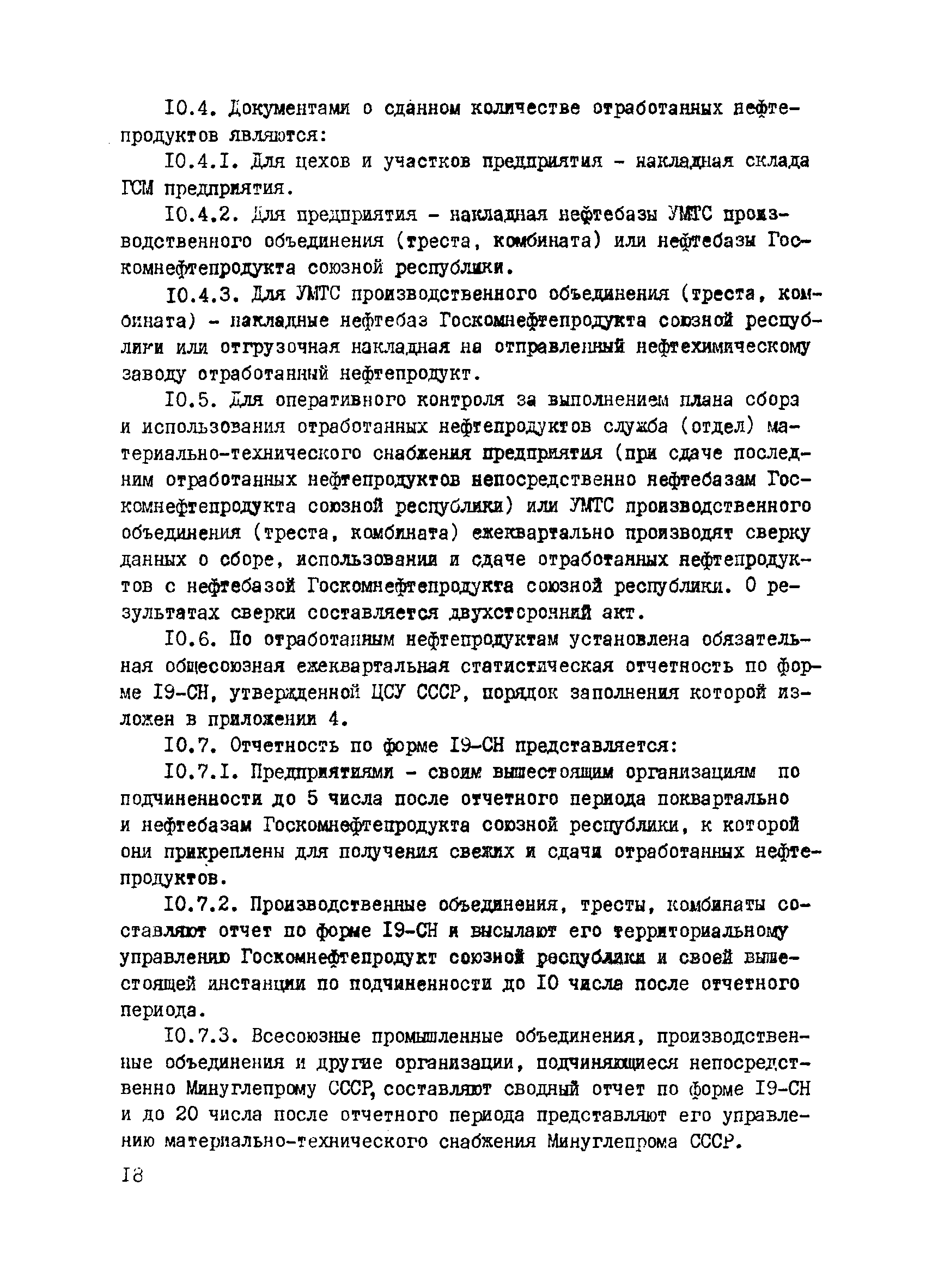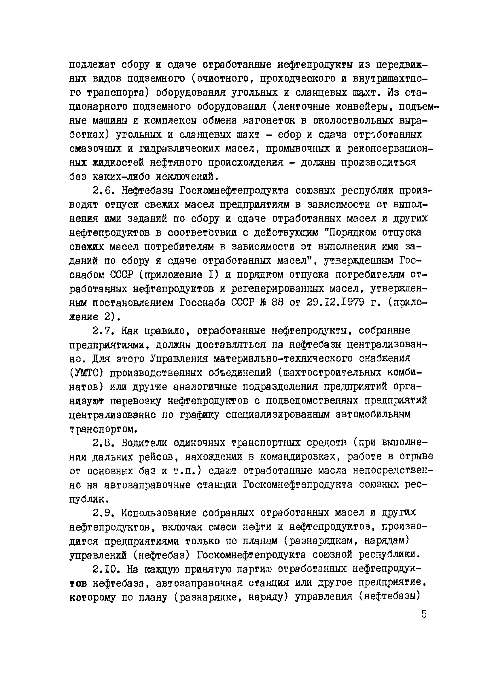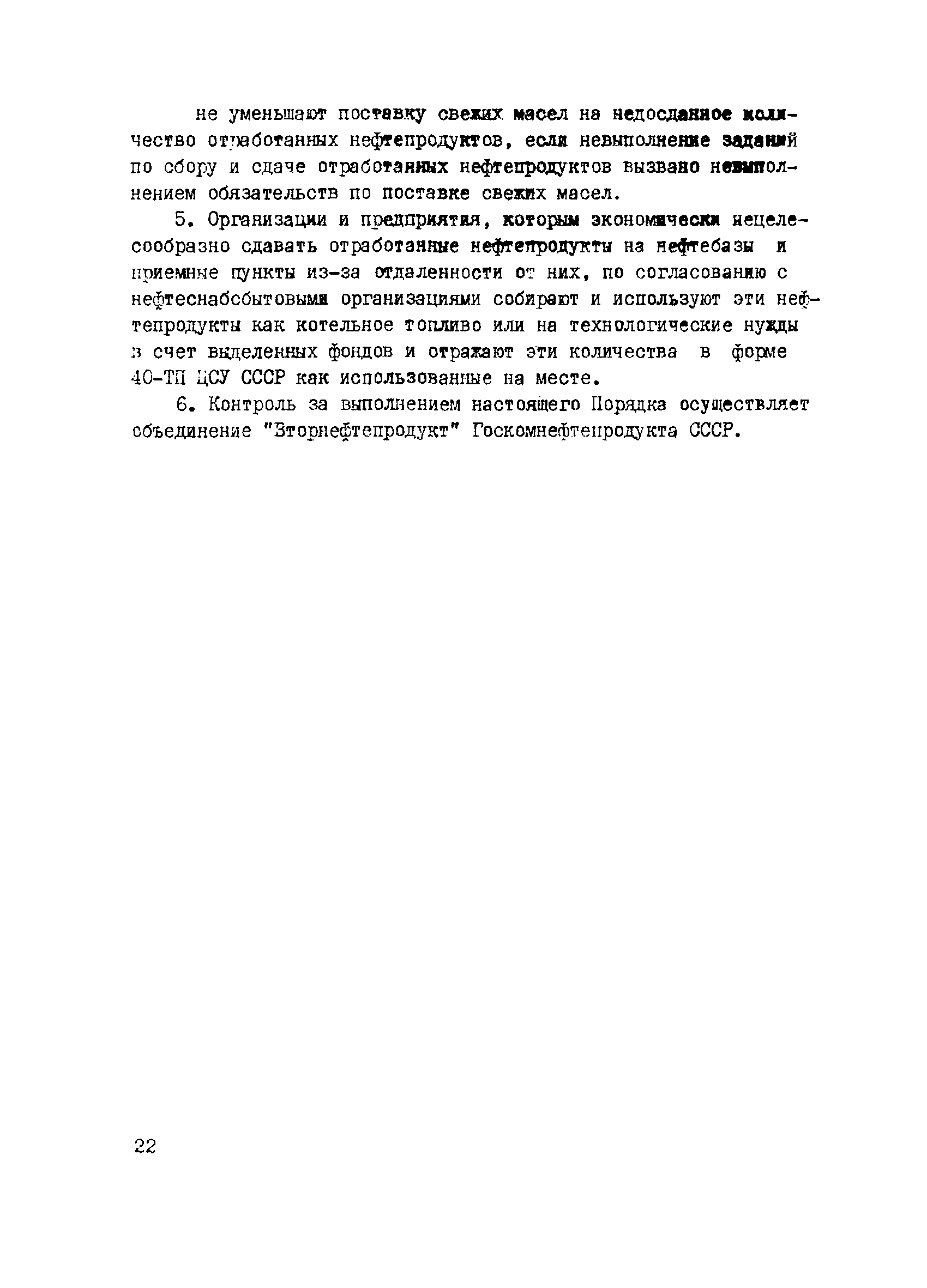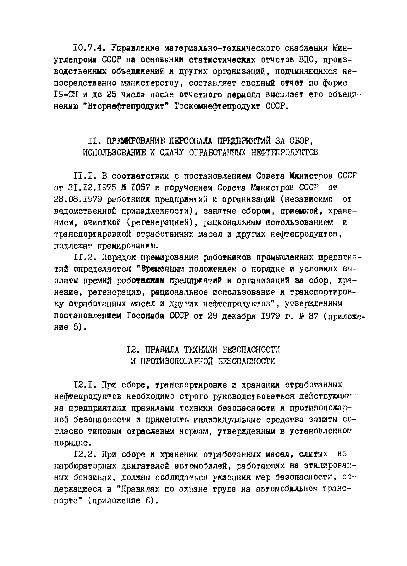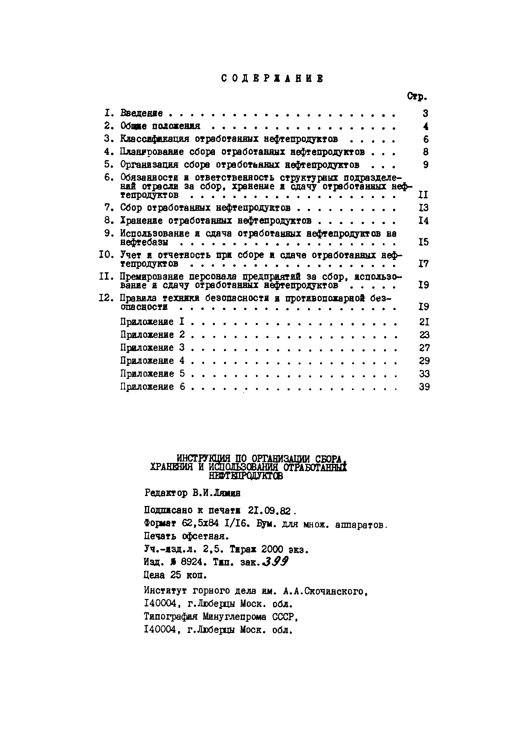 | Оглавление: | 1. Введение 2. Общие положения 3. Классификация отработанных нефтепродуктов 4. Планирование сбора отработанных нефтепродуктов 5. Организация сборе отработанных нефтепродуктов 6. Обязанности и ответственность структурных подразделение отрасли за сбор, хранение и сдачу отработанных нефтепродуктов 7. Сбор отработанных нефтепродуктов 8. Хранение отработанных нефтепродуктов 9. Использование я сдача отработанных нефтепродуктов на нефтебазы 10. Учет я отчетность при сборе и сдаче отработанных нефтепродуктов 11. Премирование персонала предприятий за сбор, использование и сдачу отработанных нефтепродуктов 12. Правила техники безопасности я противопожарной безопасности Приложение 1. Порядок отпуска свежих масел потребителям в зависимости от выполнения ими заданий по сбору и сдаче отработанных масел (извлечения) Приложение 2. Порядок отпуска потребителям отработанных нефтепродуктов и регенерированных масел Приложение 3. Дополнительный прейскурант Приложение 4. Инструкция о порядке составления отчета о выполнении заданий по сбору и использованию отработанных нефтепродуктов по форме 19-СН Приложение 5. Временное положение о порядке и условиях выплаты премий работником предприятий и организаций за сбор, хранение, регенерацию, рациональное использование и транспортировку отработанных масел и других нефтепродуктов Приложение 6. Указания мер безопасности при применении этилированного бензина |