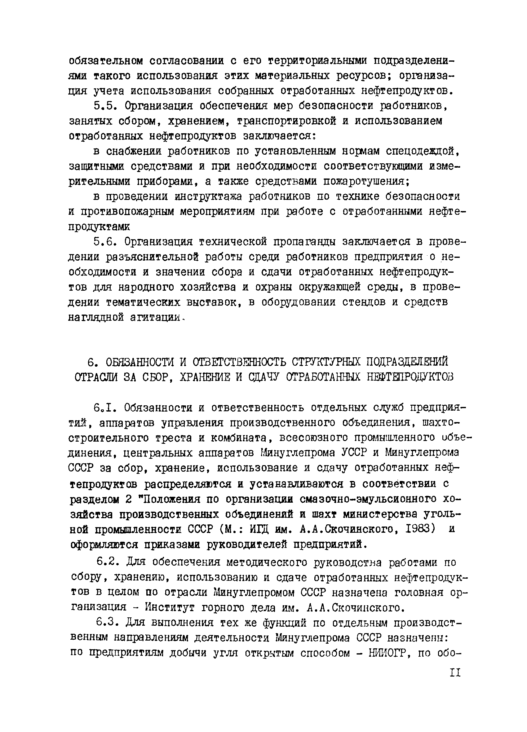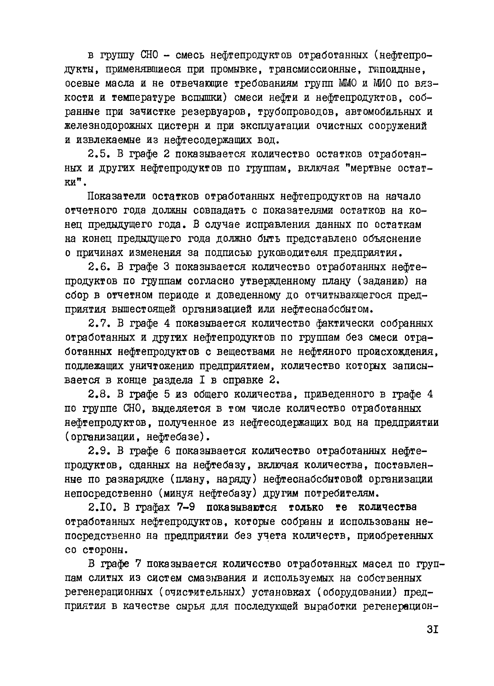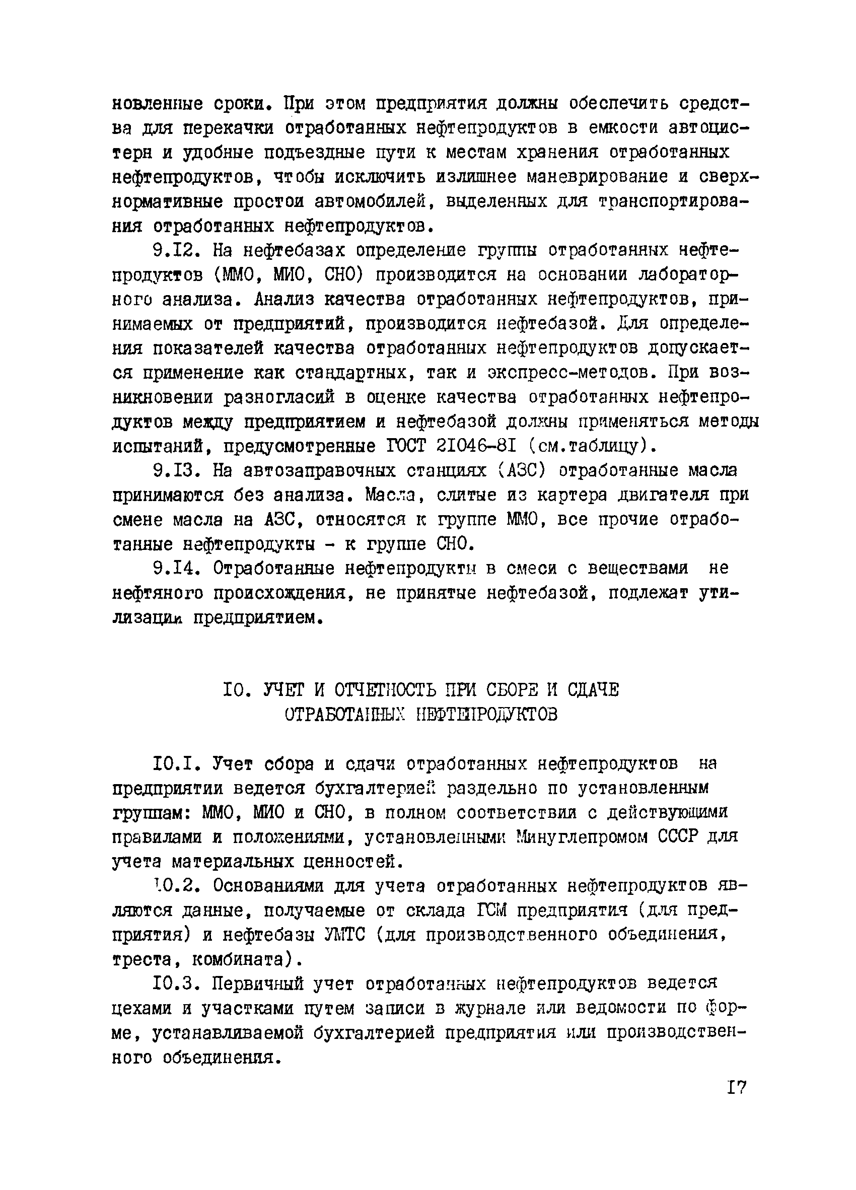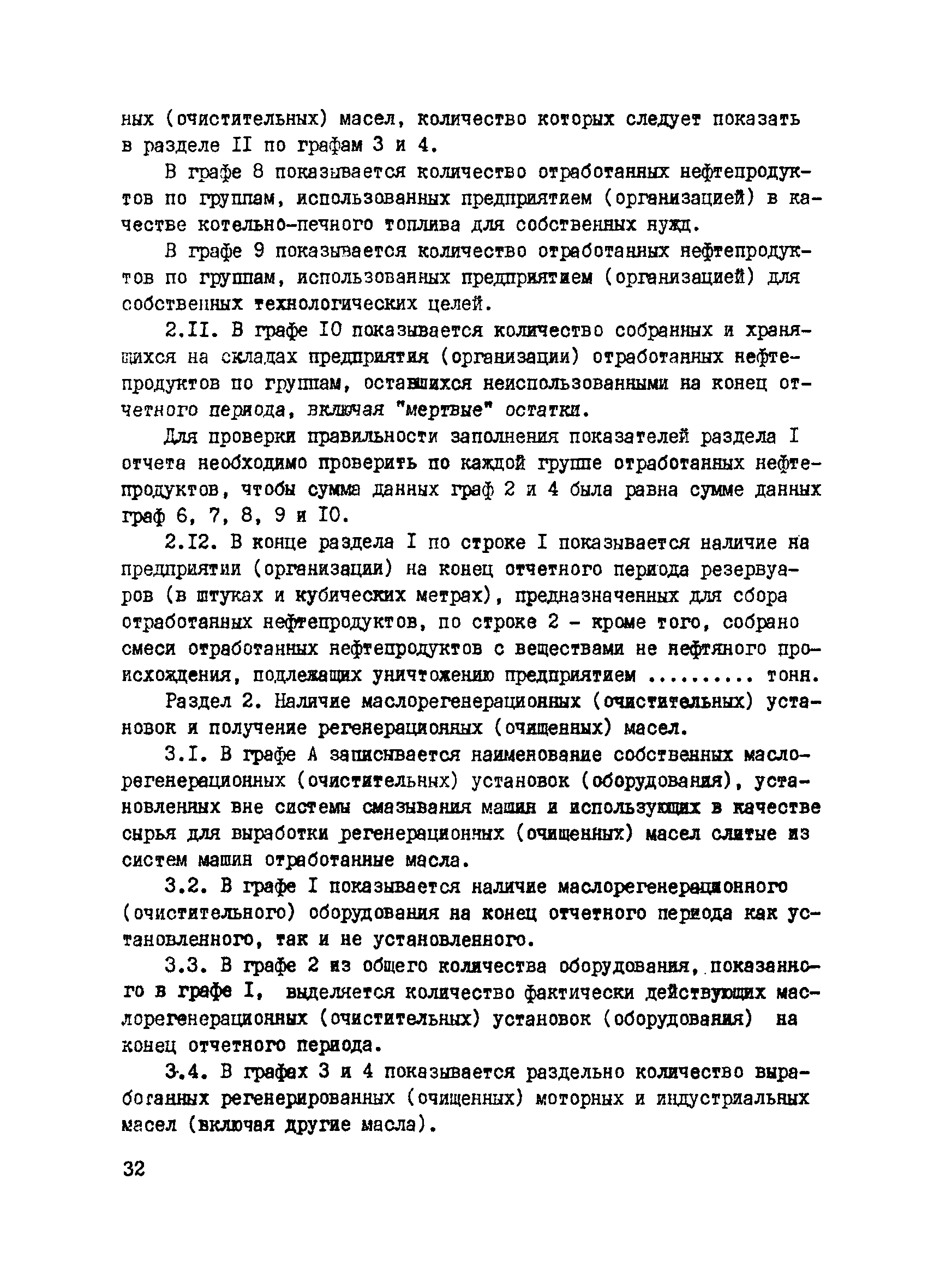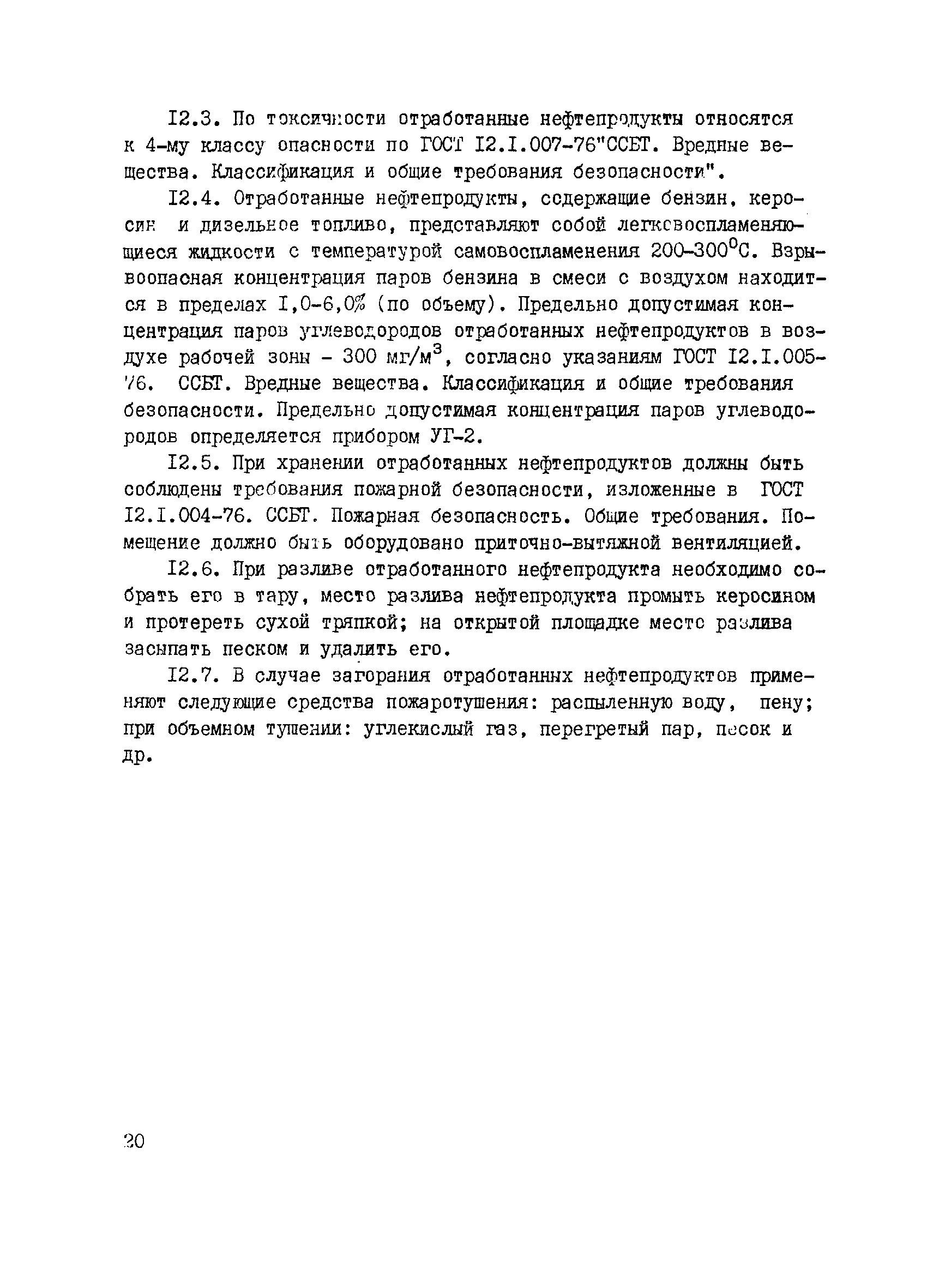 | Оглавление: | 1. Введение 2. Общие положения 3. Классификация отработанных нефтепродуктов 4. Планирование сбора отработанных нефтепродуктов 5. Организация сборе отработанных нефтепродуктов 6. Обязанности и ответственность структурных подразделение отрасли за сбор, хранение и сдачу отработанных нефтепродуктов 7. Сбор отработанных нефтепродуктов 8. Хранение отработанных нефтепродуктов 9. Использование я сдача отработанных нефтепродуктов на нефтебазы 10. Учет я отчетность при сборе и сдаче отработанных нефтепродуктов 11. Премирование персонала предприятий за сбор, использование и сдачу отработанных нефтепродуктов 12. Правила техники безопасности я противопожарной безопасности Приложение 1. Порядок отпуска свежих масел потребителям в зависимости от выполнения ими заданий по сбору и сдаче отработанных масел (извлечения) Приложение 2. Порядок отпуска потребителям отработанных нефтепродуктов и регенерированных масел Приложение 3. Дополнительный прейскурант Приложение 4. Инструкция о порядке составления отчета о выполнении заданий по сбору и использованию отработанных нефтепродуктов по форме 19-СН Приложение 5. Временное положение о порядке и условиях выплаты премий работником предприятий и организаций за сбор, хранение, регенерацию, рациональное использование и транспортировку отработанных масел и других нефтепродуктов Приложение 6. Указания мер безопасности при применении этилированного бензина |