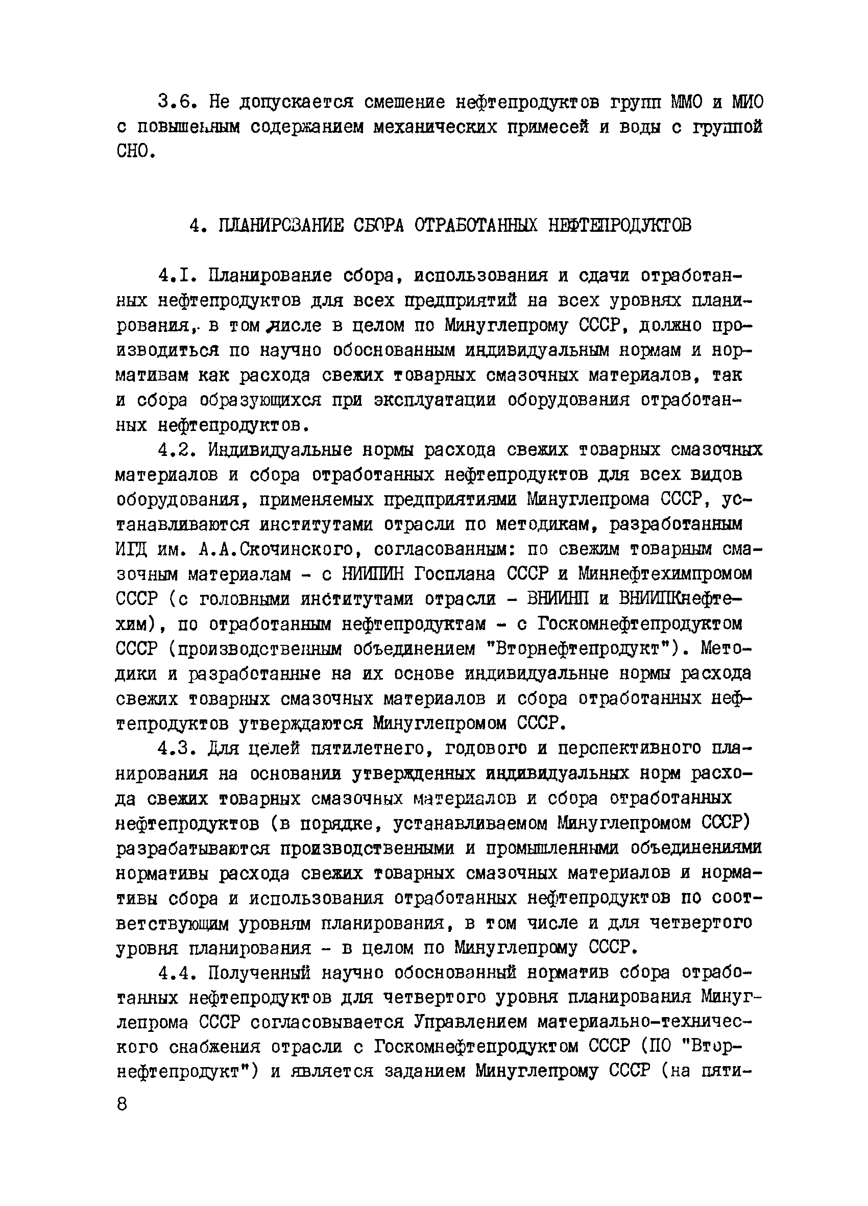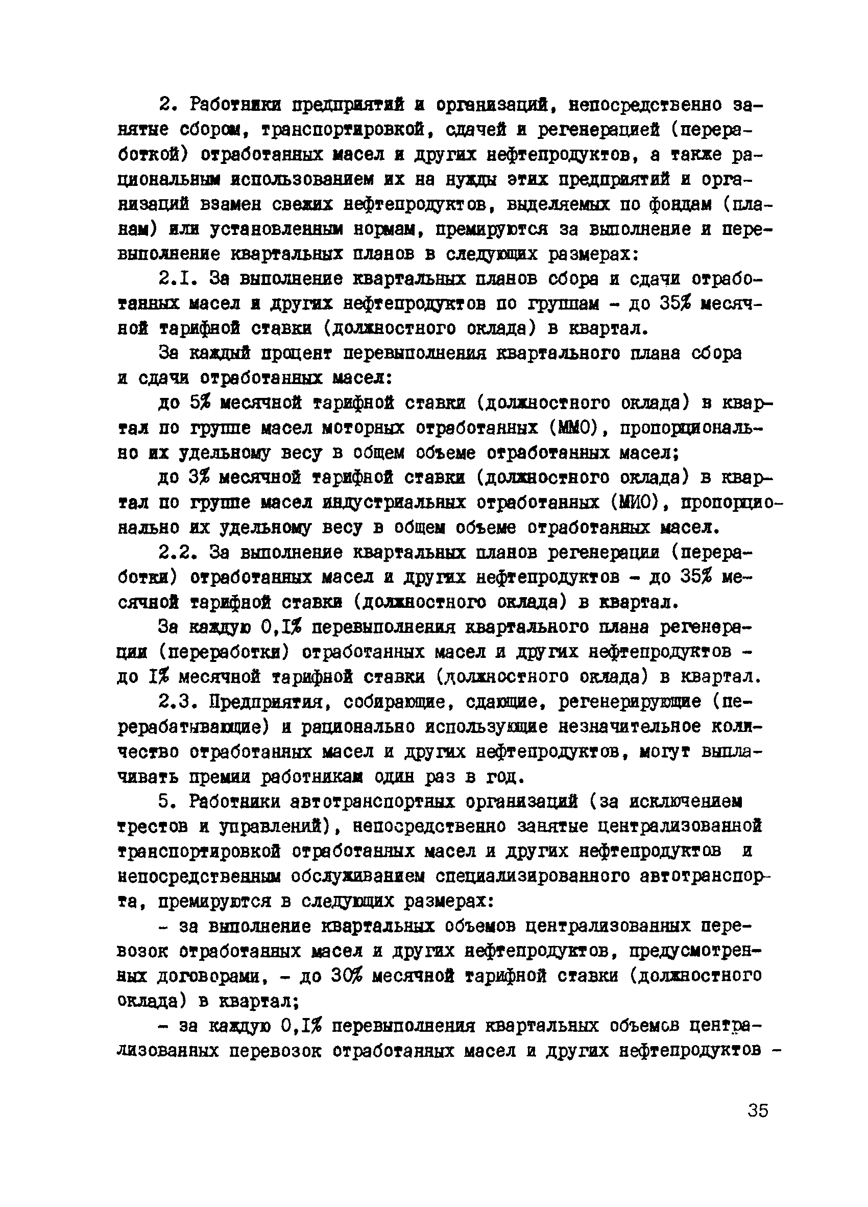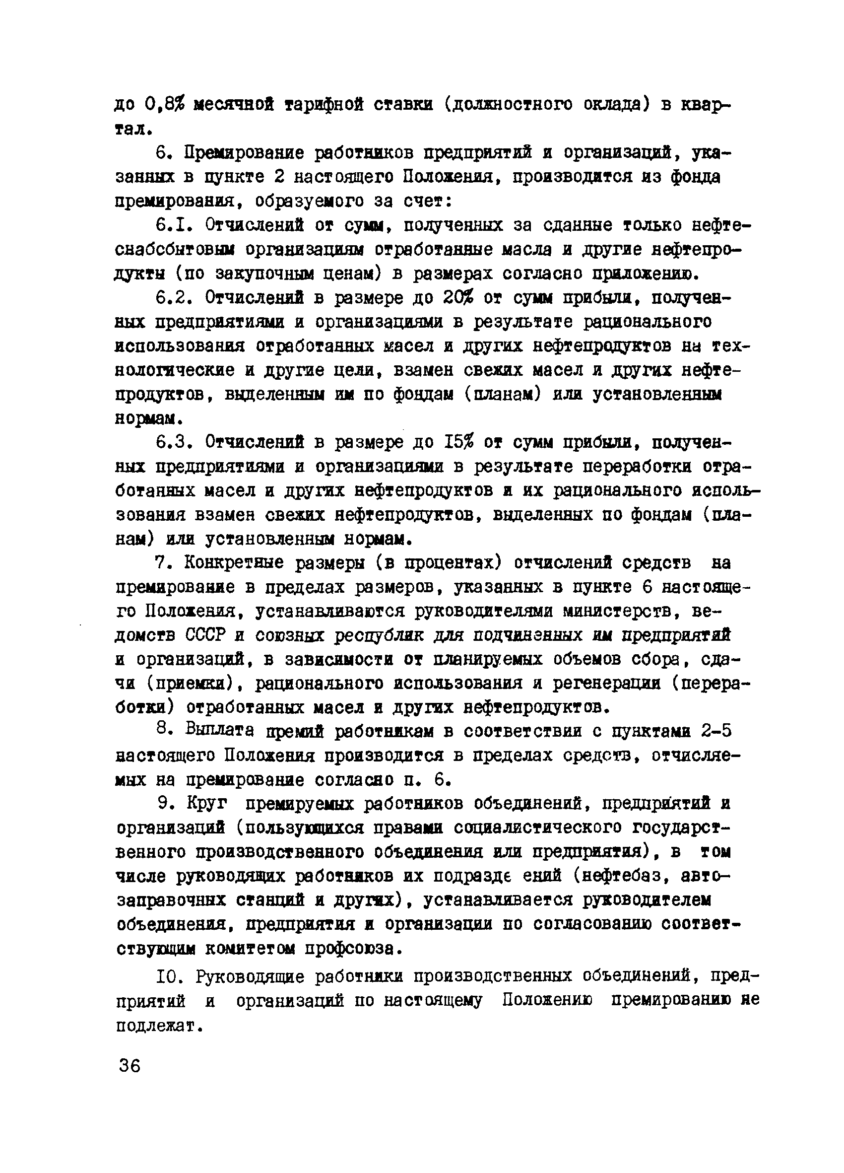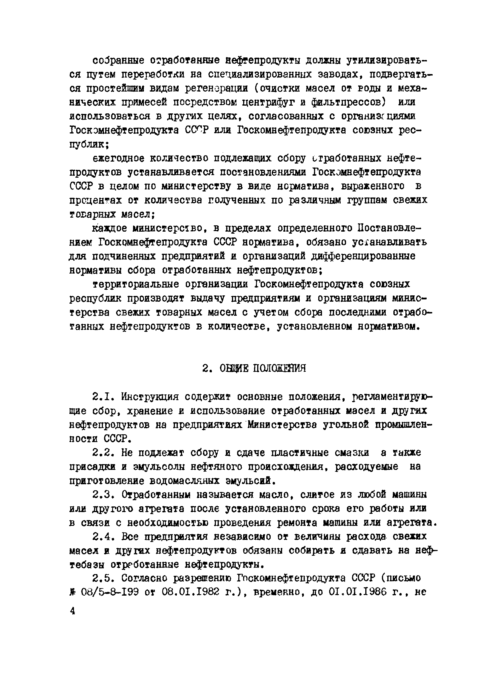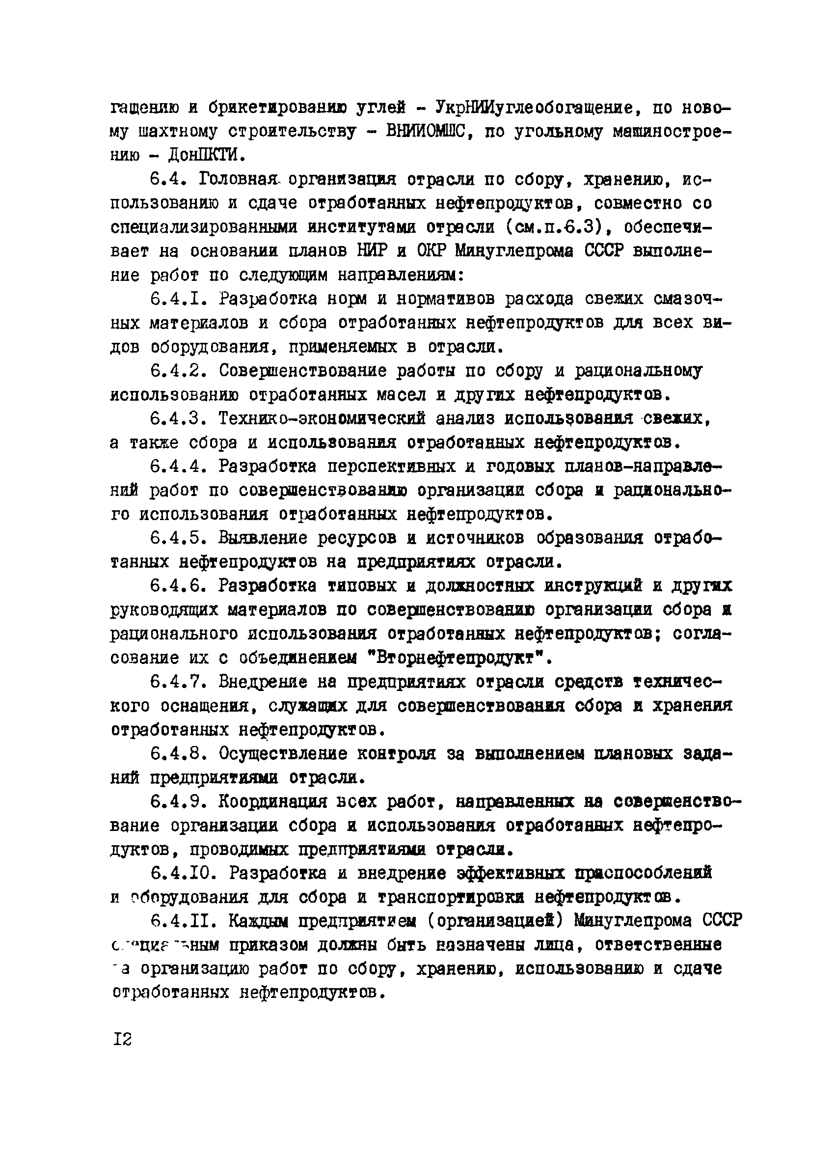 | Оглавление: | 1. Введение 2. Общие положения 3. Классификация отработанных нефтепродуктов 4. Планирование сбора отработанных нефтепродуктов 5. Организация сборе отработанных нефтепродуктов 6. Обязанности и ответственность структурных подразделение отрасли за сбор, хранение и сдачу отработанных нефтепродуктов 7. Сбор отработанных нефтепродуктов 8. Хранение отработанных нефтепродуктов 9. Использование я сдача отработанных нефтепродуктов на нефтебазы 10. Учет я отчетность при сборе и сдаче отработанных нефтепродуктов 11. Премирование персонала предприятий за сбор, использование и сдачу отработанных нефтепродуктов 12. Правила техники безопасности я противопожарной безопасности Приложение 1. Порядок отпуска свежих масел потребителям в зависимости от выполнения ими заданий по сбору и сдаче отработанных масел (извлечения) Приложение 2. Порядок отпуска потребителям отработанных нефтепродуктов и регенерированных масел Приложение 3. Дополнительный прейскурант Приложение 4. Инструкция о порядке составления отчета о выполнении заданий по сбору и использованию отработанных нефтепродуктов по форме 19-СН Приложение 5. Временное положение о порядке и условиях выплаты премий работником предприятий и организаций за сбор, хранение, регенерацию, рациональное использование и транспортировку отработанных масел и других нефтепродуктов Приложение 6. Указания мер безопасности при применении этилированного бензина |