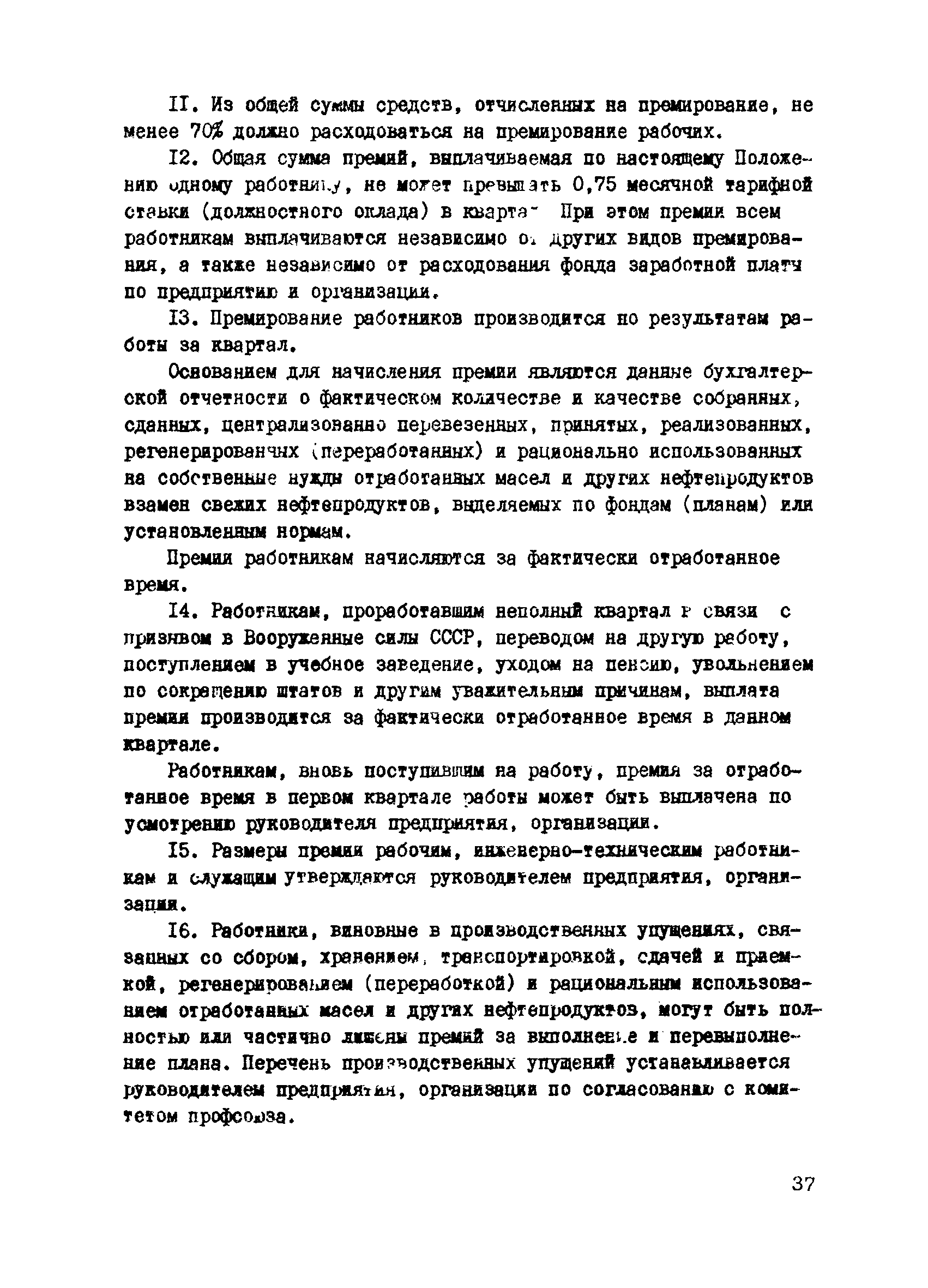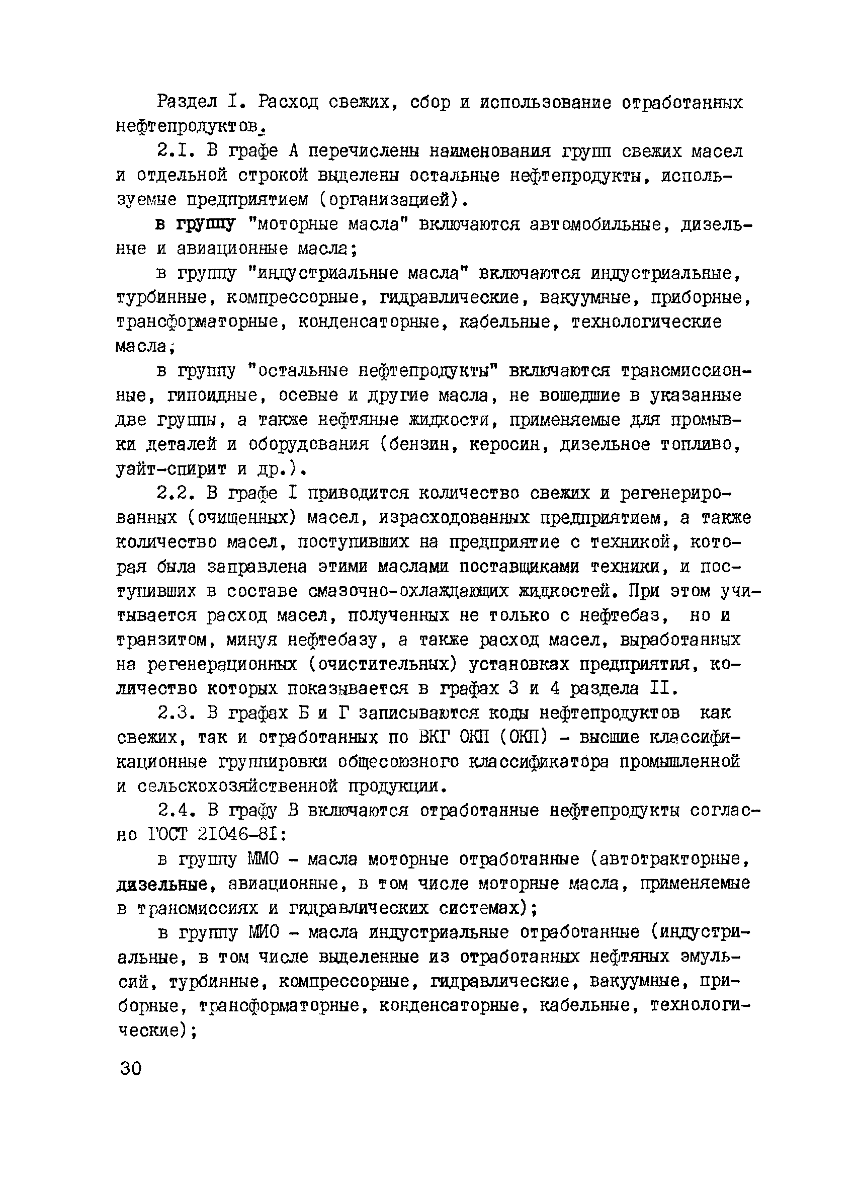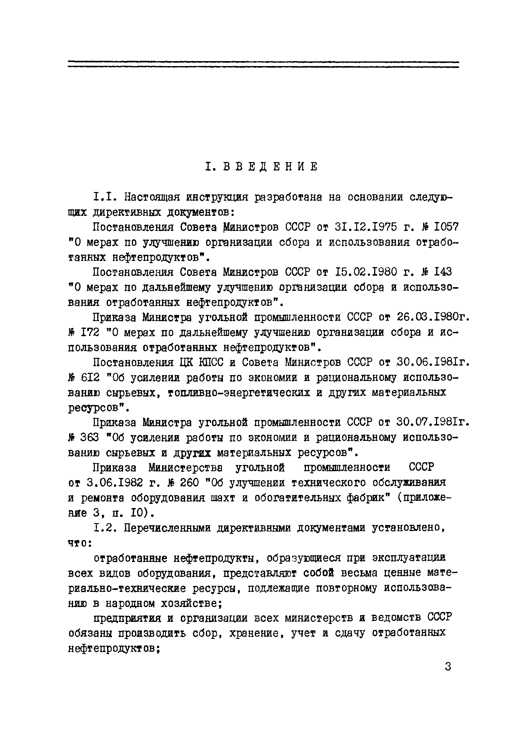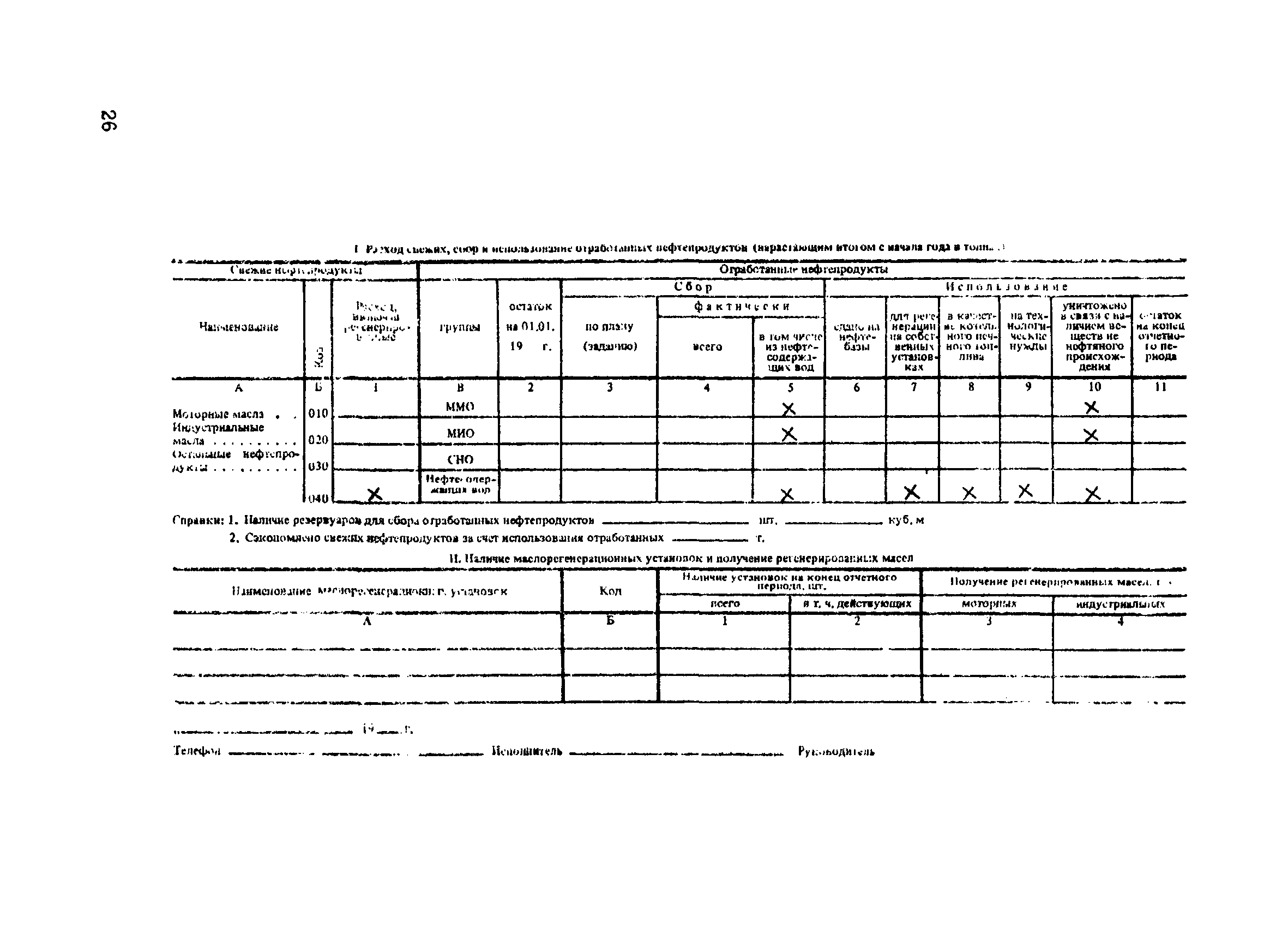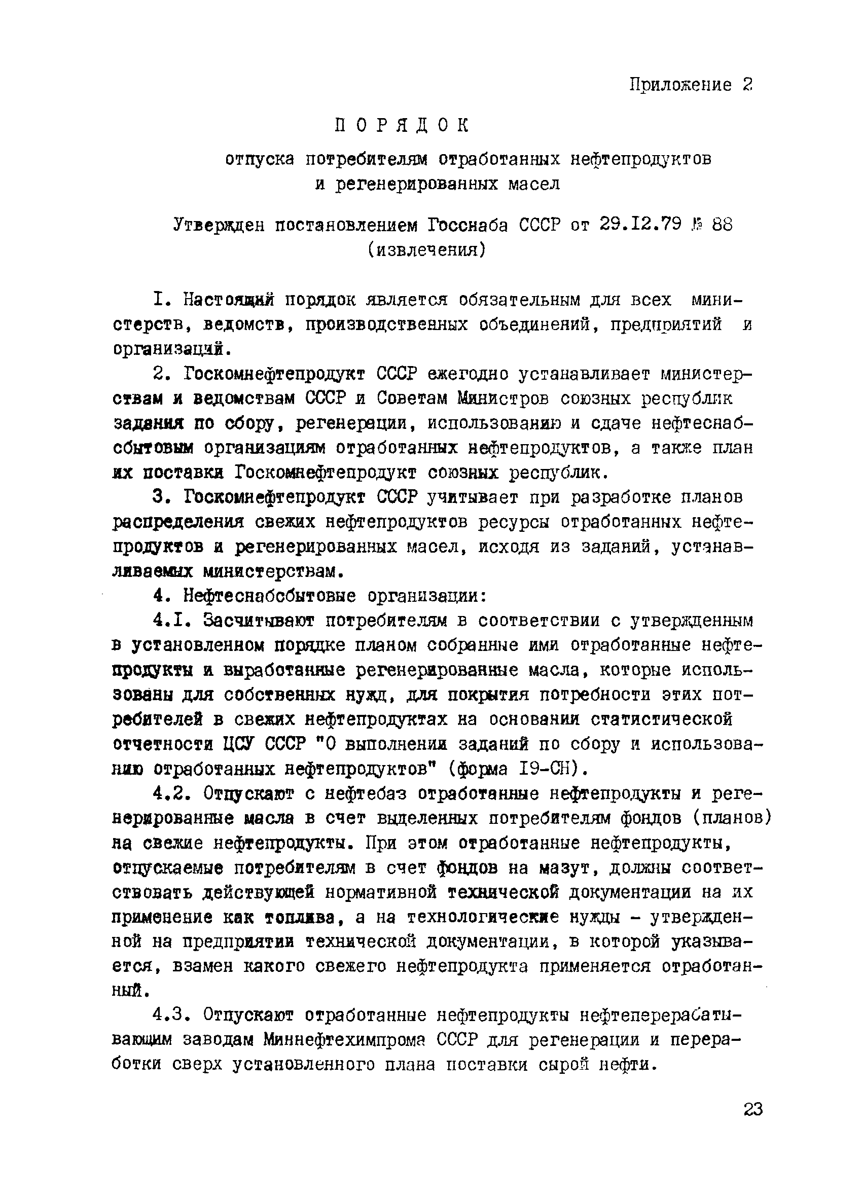 | Оглавление: | 1. Введение 2. Общие положения 3. Классификация отработанных нефтепродуктов 4. Планирование сбора отработанных нефтепродуктов 5. Организация сборе отработанных нефтепродуктов 6. Обязанности и ответственность структурных подразделение отрасли за сбор, хранение и сдачу отработанных нефтепродуктов 7. Сбор отработанных нефтепродуктов 8. Хранение отработанных нефтепродуктов 9. Использование я сдача отработанных нефтепродуктов на нефтебазы 10. Учет я отчетность при сборе и сдаче отработанных нефтепродуктов 11. Премирование персонала предприятий за сбор, использование и сдачу отработанных нефтепродуктов 12. Правила техники безопасности я противопожарной безопасности Приложение 1. Порядок отпуска свежих масел потребителям в зависимости от выполнения ими заданий по сбору и сдаче отработанных масел (извлечения) Приложение 2. Порядок отпуска потребителям отработанных нефтепродуктов и регенерированных масел Приложение 3. Дополнительный прейскурант Приложение 4. Инструкция о порядке составления отчета о выполнении заданий по сбору и использованию отработанных нефтепродуктов по форме 19-СН Приложение 5. Временное положение о порядке и условиях выплаты премий работником предприятий и организаций за сбор, хранение, регенерацию, рациональное использование и транспортировку отработанных масел и других нефтепродуктов Приложение 6. Указания мер безопасности при применении этилированного бензина |