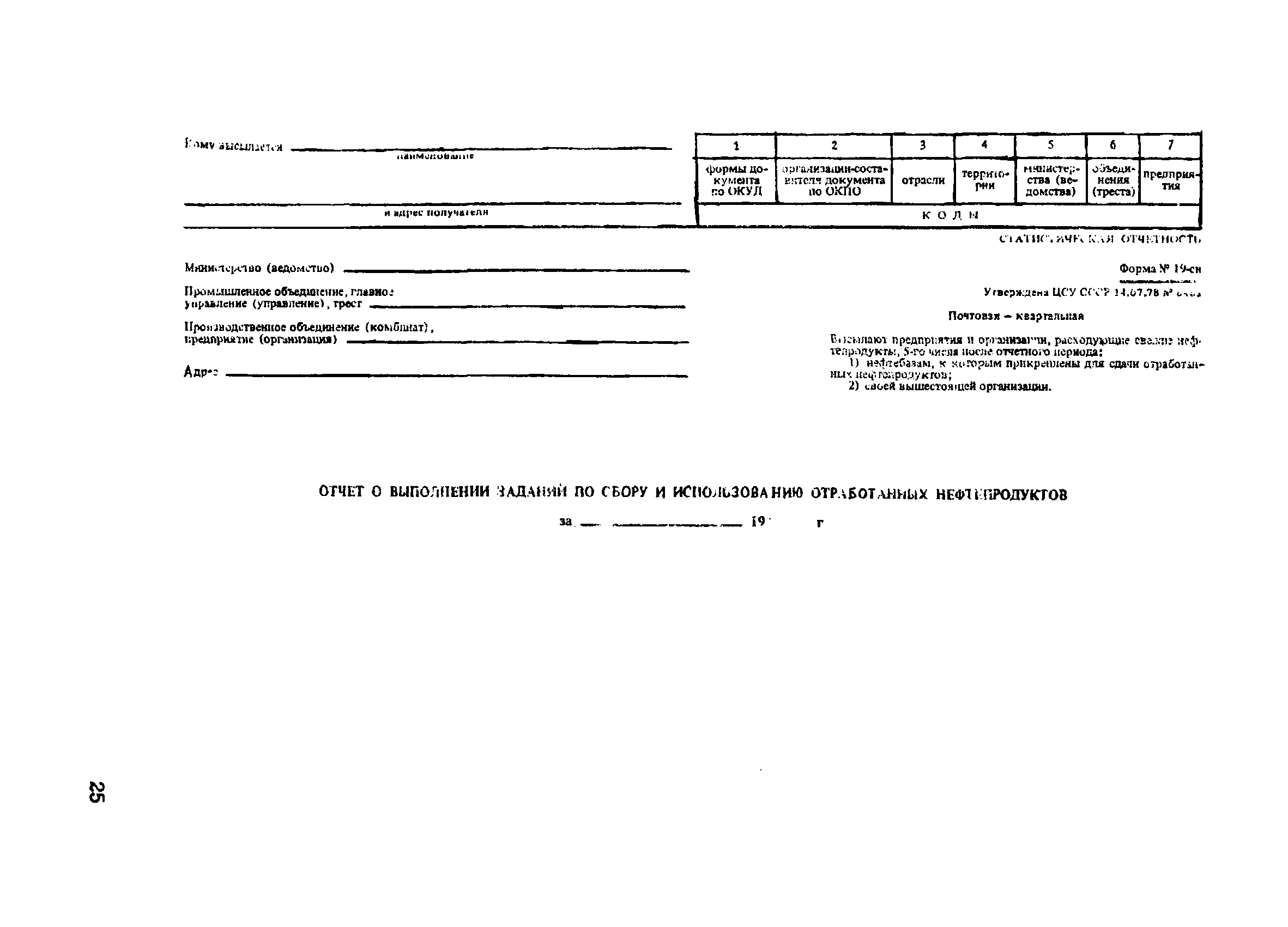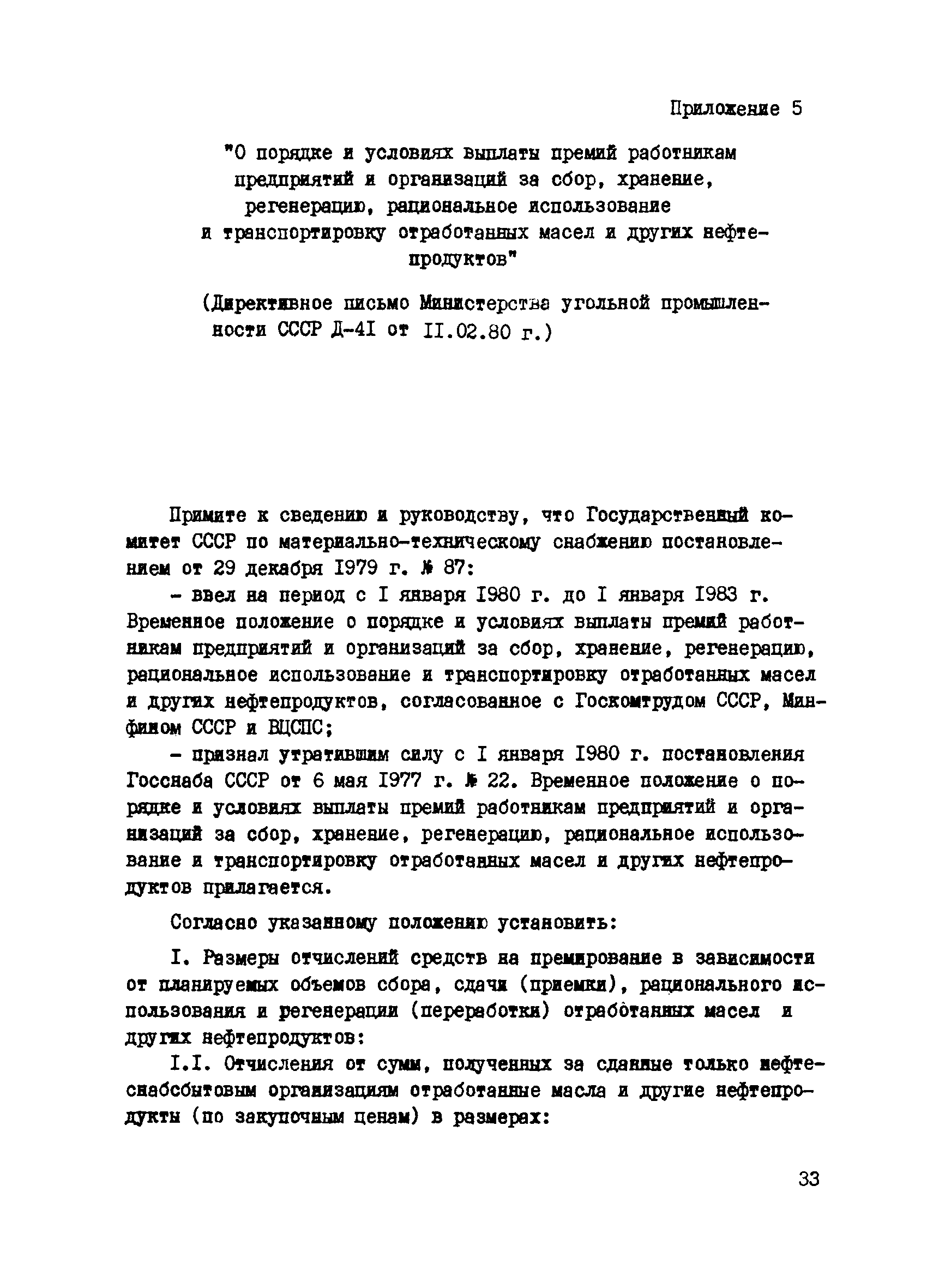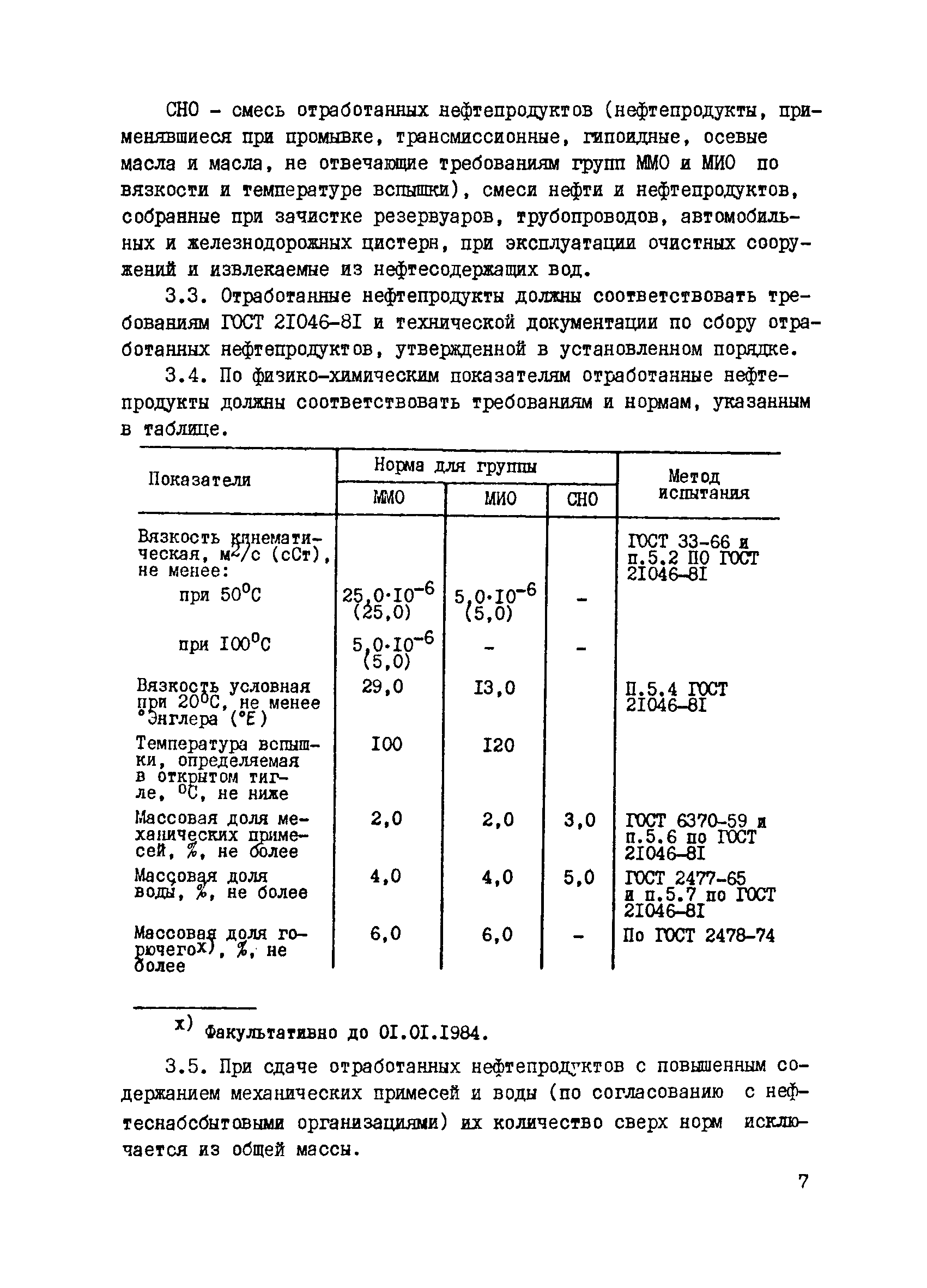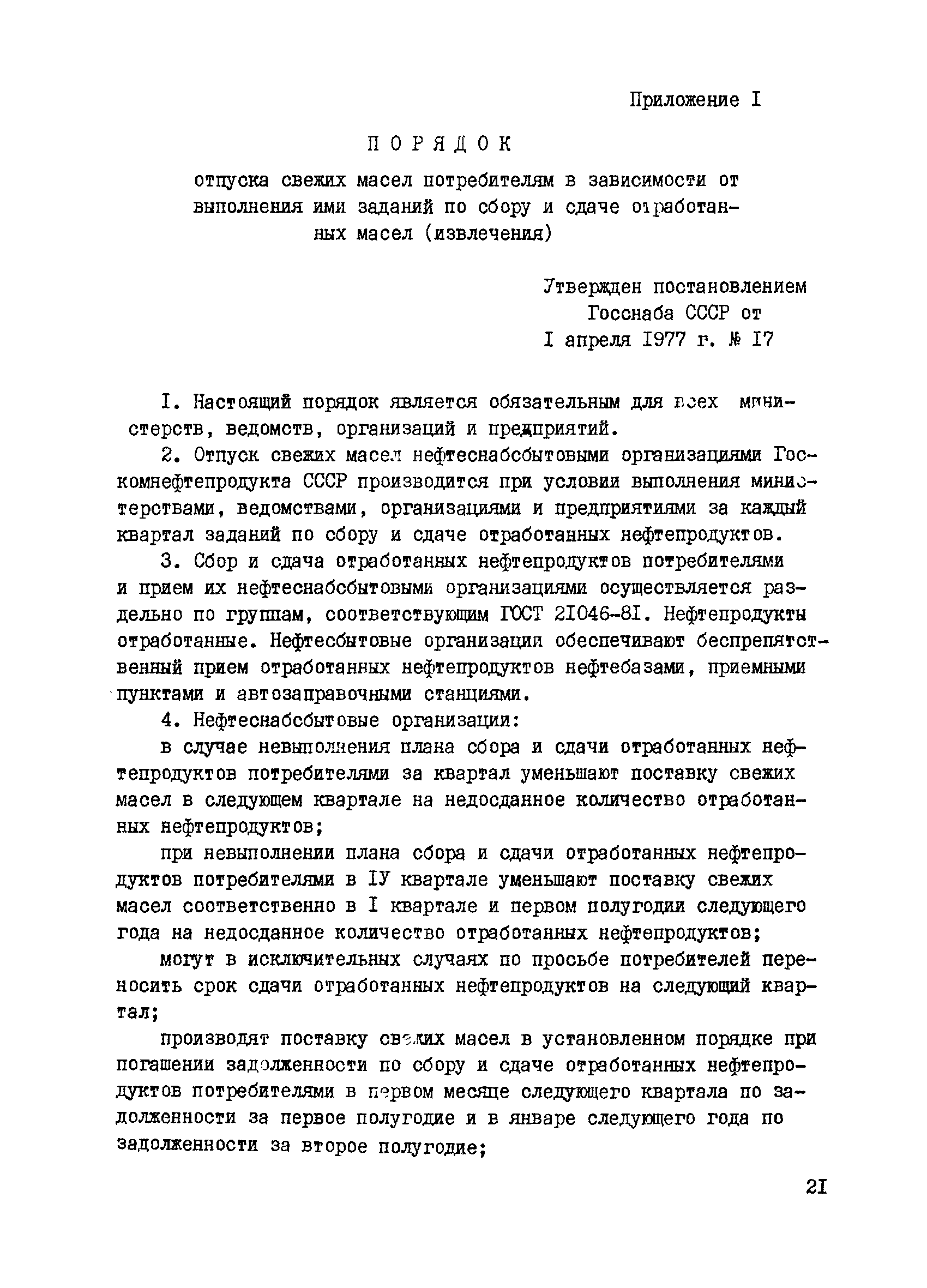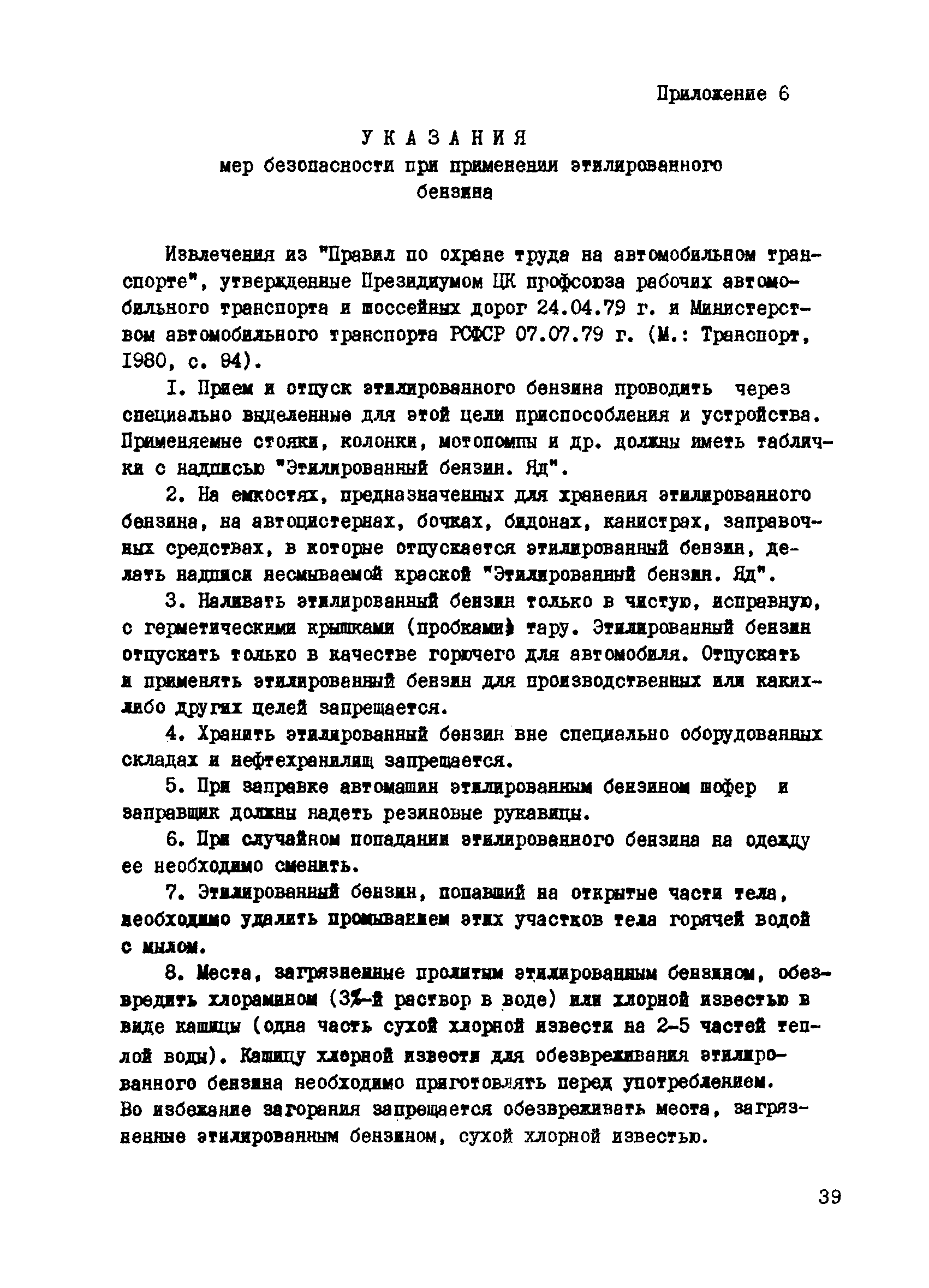 | Оглавление: | 1. Введение 2. Общие положения 3. Классификация отработанных нефтепродуктов 4. Планирование сбора отработанных нефтепродуктов 5. Организация сборе отработанных нефтепродуктов 6. Обязанности и ответственность структурных подразделение отрасли за сбор, хранение и сдачу отработанных нефтепродуктов 7. Сбор отработанных нефтепродуктов 8. Хранение отработанных нефтепродуктов 9. Использование я сдача отработанных нефтепродуктов на нефтебазы 10. Учет я отчетность при сборе и сдаче отработанных нефтепродуктов 11. Премирование персонала предприятий за сбор, использование и сдачу отработанных нефтепродуктов 12. Правила техники безопасности я противопожарной безопасности Приложение 1. Порядок отпуска свежих масел потребителям в зависимости от выполнения ими заданий по сбору и сдаче отработанных масел (извлечения) Приложение 2. Порядок отпуска потребителям отработанных нефтепродуктов и регенерированных масел Приложение 3. Дополнительный прейскурант Приложение 4. Инструкция о порядке составления отчета о выполнении заданий по сбору и использованию отработанных нефтепродуктов по форме 19-СН Приложение 5. Временное положение о порядке и условиях выплаты премий работником предприятий и организаций за сбор, хранение, регенерацию, рациональное использование и транспортировку отработанных масел и других нефтепродуктов Приложение 6. Указания мер безопасности при применении этилированного бензина |