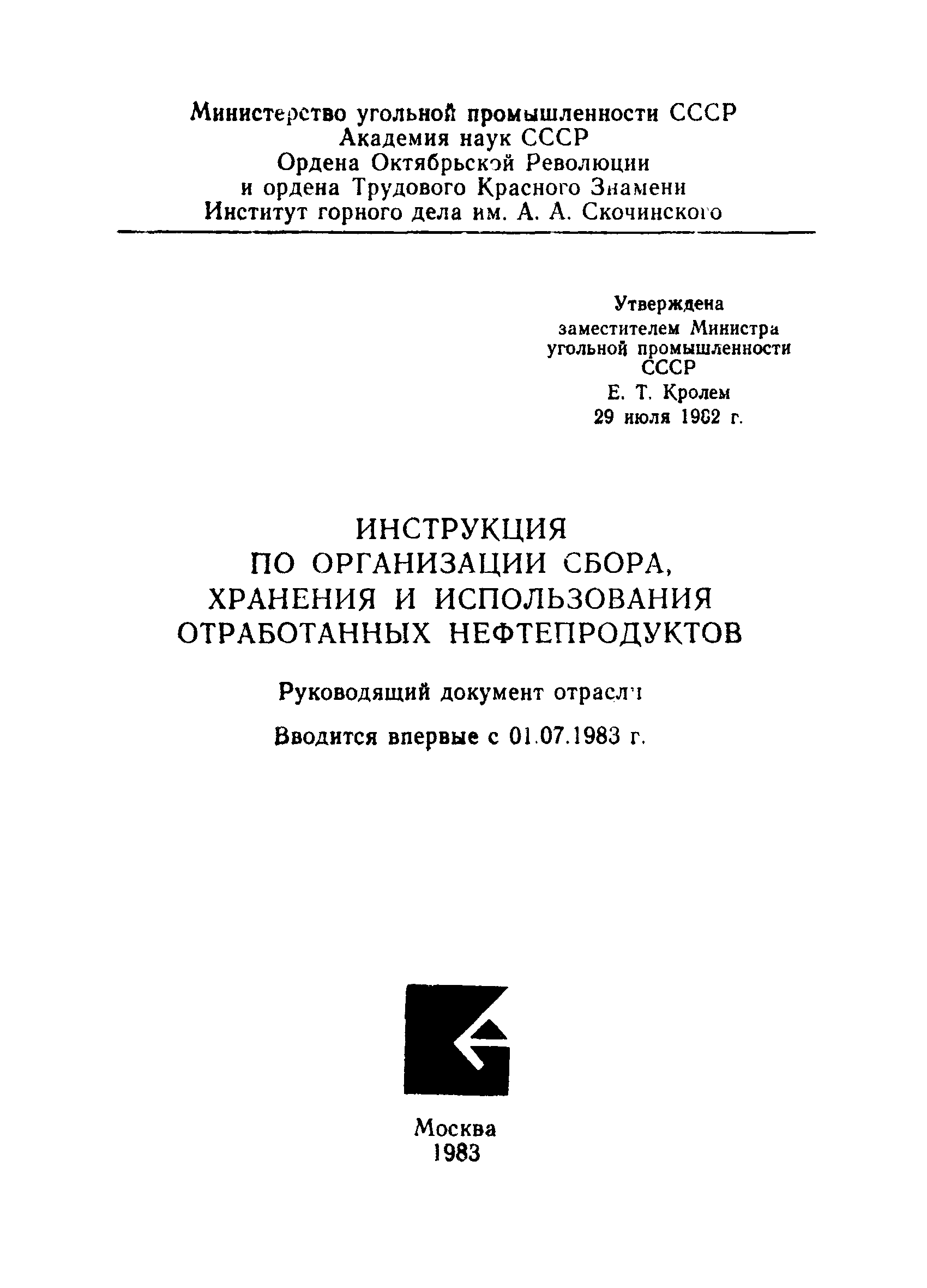 | Утверждён: | 29.07.1982 Министерство угольной промышленности СССР (USSR Ministry of the Coal Industry ) |