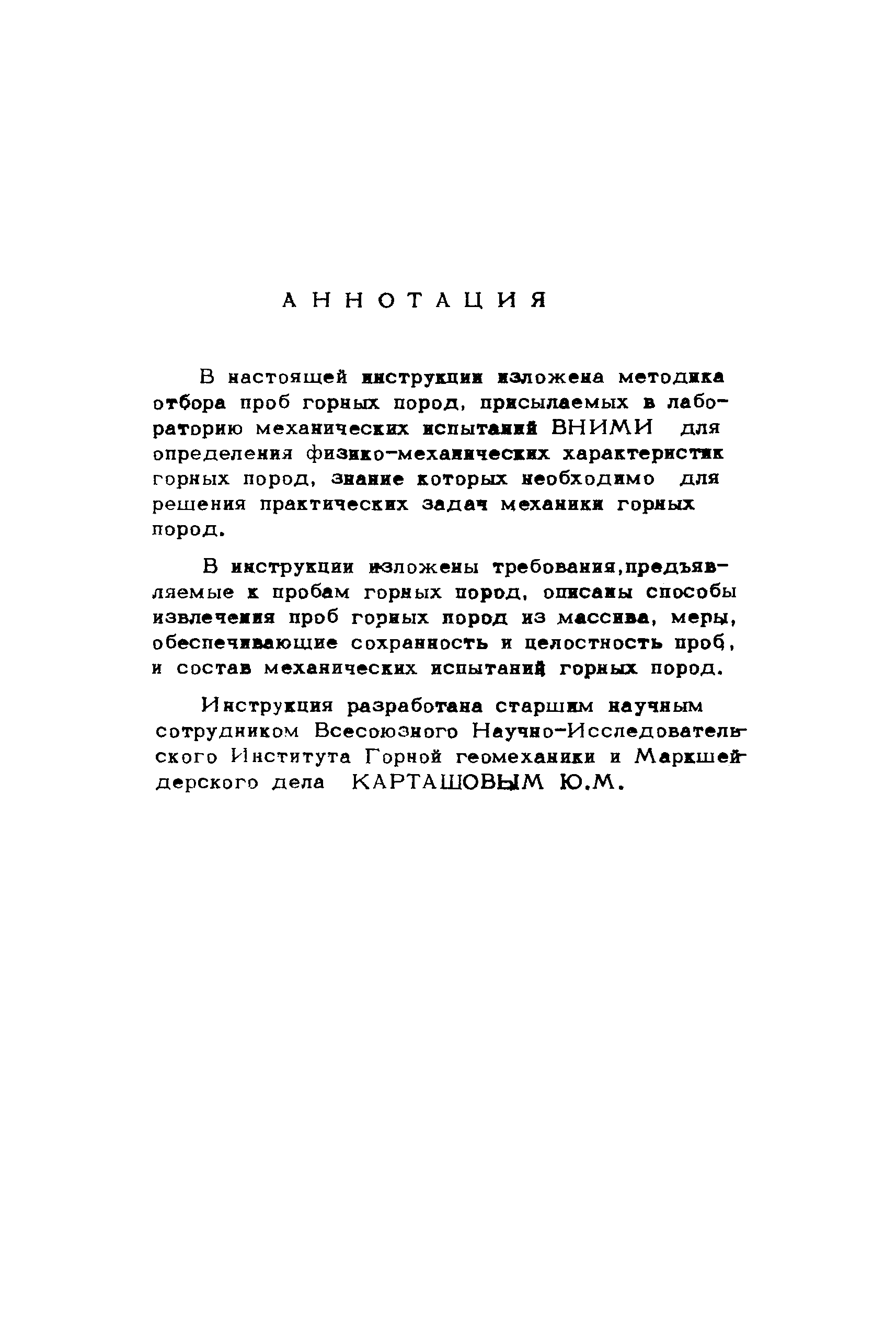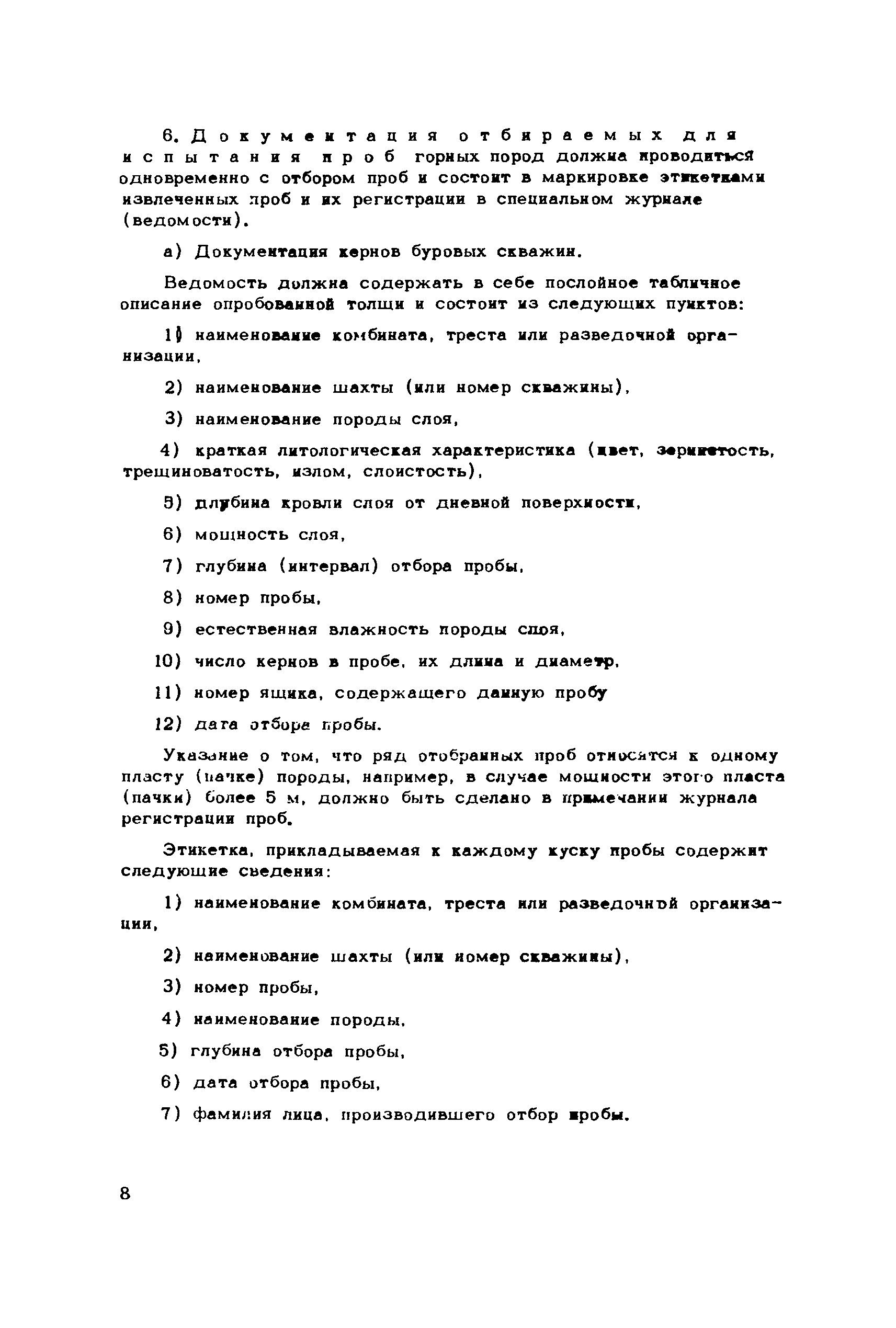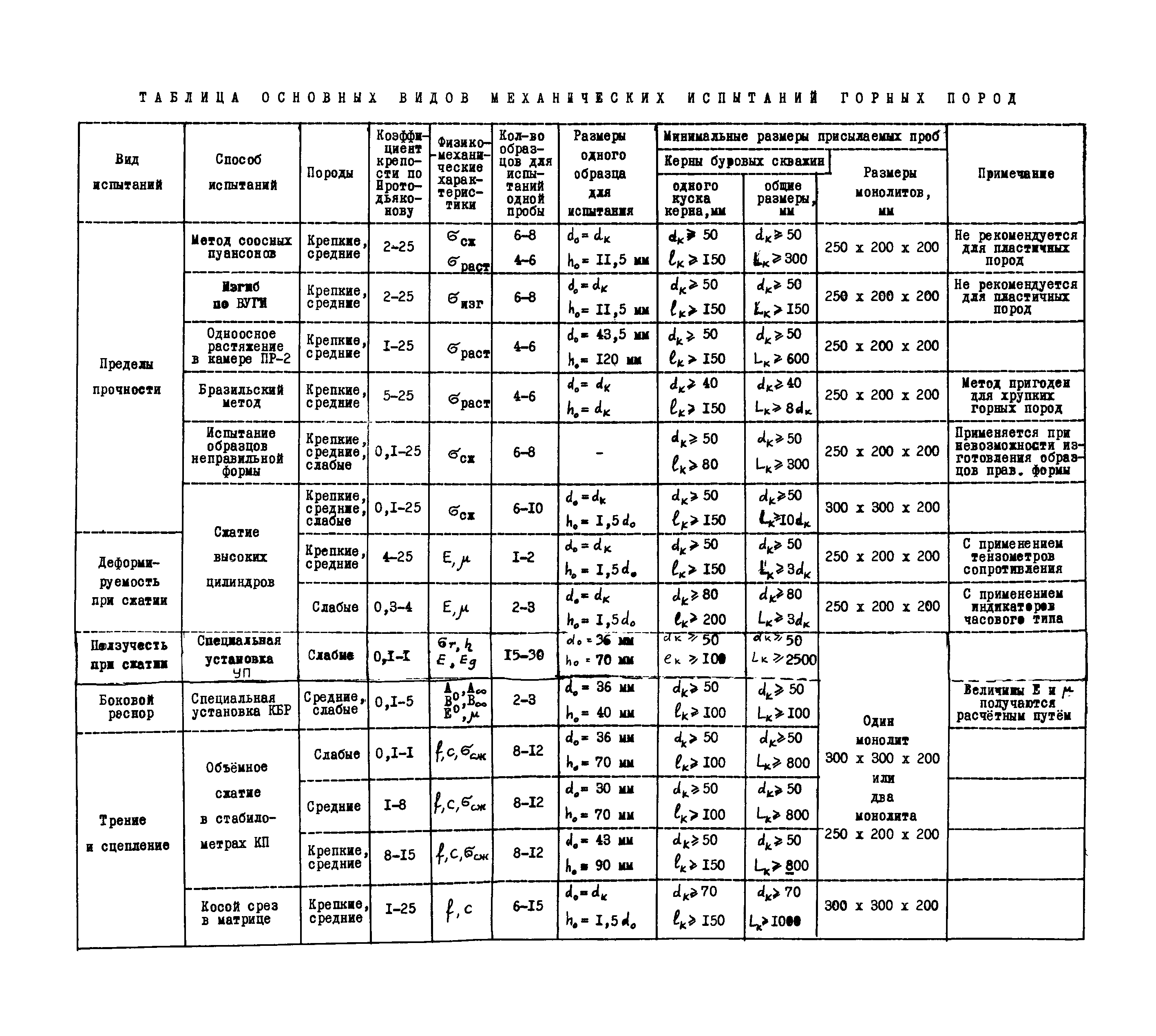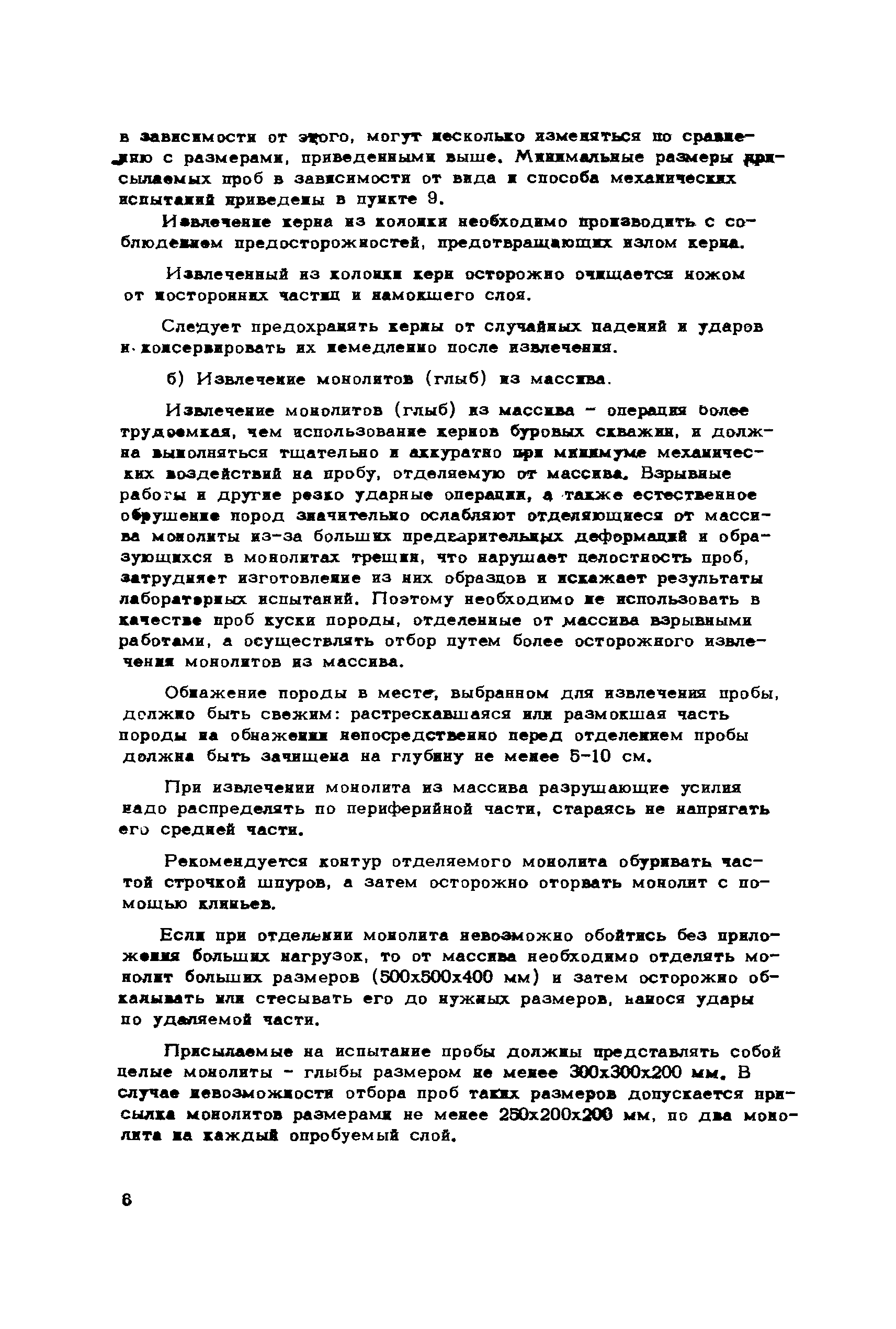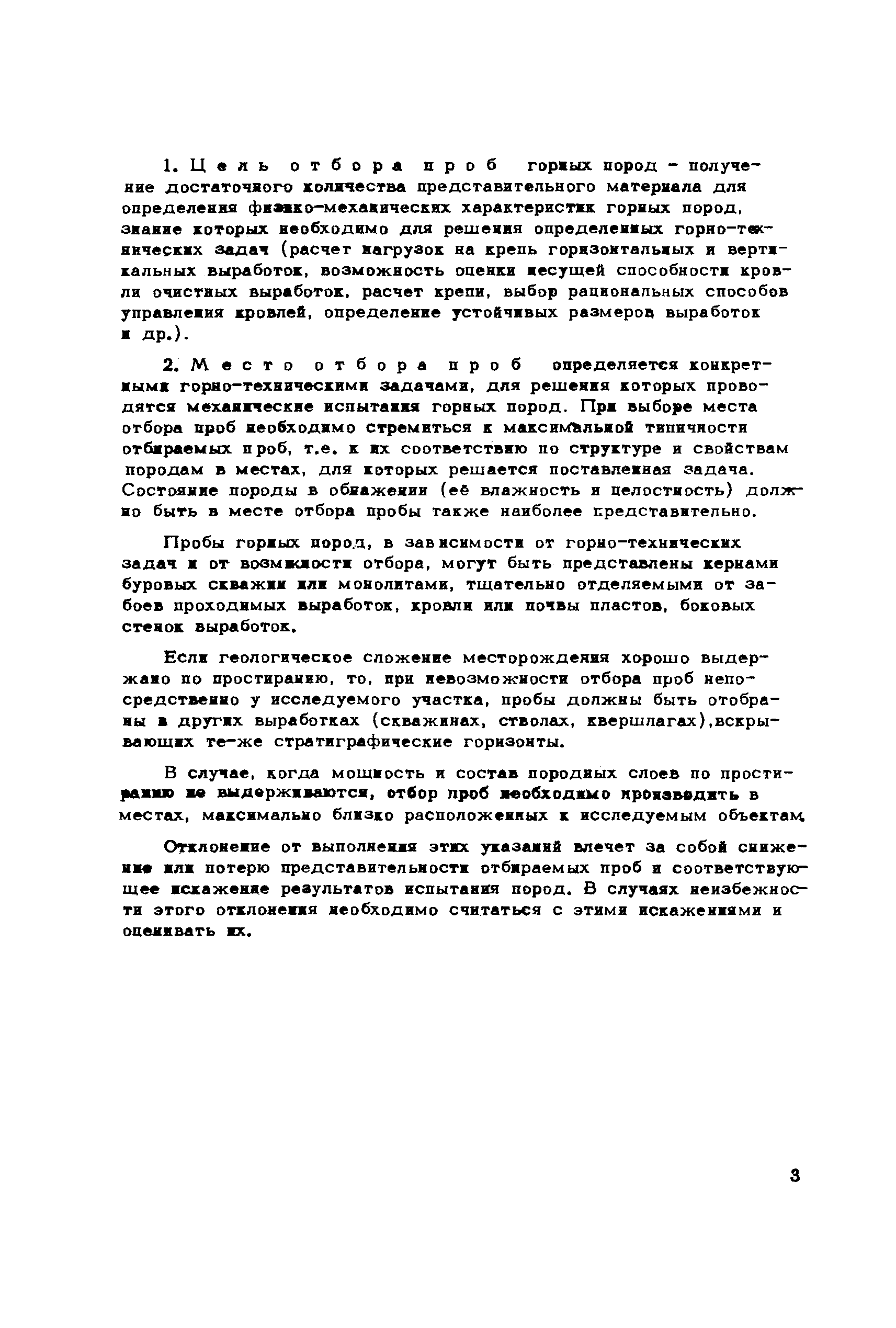 Инструкция по отбору проб горных пород| Статус: | справочные материалы, мп, тпр | | Название рус.: | Инструкция по отбору проб горных пород | | Дата добавления в базу: | 01.02.2020 | | Дата актуализации: | 01.01.2021 | | Область применения: | В инструкции изложена методика отбора проб горных пород, присылаемых в лабораторию механических испытаний ВНИМИ для определения физико-механических характеристик горных пород, знание которых необходимо для решения практических задач механики горных пород. В инструкции изложены требования, предъявляемые к пробам горных пород, описаны способы извлечения проб горных пород из массива, меры, обеспечивающие сохранность и целостность проб, и состав механических испытаний горных пород | | Оглавление: | 1 Цель отбора проб 2 Место отбора проб 3 Требования, предъявляемые к пробам горных пород 4 Извлечение проб из массива 5 Определение естественной влажности горных пород 6 Документация отбираемых для испытания проб горных пород 7 Консервация и упаковка проб горных пород 8 Хранение и транспортировка 9 Состав механических испытаний 10 Технические условия по отбору проб горных пород | | Разработан: | ВНИМИ