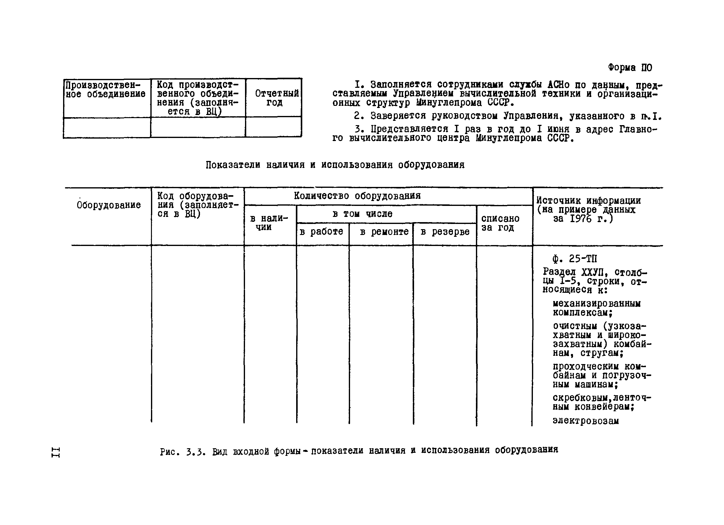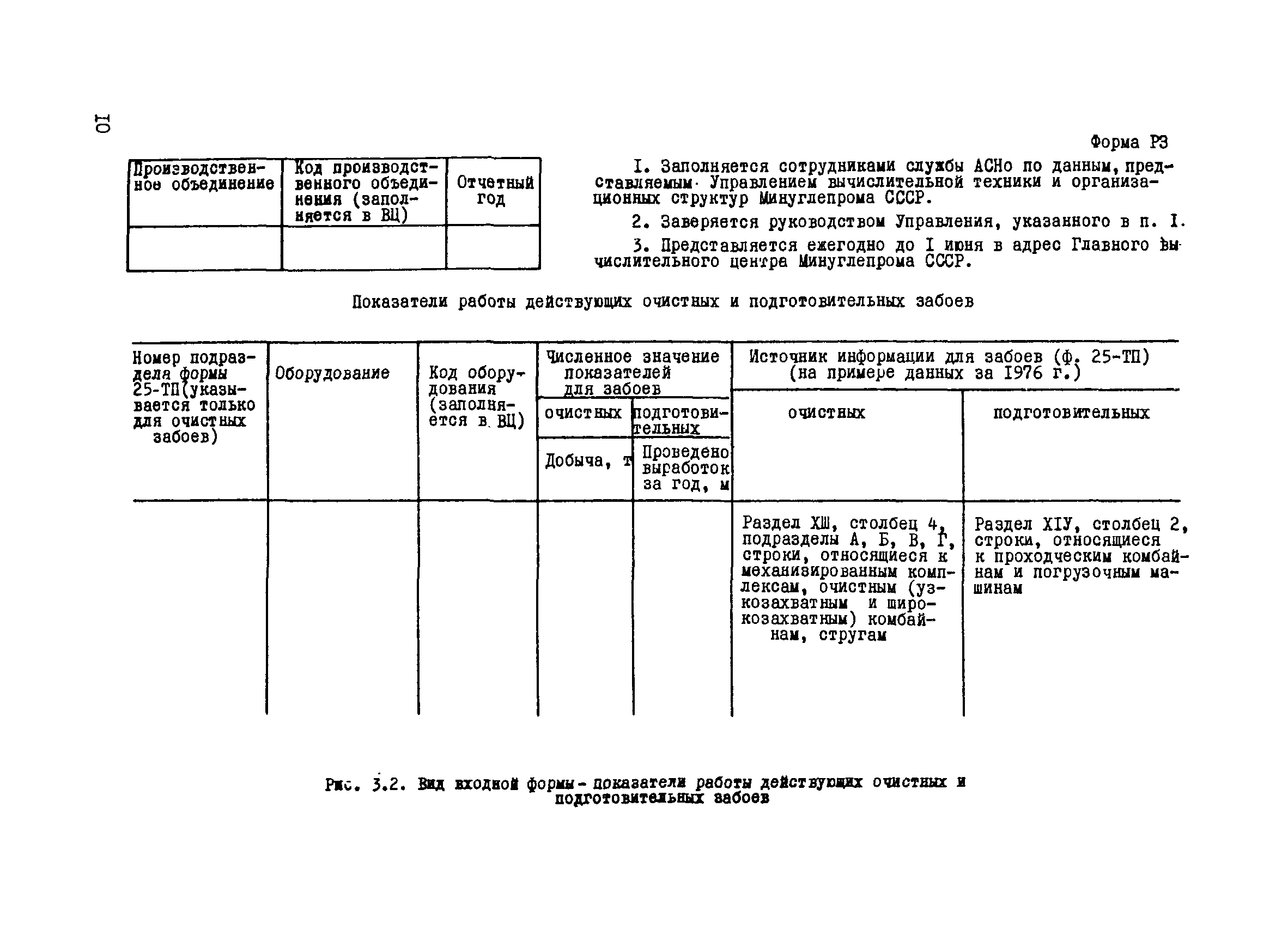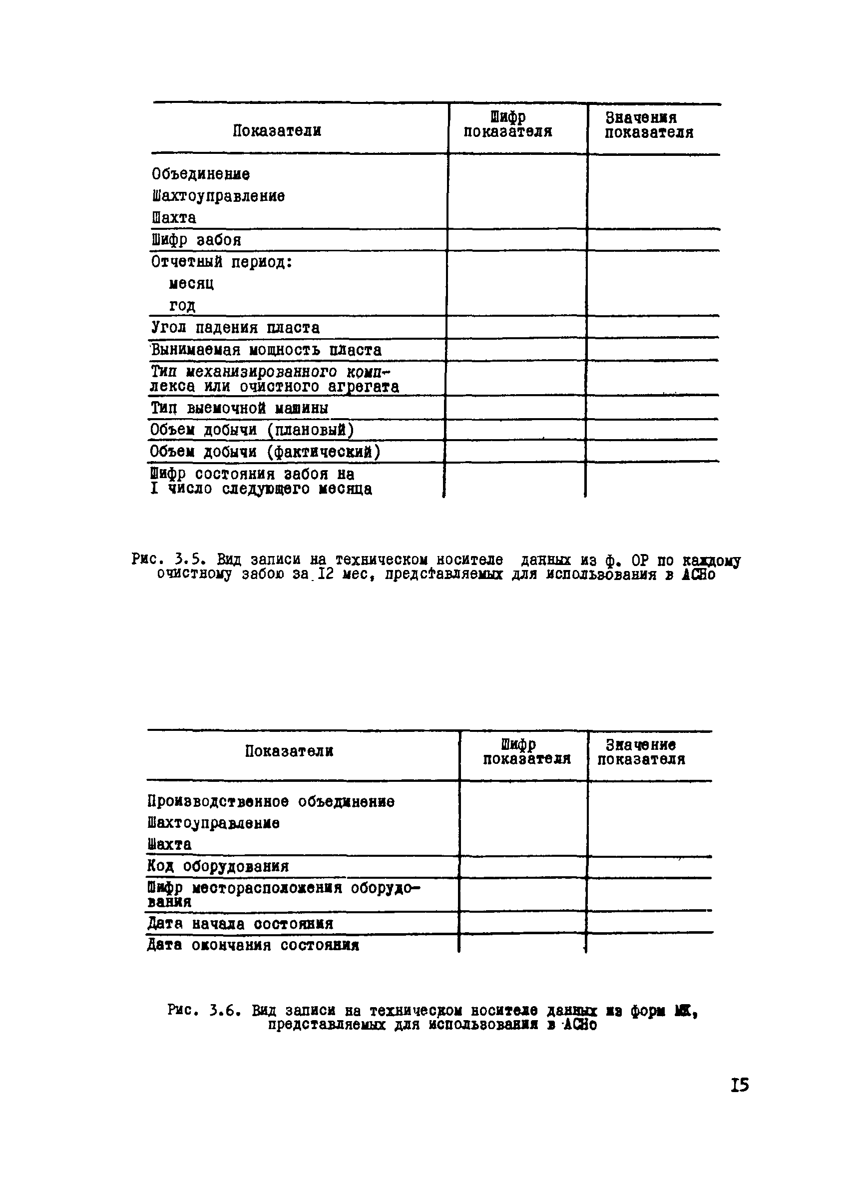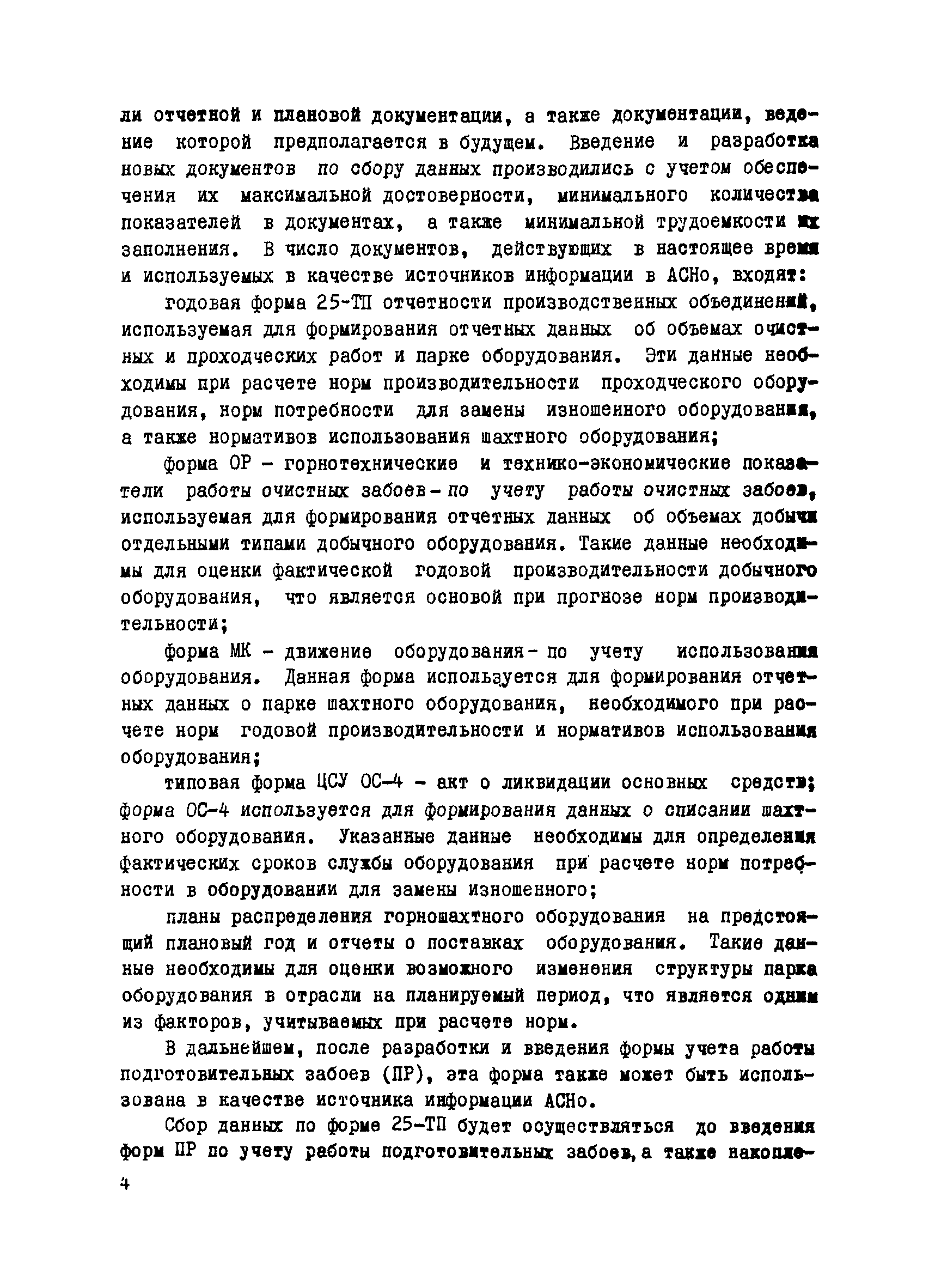 | Оглавление: | 1 Введение 2 Организационная схема подготовки и передачи информации для использования в автоматизированной системе нормативов оборудования (АСНо) 3 Подготовка и передача информации для использования в автоматизированной системе нормативов оборудования 3.1 Подготовка и передача отчетной информации об объемах подземных работ и парке шахтного оборудования на основе форм годовой отчетности производственных объединений 25-ТП 3.2 Подготовка и передача отчетной информации об объемах добычи в очистных забоях на основе форм учета работы очистных забоев ОР - горнотехнические и технико-экономические показатели работы очистных забоев 3.3 Подготовка и передача отчетной информации о парке шахтного оборудования на основе форм МК - движение оборудования 3.4 Подготовка и передача информации о списании шахтного оборудования на основе типовых форм ЦСУ ОС-4 - актов о ликвидации основных средств 3.5 Подготовка и передача отчетной и плановой информации о поставках шахтного оборудования на основе ведения документа ПШО - поставка шахтного оборудования 3.6 Подготовка и передача плановой информации о подземной добыче и проходке на основе ведения форм ПДП - планируемая добыча и проходка |