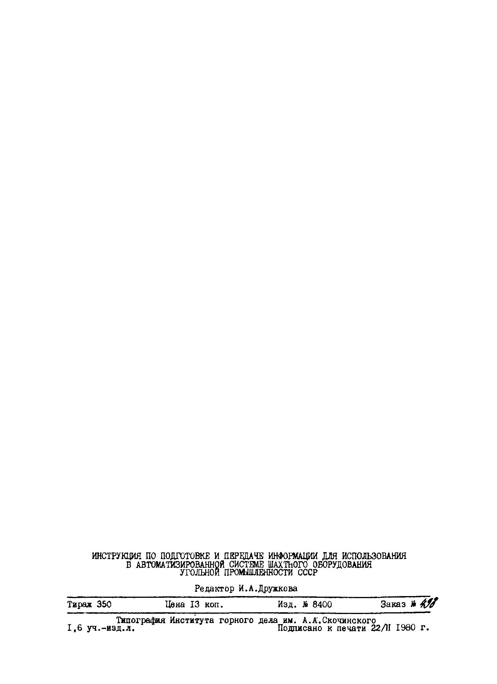 | Название рус.: | Инструкция по подготовке и передаче информации для использования в автоматизированной системе шахтного оборудования угольной промышленности СССР |