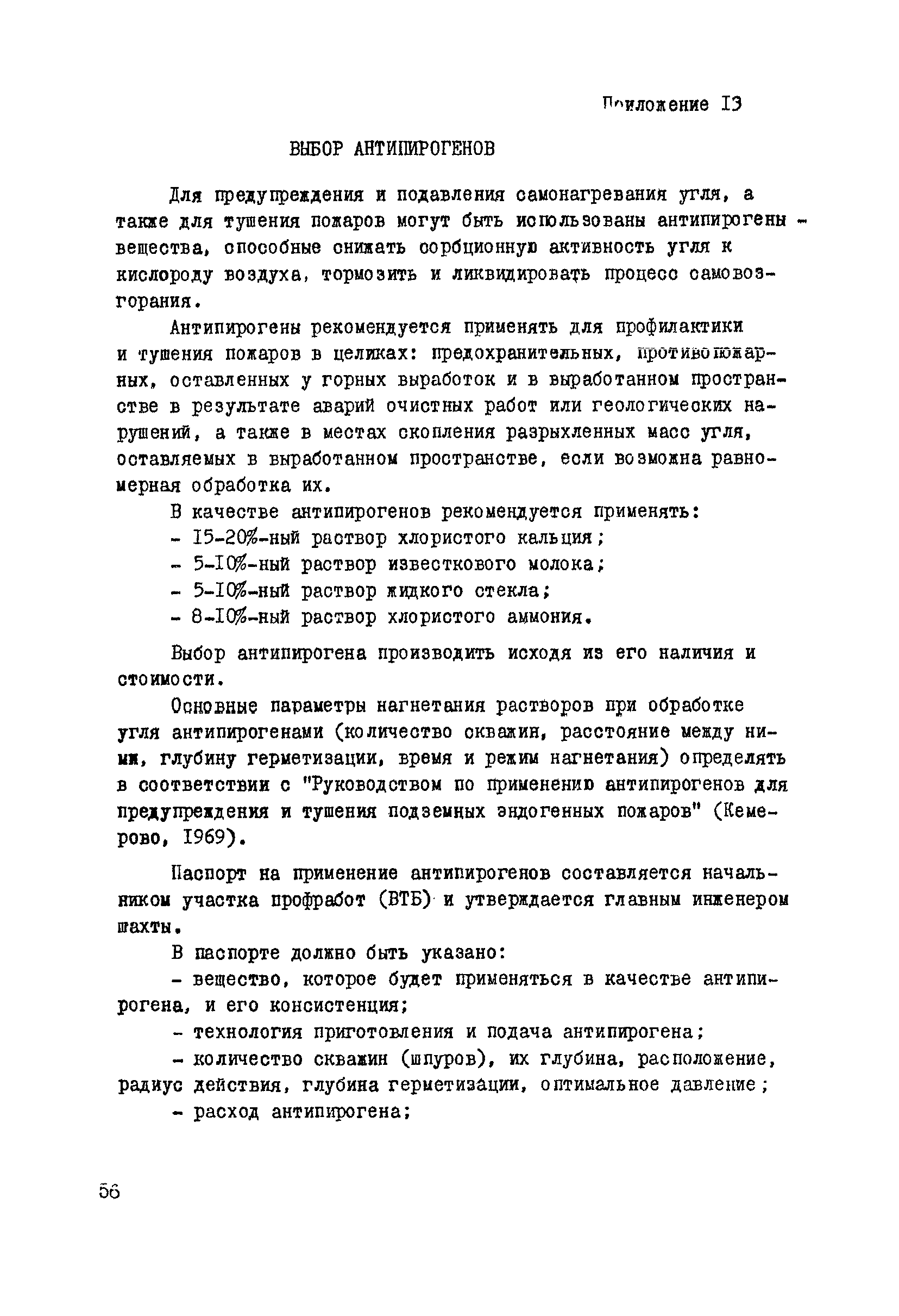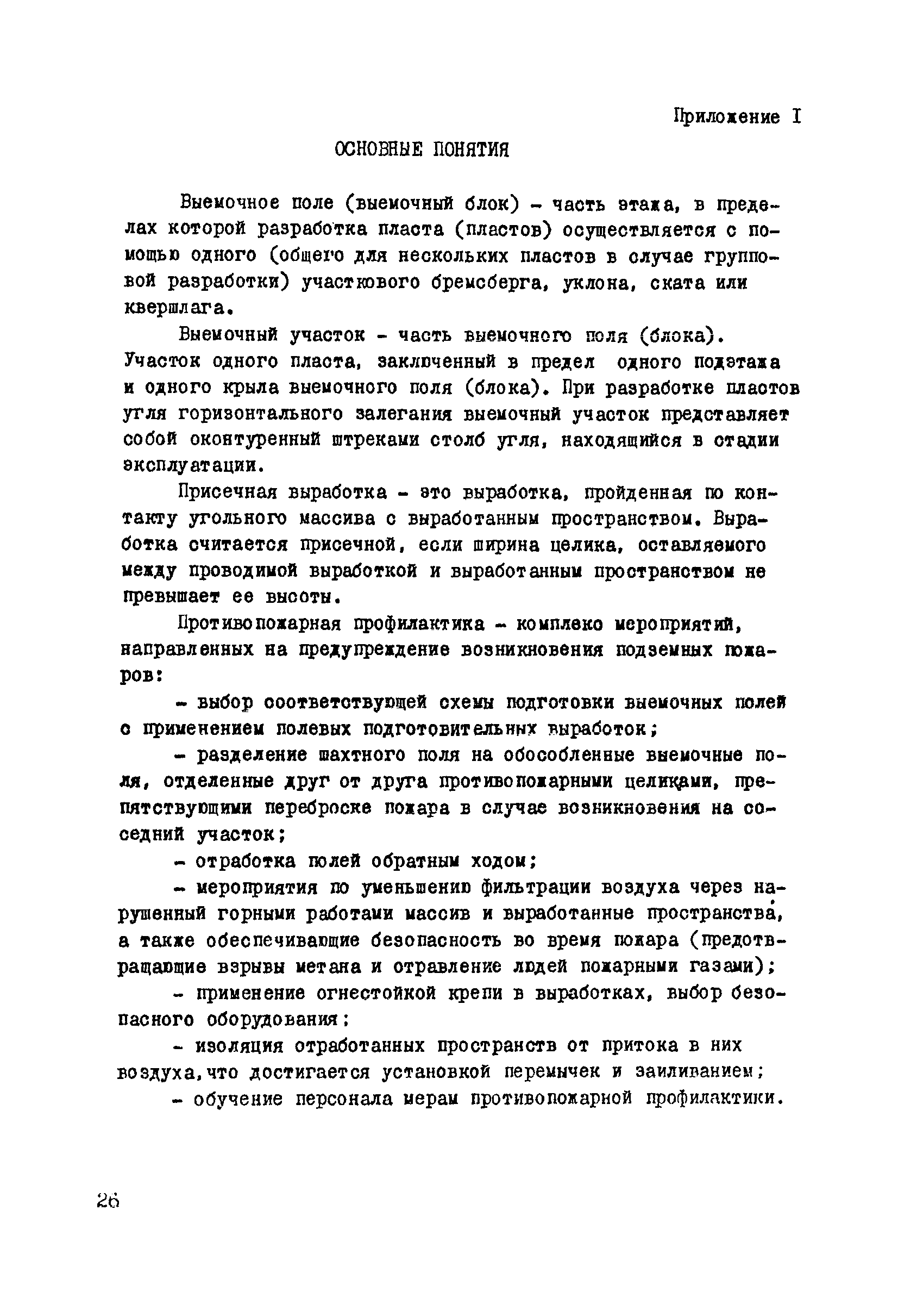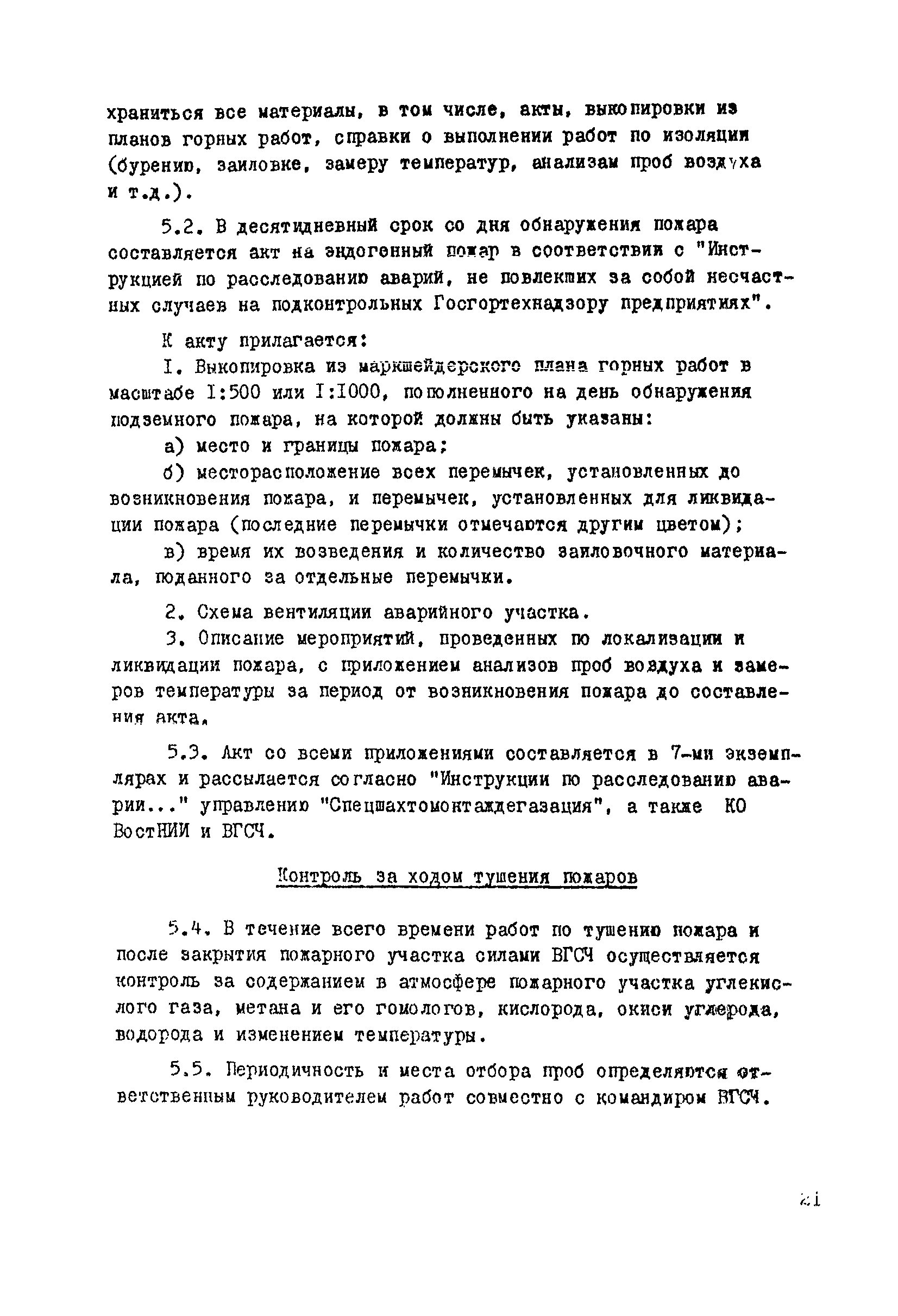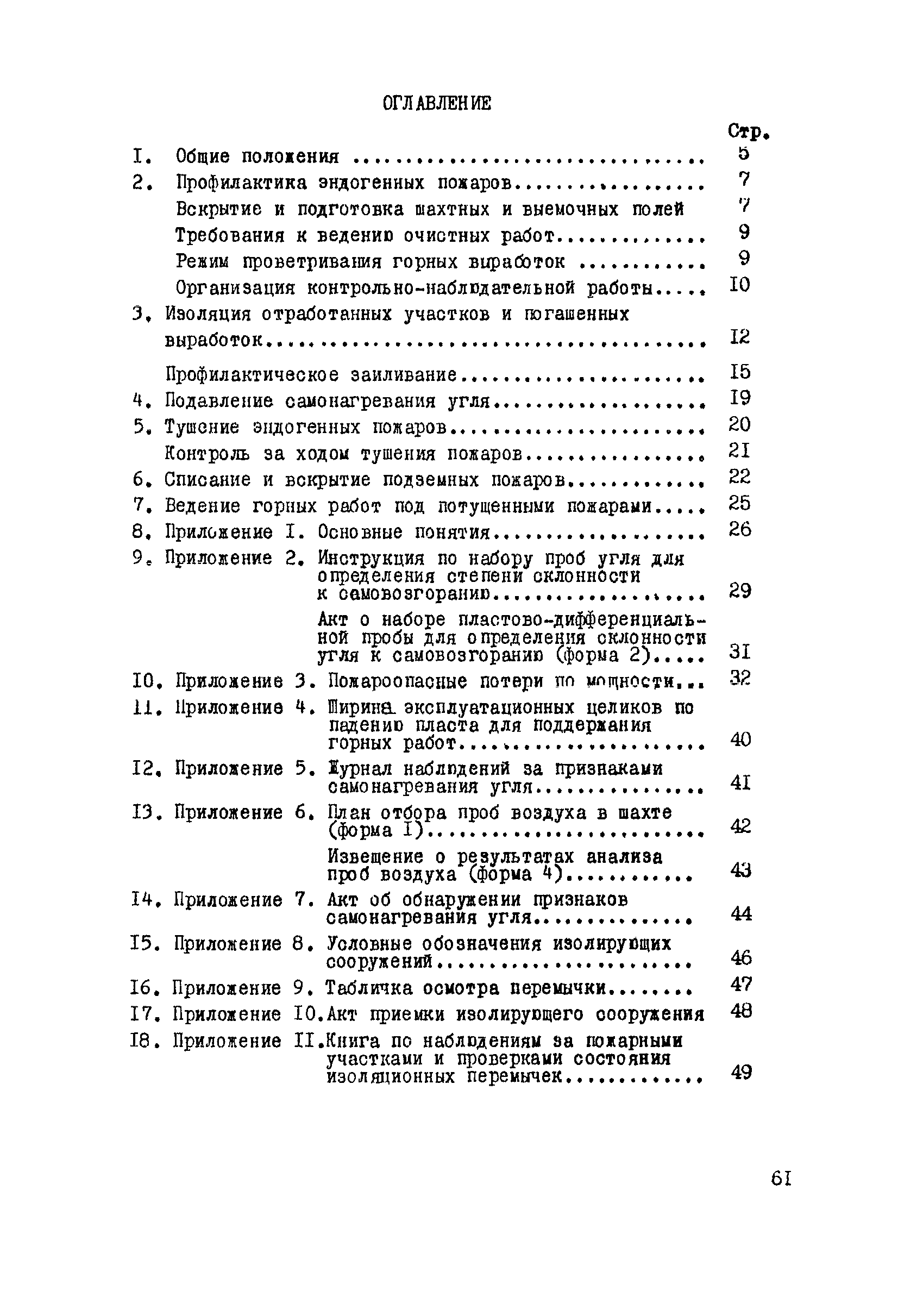 | Оглавление: | 1. Общие положения 2. Профилактика эндогенных пожаров 3. Изоляция отработанных участков и погашенных выработок 4. Подавление самонагревания угля 5. Тушение эндогенных пожаров 6. Списание и вскрытие подземных пожаров 7. Ведение горных работ под потушенными пожарами Приложение 1. Основные понятия Приложение 2. Инструкция по набору проб угля для определения степени склонности к самовозгоранию Приложение 3. Пожароопасные потери по мощности Приложение 4. Ширина эксплуатационных целиков по падению пласта для поддержания горных работ Приложение 5. Журнал наблюдений за признаками самонагревания угля Приложение 6. План отбора проб воздуха в шахте (форма 1) Приложение 7. Акт об обнаружении признаков самонагревания угля Приложение 8. Условные обозначения изолирующих сооружений Приложение 9. Табличка осмотра перемычки Приложение 10. Акт приемки изолирующего сооружения Приложение 11. Книга по наблюдениям за пожарными участками и проверками состояния изоляционных перемычек Приложение 12. Книга учета подачи заиловки Приложение 13. Выбор антипирогенов Приложение 14. Журнал регистрации эндогенных пожаров и их рецидивов Приложение 15. Акт на списание подземного пожара в категории потушенных |