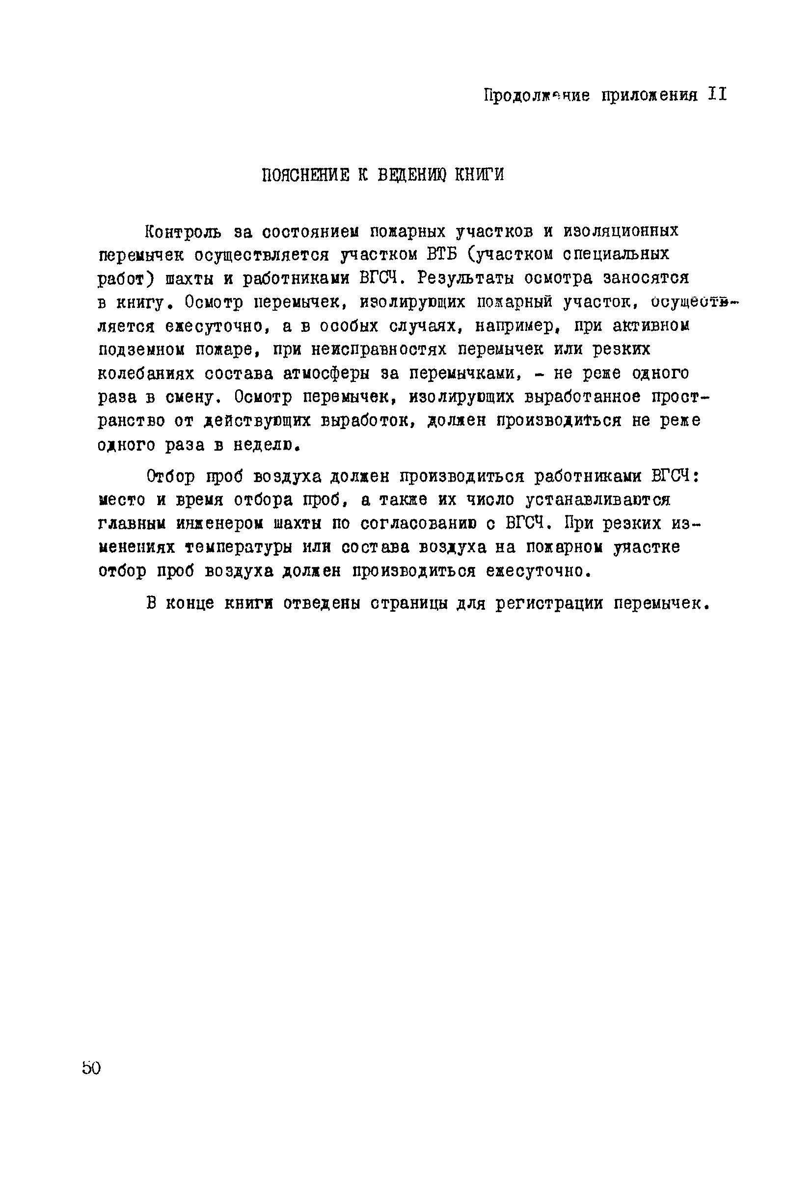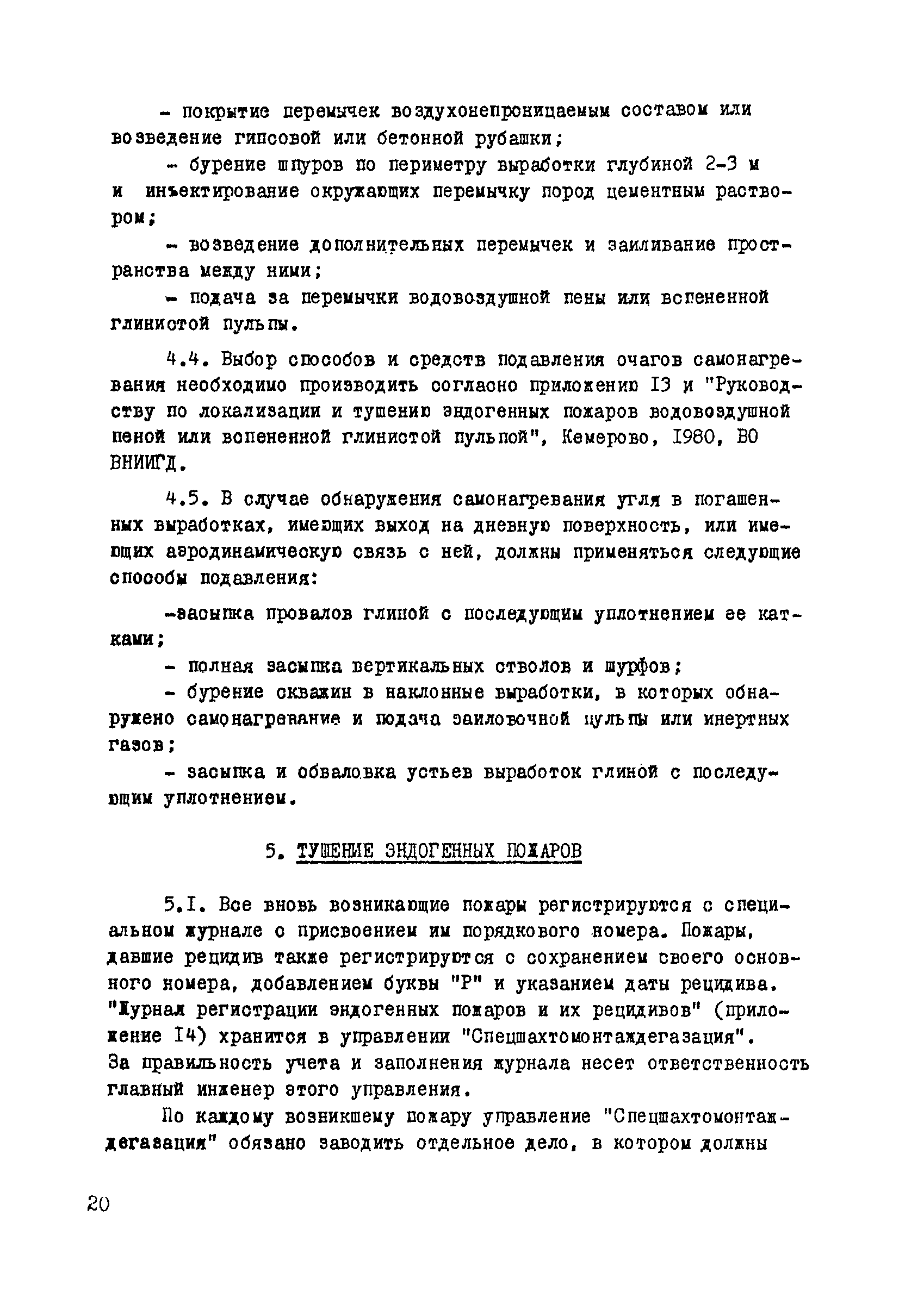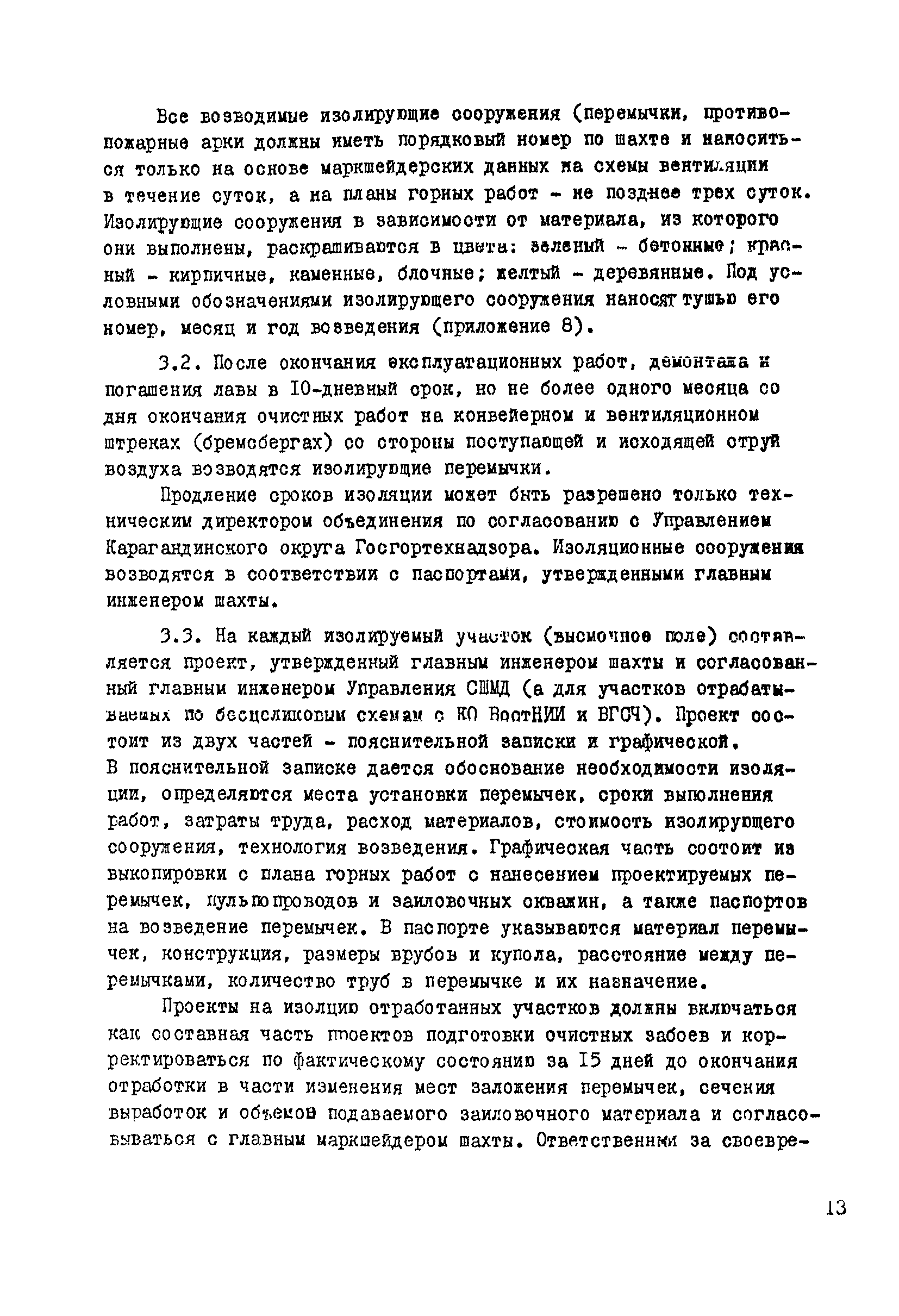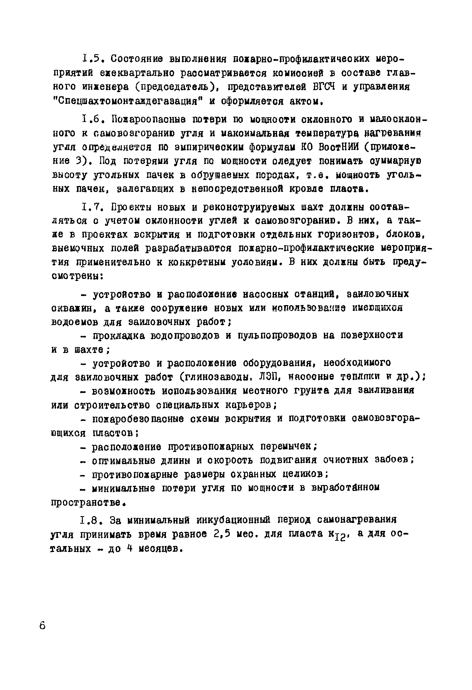 | Оглавление: | 1. Общие положения 2. Профилактика эндогенных пожаров 3. Изоляция отработанных участков и погашенных выработок 4. Подавление самонагревания угля 5. Тушение эндогенных пожаров 6. Списание и вскрытие подземных пожаров 7. Ведение горных работ под потушенными пожарами Приложение 1. Основные понятия Приложение 2. Инструкция по набору проб угля для определения степени склонности к самовозгоранию Приложение 3. Пожароопасные потери по мощности Приложение 4. Ширина эксплуатационных целиков по падению пласта для поддержания горных работ Приложение 5. Журнал наблюдений за признаками самонагревания угля Приложение 6. План отбора проб воздуха в шахте (форма 1) Приложение 7. Акт об обнаружении признаков самонагревания угля Приложение 8. Условные обозначения изолирующих сооружений Приложение 9. Табличка осмотра перемычки Приложение 10. Акт приемки изолирующего сооружения Приложение 11. Книга по наблюдениям за пожарными участками и проверками состояния изоляционных перемычек Приложение 12. Книга учета подачи заиловки Приложение 13. Выбор антипирогенов Приложение 14. Журнал регистрации эндогенных пожаров и их рецидивов Приложение 15. Акт на списание подземного пожара в категории потушенных |