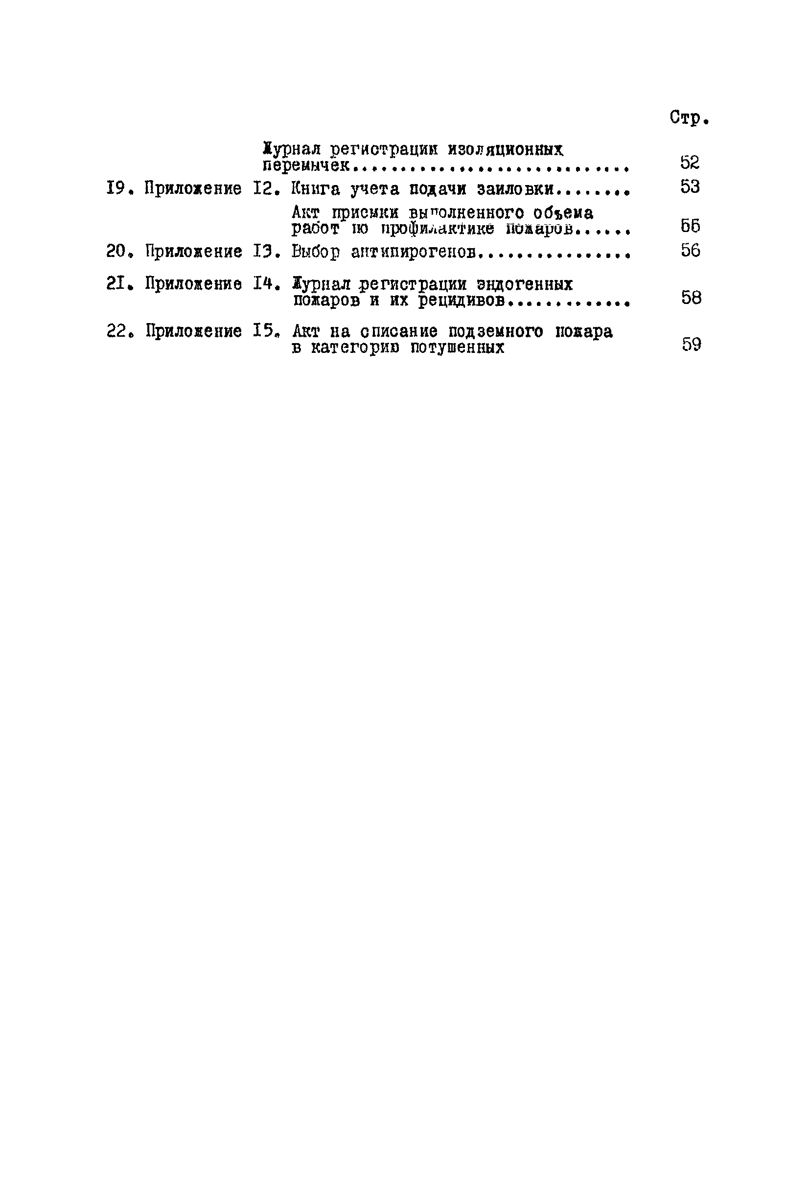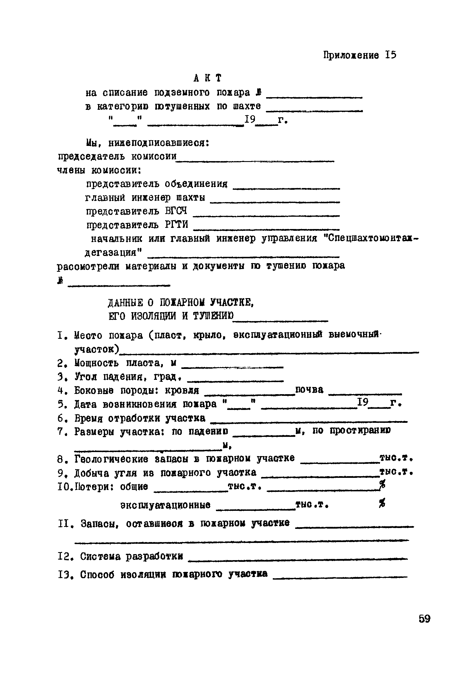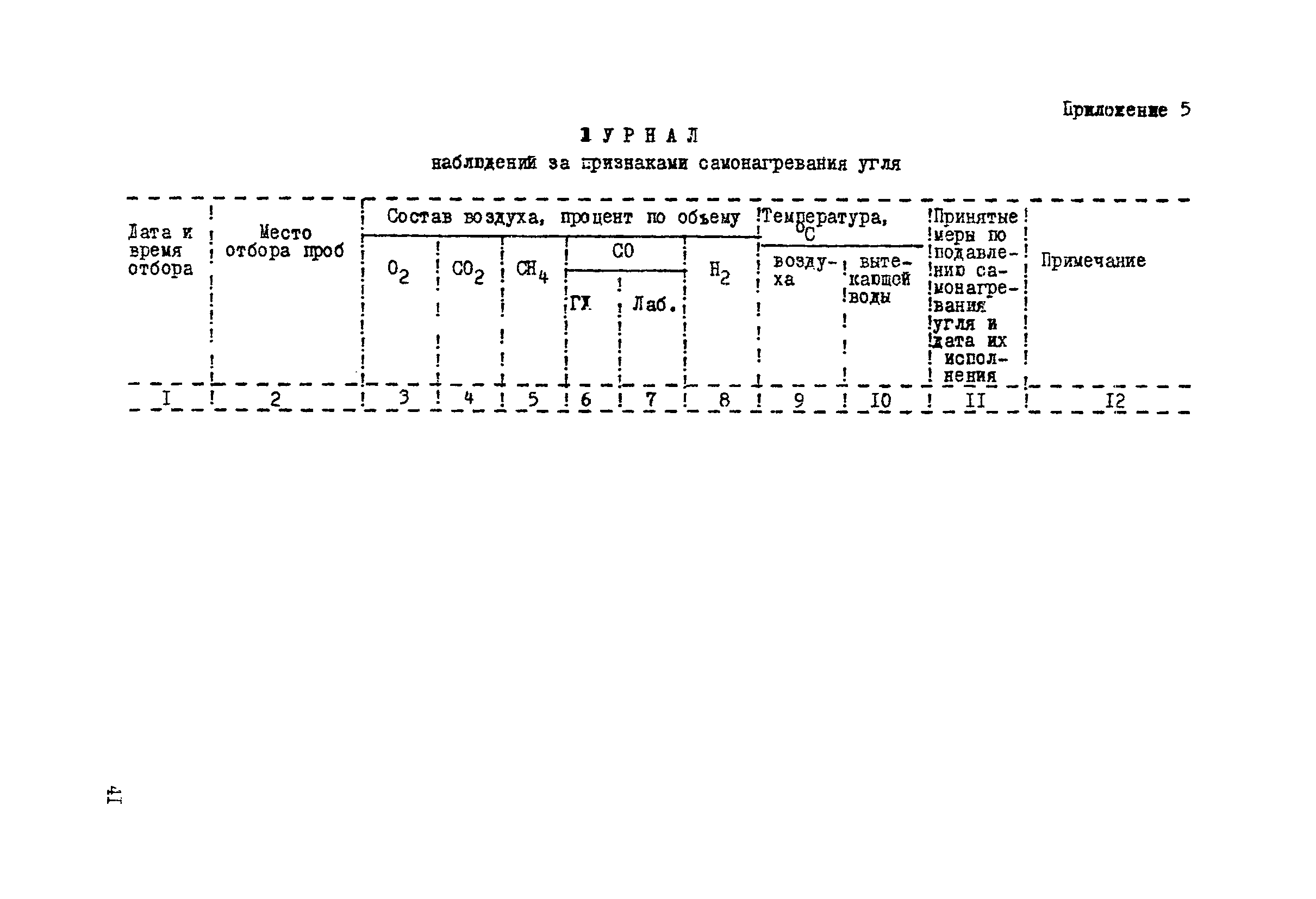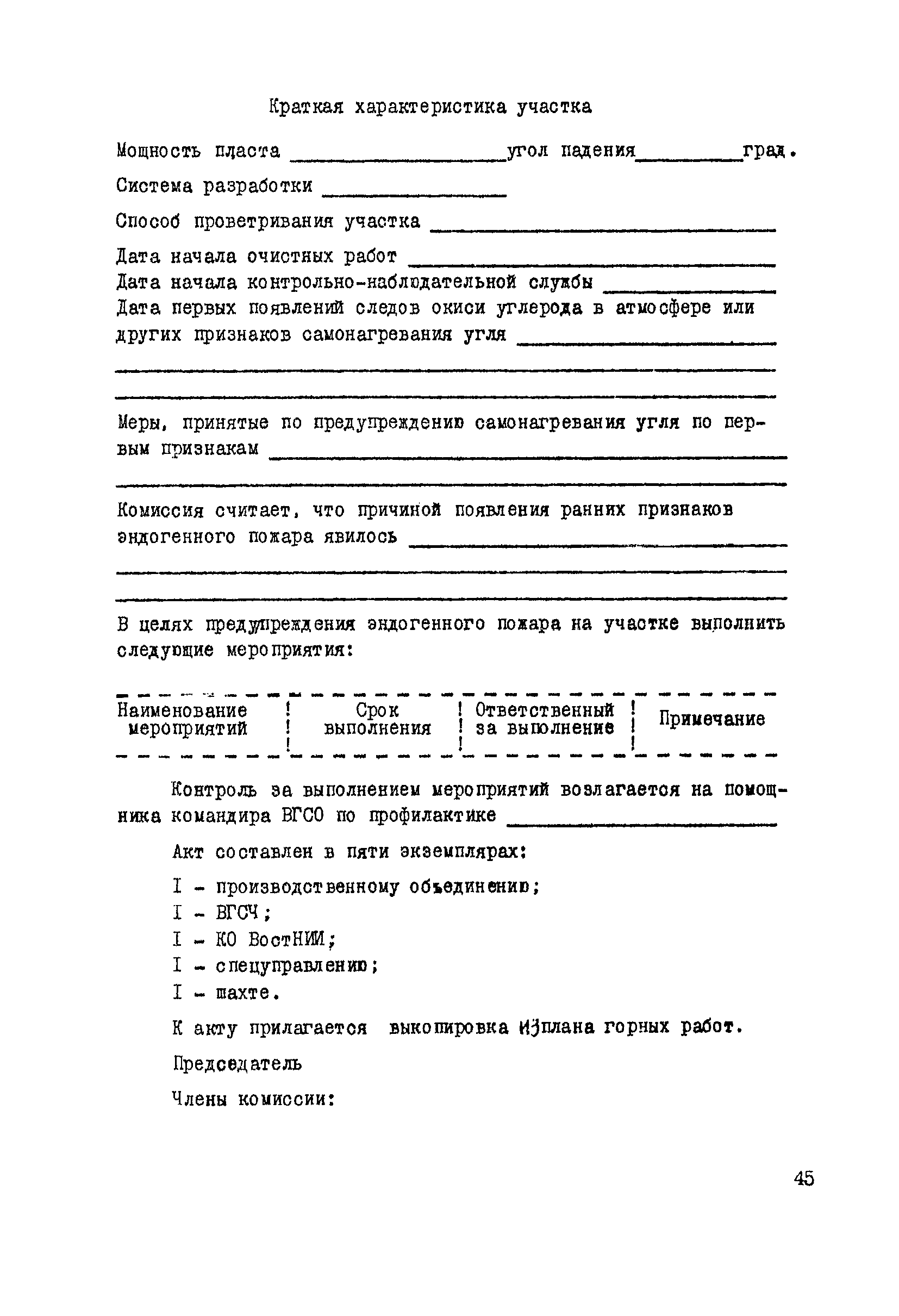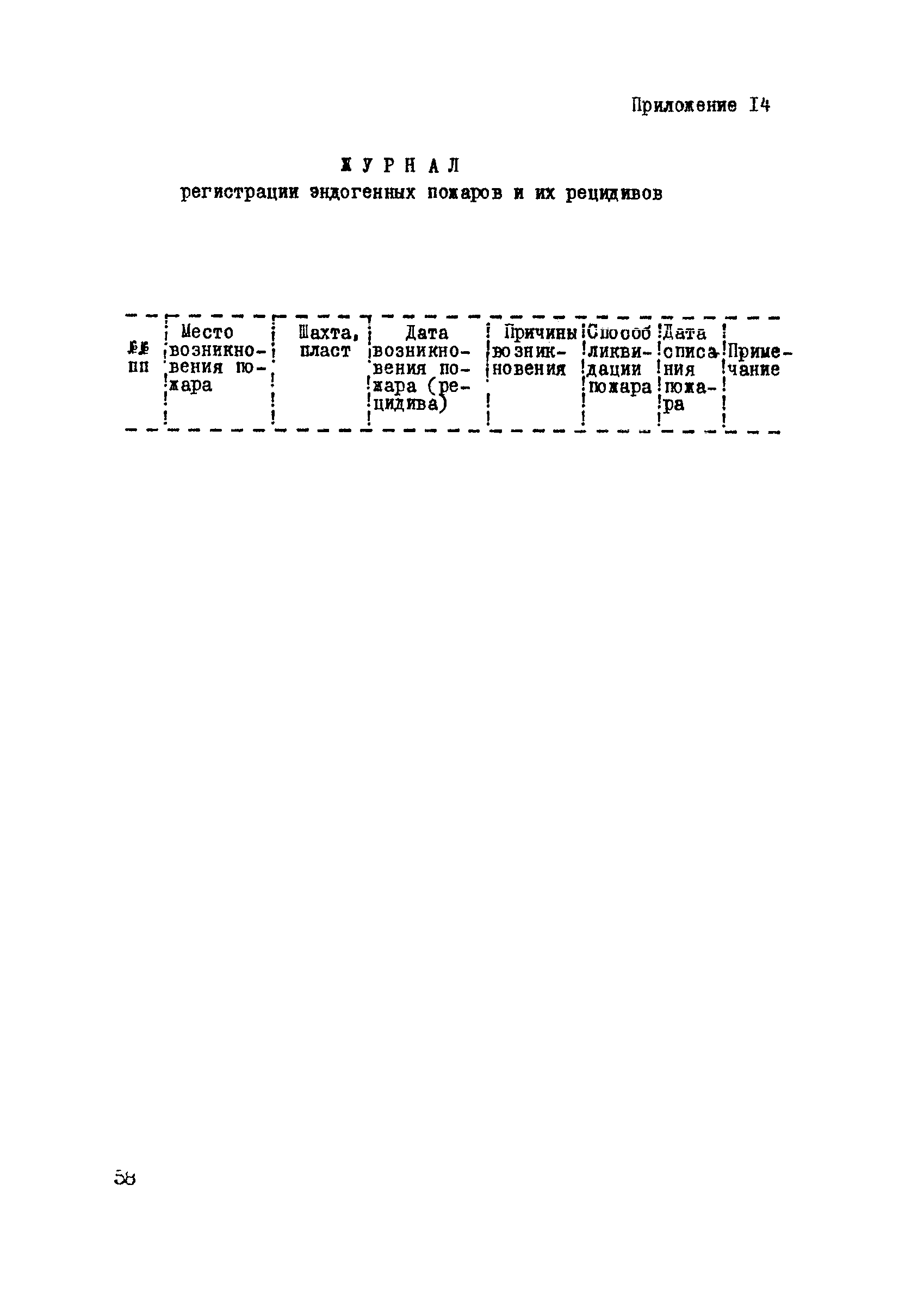 | Оглавление: | 1. Общие положения 2. Профилактика эндогенных пожаров 3. Изоляция отработанных участков и погашенных выработок 4. Подавление самонагревания угля 5. Тушение эндогенных пожаров 6. Списание и вскрытие подземных пожаров 7. Ведение горных работ под потушенными пожарами Приложение 1. Основные понятия Приложение 2. Инструкция по набору проб угля для определения степени склонности к самовозгоранию Приложение 3. Пожароопасные потери по мощности Приложение 4. Ширина эксплуатационных целиков по падению пласта для поддержания горных работ Приложение 5. Журнал наблюдений за признаками самонагревания угля Приложение 6. План отбора проб воздуха в шахте (форма 1) Приложение 7. Акт об обнаружении признаков самонагревания угля Приложение 8. Условные обозначения изолирующих сооружений Приложение 9. Табличка осмотра перемычки Приложение 10. Акт приемки изолирующего сооружения Приложение 11. Книга по наблюдениям за пожарными участками и проверками состояния изоляционных перемычек Приложение 12. Книга учета подачи заиловки Приложение 13. Выбор антипирогенов Приложение 14. Журнал регистрации эндогенных пожаров и их рецидивов Приложение 15. Акт на списание подземного пожара в категории потушенных |