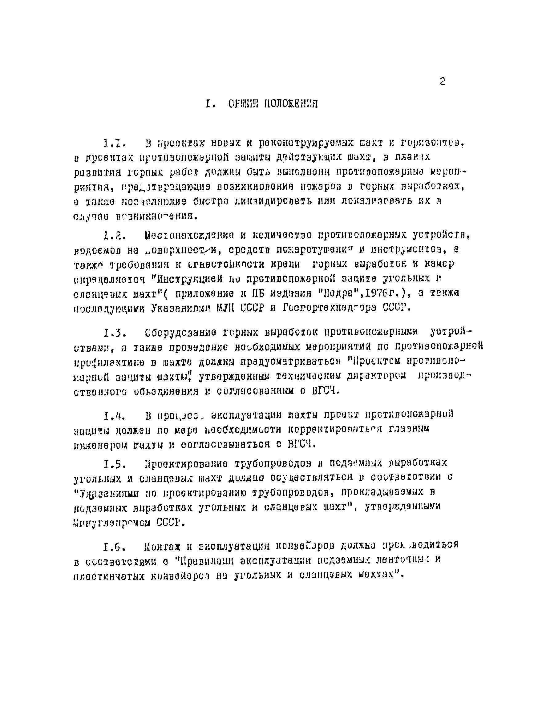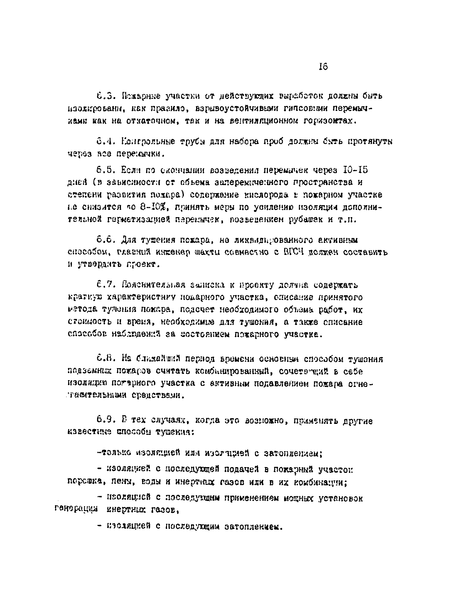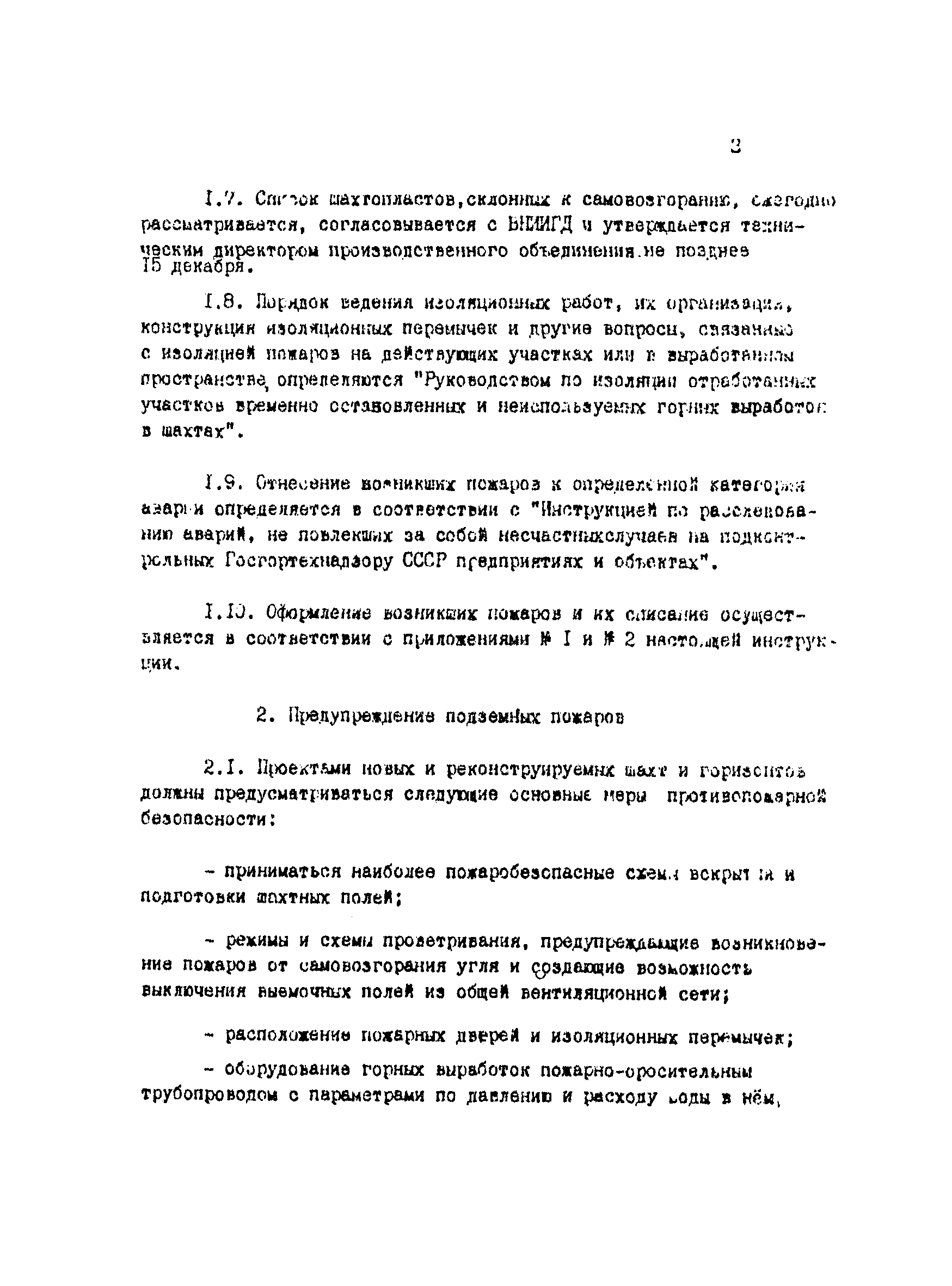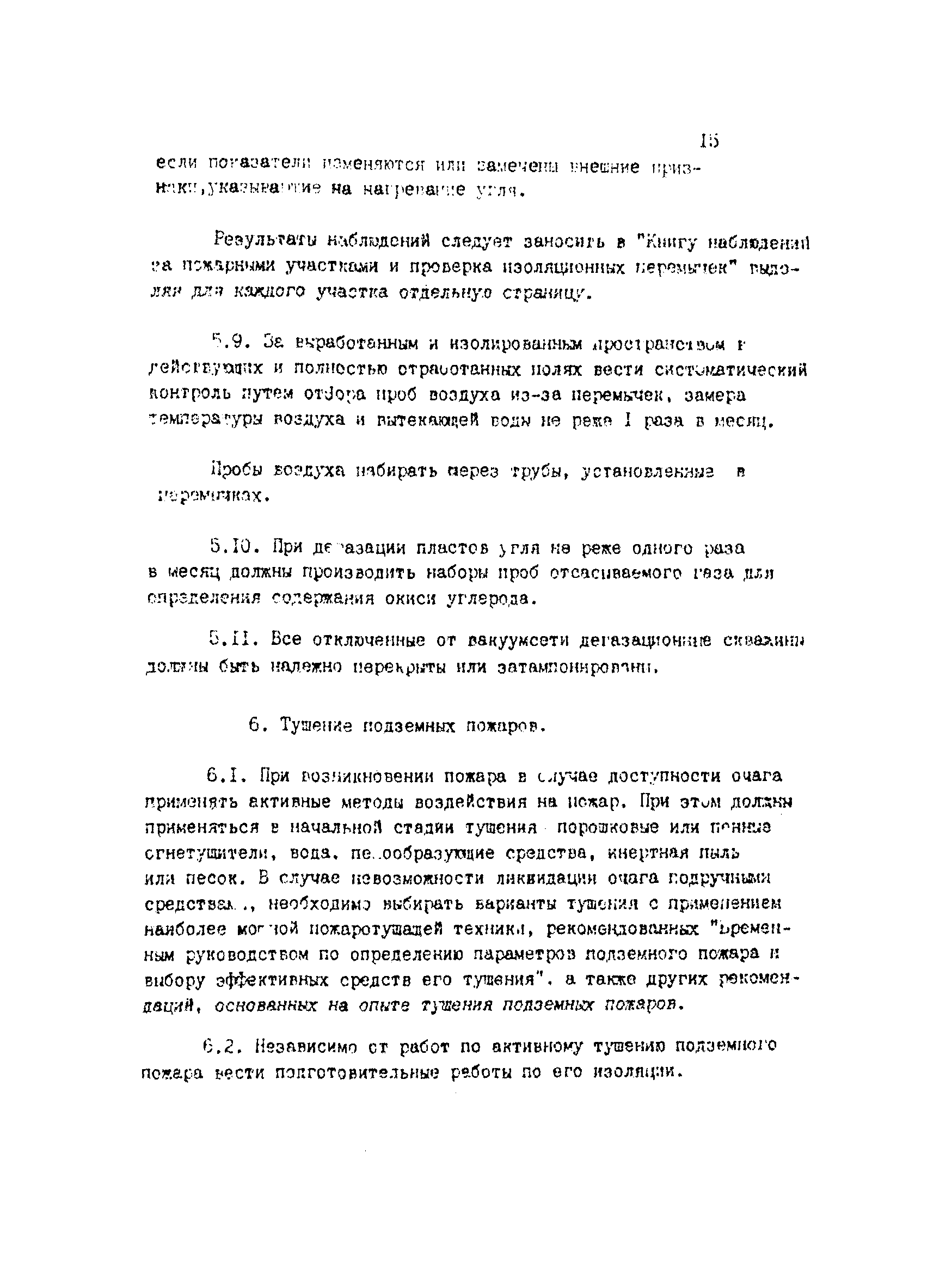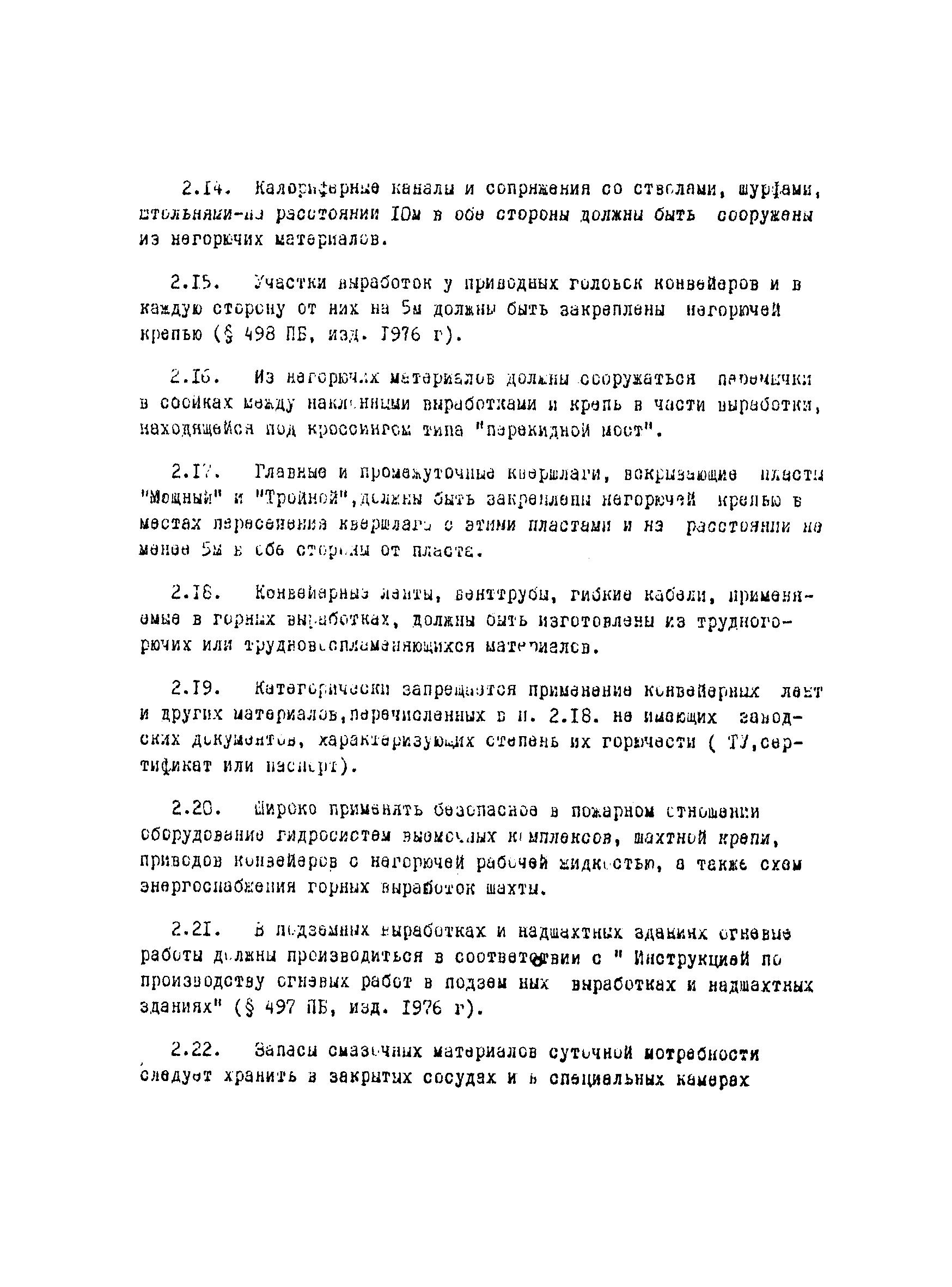 | Оглавление: | Введение 1 Общие положения 2 Предупреждение подземных пожаров 3 Изоляция выработанных пространств от действующих выработок 4 Ведение горных работ под потушенными пожарами 5 Контрольно-наблюдательная служба 6 Тушение подземных пожаров 7 Оформление вновь возникших подземных пожаров 8 Списание подземных пожаров 9 Подготовка трудящихся к ликвидации подземных пожаров Приложение 1. Приложение 2. |
