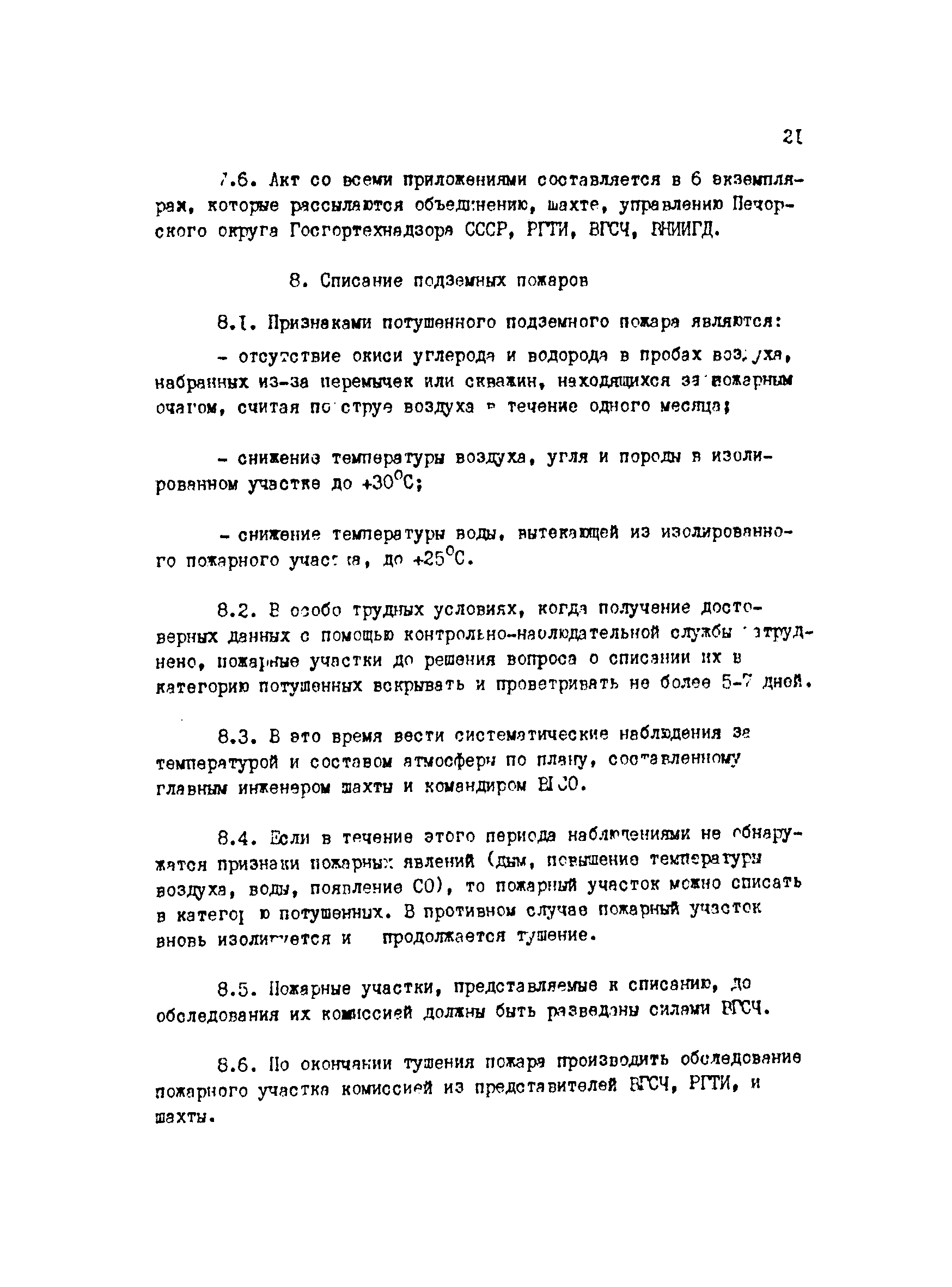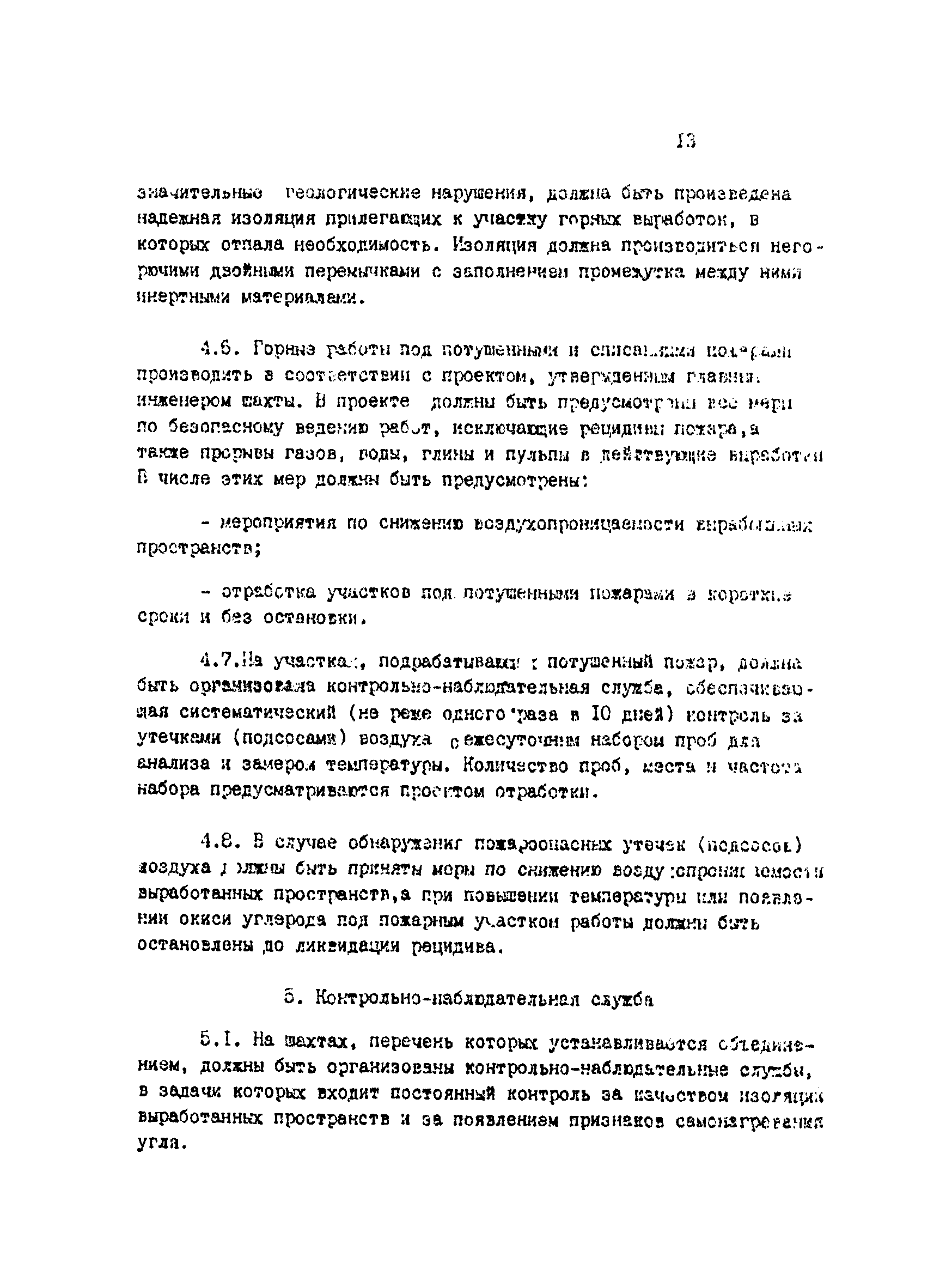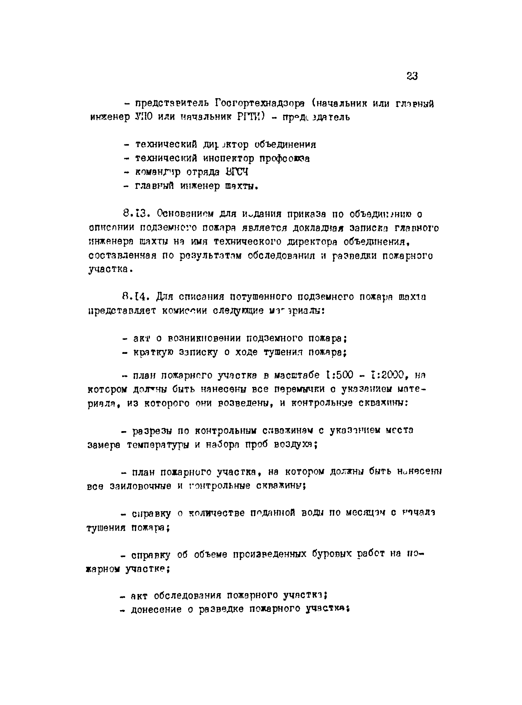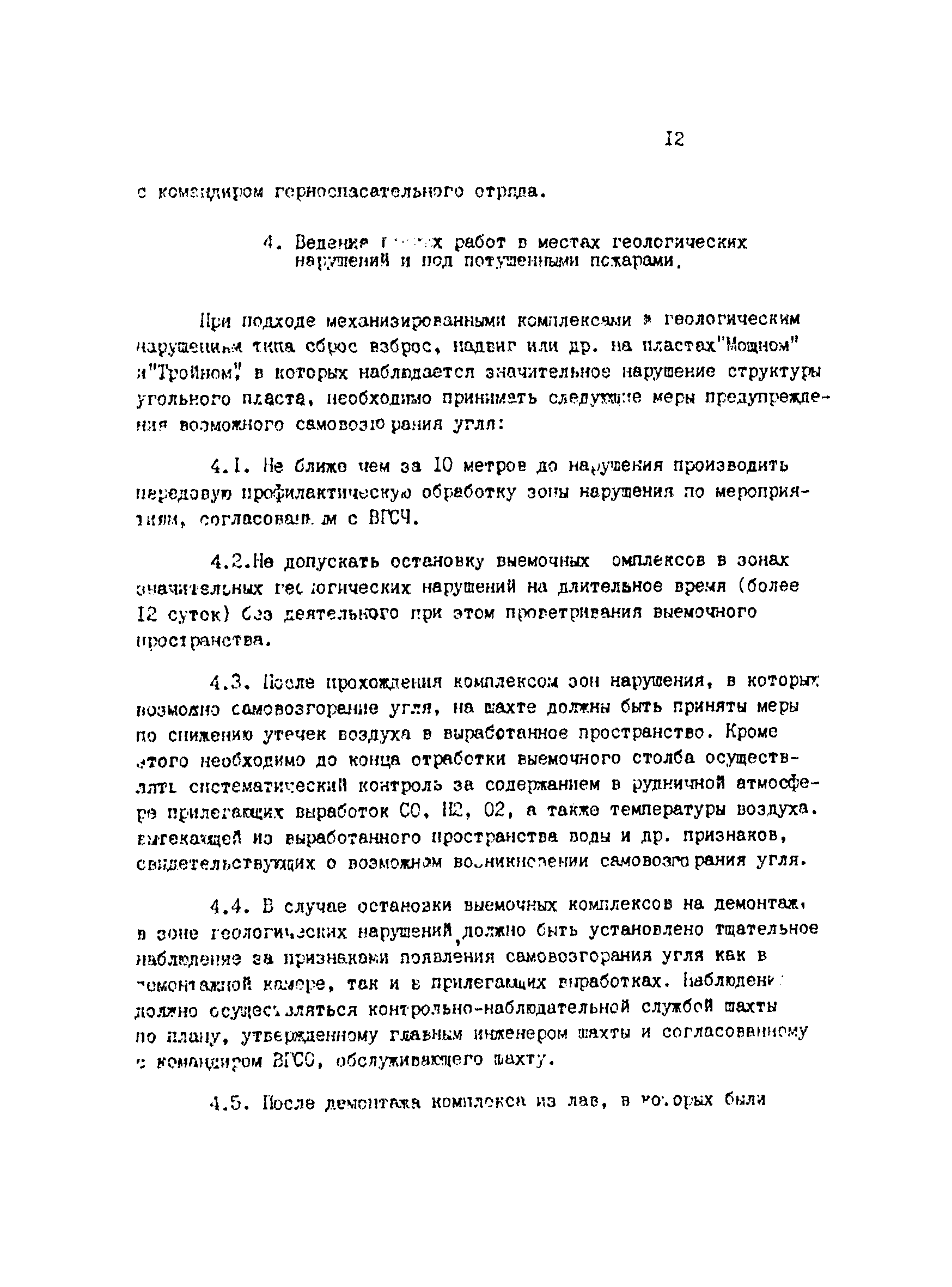 | Оглавление: | Введение 1 Общие положения 2 Предупреждение подземных пожаров 3 Изоляция выработанных пространств от действующих выработок 4 Ведение горных работ под потушенными пожарами 5 Контрольно-наблюдательная служба 6 Тушение подземных пожаров 7 Оформление вновь возникших подземных пожаров 8 Списание подземных пожаров 9 Подготовка трудящихся к ликвидации подземных пожаров Приложение 1. Приложение 2. |