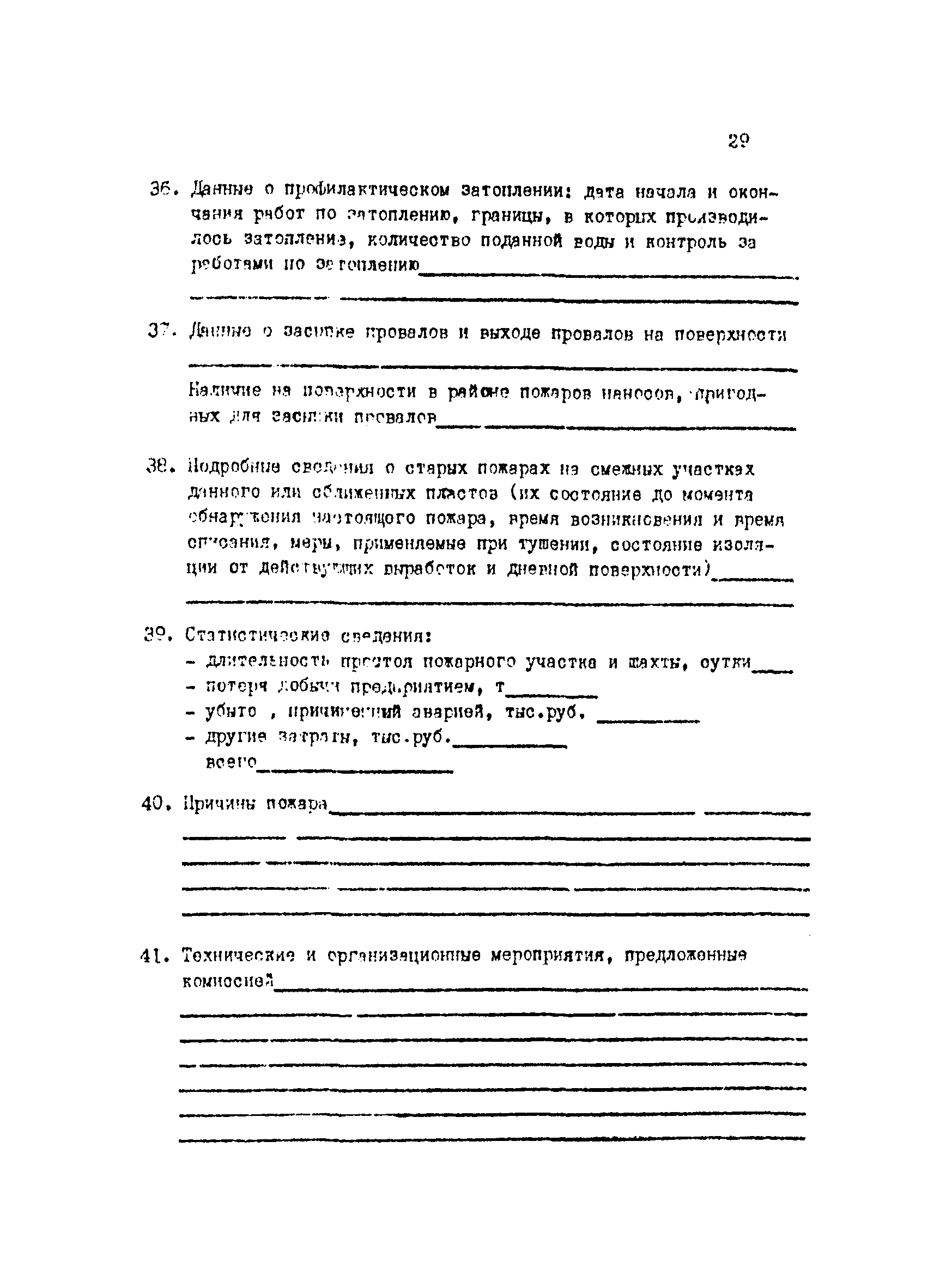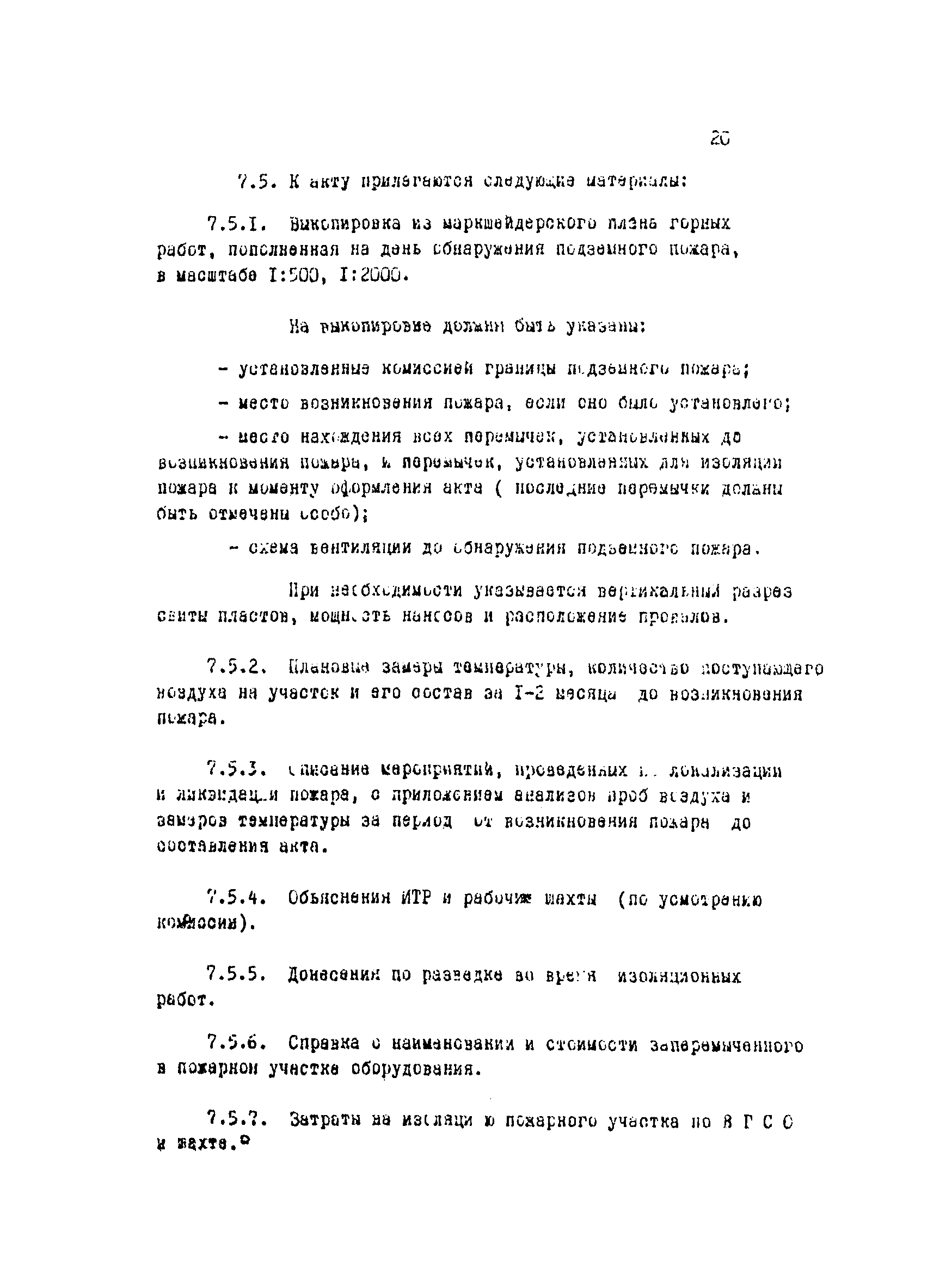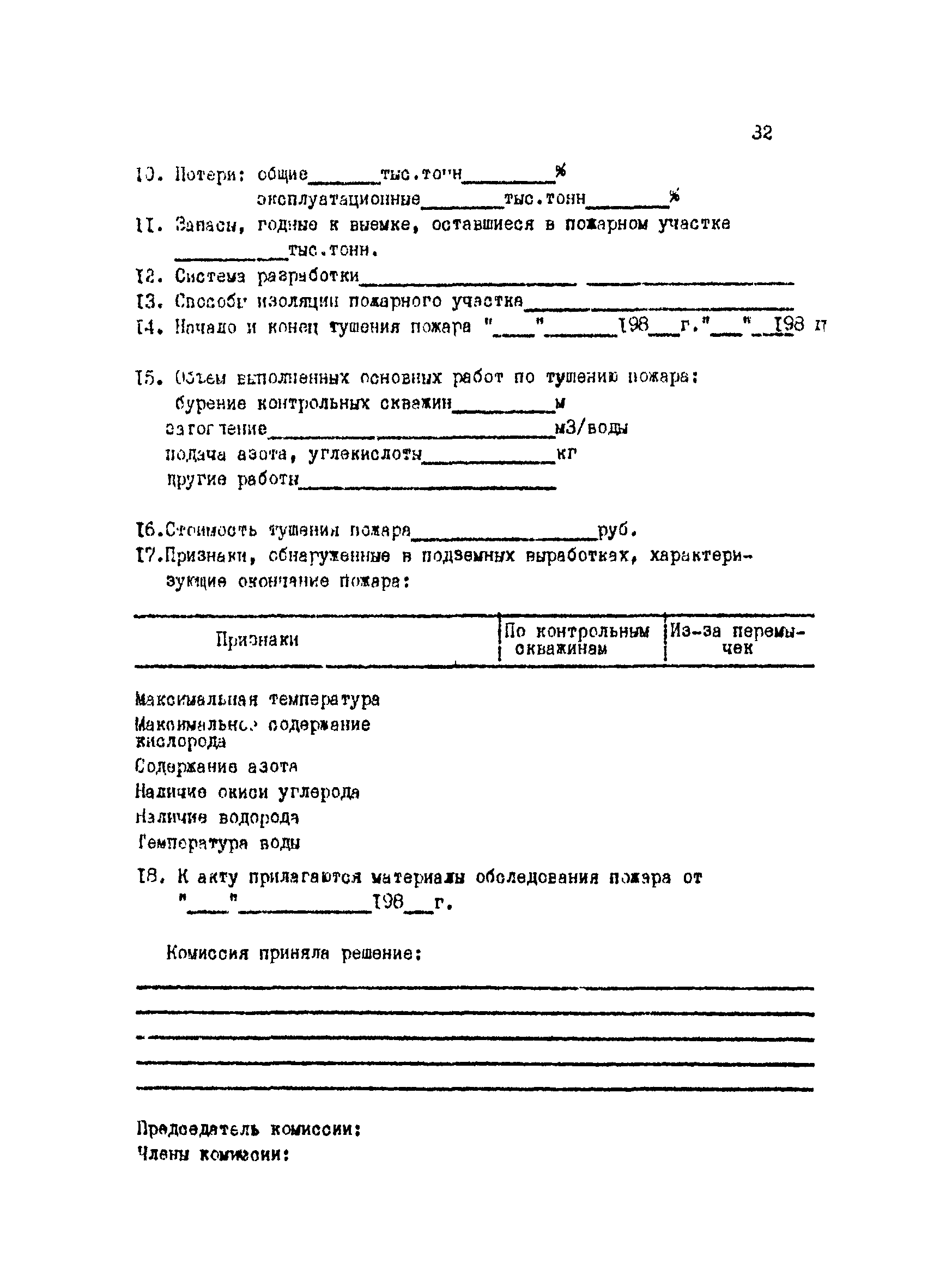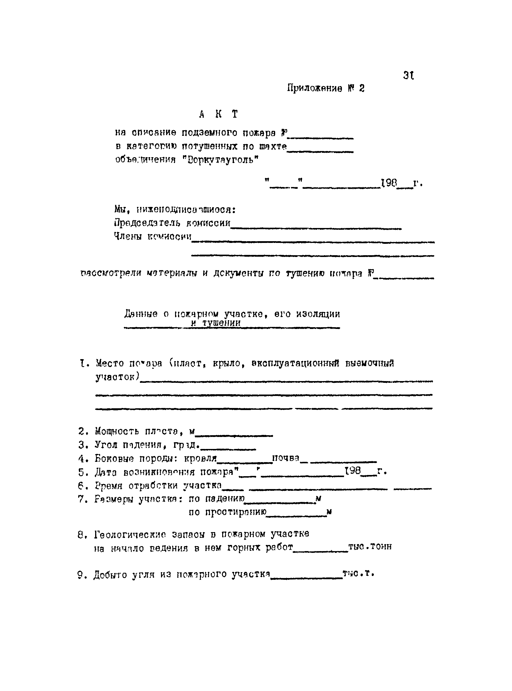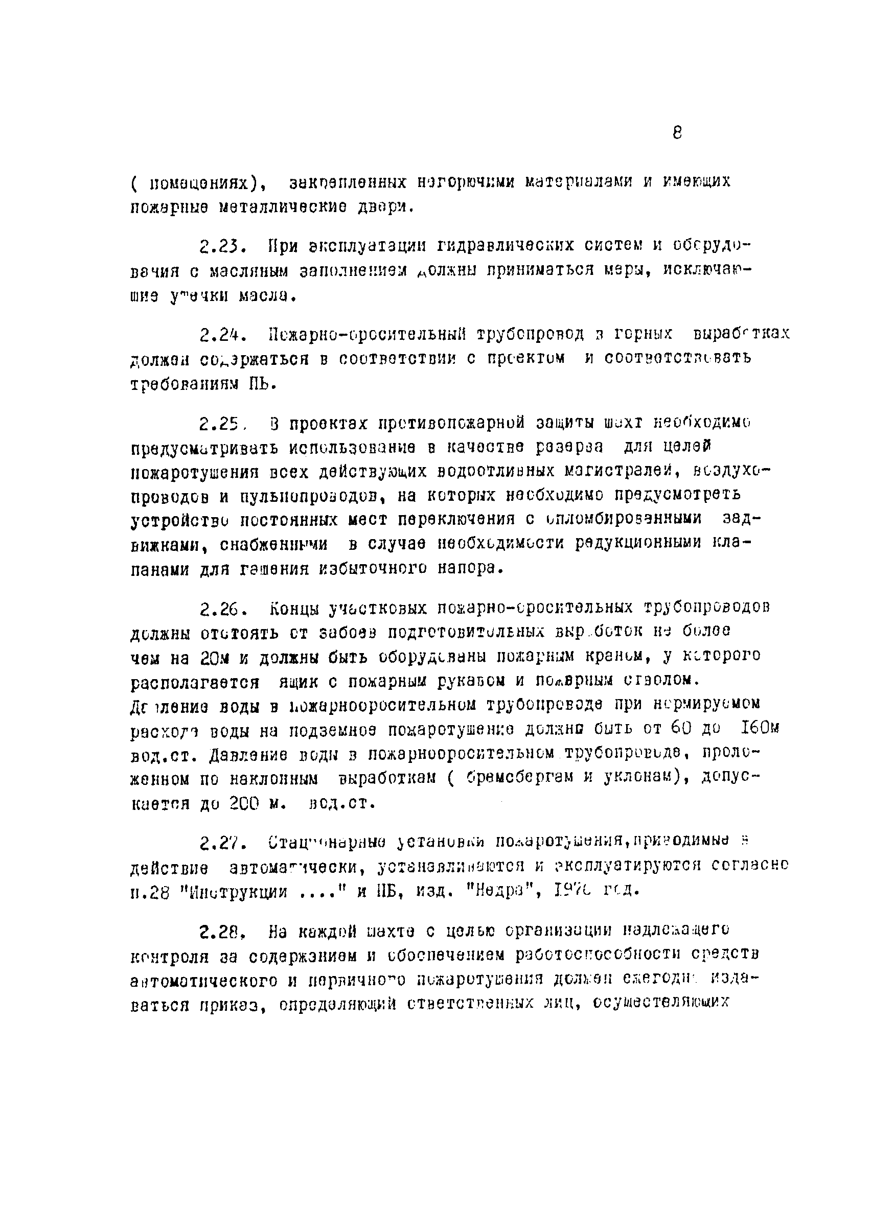 | Оглавление: | Введение 1 Общие положения 2 Предупреждение подземных пожаров 3 Изоляция выработанных пространств от действующих выработок 4 Ведение горных работ под потушенными пожарами 5 Контрольно-наблюдательная служба 6 Тушение подземных пожаров 7 Оформление вновь возникших подземных пожаров 8 Списание подземных пожаров 9 Подготовка трудящихся к ликвидации подземных пожаров Приложение 1. Приложение 2. |