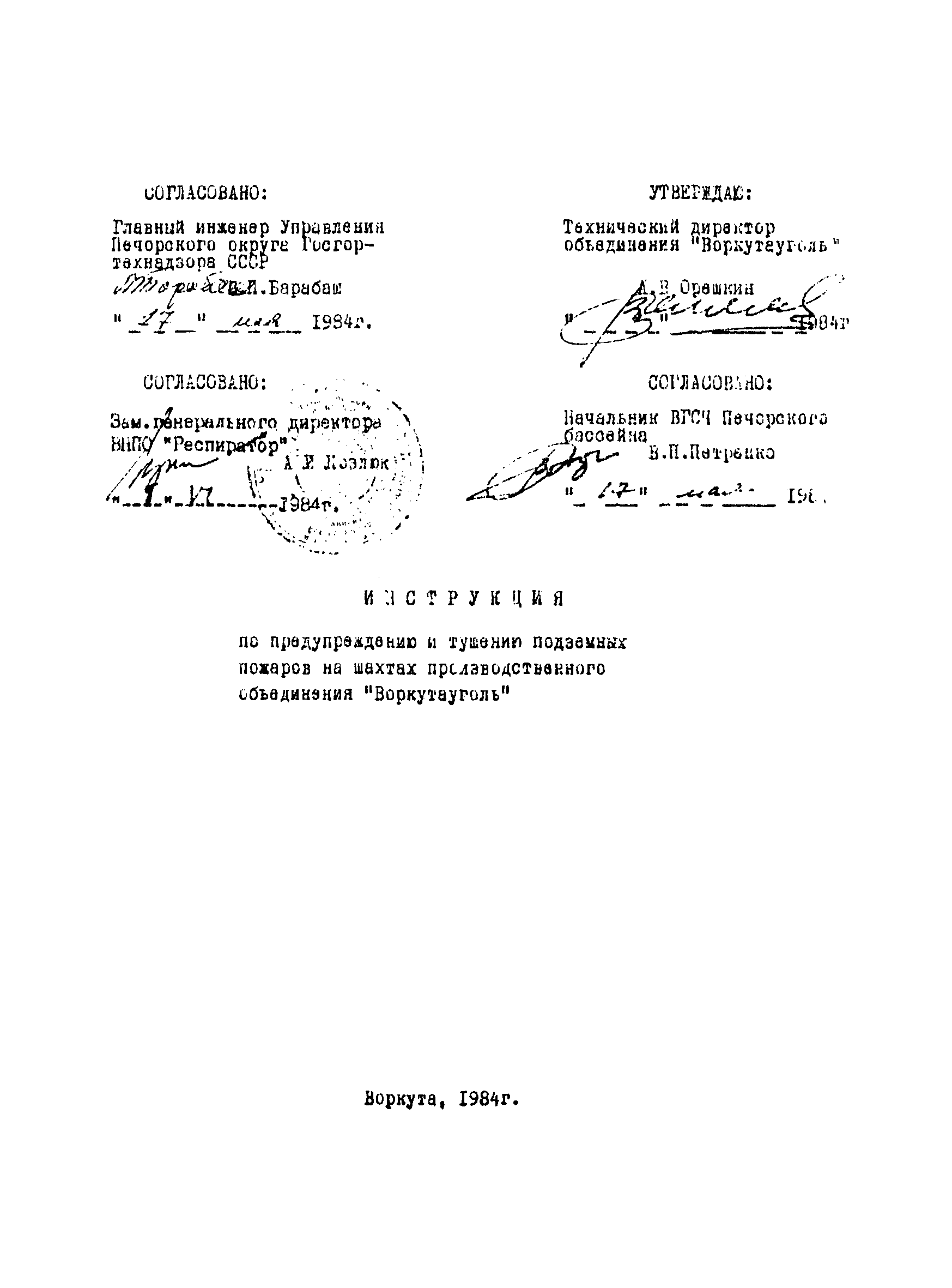 | Принят: | 17.05.1984 ВНПО Респиратор 17.05.1984 Госгортехнадзор СССР Печерского округа 17.05.1984 ВГСЧ Печерского района