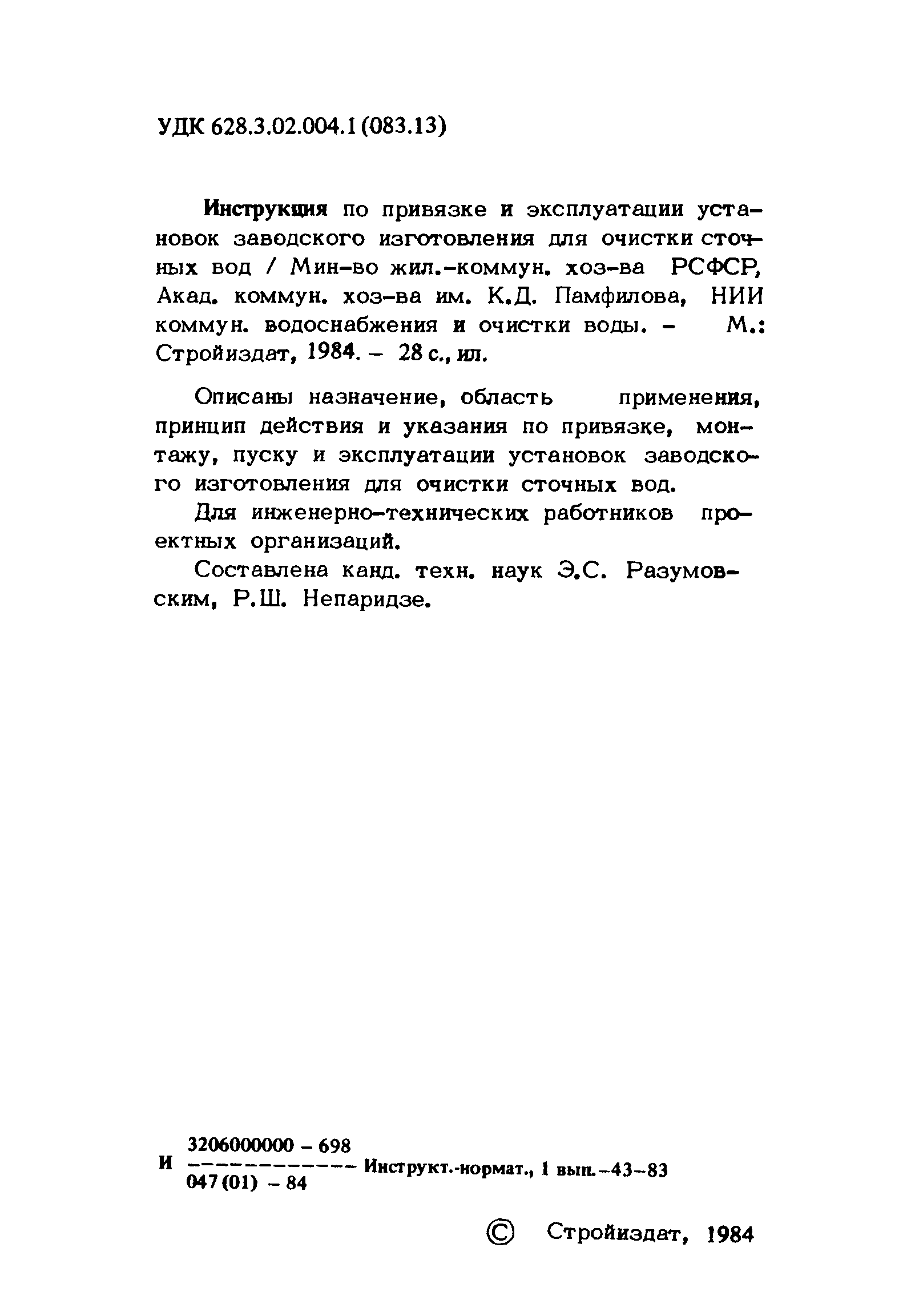 | Название рус.: | Инструкция по привязке и эксплуатации установок заводского изготовления для очистки сточных вод |