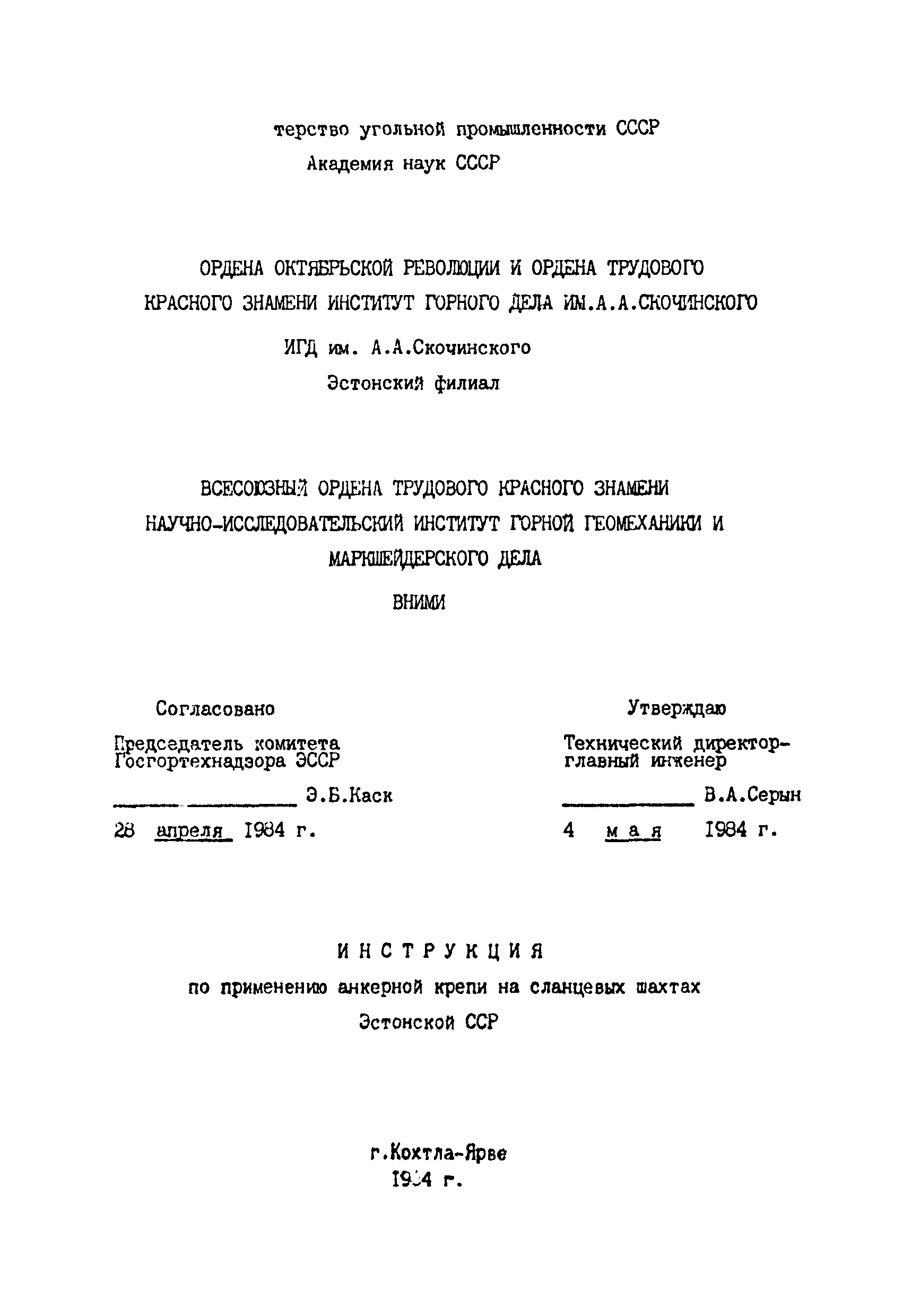 | Утверждён: | 04.05.1984 Министерство угольной промышленности СССР (USSR Ministry of the Coal Industry )