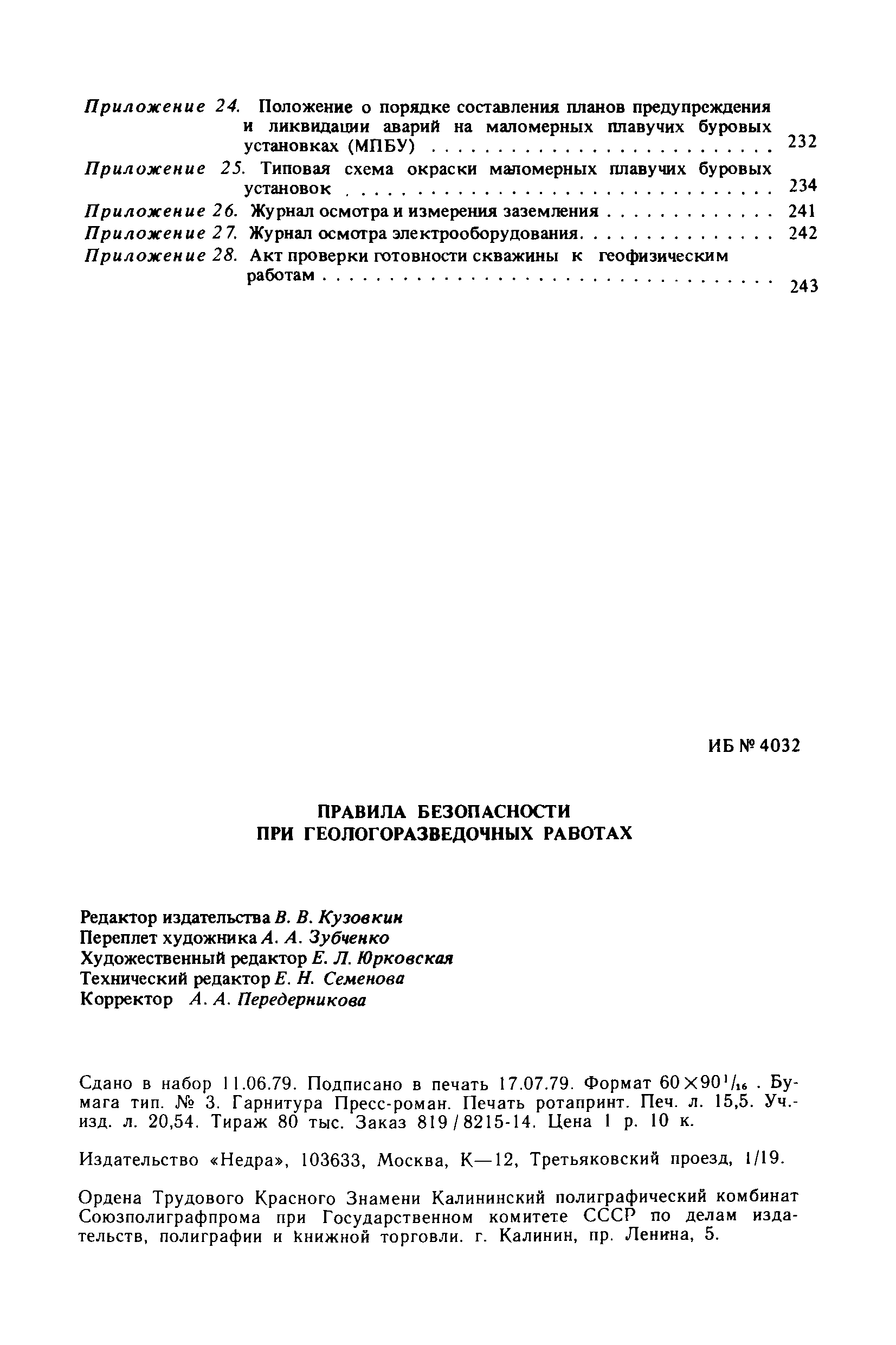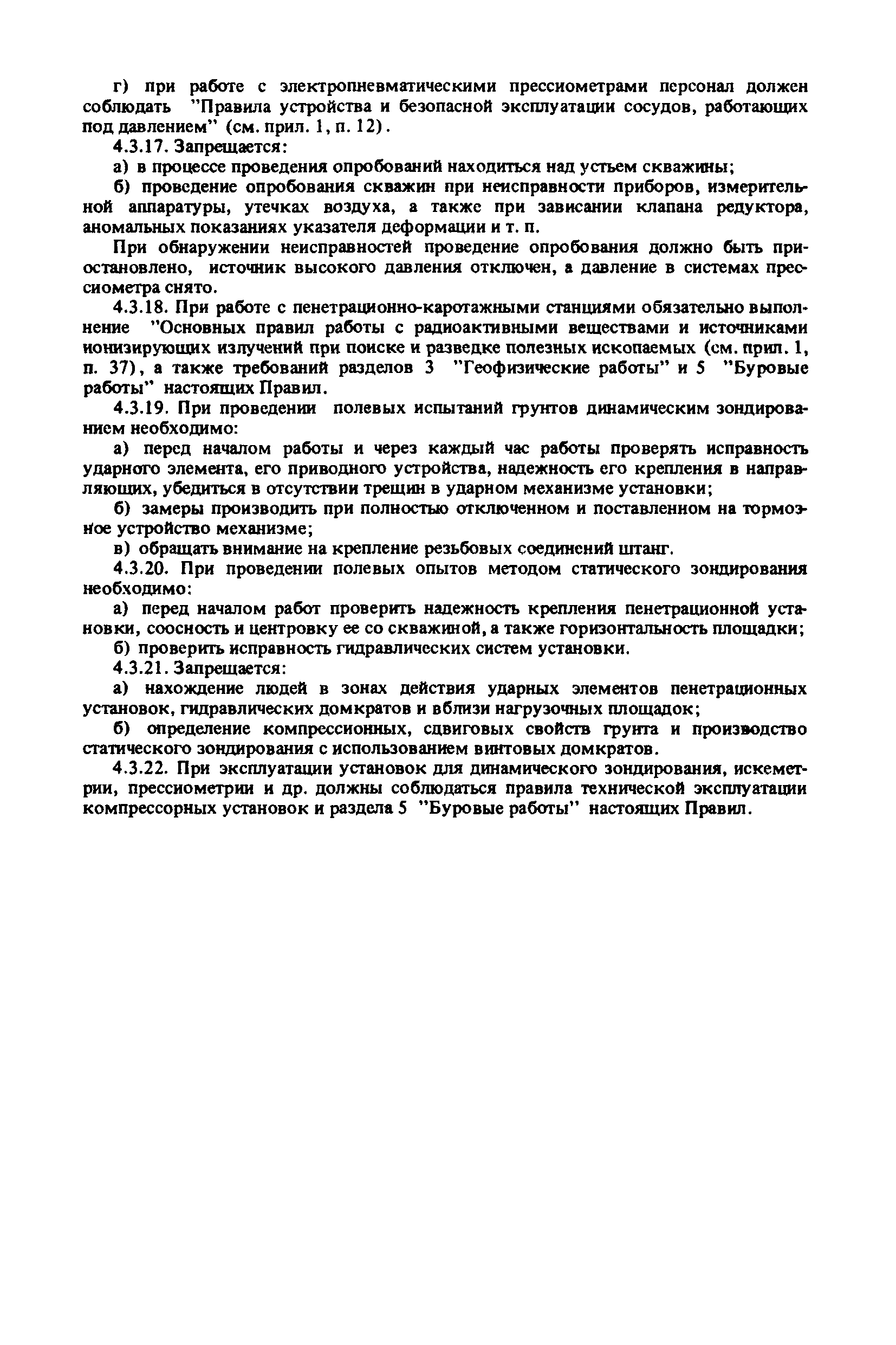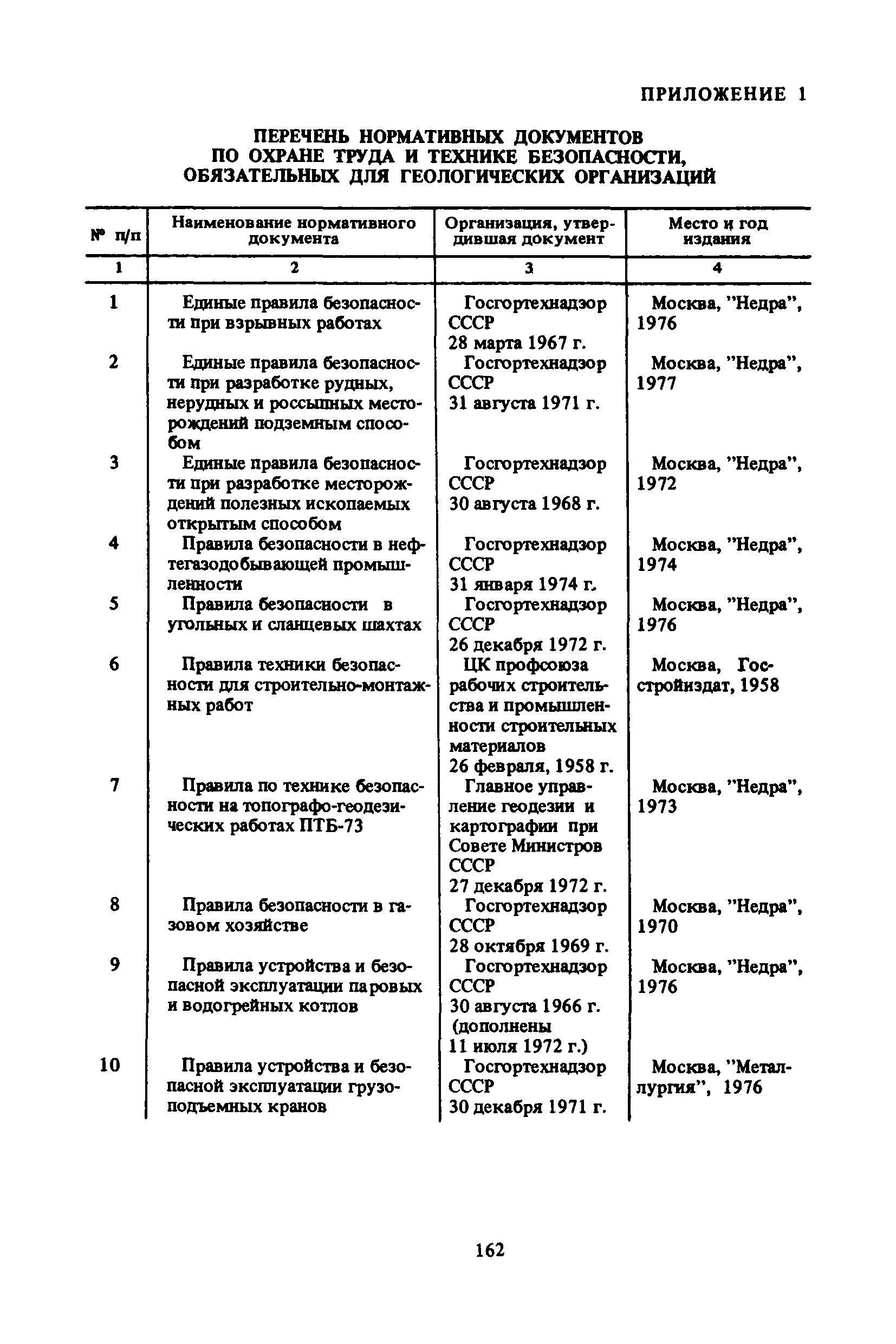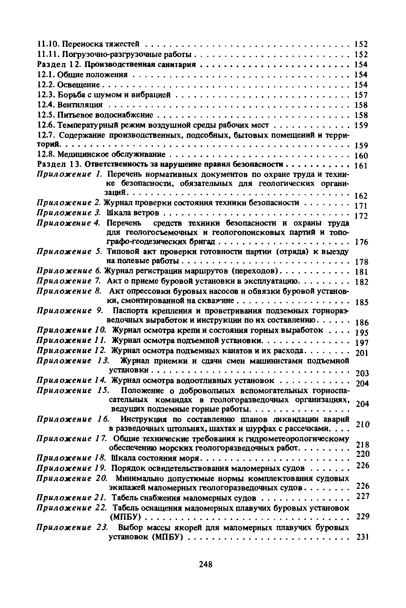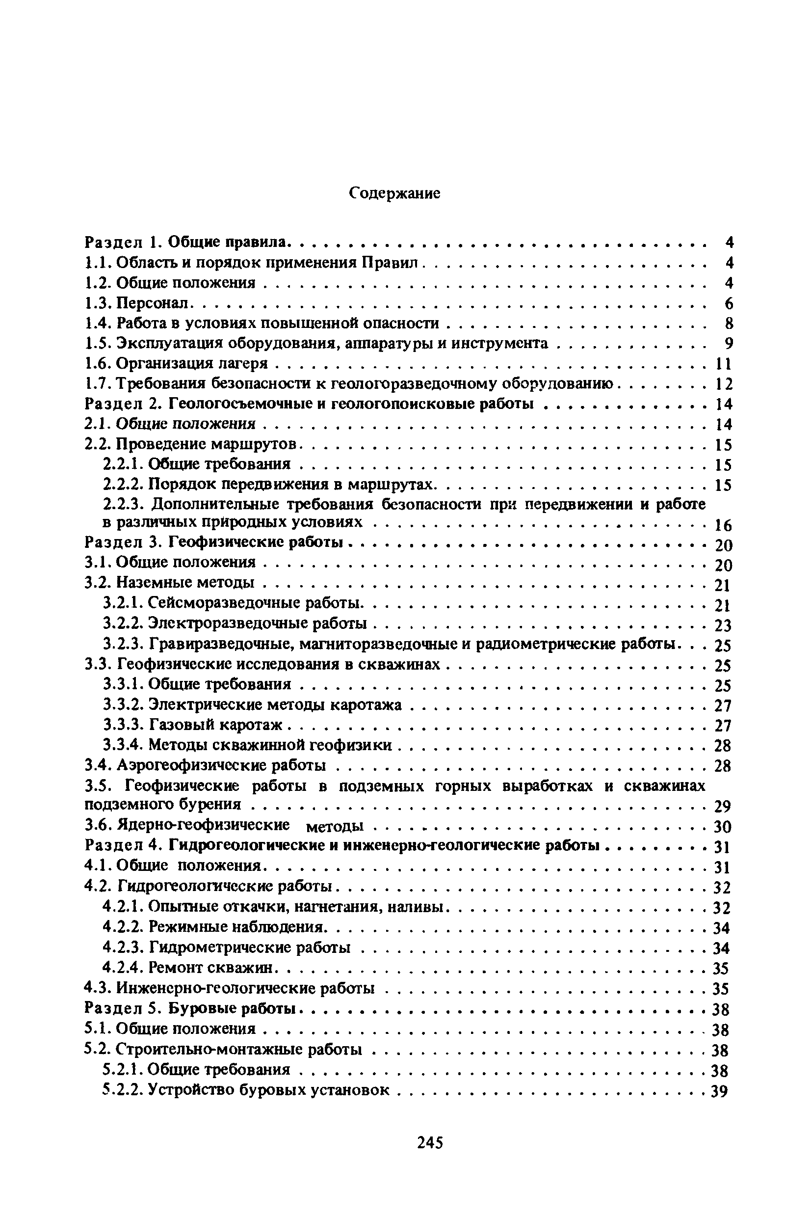 | Оглавление: | Раздел 1. Общие правила Раздел 2. Геологосъемочные и геологопоисковые работы Раздел 3. Геофизические работы Раздел 4. Гидрогеологические и инженерно-геологические работы Раздел 5. Буровые работы Раздел 6. Горноразведочные работы Раздел 7. Морские геологоразведочные работы Раздел 8. Опробовательские работы Раздел 9. Лабораторные работы Раздел 10. Электротехнические работы Раздел 11. Транспорт Раздел 12. Производственная санитария Раздел 13. Ответственность за нарушение правил безопасности Приложение 1. Перечень нормативных документов по охране труда и технике безопасности, обязательных для геологических организации Приложение 2. Журнал проверки состояния техники безопасности Приложение 3. Шкала ветров Приложение 4. Перечень средств техники безопасности и охраны труда для геологосъемочных и геологопоисковых партий и топографо-геодезических бригад Приложение 5. Типовой акт проверки готовности партии (отряда) к выезду на полевые работы Приложение 6. Журнал регистрации маршрутов (переходов) Приложение 7. Акт о приеме буровой установки в эксплуатацию Приложение 8. Акт опрессовки буровых насосов и обвязки буровой установки, смонтированной на скважине Приложение 9. Паспорта крепления и проветривания подземных горноразведочных выработок и инструкции по их составлению Приложение 10. Журнал осмотра крепи и состояния горных выработок Приложение 11. Журнал осмотра подъемной установки Приложение 12. Журнал осмотра подъемных канатов и их расхода Приложение 13. Журнал приемки и сдачи смен машинистами подъемной установки Приложение 14. Журнал осмотра водоотливных установок Приложение 15. Положение о добровольных вспомогательных горноспасательных командах в геологоразведочных организациях, ведущих подземные горные работы Приложение 16. Инструкция по составлению планов ликвидации аварий в разведочных штольнях, шахтах и шурфах с рассечками. Приложение 17. Общие технические требования к гидрометеорологическому обеспечению морских геологоразведочных работ Приложение 18. Шкала состояния моря Приложение 19. Порядок освидетельствования маломерных судов Приложение 20. Минимально допустимые нормы комплектования судовых экипажей маломерных геологоразведочных судов Приложение 21. Табель снабжения маломерных судов Приложение 22. Табель оснащения маломерных плавучих буровых установок (МПБУ) Приложение 23. Выбор массы якорей для маломерных плавучих буровых установок (МГХБУ) Приложение 24. Положение о порядке составления планов предупреждения и ликвидации аварий на маломерных плавучих буровых установках (МПБУ) Приложение 25. Типовая схема окраски маломерных плавучих буровых установок Приложение 26. Журнал осмотра и измерения заземления Приложение 27. Журнал осмотра электрооборудования Приложение 28. Акт проверки готовности скважины к геофизическим работам |