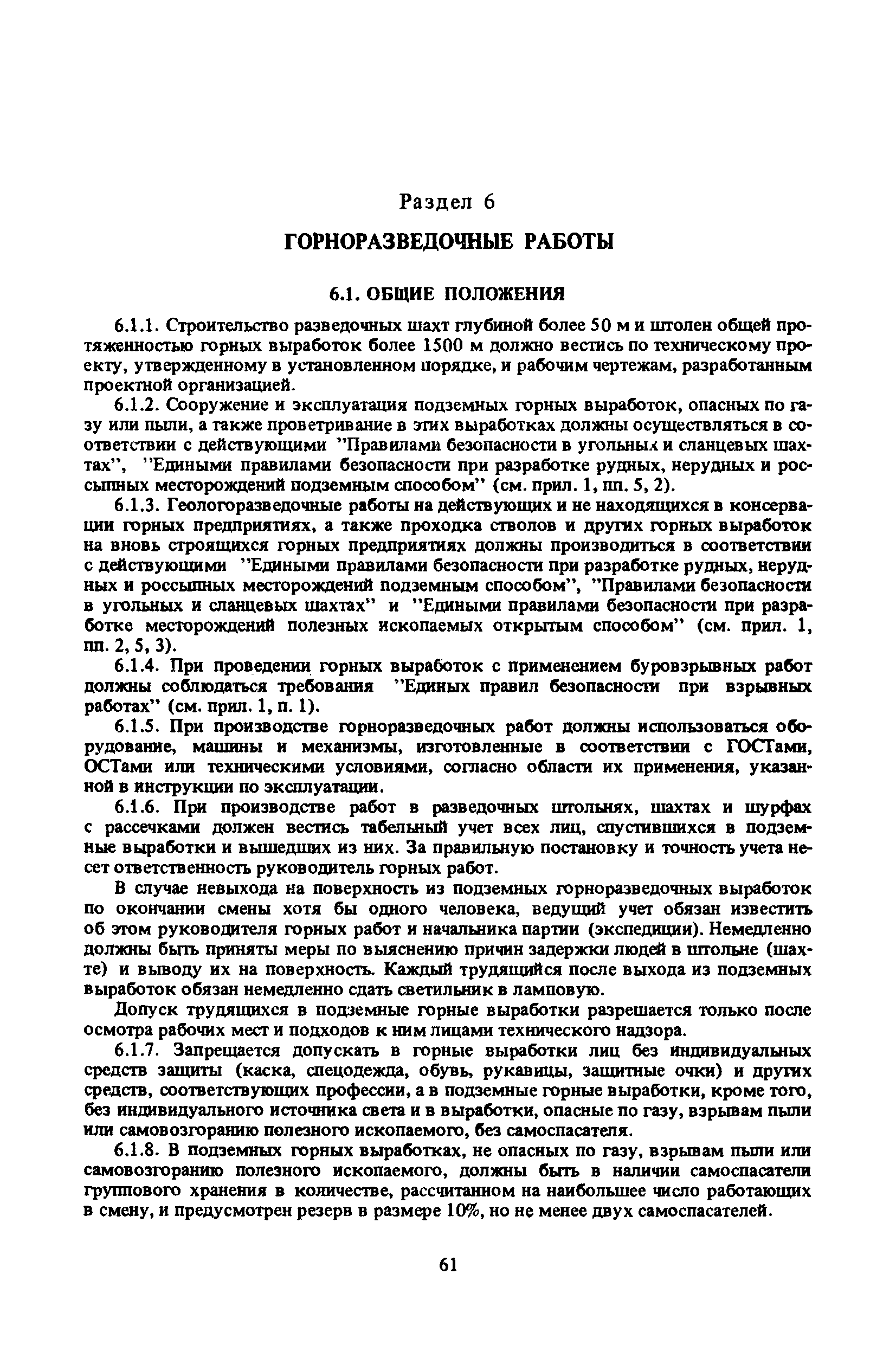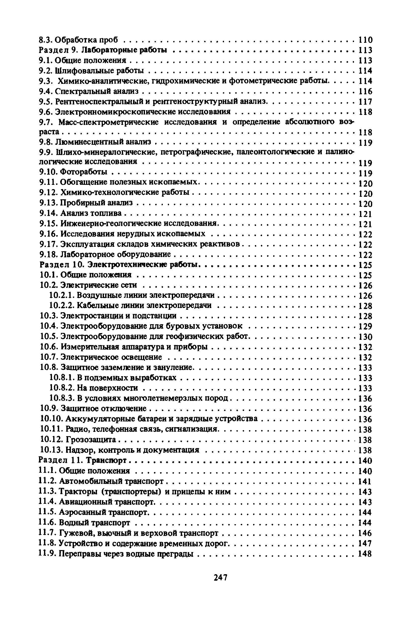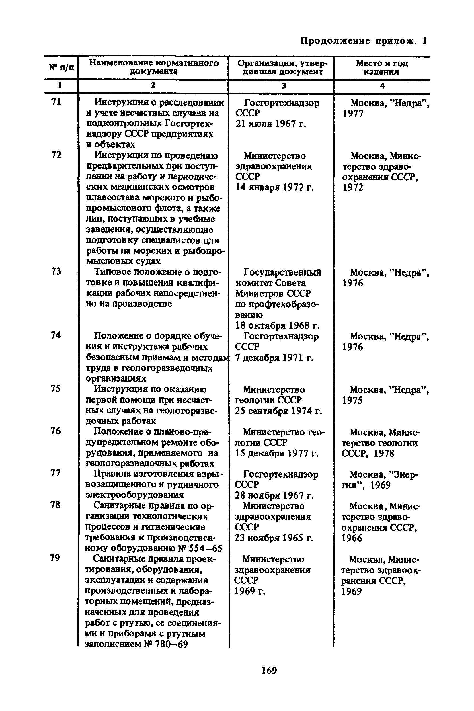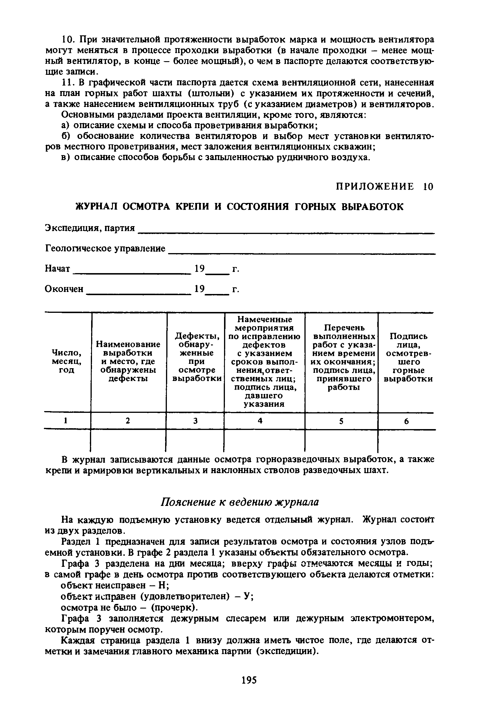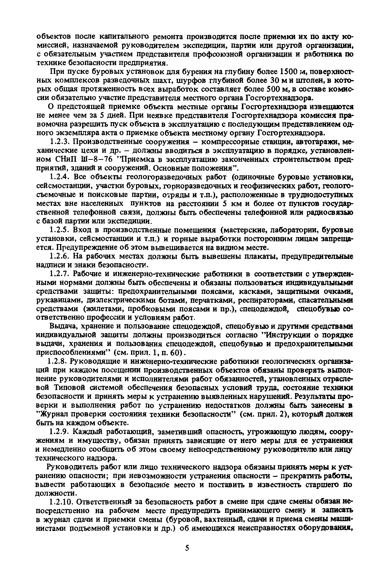 | Оглавление: | Раздел 1. Общие правила Раздел 2. Геологосъемочные и геологопоисковые работы Раздел 3. Геофизические работы Раздел 4. Гидрогеологические и инженерно-геологические работы Раздел 5. Буровые работы Раздел 6. Горноразведочные работы Раздел 7. Морские геологоразведочные работы Раздел 8. Опробовательские работы Раздел 9. Лабораторные работы Раздел 10. Электротехнические работы Раздел 11. Транспорт Раздел 12. Производственная санитария Раздел 13. Ответственность за нарушение правил безопасности Приложение 1. Перечень нормативных документов по охране труда и технике безопасности, обязательных для геологических организации Приложение 2. Журнал проверки состояния техники безопасности Приложение 3. Шкала ветров Приложение 4. Перечень средств техники безопасности и охраны труда для геологосъемочных и геологопоисковых партий и топографо-геодезических бригад Приложение 5. Типовой акт проверки готовности партии (отряда) к выезду на полевые работы Приложение 6. Журнал регистрации маршрутов (переходов) Приложение 7. Акт о приеме буровой установки в эксплуатацию Приложение 8. Акт опрессовки буровых насосов и обвязки буровой установки, смонтированной на скважине Приложение 9. Паспорта крепления и проветривания подземных горноразведочных выработок и инструкции по их составлению Приложение 10. Журнал осмотра крепи и состояния горных выработок Приложение 11. Журнал осмотра подъемной установки Приложение 12. Журнал осмотра подъемных канатов и их расхода Приложение 13. Журнал приемки и сдачи смен машинистами подъемной установки Приложение 14. Журнал осмотра водоотливных установок Приложение 15. Положение о добровольных вспомогательных горноспасательных командах в геологоразведочных организациях, ведущих подземные горные работы Приложение 16. Инструкция по составлению планов ликвидации аварий в разведочных штольнях, шахтах и шурфах с рассечками. Приложение 17. Общие технические требования к гидрометеорологическому обеспечению морских геологоразведочных работ Приложение 18. Шкала состояния моря Приложение 19. Порядок освидетельствования маломерных судов Приложение 20. Минимально допустимые нормы комплектования судовых экипажей маломерных геологоразведочных судов Приложение 21. Табель снабжения маломерных судов Приложение 22. Табель оснащения маломерных плавучих буровых установок (МПБУ) Приложение 23. Выбор массы якорей для маломерных плавучих буровых установок (МГХБУ) Приложение 24. Положение о порядке составления планов предупреждения и ликвидации аварий на маломерных плавучих буровых установках (МПБУ) Приложение 25. Типовая схема окраски маломерных плавучих буровых установок Приложение 26. Журнал осмотра и измерения заземления Приложение 27. Журнал осмотра электрооборудования Приложение 28. Акт проверки готовности скважины к геофизическим работам |