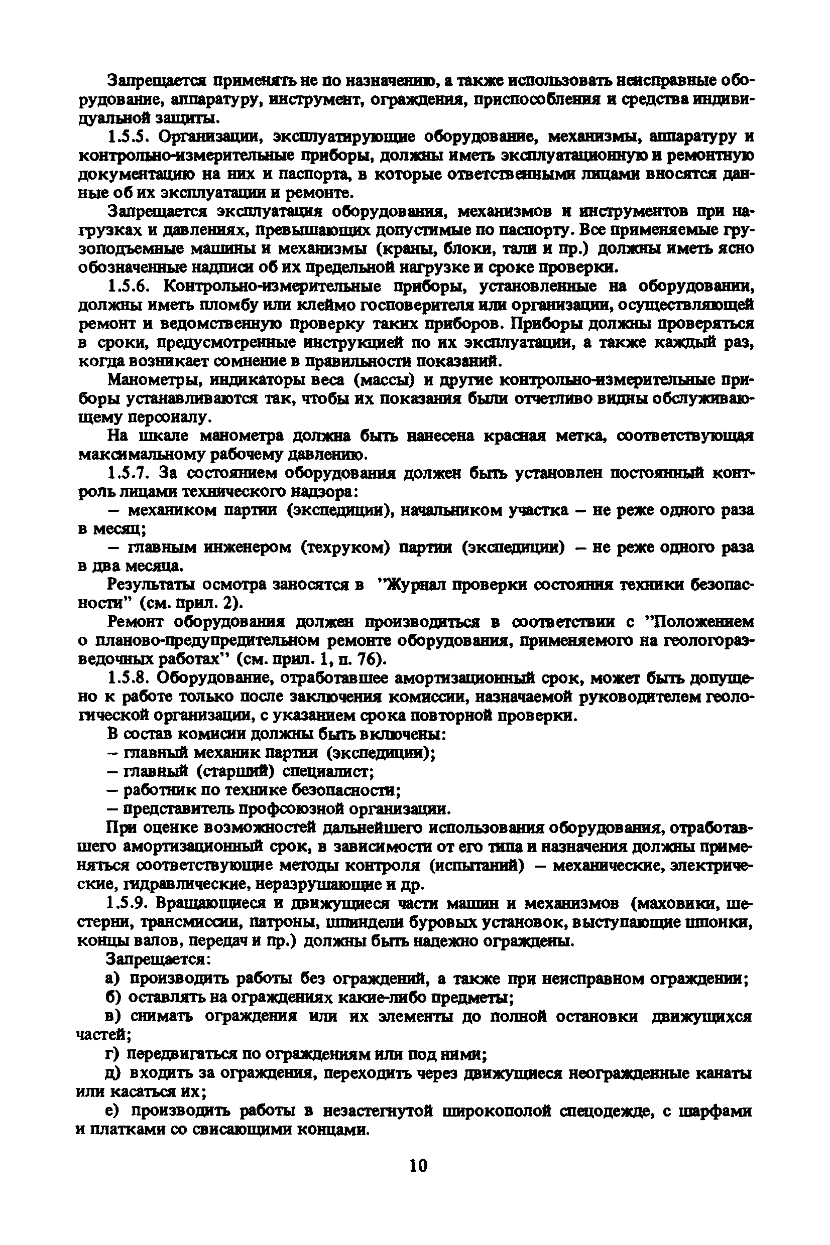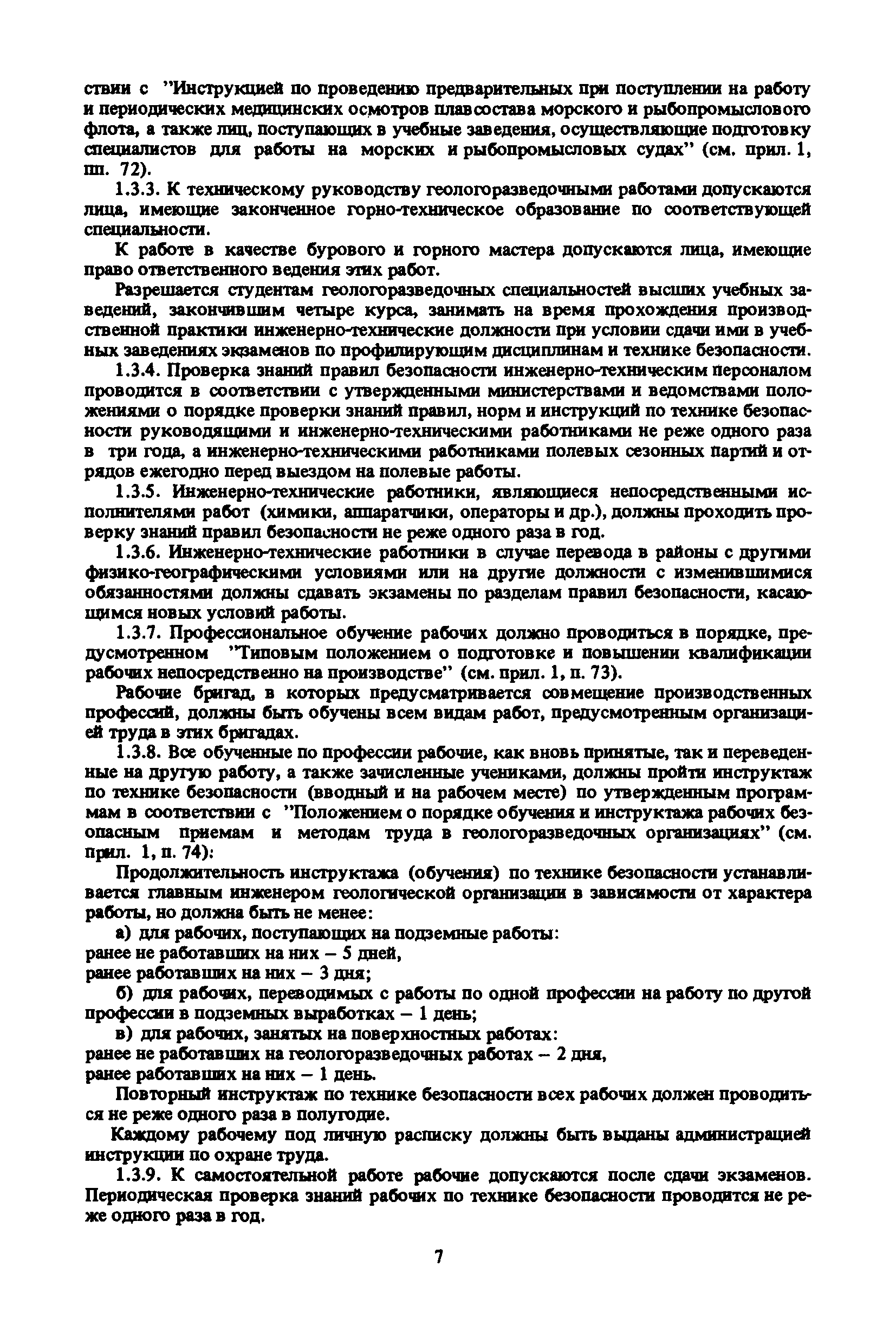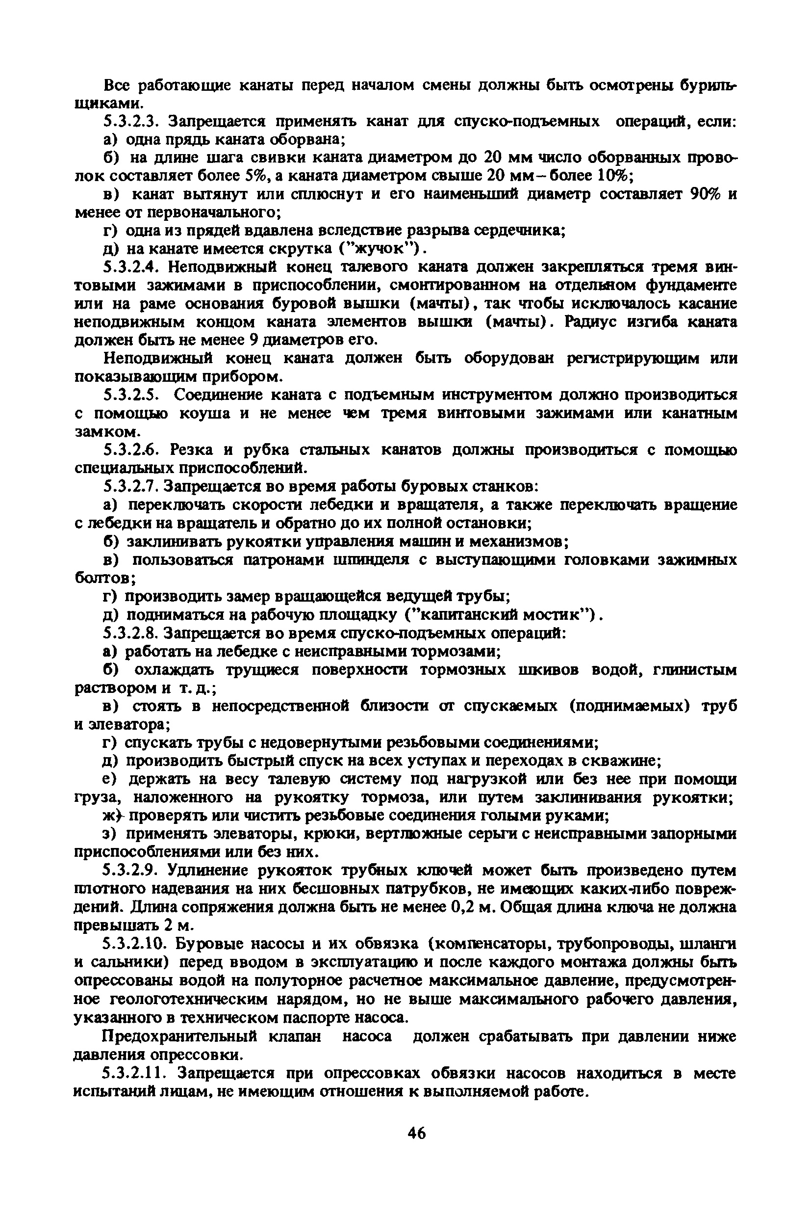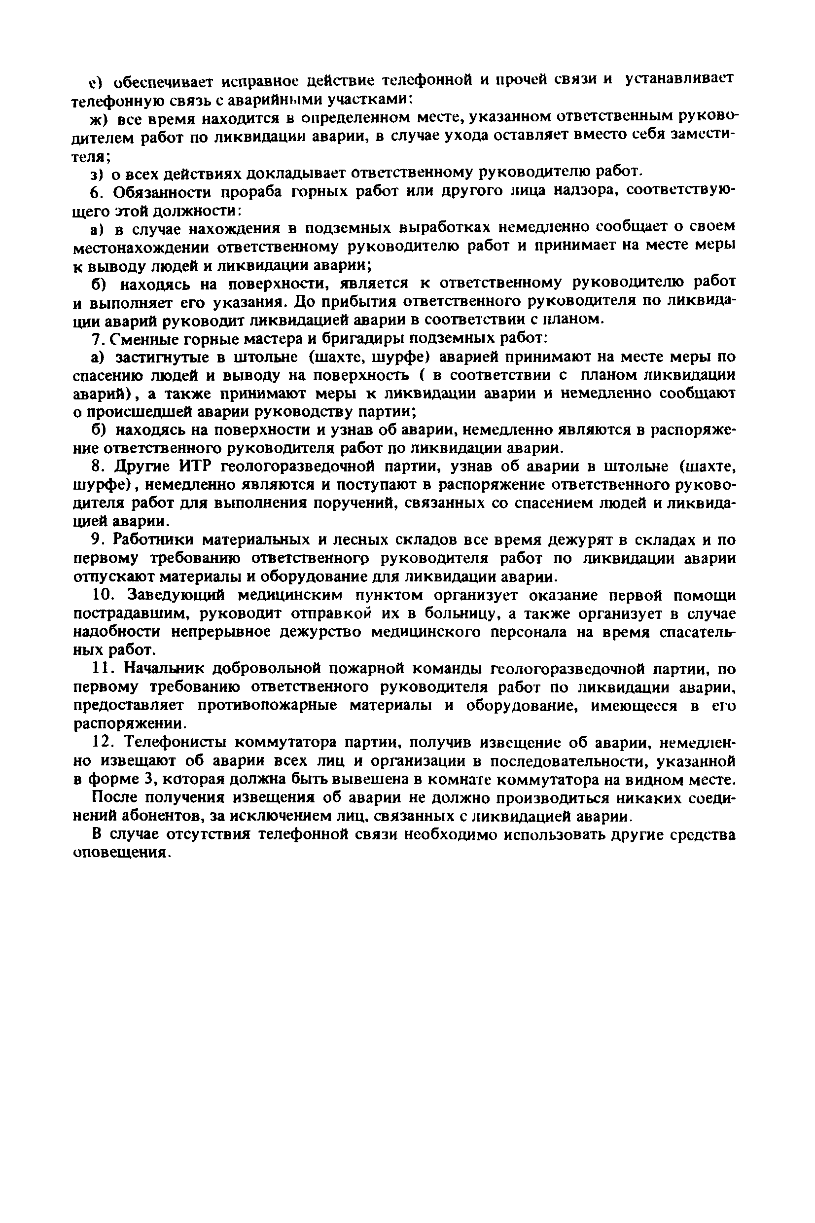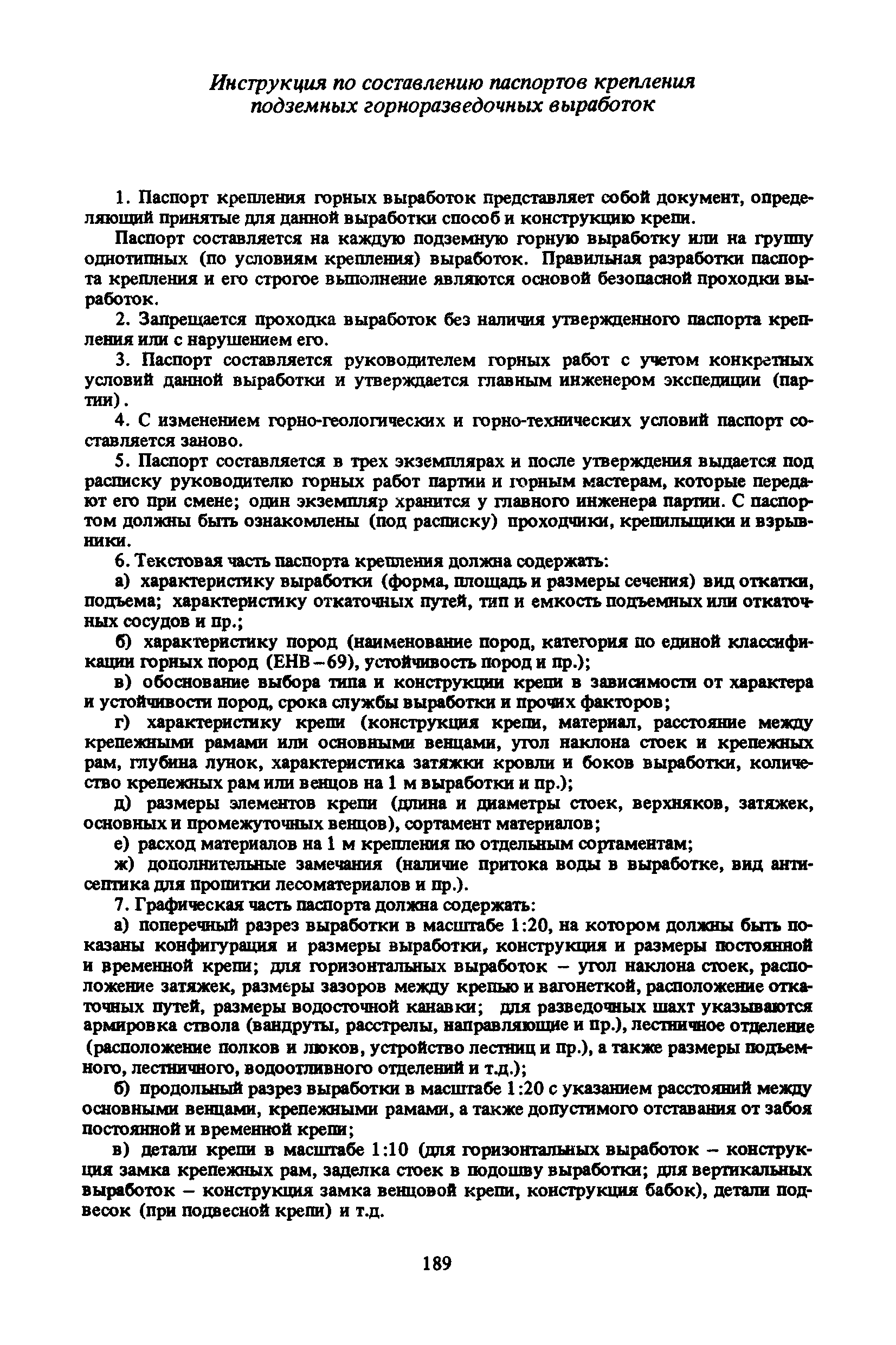 | Оглавление: | Раздел 1. Общие правила Раздел 2. Геологосъемочные и геологопоисковые работы Раздел 3. Геофизические работы Раздел 4. Гидрогеологические и инженерно-геологические работы Раздел 5. Буровые работы Раздел 6. Горноразведочные работы Раздел 7. Морские геологоразведочные работы Раздел 8. Опробовательские работы Раздел 9. Лабораторные работы Раздел 10. Электротехнические работы Раздел 11. Транспорт Раздел 12. Производственная санитария Раздел 13. Ответственность за нарушение правил безопасности Приложение 1. Перечень нормативных документов по охране труда и технике безопасности, обязательных для геологических организации Приложение 2. Журнал проверки состояния техники безопасности Приложение 3. Шкала ветров Приложение 4. Перечень средств техники безопасности и охраны труда для геологосъемочных и геологопоисковых партий и топографо-геодезических бригад Приложение 5. Типовой акт проверки готовности партии (отряда) к выезду на полевые работы Приложение 6. Журнал регистрации маршрутов (переходов) Приложение 7. Акт о приеме буровой установки в эксплуатацию Приложение 8. Акт опрессовки буровых насосов и обвязки буровой установки, смонтированной на скважине Приложение 9. Паспорта крепления и проветривания подземных горноразведочных выработок и инструкции по их составлению Приложение 10. Журнал осмотра крепи и состояния горных выработок Приложение 11. Журнал осмотра подъемной установки Приложение 12. Журнал осмотра подъемных канатов и их расхода Приложение 13. Журнал приемки и сдачи смен машинистами подъемной установки Приложение 14. Журнал осмотра водоотливных установок Приложение 15. Положение о добровольных вспомогательных горноспасательных командах в геологоразведочных организациях, ведущих подземные горные работы Приложение 16. Инструкция по составлению планов ликвидации аварий в разведочных штольнях, шахтах и шурфах с рассечками. Приложение 17. Общие технические требования к гидрометеорологическому обеспечению морских геологоразведочных работ Приложение 18. Шкала состояния моря Приложение 19. Порядок освидетельствования маломерных судов Приложение 20. Минимально допустимые нормы комплектования судовых экипажей маломерных геологоразведочных судов Приложение 21. Табель снабжения маломерных судов Приложение 22. Табель оснащения маломерных плавучих буровых установок (МПБУ) Приложение 23. Выбор массы якорей для маломерных плавучих буровых установок (МГХБУ) Приложение 24. Положение о порядке составления планов предупреждения и ликвидации аварий на маломерных плавучих буровых установках (МПБУ) Приложение 25. Типовая схема окраски маломерных плавучих буровых установок Приложение 26. Журнал осмотра и измерения заземления Приложение 27. Журнал осмотра электрооборудования Приложение 28. Акт проверки готовности скважины к геофизическим работам |