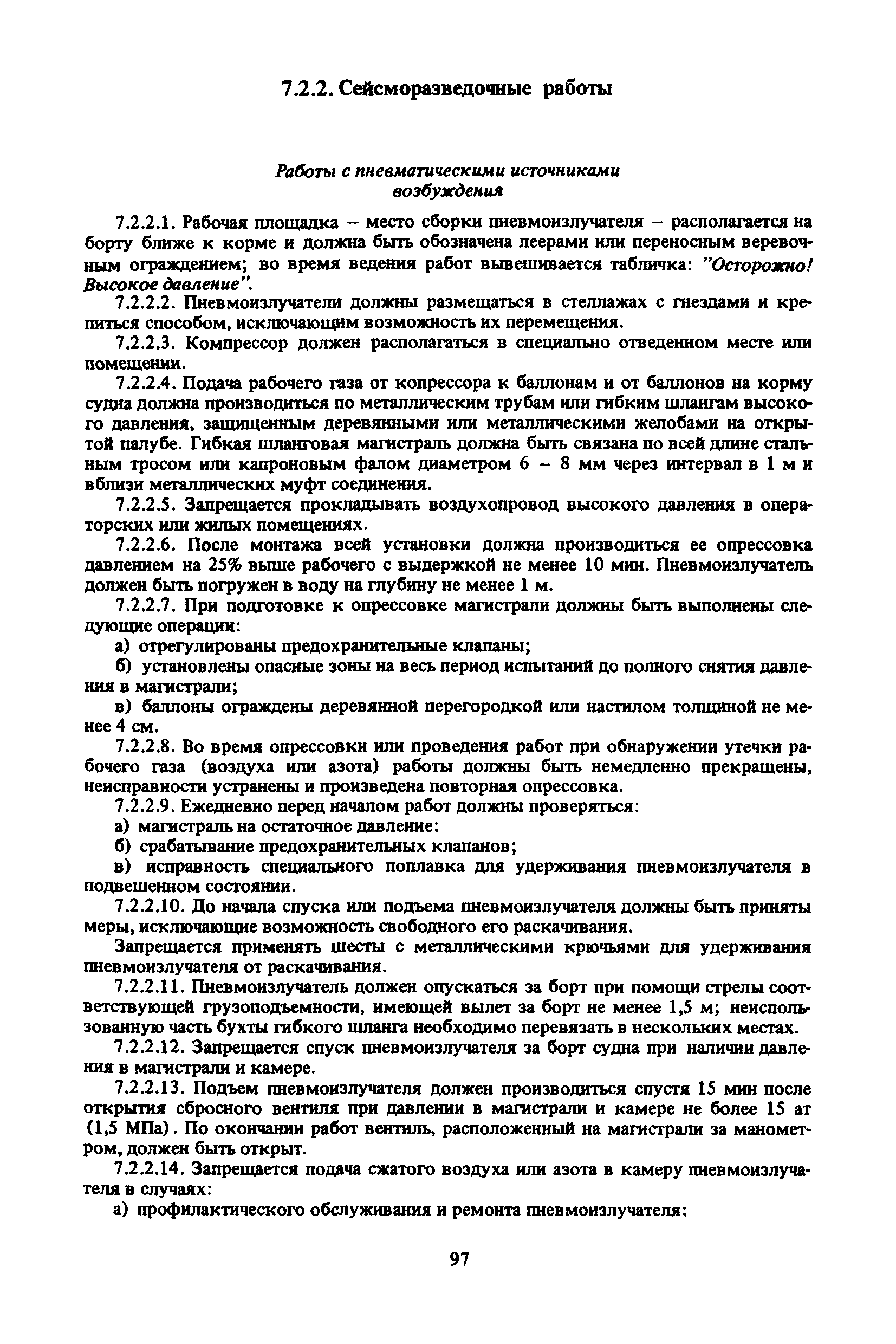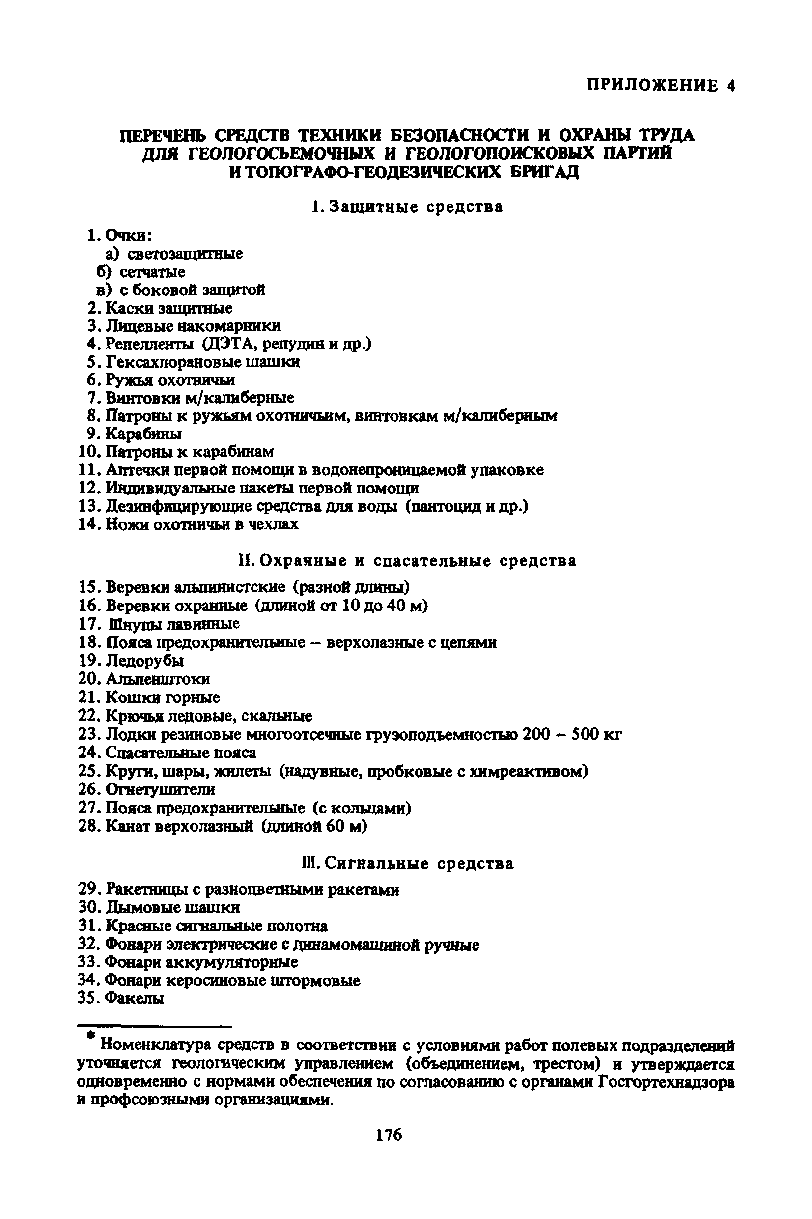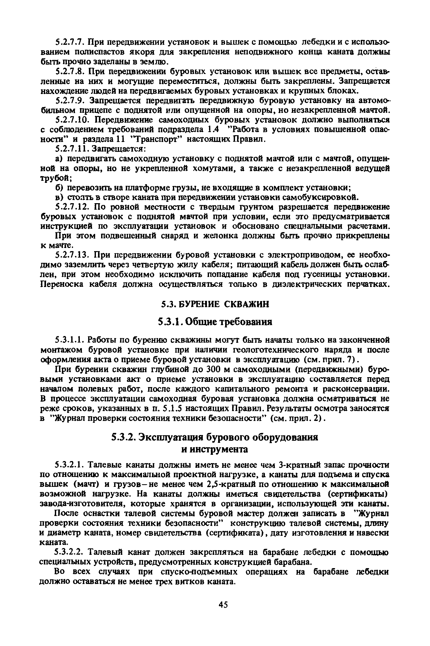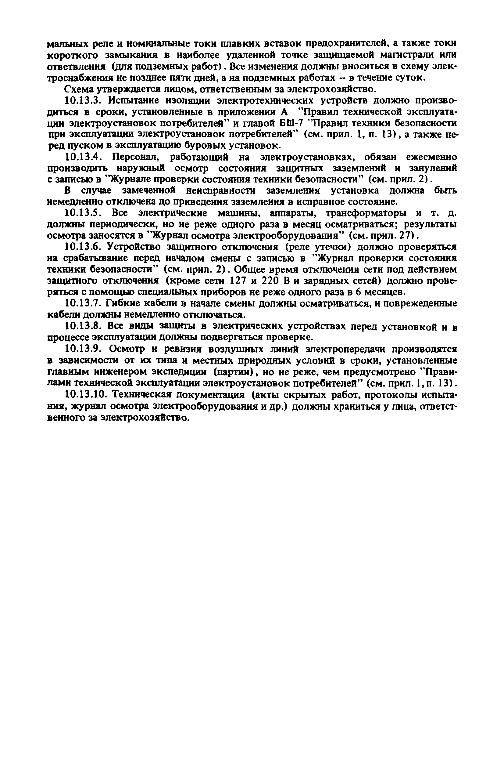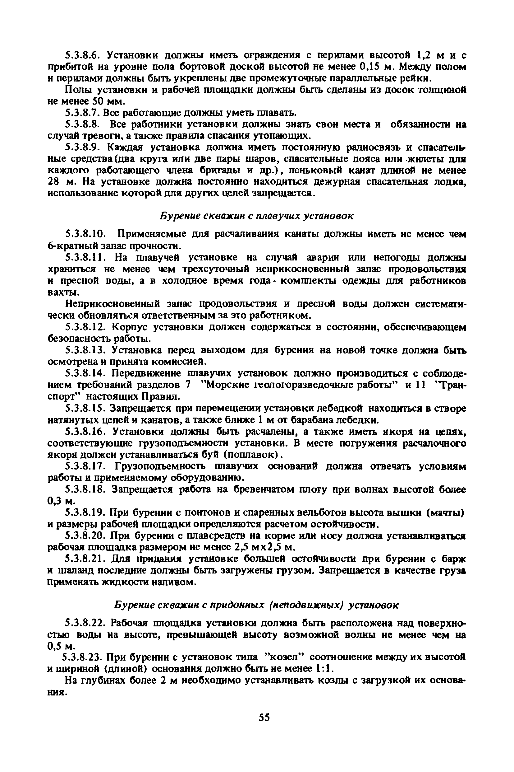 | Оглавление: | Раздел 1. Общие правила Раздел 2. Геологосъемочные и геологопоисковые работы Раздел 3. Геофизические работы Раздел 4. Гидрогеологические и инженерно-геологические работы Раздел 5. Буровые работы Раздел 6. Горноразведочные работы Раздел 7. Морские геологоразведочные работы Раздел 8. Опробовательские работы Раздел 9. Лабораторные работы Раздел 10. Электротехнические работы Раздел 11. Транспорт Раздел 12. Производственная санитария Раздел 13. Ответственность за нарушение правил безопасности Приложение 1. Перечень нормативных документов по охране труда и технике безопасности, обязательных для геологических организации Приложение 2. Журнал проверки состояния техники безопасности Приложение 3. Шкала ветров Приложение 4. Перечень средств техники безопасности и охраны труда для геологосъемочных и геологопоисковых партий и топографо-геодезических бригад Приложение 5. Типовой акт проверки готовности партии (отряда) к выезду на полевые работы Приложение 6. Журнал регистрации маршрутов (переходов) Приложение 7. Акт о приеме буровой установки в эксплуатацию Приложение 8. Акт опрессовки буровых насосов и обвязки буровой установки, смонтированной на скважине Приложение 9. Паспорта крепления и проветривания подземных горноразведочных выработок и инструкции по их составлению Приложение 10. Журнал осмотра крепи и состояния горных выработок Приложение 11. Журнал осмотра подъемной установки Приложение 12. Журнал осмотра подъемных канатов и их расхода Приложение 13. Журнал приемки и сдачи смен машинистами подъемной установки Приложение 14. Журнал осмотра водоотливных установок Приложение 15. Положение о добровольных вспомогательных горноспасательных командах в геологоразведочных организациях, ведущих подземные горные работы Приложение 16. Инструкция по составлению планов ликвидации аварий в разведочных штольнях, шахтах и шурфах с рассечками. Приложение 17. Общие технические требования к гидрометеорологическому обеспечению морских геологоразведочных работ Приложение 18. Шкала состояния моря Приложение 19. Порядок освидетельствования маломерных судов Приложение 20. Минимально допустимые нормы комплектования судовых экипажей маломерных геологоразведочных судов Приложение 21. Табель снабжения маломерных судов Приложение 22. Табель оснащения маломерных плавучих буровых установок (МПБУ) Приложение 23. Выбор массы якорей для маломерных плавучих буровых установок (МГХБУ) Приложение 24. Положение о порядке составления планов предупреждения и ликвидации аварий на маломерных плавучих буровых установках (МПБУ) Приложение 25. Типовая схема окраски маломерных плавучих буровых установок Приложение 26. Журнал осмотра и измерения заземления Приложение 27. Журнал осмотра электрооборудования Приложение 28. Акт проверки готовности скважины к геофизическим работам |