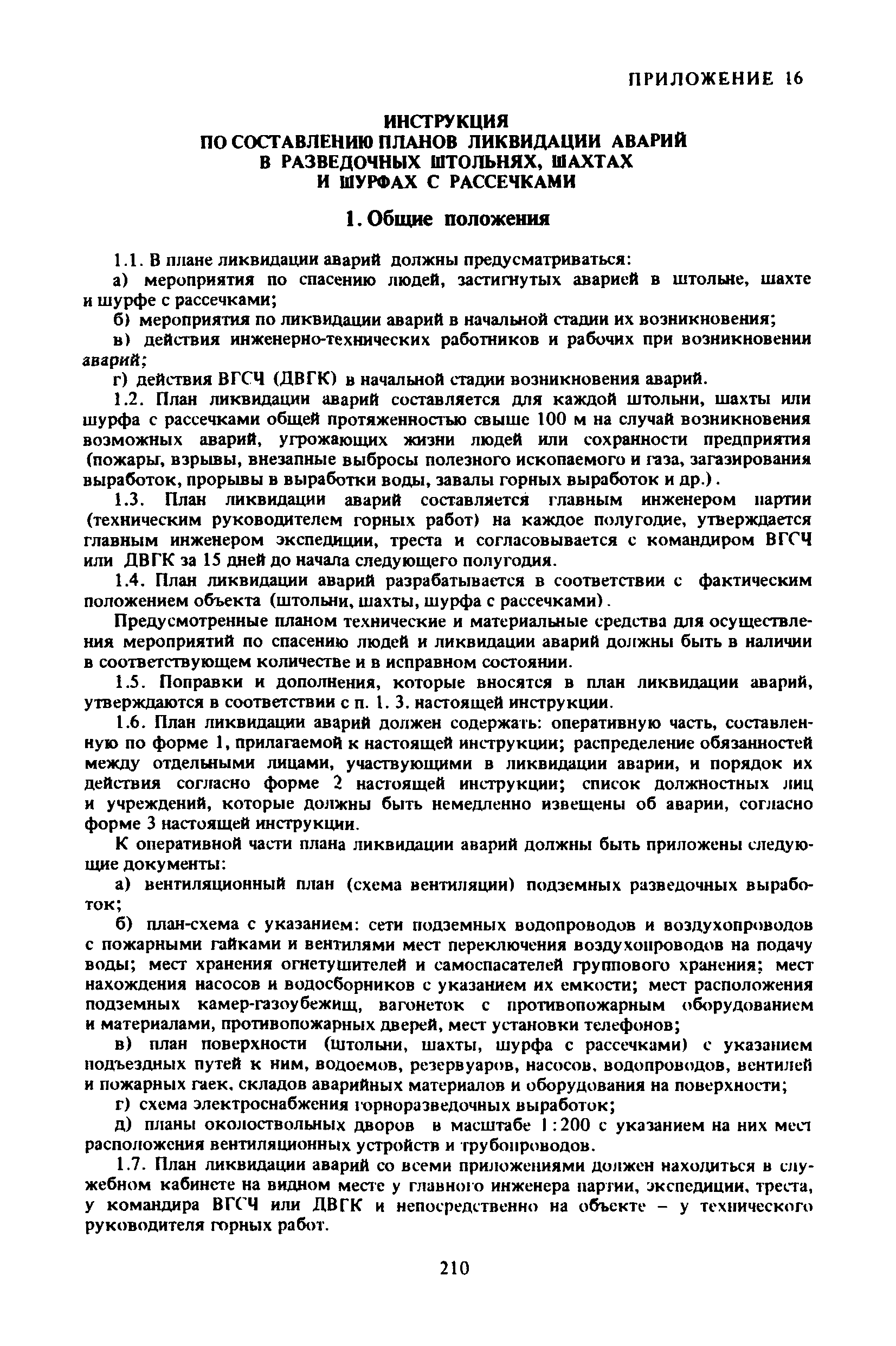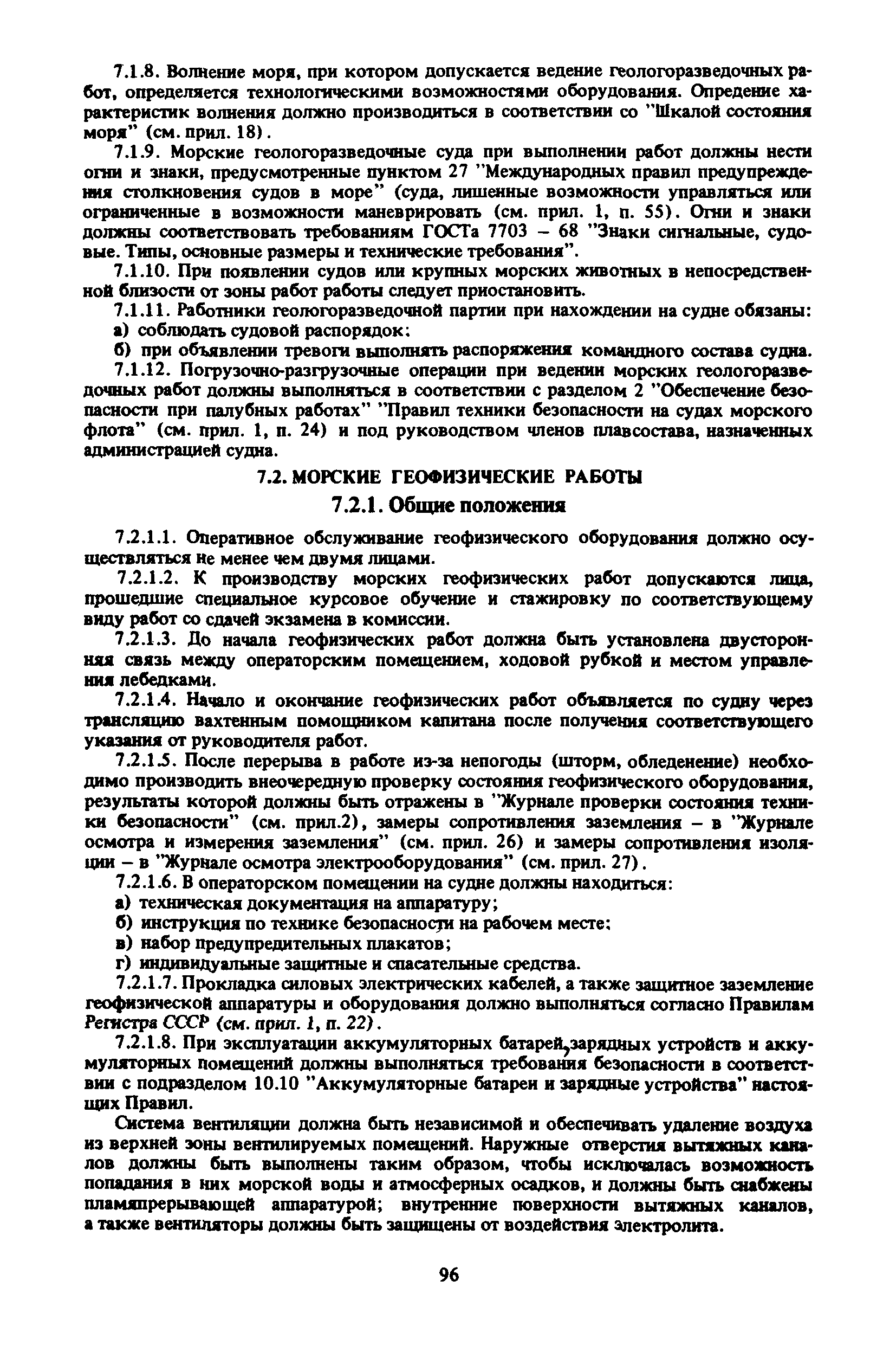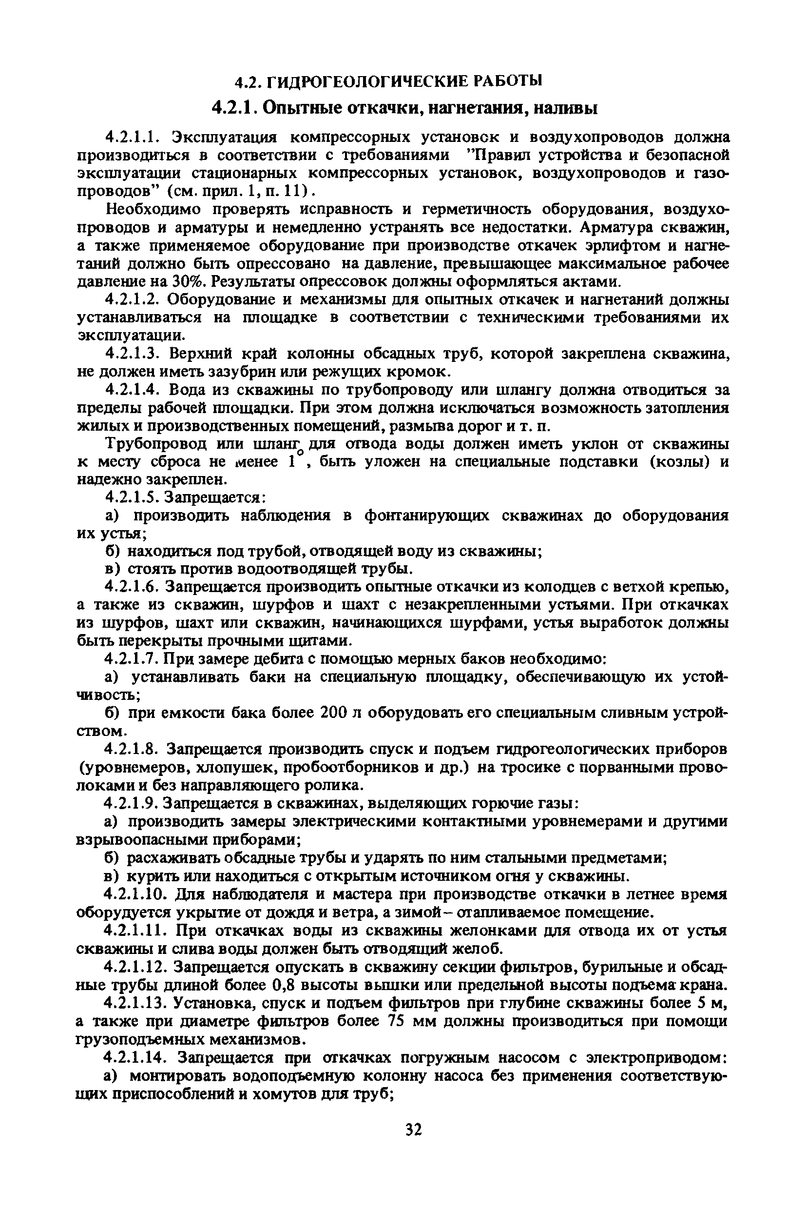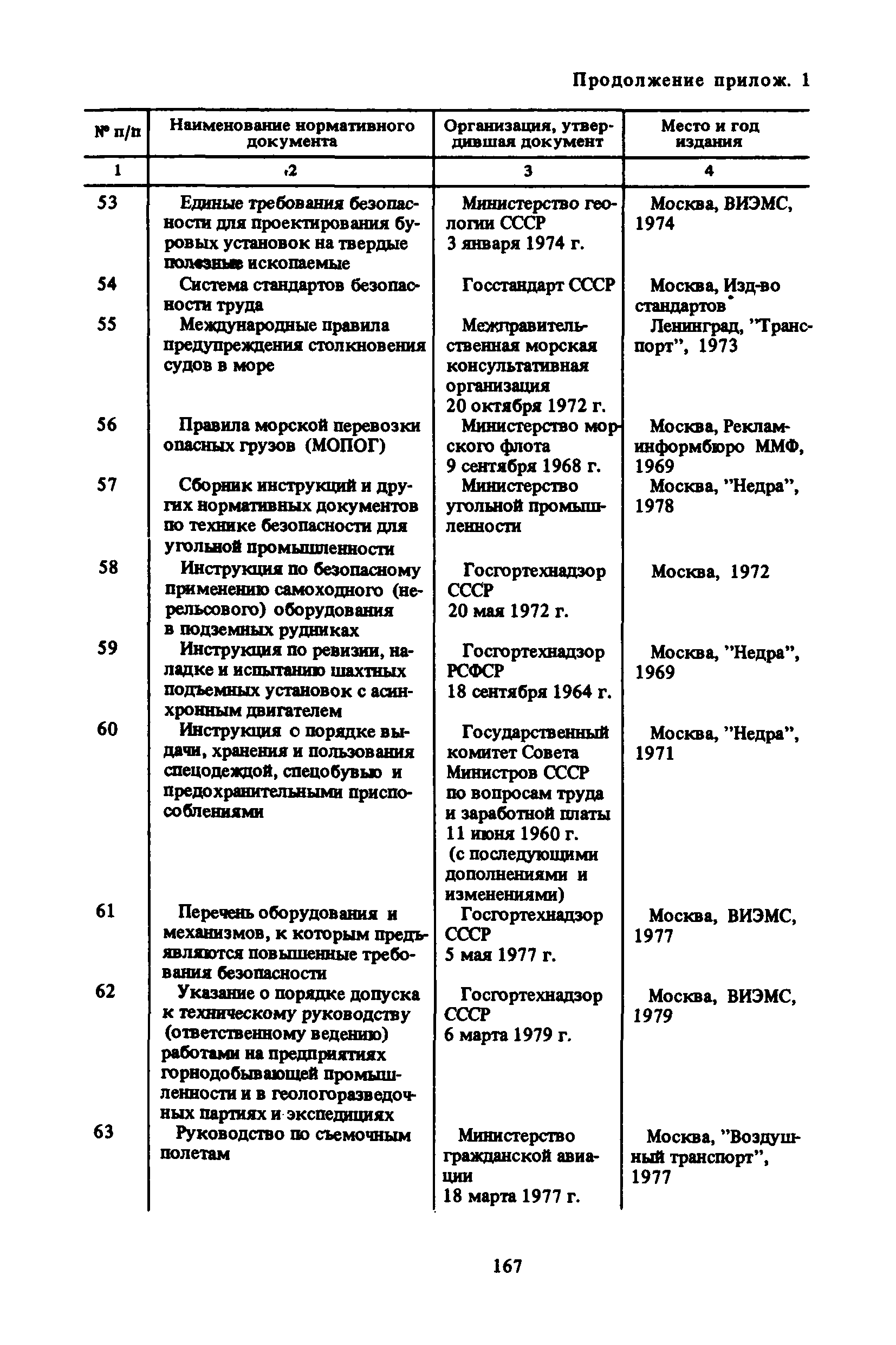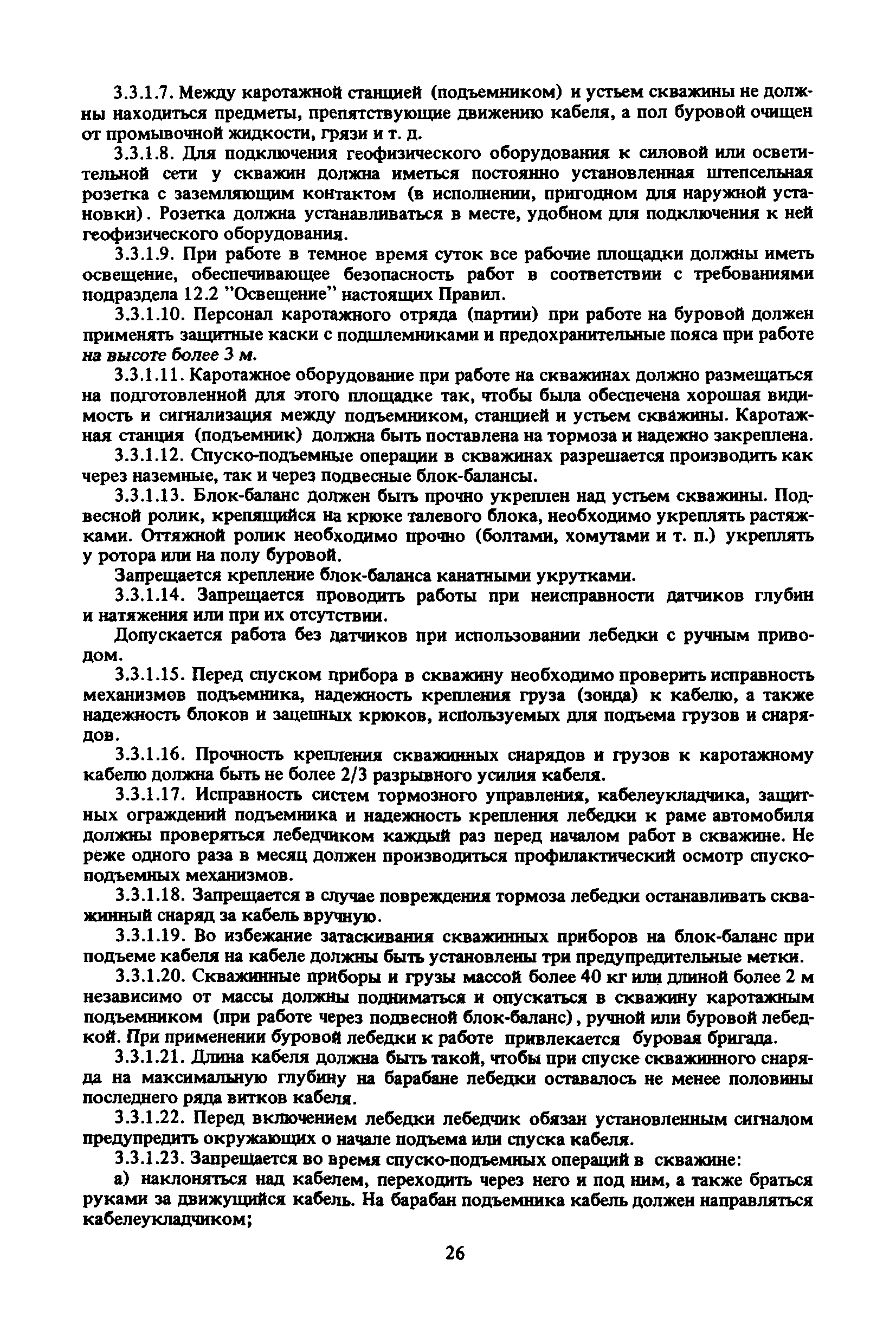 | Оглавление: | Раздел 1. Общие правила Раздел 2. Геологосъемочные и геологопоисковые работы Раздел 3. Геофизические работы Раздел 4. Гидрогеологические и инженерно-геологические работы Раздел 5. Буровые работы Раздел 6. Горноразведочные работы Раздел 7. Морские геологоразведочные работы Раздел 8. Опробовательские работы Раздел 9. Лабораторные работы Раздел 10. Электротехнические работы Раздел 11. Транспорт Раздел 12. Производственная санитария Раздел 13. Ответственность за нарушение правил безопасности Приложение 1. Перечень нормативных документов по охране труда и технике безопасности, обязательных для геологических организации Приложение 2. Журнал проверки состояния техники безопасности Приложение 3. Шкала ветров Приложение 4. Перечень средств техники безопасности и охраны труда для геологосъемочных и геологопоисковых партий и топографо-геодезических бригад Приложение 5. Типовой акт проверки готовности партии (отряда) к выезду на полевые работы Приложение 6. Журнал регистрации маршрутов (переходов) Приложение 7. Акт о приеме буровой установки в эксплуатацию Приложение 8. Акт опрессовки буровых насосов и обвязки буровой установки, смонтированной на скважине Приложение 9. Паспорта крепления и проветривания подземных горноразведочных выработок и инструкции по их составлению Приложение 10. Журнал осмотра крепи и состояния горных выработок Приложение 11. Журнал осмотра подъемной установки Приложение 12. Журнал осмотра подъемных канатов и их расхода Приложение 13. Журнал приемки и сдачи смен машинистами подъемной установки Приложение 14. Журнал осмотра водоотливных установок Приложение 15. Положение о добровольных вспомогательных горноспасательных командах в геологоразведочных организациях, ведущих подземные горные работы Приложение 16. Инструкция по составлению планов ликвидации аварий в разведочных штольнях, шахтах и шурфах с рассечками. Приложение 17. Общие технические требования к гидрометеорологическому обеспечению морских геологоразведочных работ Приложение 18. Шкала состояния моря Приложение 19. Порядок освидетельствования маломерных судов Приложение 20. Минимально допустимые нормы комплектования судовых экипажей маломерных геологоразведочных судов Приложение 21. Табель снабжения маломерных судов Приложение 22. Табель оснащения маломерных плавучих буровых установок (МПБУ) Приложение 23. Выбор массы якорей для маломерных плавучих буровых установок (МГХБУ) Приложение 24. Положение о порядке составления планов предупреждения и ликвидации аварий на маломерных плавучих буровых установках (МПБУ) Приложение 25. Типовая схема окраски маломерных плавучих буровых установок Приложение 26. Журнал осмотра и измерения заземления Приложение 27. Журнал осмотра электрооборудования Приложение 28. Акт проверки готовности скважины к геофизическим работам |