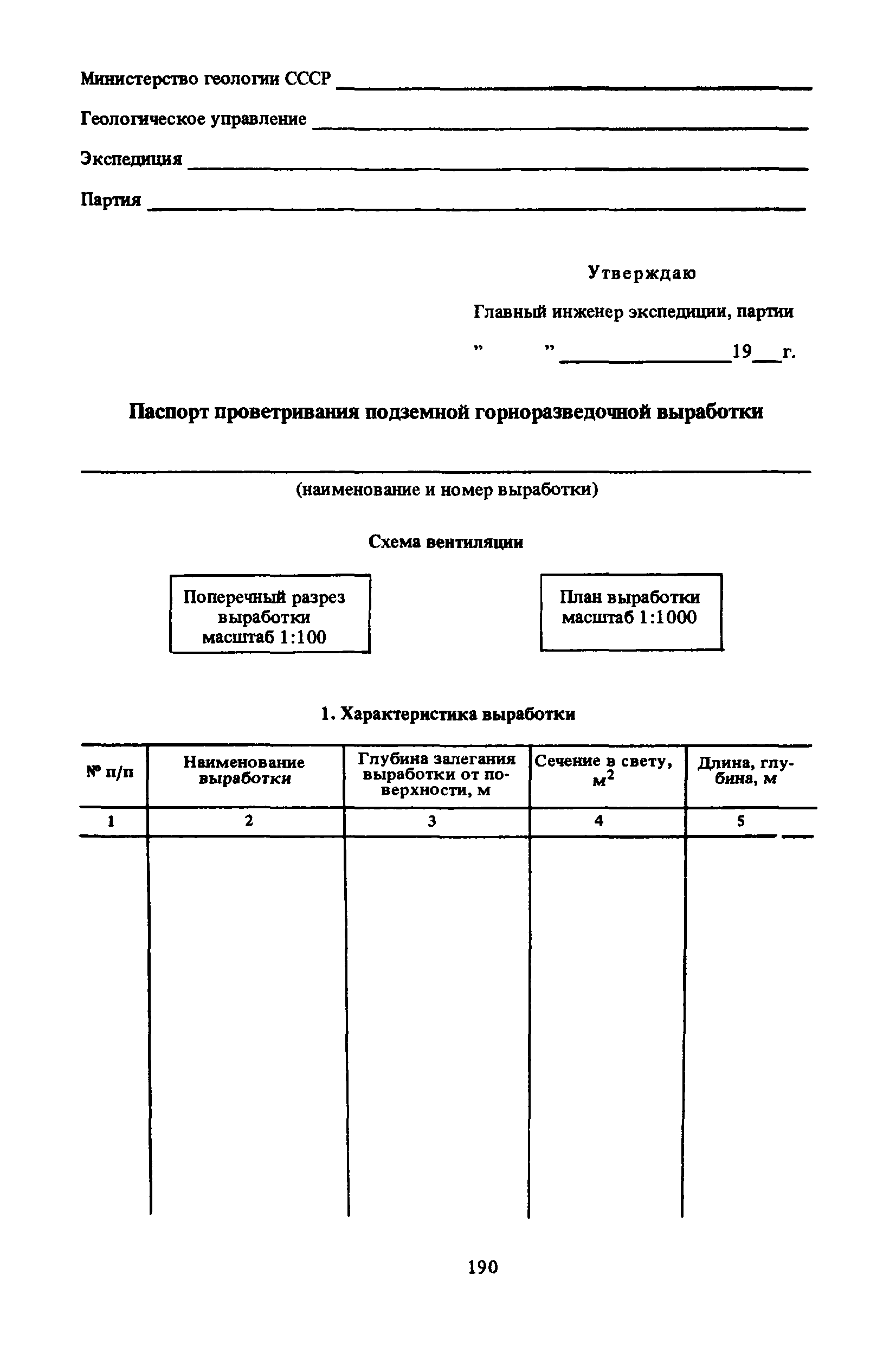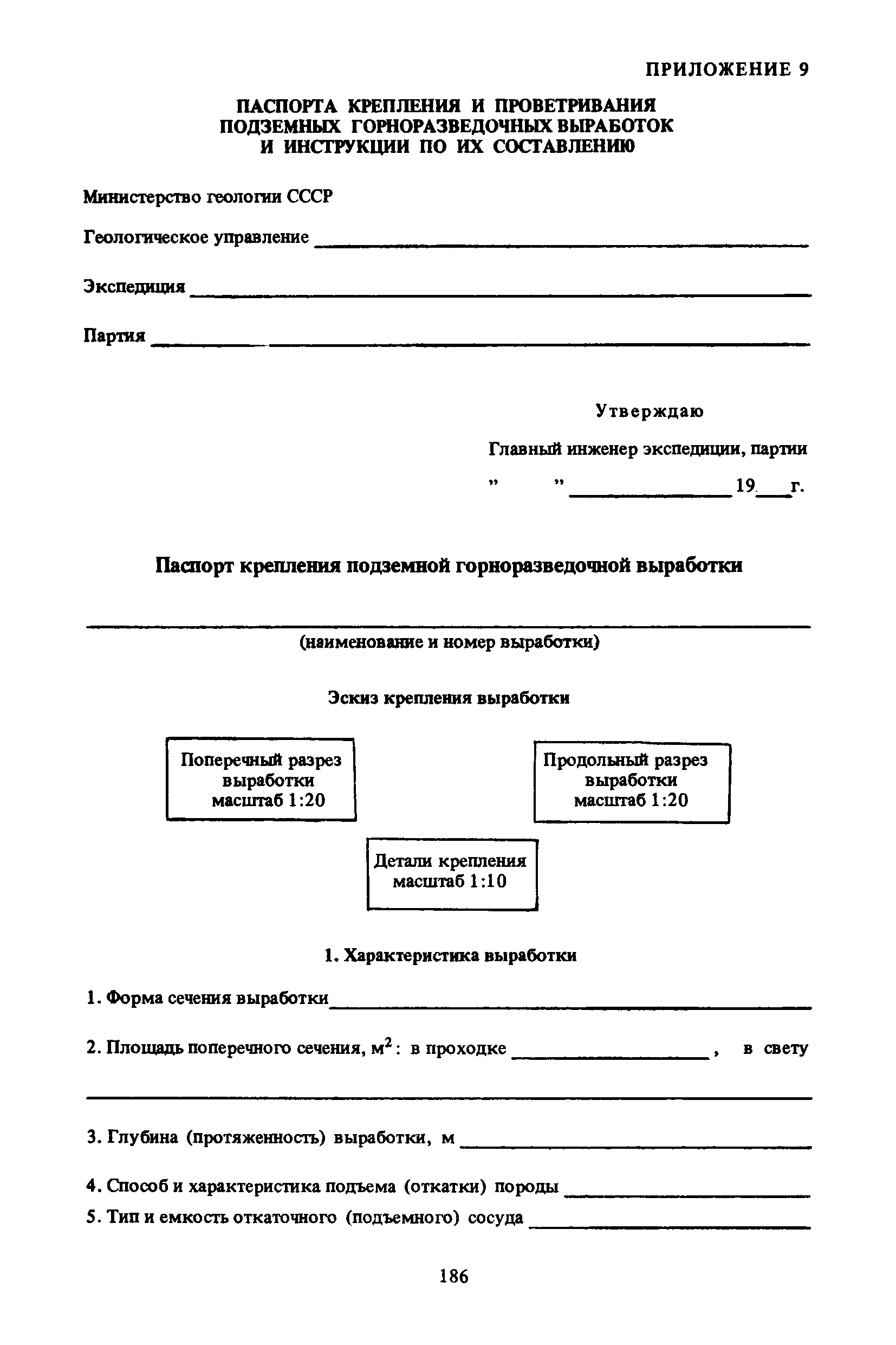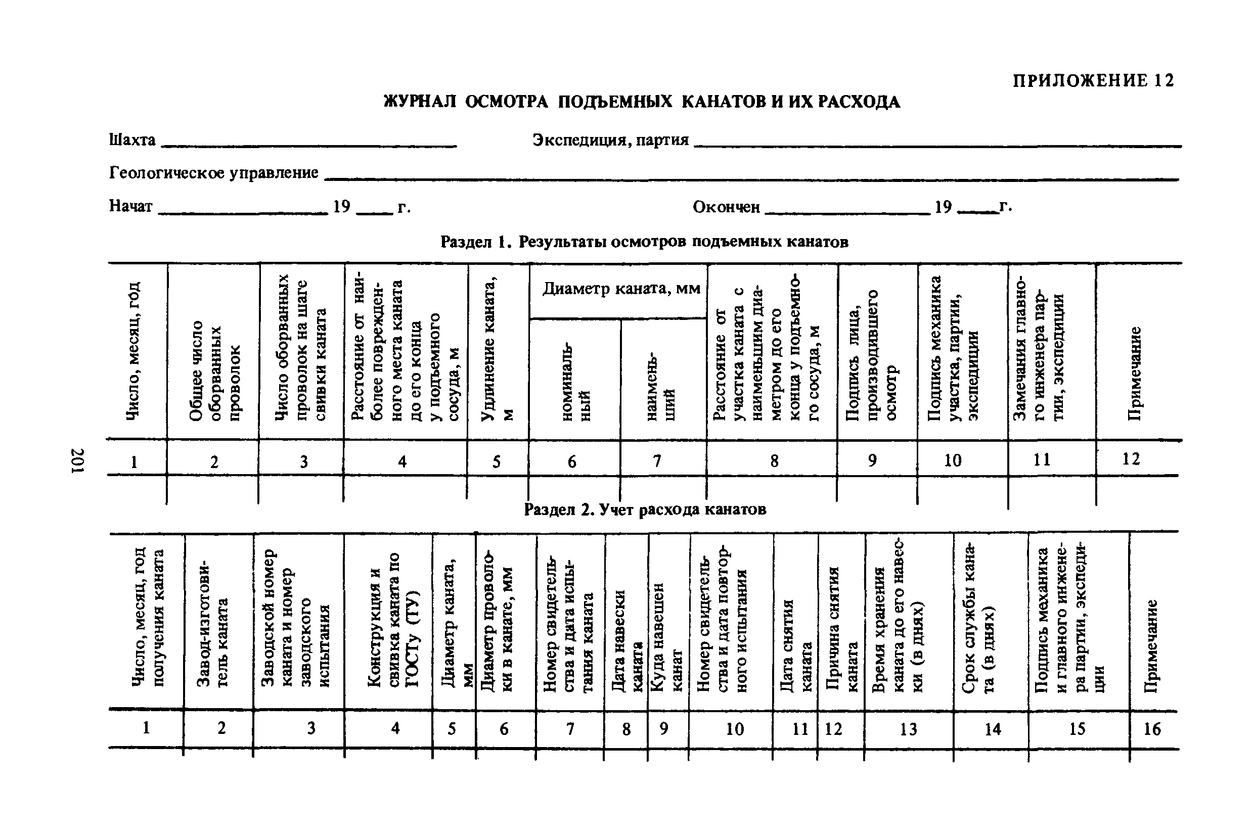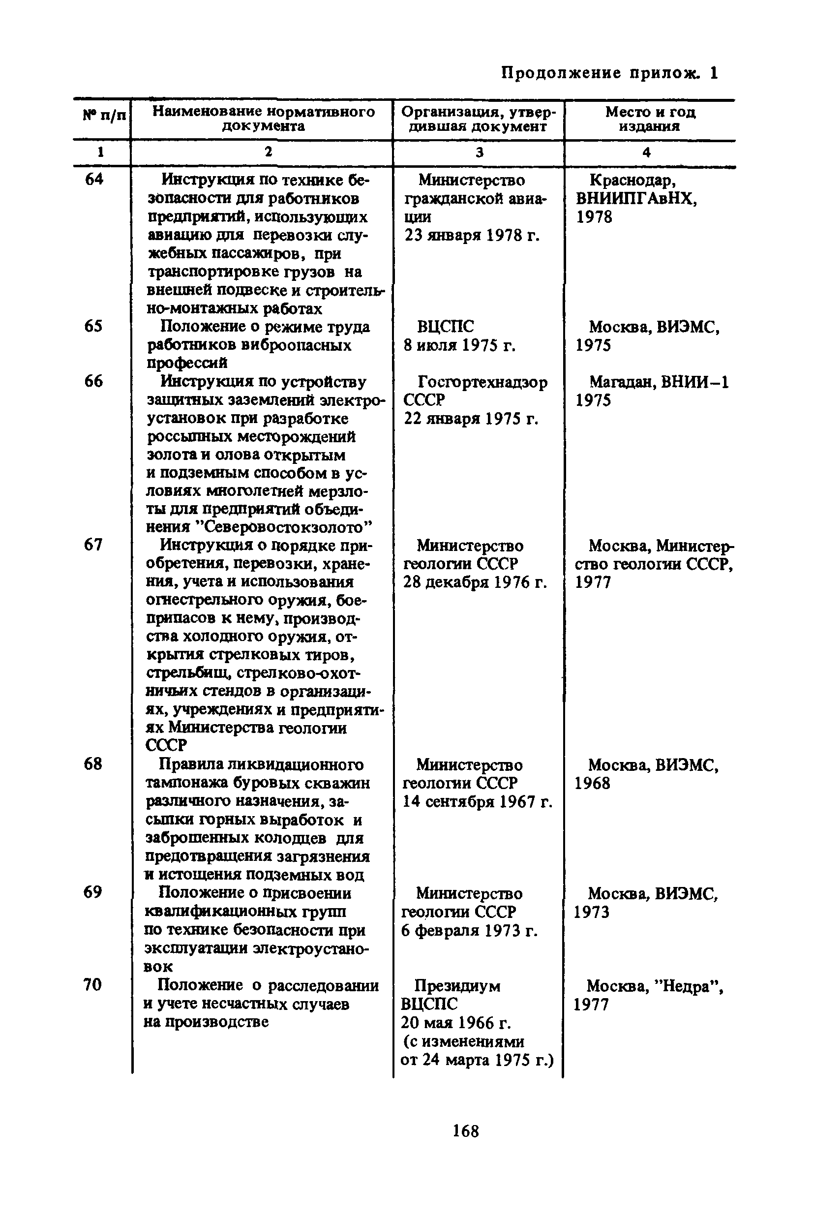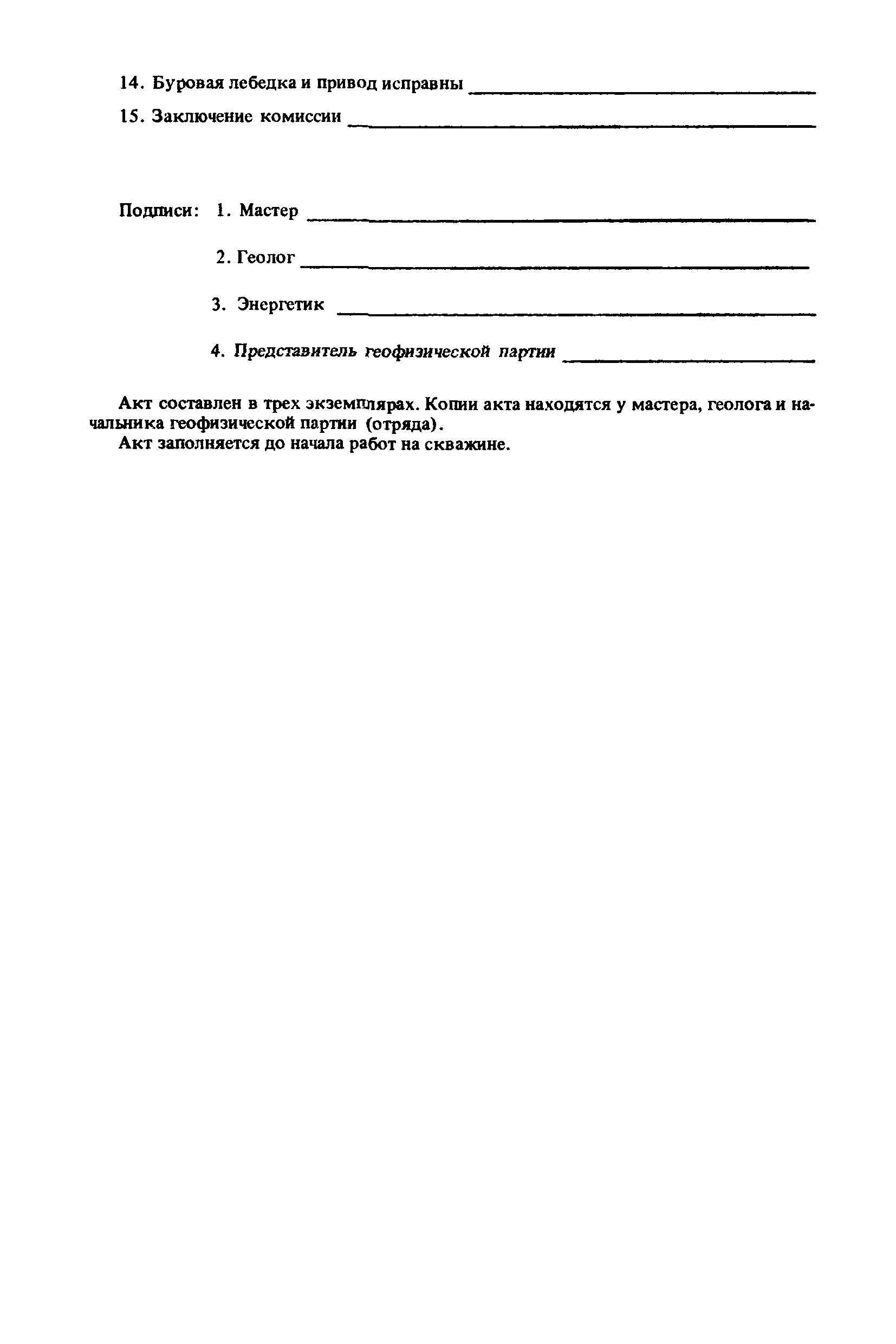 | Оглавление: | Раздел 1. Общие правила Раздел 2. Геологосъемочные и геологопоисковые работы Раздел 3. Геофизические работы Раздел 4. Гидрогеологические и инженерно-геологические работы Раздел 5. Буровые работы Раздел 6. Горноразведочные работы Раздел 7. Морские геологоразведочные работы Раздел 8. Опробовательские работы Раздел 9. Лабораторные работы Раздел 10. Электротехнические работы Раздел 11. Транспорт Раздел 12. Производственная санитария Раздел 13. Ответственность за нарушение правил безопасности Приложение 1. Перечень нормативных документов по охране труда и технике безопасности, обязательных для геологических организации Приложение 2. Журнал проверки состояния техники безопасности Приложение 3. Шкала ветров Приложение 4. Перечень средств техники безопасности и охраны труда для геологосъемочных и геологопоисковых партий и топографо-геодезических бригад Приложение 5. Типовой акт проверки готовности партии (отряда) к выезду на полевые работы Приложение 6. Журнал регистрации маршрутов (переходов) Приложение 7. Акт о приеме буровой установки в эксплуатацию Приложение 8. Акт опрессовки буровых насосов и обвязки буровой установки, смонтированной на скважине Приложение 9. Паспорта крепления и проветривания подземных горноразведочных выработок и инструкции по их составлению Приложение 10. Журнал осмотра крепи и состояния горных выработок Приложение 11. Журнал осмотра подъемной установки Приложение 12. Журнал осмотра подъемных канатов и их расхода Приложение 13. Журнал приемки и сдачи смен машинистами подъемной установки Приложение 14. Журнал осмотра водоотливных установок Приложение 15. Положение о добровольных вспомогательных горноспасательных командах в геологоразведочных организациях, ведущих подземные горные работы Приложение 16. Инструкция по составлению планов ликвидации аварий в разведочных штольнях, шахтах и шурфах с рассечками. Приложение 17. Общие технические требования к гидрометеорологическому обеспечению морских геологоразведочных работ Приложение 18. Шкала состояния моря Приложение 19. Порядок освидетельствования маломерных судов Приложение 20. Минимально допустимые нормы комплектования судовых экипажей маломерных геологоразведочных судов Приложение 21. Табель снабжения маломерных судов Приложение 22. Табель оснащения маломерных плавучих буровых установок (МПБУ) Приложение 23. Выбор массы якорей для маломерных плавучих буровых установок (МГХБУ) Приложение 24. Положение о порядке составления планов предупреждения и ликвидации аварий на маломерных плавучих буровых установках (МПБУ) Приложение 25. Типовая схема окраски маломерных плавучих буровых установок Приложение 26. Журнал осмотра и измерения заземления Приложение 27. Журнал осмотра электрооборудования Приложение 28. Акт проверки готовности скважины к геофизическим работам |