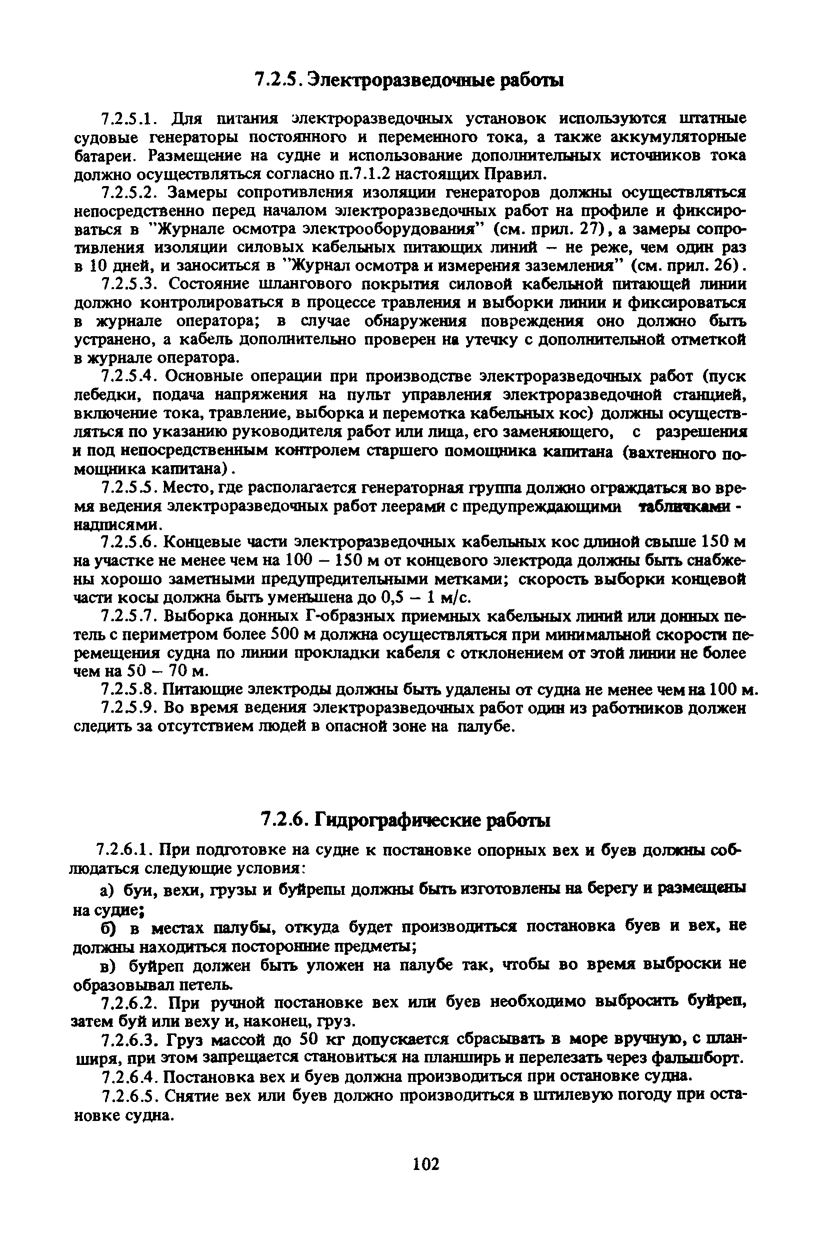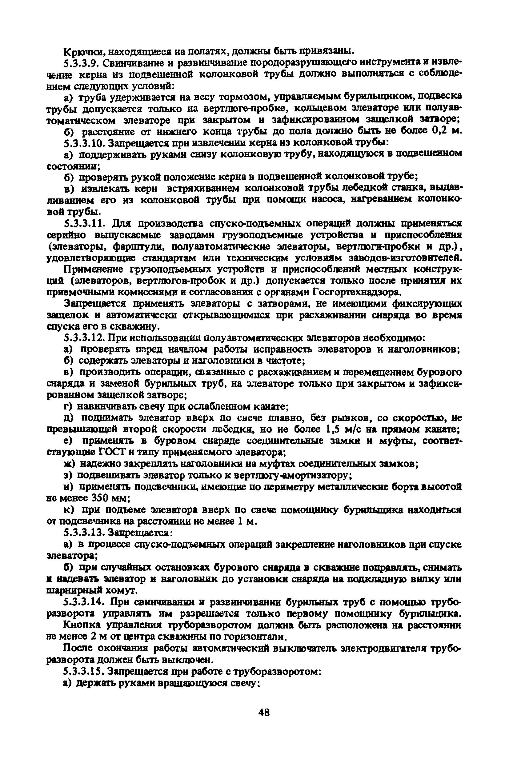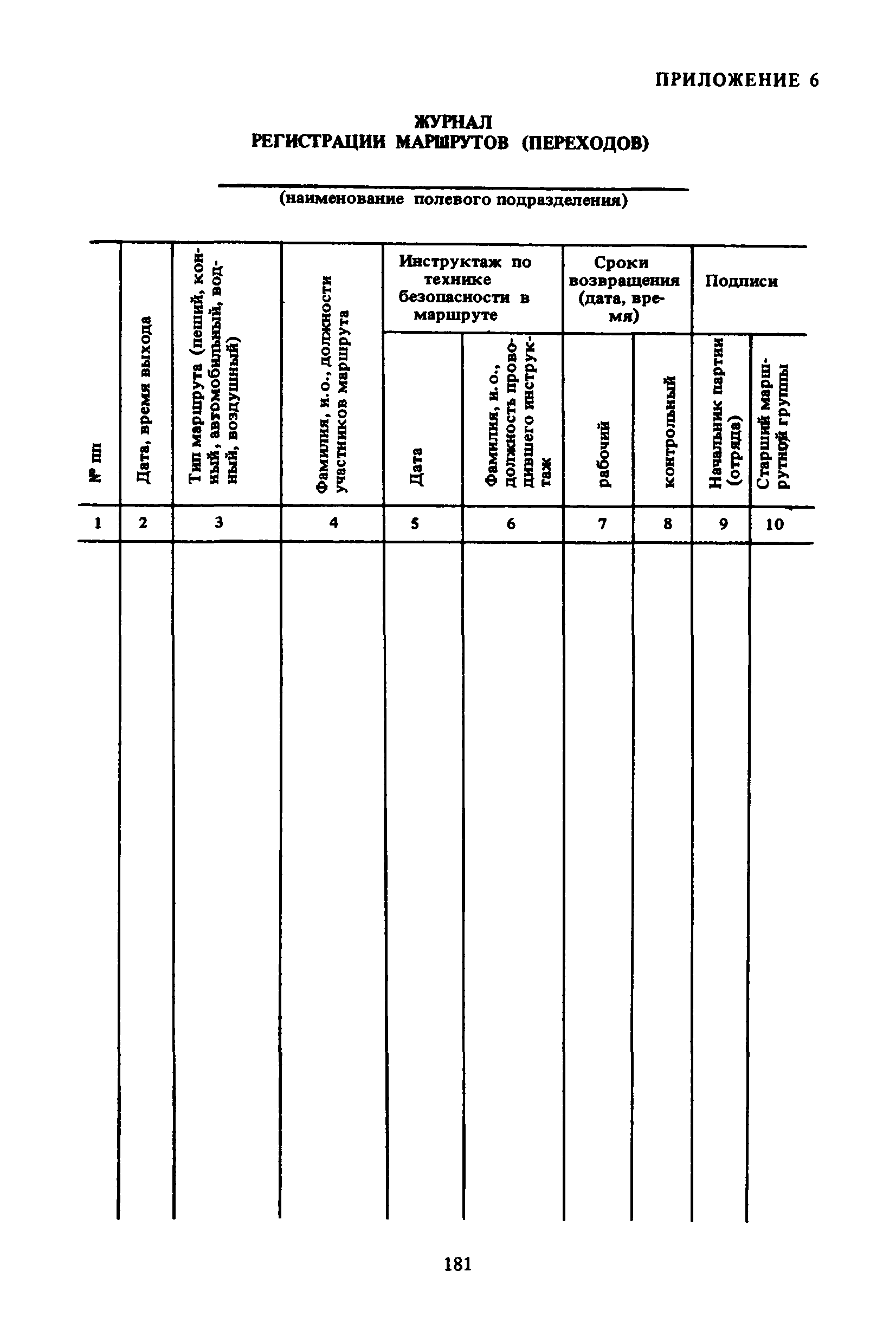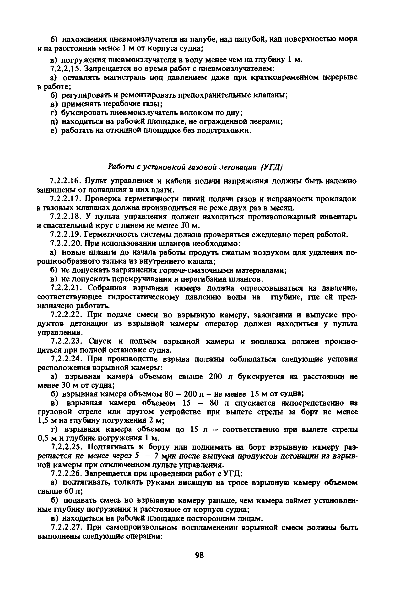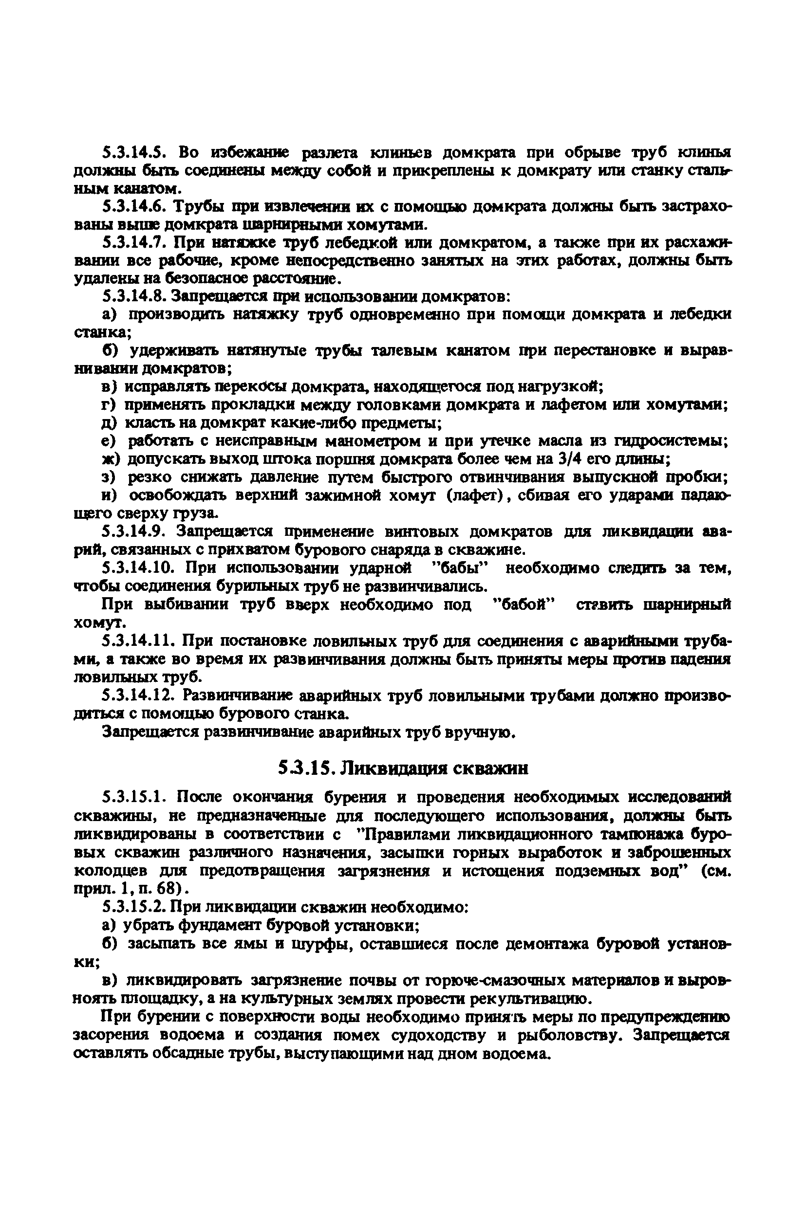 | Оглавление: | Раздел 1. Общие правила Раздел 2. Геологосъемочные и геологопоисковые работы Раздел 3. Геофизические работы Раздел 4. Гидрогеологические и инженерно-геологические работы Раздел 5. Буровые работы Раздел 6. Горноразведочные работы Раздел 7. Морские геологоразведочные работы Раздел 8. Опробовательские работы Раздел 9. Лабораторные работы Раздел 10. Электротехнические работы Раздел 11. Транспорт Раздел 12. Производственная санитария Раздел 13. Ответственность за нарушение правил безопасности Приложение 1. Перечень нормативных документов по охране труда и технике безопасности, обязательных для геологических организации Приложение 2. Журнал проверки состояния техники безопасности Приложение 3. Шкала ветров Приложение 4. Перечень средств техники безопасности и охраны труда для геологосъемочных и геологопоисковых партий и топографо-геодезических бригад Приложение 5. Типовой акт проверки готовности партии (отряда) к выезду на полевые работы Приложение 6. Журнал регистрации маршрутов (переходов) Приложение 7. Акт о приеме буровой установки в эксплуатацию Приложение 8. Акт опрессовки буровых насосов и обвязки буровой установки, смонтированной на скважине Приложение 9. Паспорта крепления и проветривания подземных горноразведочных выработок и инструкции по их составлению Приложение 10. Журнал осмотра крепи и состояния горных выработок Приложение 11. Журнал осмотра подъемной установки Приложение 12. Журнал осмотра подъемных канатов и их расхода Приложение 13. Журнал приемки и сдачи смен машинистами подъемной установки Приложение 14. Журнал осмотра водоотливных установок Приложение 15. Положение о добровольных вспомогательных горноспасательных командах в геологоразведочных организациях, ведущих подземные горные работы Приложение 16. Инструкция по составлению планов ликвидации аварий в разведочных штольнях, шахтах и шурфах с рассечками. Приложение 17. Общие технические требования к гидрометеорологическому обеспечению морских геологоразведочных работ Приложение 18. Шкала состояния моря Приложение 19. Порядок освидетельствования маломерных судов Приложение 20. Минимально допустимые нормы комплектования судовых экипажей маломерных геологоразведочных судов Приложение 21. Табель снабжения маломерных судов Приложение 22. Табель оснащения маломерных плавучих буровых установок (МПБУ) Приложение 23. Выбор массы якорей для маломерных плавучих буровых установок (МГХБУ) Приложение 24. Положение о порядке составления планов предупреждения и ликвидации аварий на маломерных плавучих буровых установках (МПБУ) Приложение 25. Типовая схема окраски маломерных плавучих буровых установок Приложение 26. Журнал осмотра и измерения заземления Приложение 27. Журнал осмотра электрооборудования Приложение 28. Акт проверки готовности скважины к геофизическим работам |