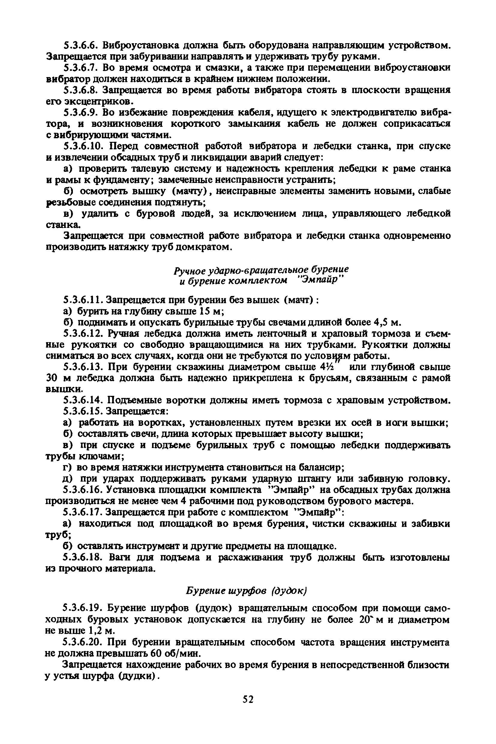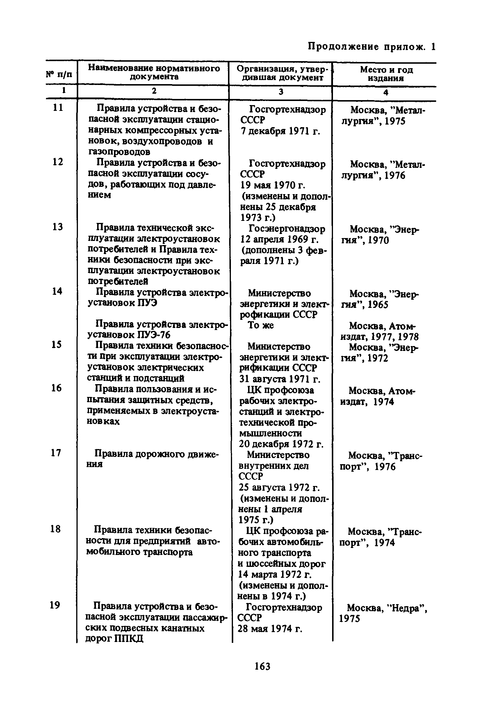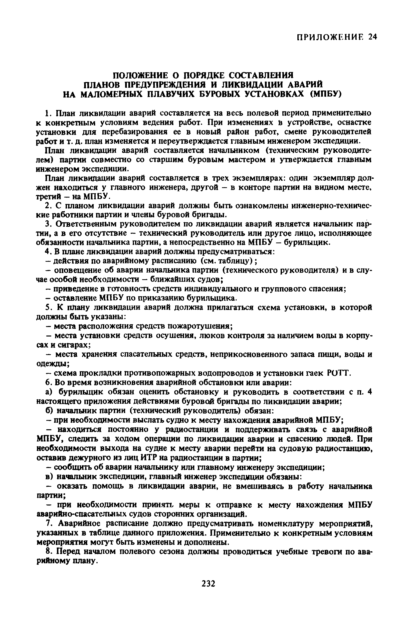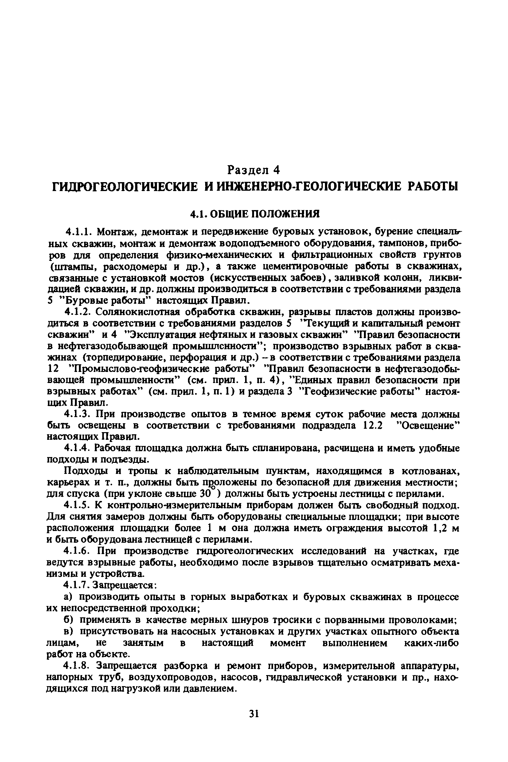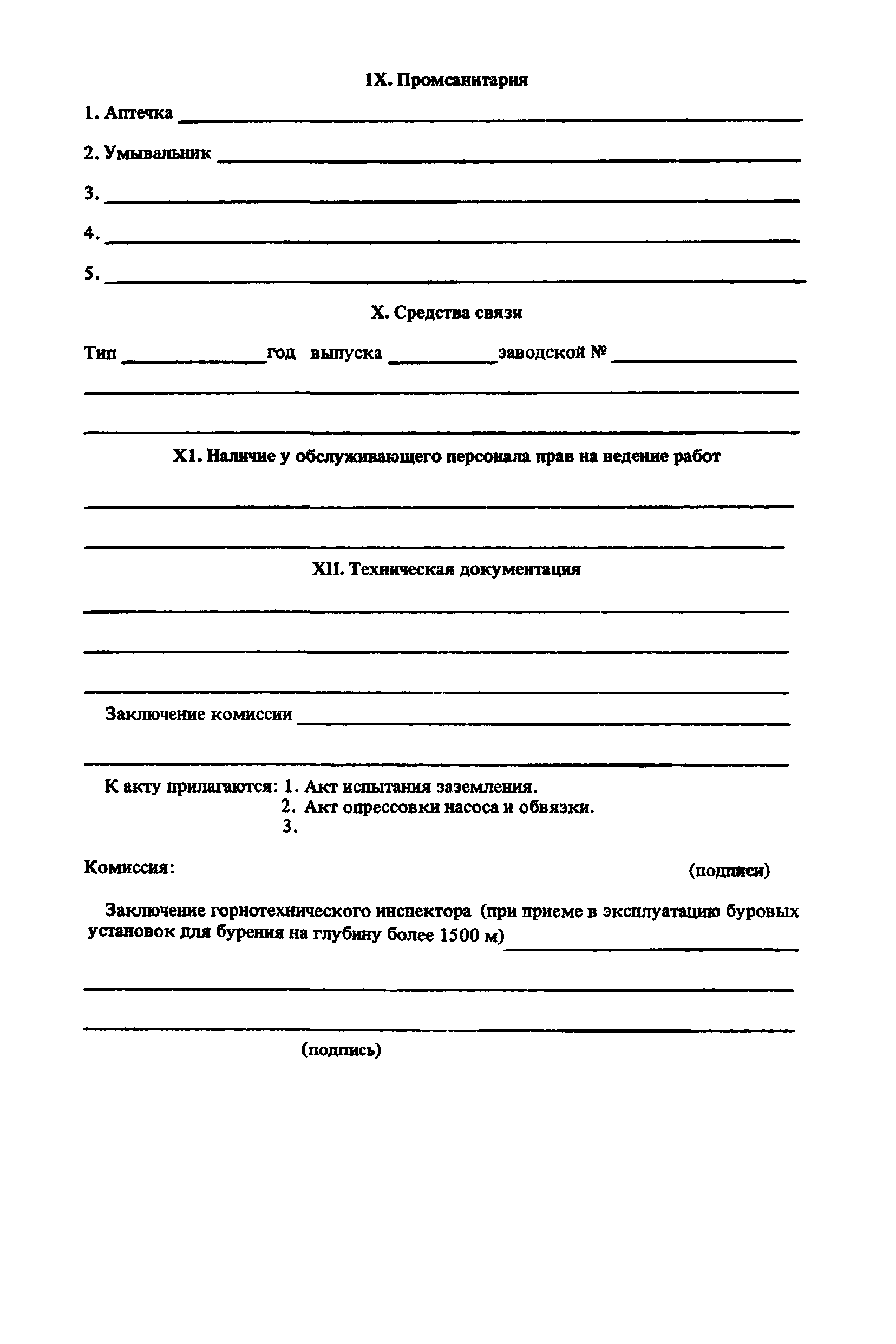| Оглавление: | Раздел 1. Общие правила Раздел 2. Геологосъемочные и геологопоисковые работы Раздел 3. Геофизические работы Раздел 4. Гидрогеологические и инженерно-геологические работы Раздел 5. Буровые работы Раздел 6. Горноразведочные работы Раздел 7. Морские геологоразведочные работы Раздел 8. Опробовательские работы Раздел 9. Лабораторные работы Раздел 10. Электротехнические работы Раздел 11. Транспорт Раздел 12. Производственная санитария Раздел 13. Ответственность за нарушение правил безопасности Приложение 1. Перечень нормативных документов по охране труда и технике безопасности, обязательных для геологических организации Приложение 2. Журнал проверки состояния техники безопасности Приложение 3. Шкала ветров Приложение 4. Перечень средств техники безопасности и охраны труда для геологосъемочных и геологопоисковых партий и топографо-геодезических бригад Приложение 5. Типовой акт проверки готовности партии (отряда) к выезду на полевые работы Приложение 6. Журнал регистрации маршрутов (переходов) Приложение 7. Акт о приеме буровой установки в эксплуатацию Приложение 8. Акт опрессовки буровых насосов и обвязки буровой установки, смонтированной на скважине Приложение 9. Паспорта крепления и проветривания подземных горноразведочных выработок и инструкции по их составлению Приложение 10. Журнал осмотра крепи и состояния горных выработок Приложение 11. Журнал осмотра подъемной установки Приложение 12. Журнал осмотра подъемных канатов и их расхода Приложение 13. Журнал приемки и сдачи смен машинистами подъемной установки Приложение 14. Журнал осмотра водоотливных установок Приложение 15. Положение о добровольных вспомогательных горноспасательных командах в геологоразведочных организациях, ведущих подземные горные работы Приложение 16. Инструкция по составлению планов ликвидации аварий в разведочных штольнях, шахтах и шурфах с рассечками. Приложение 17. Общие технические требования к гидрометеорологическому обеспечению морских геологоразведочных работ Приложение 18. Шкала состояния моря Приложение 19. Порядок освидетельствования маломерных судов Приложение 20. Минимально допустимые нормы комплектования судовых экипажей маломерных геологоразведочных судов Приложение 21. Табель снабжения маломерных судов Приложение 22. Табель оснащения маломерных плавучих буровых установок (МПБУ) Приложение 23. Выбор массы якорей для маломерных плавучих буровых установок (МГХБУ) Приложение 24. Положение о порядке составления планов предупреждения и ликвидации аварий на маломерных плавучих буровых установках (МПБУ) Приложение 25. Типовая схема окраски маломерных плавучих буровых установок Приложение 26. Журнал осмотра и измерения заземления Приложение 27. Журнал осмотра электрооборудования Приложение 28. Акт проверки готовности скважины к геофизическим работам |