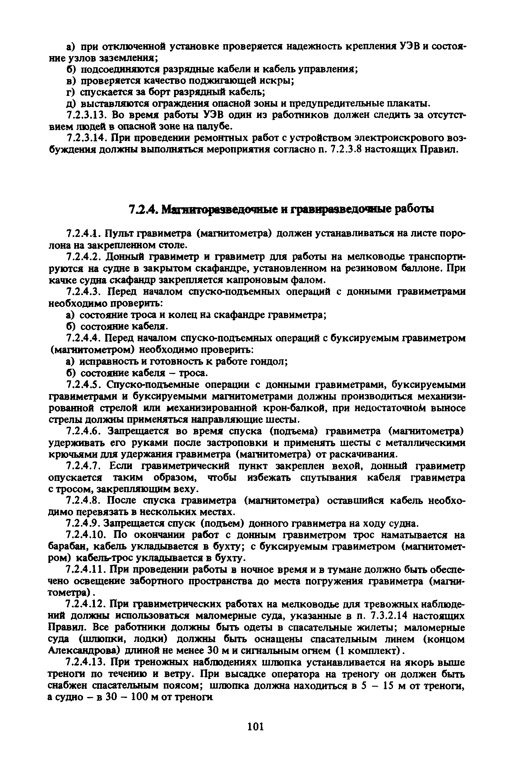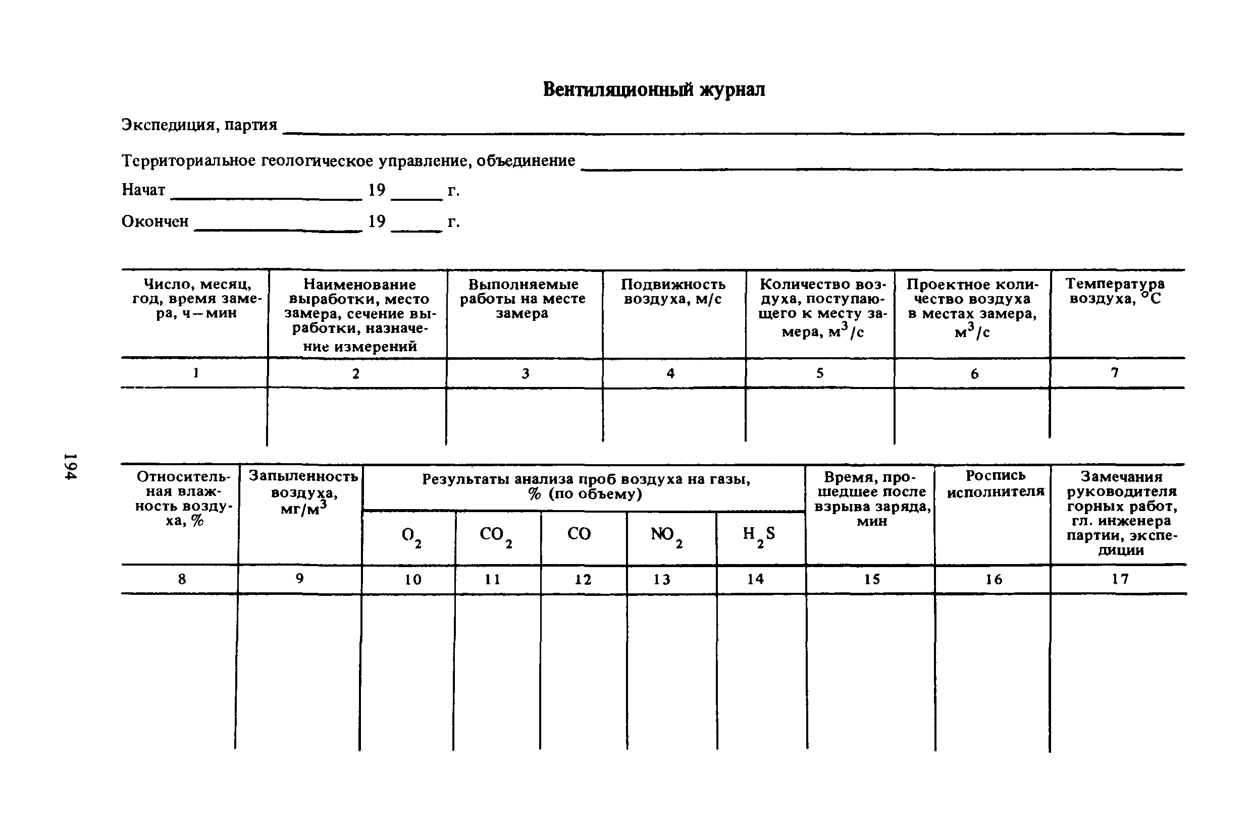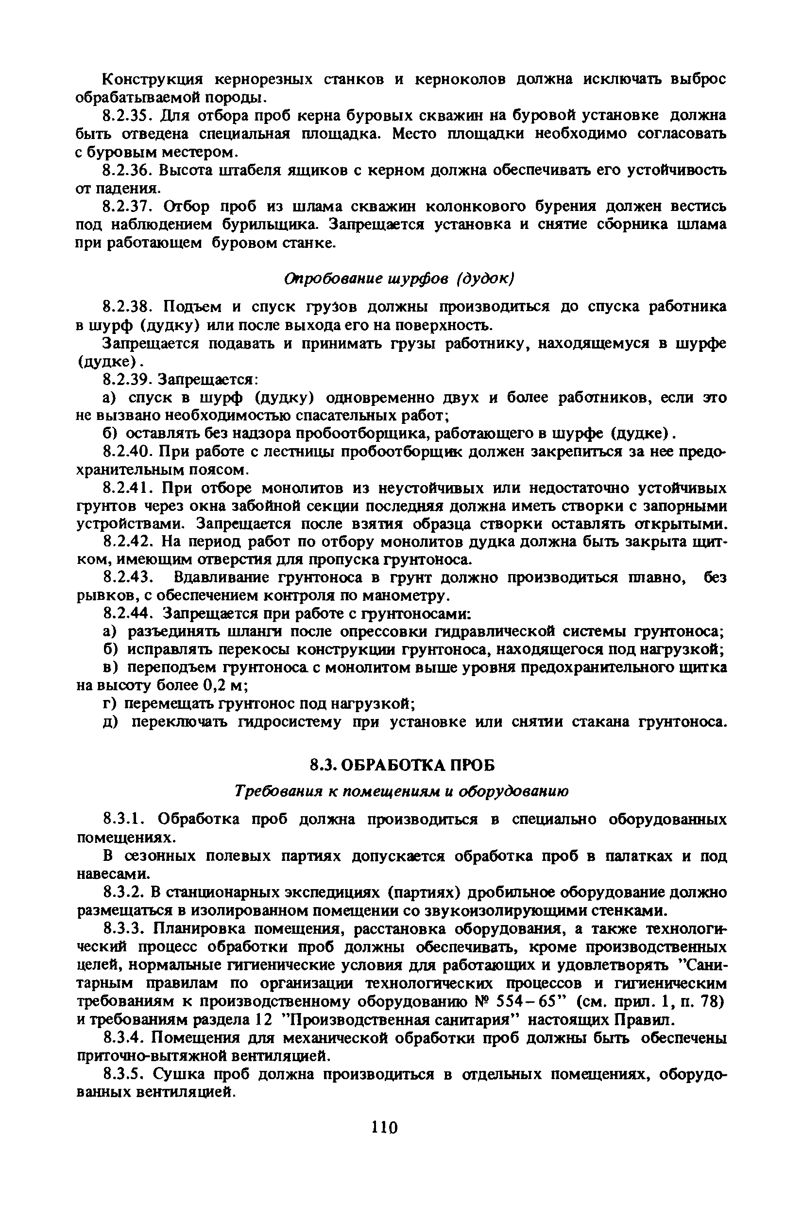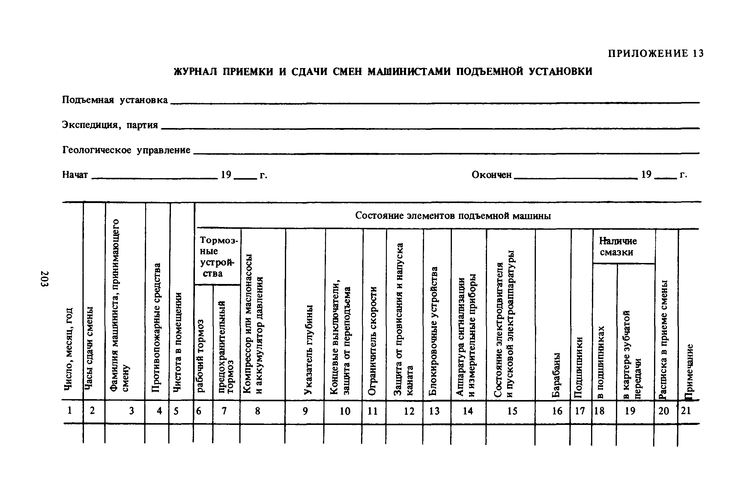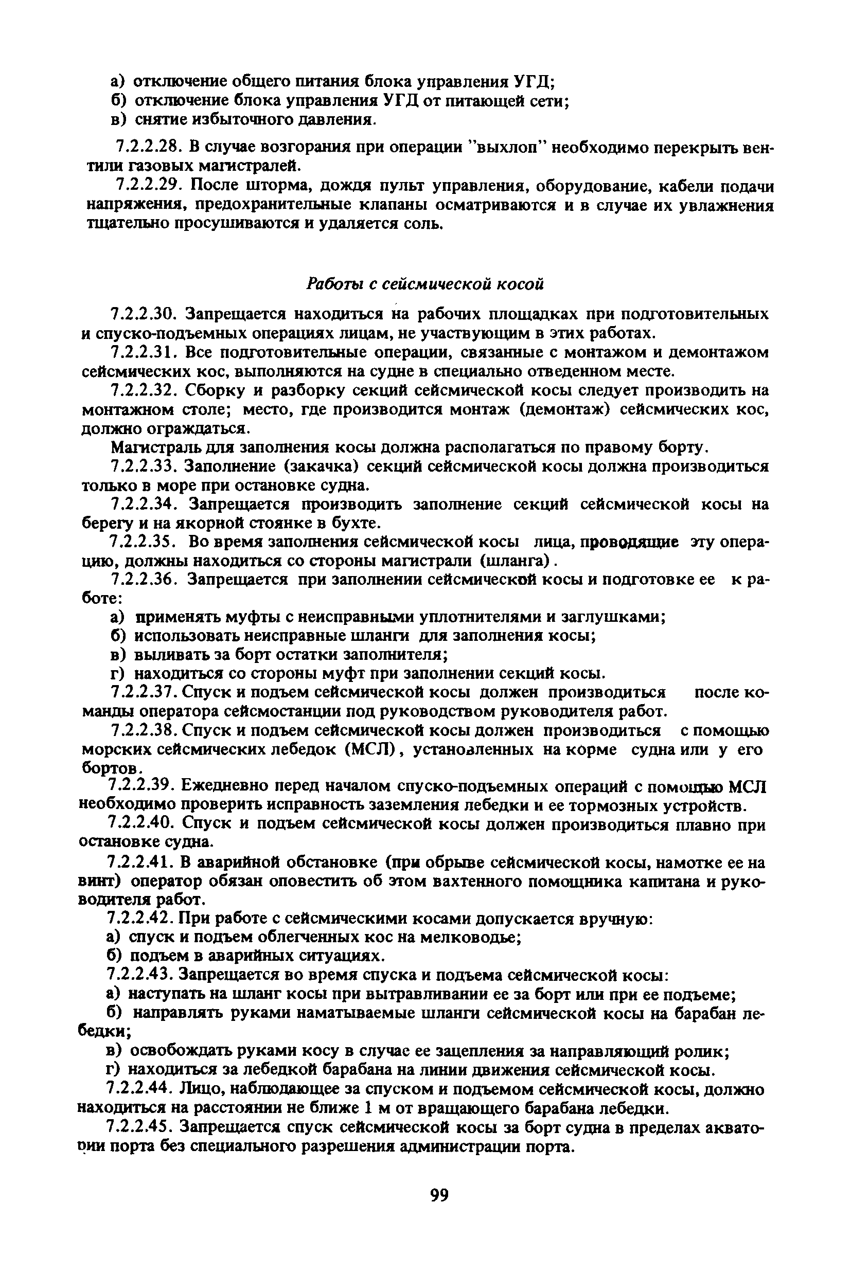 | Оглавление: | Раздел 1. Общие правила Раздел 2. Геологосъемочные и геологопоисковые работы Раздел 3. Геофизические работы Раздел 4. Гидрогеологические и инженерно-геологические работы Раздел 5. Буровые работы Раздел 6. Горноразведочные работы Раздел 7. Морские геологоразведочные работы Раздел 8. Опробовательские работы Раздел 9. Лабораторные работы Раздел 10. Электротехнические работы Раздел 11. Транспорт Раздел 12. Производственная санитария Раздел 13. Ответственность за нарушение правил безопасности Приложение 1. Перечень нормативных документов по охране труда и технике безопасности, обязательных для геологических организации Приложение 2. Журнал проверки состояния техники безопасности Приложение 3. Шкала ветров Приложение 4. Перечень средств техники безопасности и охраны труда для геологосъемочных и геологопоисковых партий и топографо-геодезических бригад Приложение 5. Типовой акт проверки готовности партии (отряда) к выезду на полевые работы Приложение 6. Журнал регистрации маршрутов (переходов) Приложение 7. Акт о приеме буровой установки в эксплуатацию Приложение 8. Акт опрессовки буровых насосов и обвязки буровой установки, смонтированной на скважине Приложение 9. Паспорта крепления и проветривания подземных горноразведочных выработок и инструкции по их составлению Приложение 10. Журнал осмотра крепи и состояния горных выработок Приложение 11. Журнал осмотра подъемной установки Приложение 12. Журнал осмотра подъемных канатов и их расхода Приложение 13. Журнал приемки и сдачи смен машинистами подъемной установки Приложение 14. Журнал осмотра водоотливных установок Приложение 15. Положение о добровольных вспомогательных горноспасательных командах в геологоразведочных организациях, ведущих подземные горные работы Приложение 16. Инструкция по составлению планов ликвидации аварий в разведочных штольнях, шахтах и шурфах с рассечками. Приложение 17. Общие технические требования к гидрометеорологическому обеспечению морских геологоразведочных работ Приложение 18. Шкала состояния моря Приложение 19. Порядок освидетельствования маломерных судов Приложение 20. Минимально допустимые нормы комплектования судовых экипажей маломерных геологоразведочных судов Приложение 21. Табель снабжения маломерных судов Приложение 22. Табель оснащения маломерных плавучих буровых установок (МПБУ) Приложение 23. Выбор массы якорей для маломерных плавучих буровых установок (МГХБУ) Приложение 24. Положение о порядке составления планов предупреждения и ликвидации аварий на маломерных плавучих буровых установках (МПБУ) Приложение 25. Типовая схема окраски маломерных плавучих буровых установок Приложение 26. Журнал осмотра и измерения заземления Приложение 27. Журнал осмотра электрооборудования Приложение 28. Акт проверки готовности скважины к геофизическим работам |