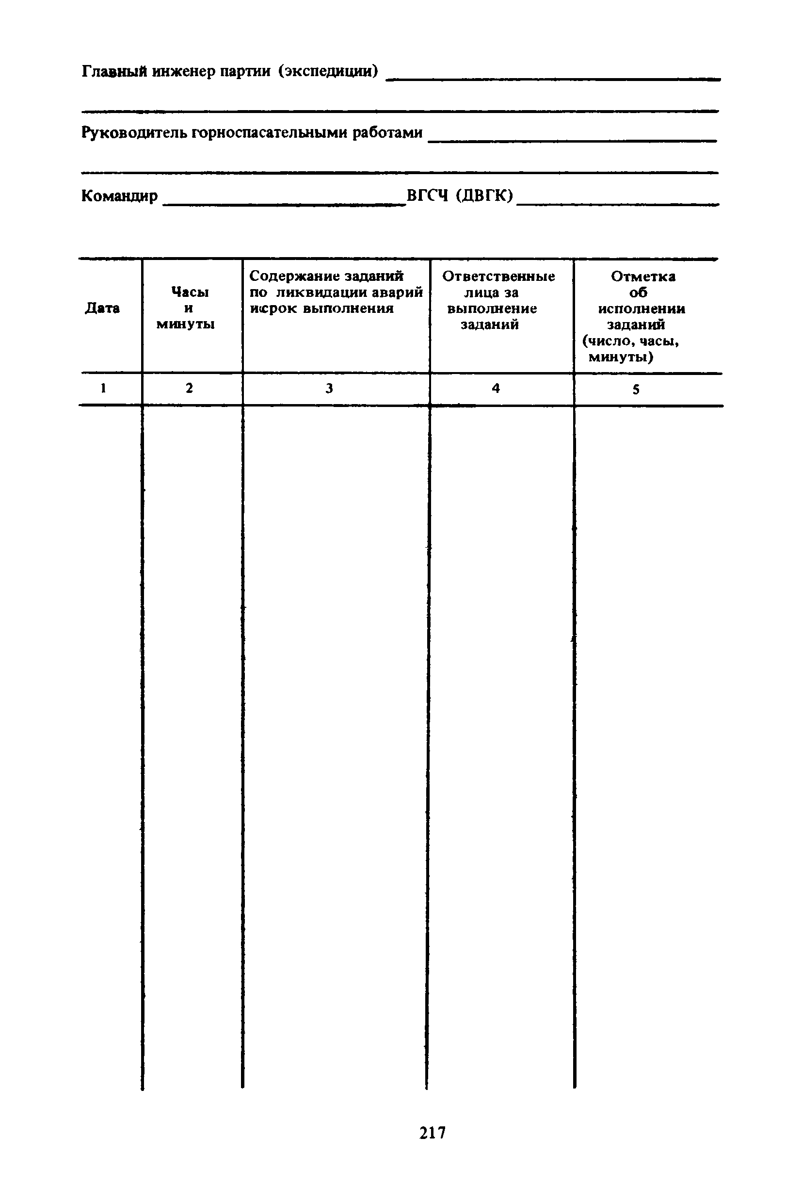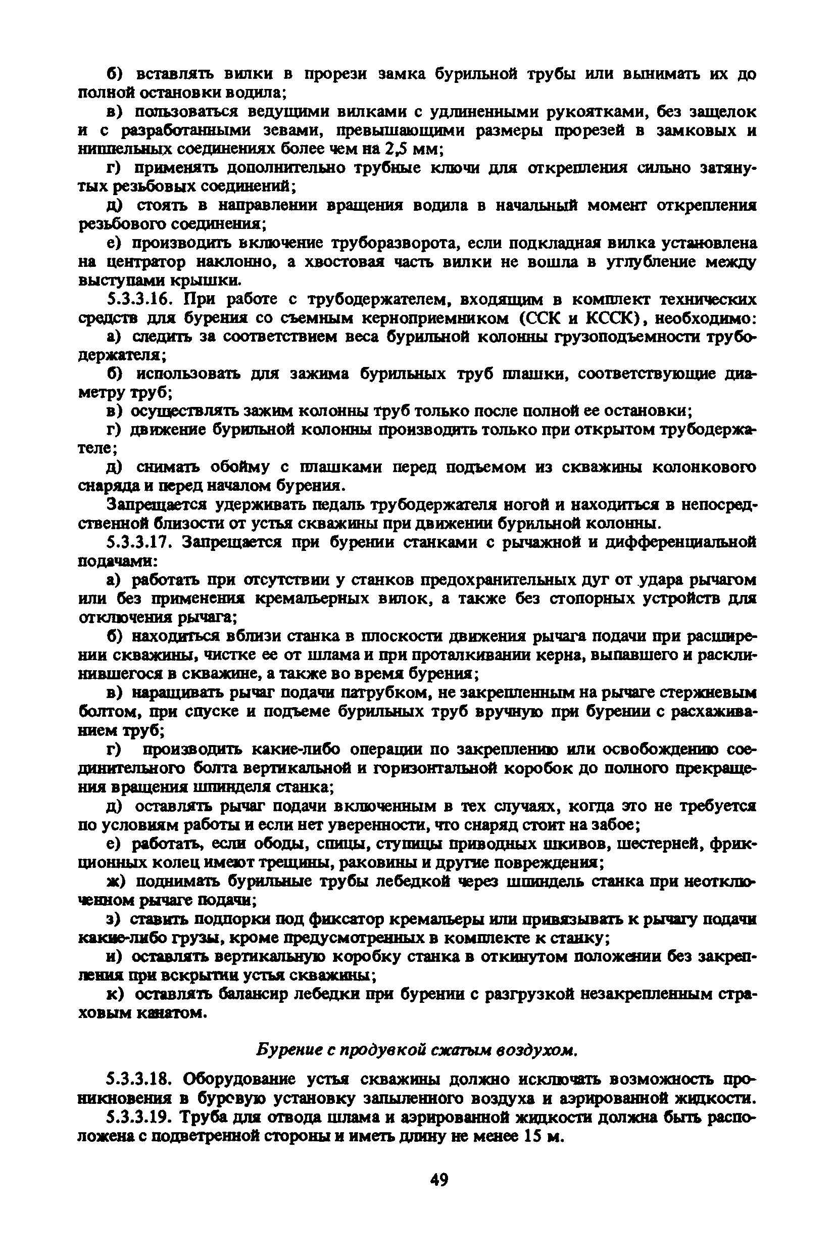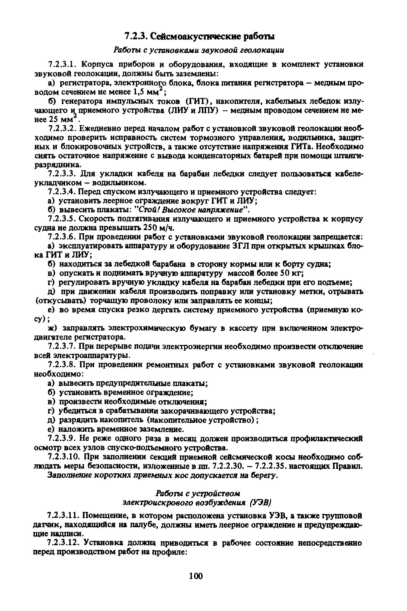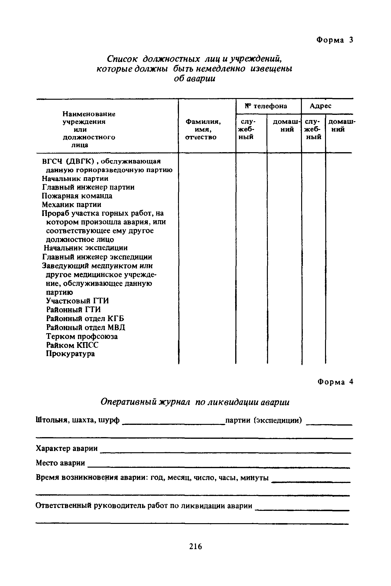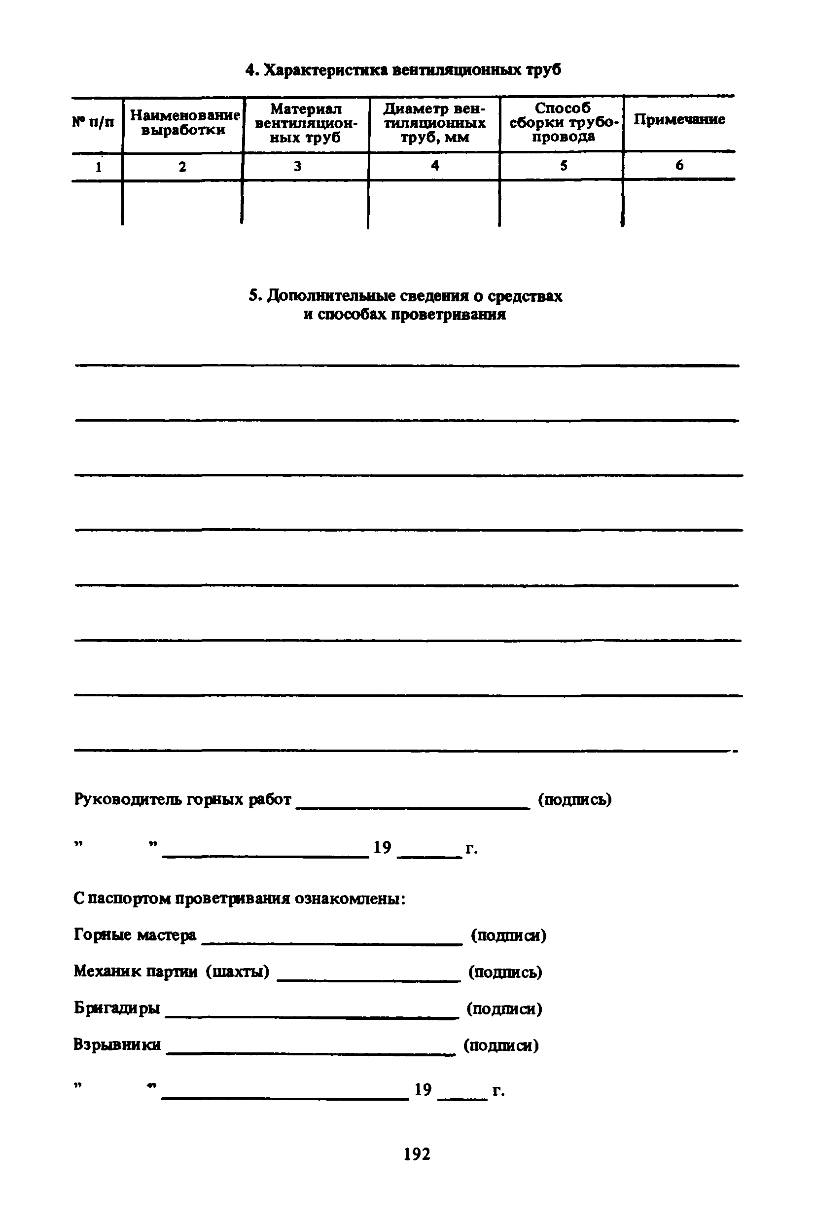 | Оглавление: | Раздел 1. Общие правила Раздел 2. Геологосъемочные и геологопоисковые работы Раздел 3. Геофизические работы Раздел 4. Гидрогеологические и инженерно-геологические работы Раздел 5. Буровые работы Раздел 6. Горноразведочные работы Раздел 7. Морские геологоразведочные работы Раздел 8. Опробовательские работы Раздел 9. Лабораторные работы Раздел 10. Электротехнические работы Раздел 11. Транспорт Раздел 12. Производственная санитария Раздел 13. Ответственность за нарушение правил безопасности Приложение 1. Перечень нормативных документов по охране труда и технике безопасности, обязательных для геологических организации Приложение 2. Журнал проверки состояния техники безопасности Приложение 3. Шкала ветров Приложение 4. Перечень средств техники безопасности и охраны труда для геологосъемочных и геологопоисковых партий и топографо-геодезических бригад Приложение 5. Типовой акт проверки готовности партии (отряда) к выезду на полевые работы Приложение 6. Журнал регистрации маршрутов (переходов) Приложение 7. Акт о приеме буровой установки в эксплуатацию Приложение 8. Акт опрессовки буровых насосов и обвязки буровой установки, смонтированной на скважине Приложение 9. Паспорта крепления и проветривания подземных горноразведочных выработок и инструкции по их составлению Приложение 10. Журнал осмотра крепи и состояния горных выработок Приложение 11. Журнал осмотра подъемной установки Приложение 12. Журнал осмотра подъемных канатов и их расхода Приложение 13. Журнал приемки и сдачи смен машинистами подъемной установки Приложение 14. Журнал осмотра водоотливных установок Приложение 15. Положение о добровольных вспомогательных горноспасательных командах в геологоразведочных организациях, ведущих подземные горные работы Приложение 16. Инструкция по составлению планов ликвидации аварий в разведочных штольнях, шахтах и шурфах с рассечками. Приложение 17. Общие технические требования к гидрометеорологическому обеспечению морских геологоразведочных работ Приложение 18. Шкала состояния моря Приложение 19. Порядок освидетельствования маломерных судов Приложение 20. Минимально допустимые нормы комплектования судовых экипажей маломерных геологоразведочных судов Приложение 21. Табель снабжения маломерных судов Приложение 22. Табель оснащения маломерных плавучих буровых установок (МПБУ) Приложение 23. Выбор массы якорей для маломерных плавучих буровых установок (МГХБУ) Приложение 24. Положение о порядке составления планов предупреждения и ликвидации аварий на маломерных плавучих буровых установках (МПБУ) Приложение 25. Типовая схема окраски маломерных плавучих буровых установок Приложение 26. Журнал осмотра и измерения заземления Приложение 27. Журнал осмотра электрооборудования Приложение 28. Акт проверки готовности скважины к геофизическим работам |
