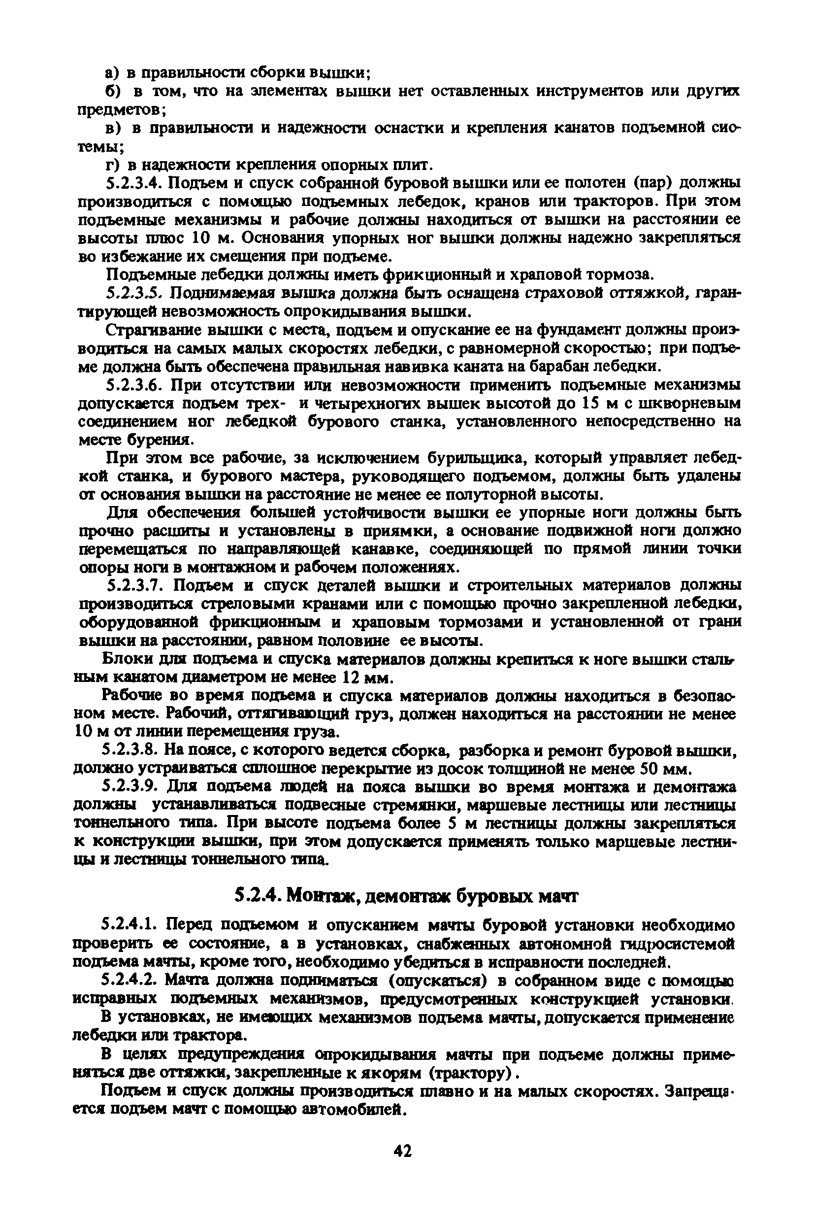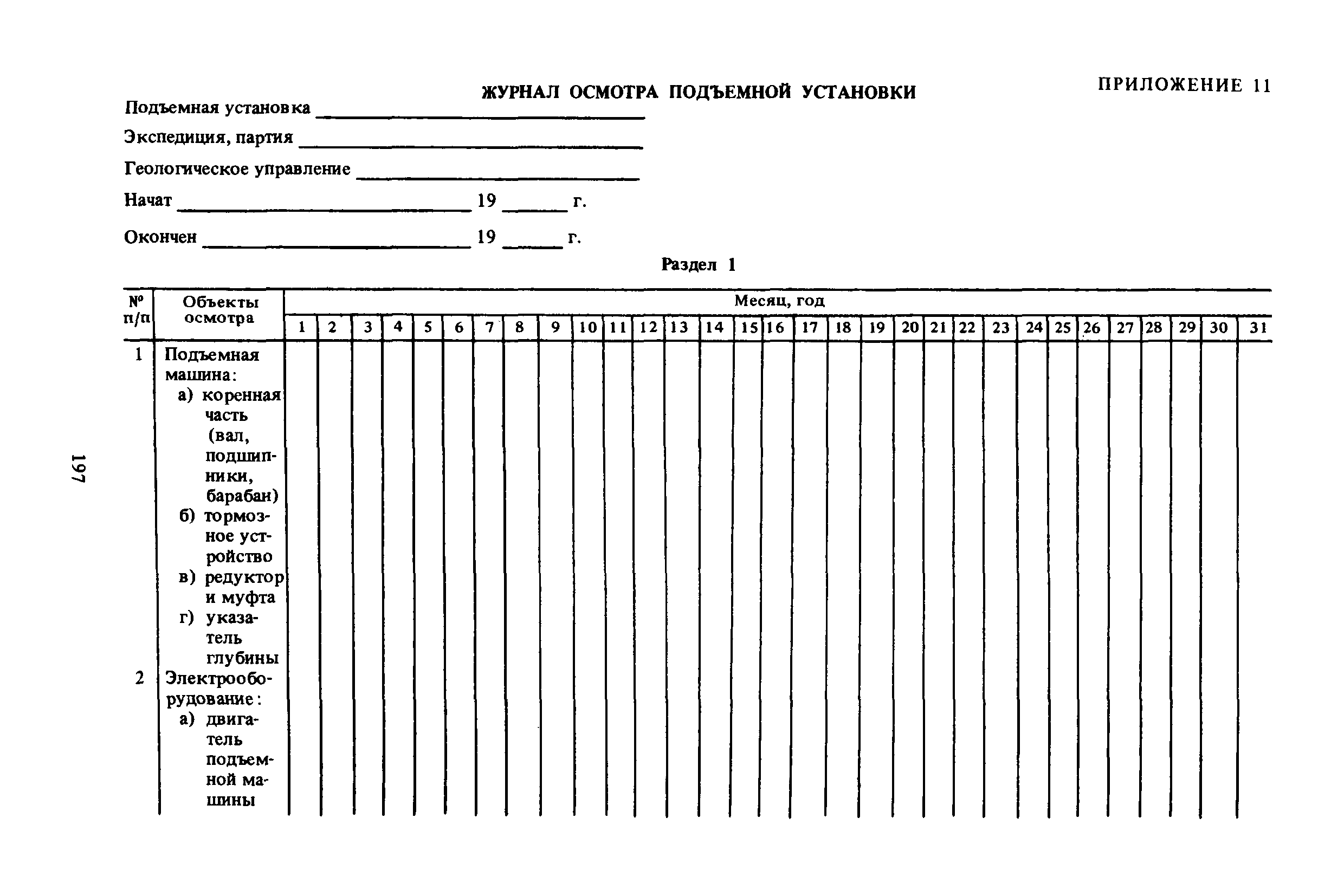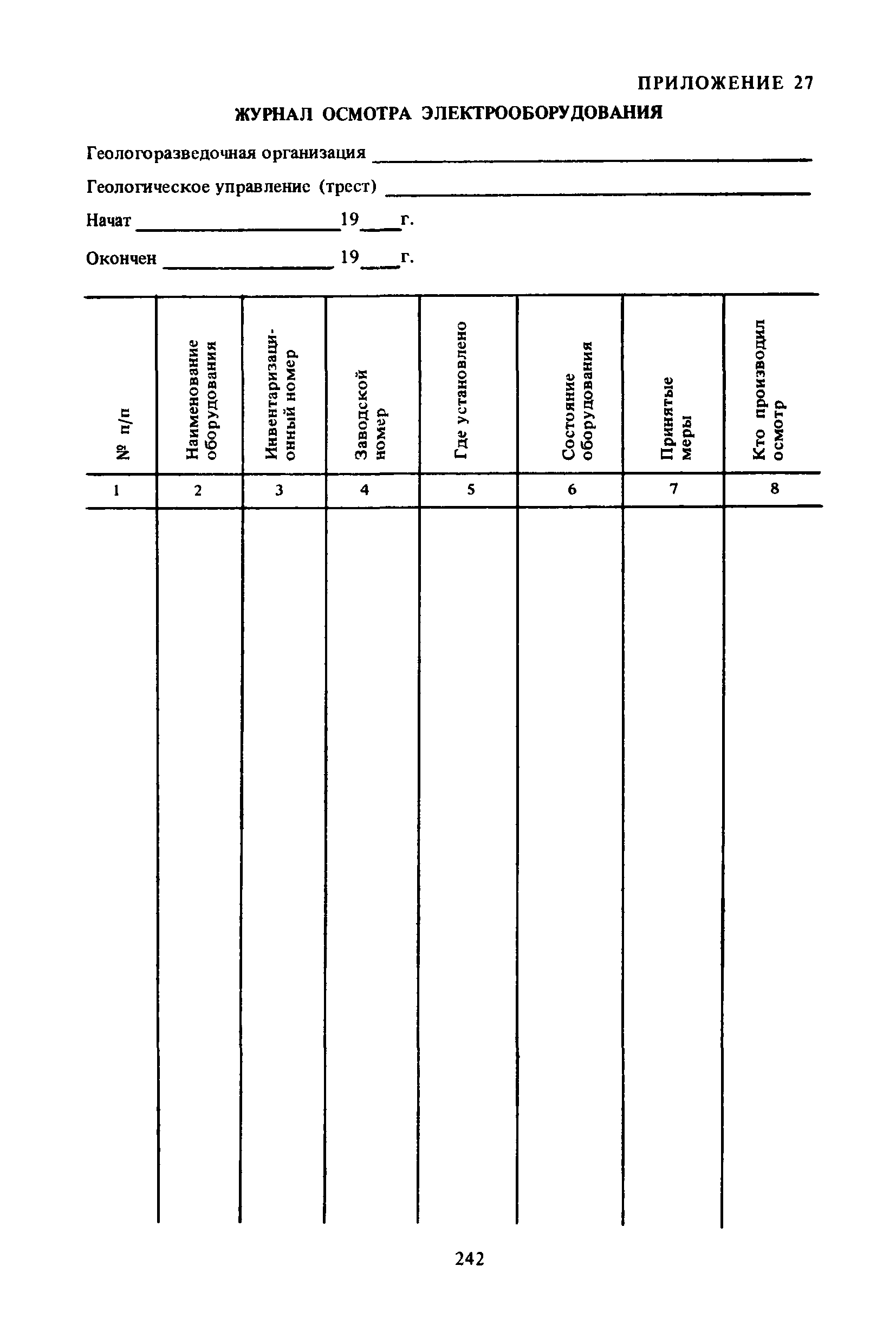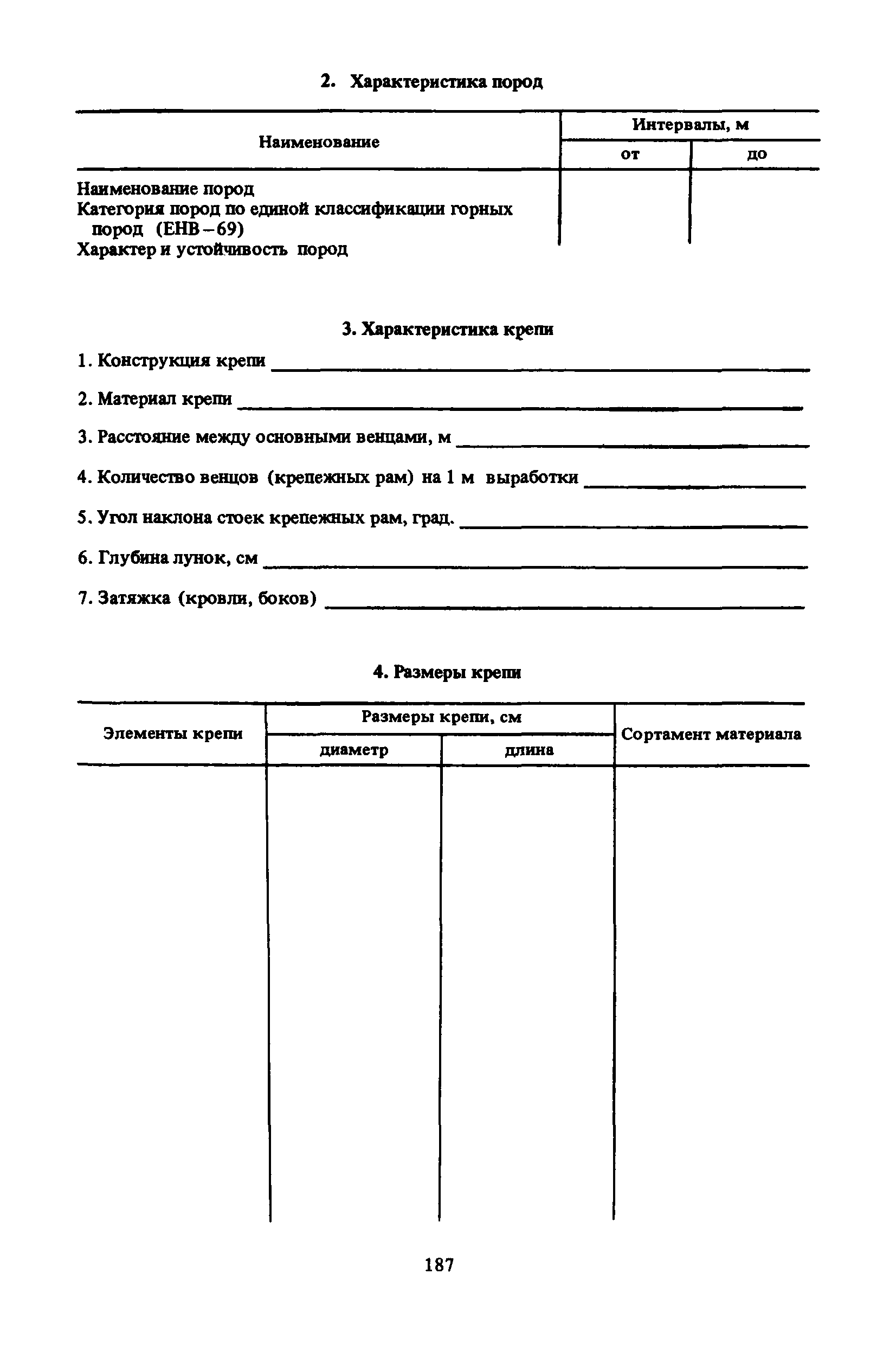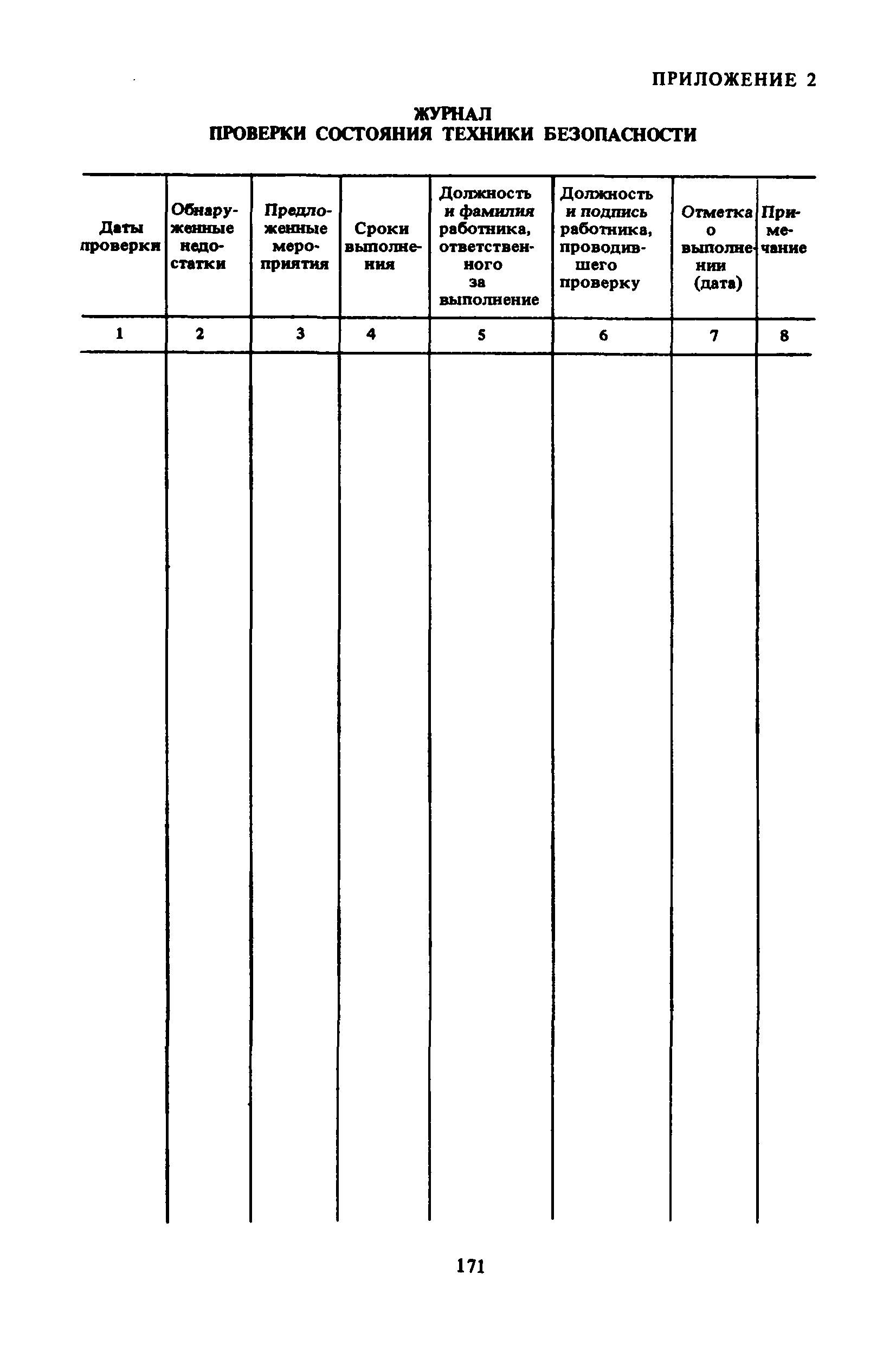 | Оглавление: | Раздел 1. Общие правила Раздел 2. Геологосъемочные и геологопоисковые работы Раздел 3. Геофизические работы Раздел 4. Гидрогеологические и инженерно-геологические работы Раздел 5. Буровые работы Раздел 6. Горноразведочные работы Раздел 7. Морские геологоразведочные работы Раздел 8. Опробовательские работы Раздел 9. Лабораторные работы Раздел 10. Электротехнические работы Раздел 11. Транспорт Раздел 12. Производственная санитария Раздел 13. Ответственность за нарушение правил безопасности Приложение 1. Перечень нормативных документов по охране труда и технике безопасности, обязательных для геологических организации Приложение 2. Журнал проверки состояния техники безопасности Приложение 3. Шкала ветров Приложение 4. Перечень средств техники безопасности и охраны труда для геологосъемочных и геологопоисковых партий и топографо-геодезических бригад Приложение 5. Типовой акт проверки готовности партии (отряда) к выезду на полевые работы Приложение 6. Журнал регистрации маршрутов (переходов) Приложение 7. Акт о приеме буровой установки в эксплуатацию Приложение 8. Акт опрессовки буровых насосов и обвязки буровой установки, смонтированной на скважине Приложение 9. Паспорта крепления и проветривания подземных горноразведочных выработок и инструкции по их составлению Приложение 10. Журнал осмотра крепи и состояния горных выработок Приложение 11. Журнал осмотра подъемной установки Приложение 12. Журнал осмотра подъемных канатов и их расхода Приложение 13. Журнал приемки и сдачи смен машинистами подъемной установки Приложение 14. Журнал осмотра водоотливных установок Приложение 15. Положение о добровольных вспомогательных горноспасательных командах в геологоразведочных организациях, ведущих подземные горные работы Приложение 16. Инструкция по составлению планов ликвидации аварий в разведочных штольнях, шахтах и шурфах с рассечками. Приложение 17. Общие технические требования к гидрометеорологическому обеспечению морских геологоразведочных работ Приложение 18. Шкала состояния моря Приложение 19. Порядок освидетельствования маломерных судов Приложение 20. Минимально допустимые нормы комплектования судовых экипажей маломерных геологоразведочных судов Приложение 21. Табель снабжения маломерных судов Приложение 22. Табель оснащения маломерных плавучих буровых установок (МПБУ) Приложение 23. Выбор массы якорей для маломерных плавучих буровых установок (МГХБУ) Приложение 24. Положение о порядке составления планов предупреждения и ликвидации аварий на маломерных плавучих буровых установках (МПБУ) Приложение 25. Типовая схема окраски маломерных плавучих буровых установок Приложение 26. Журнал осмотра и измерения заземления Приложение 27. Журнал осмотра электрооборудования Приложение 28. Акт проверки готовности скважины к геофизическим работам |