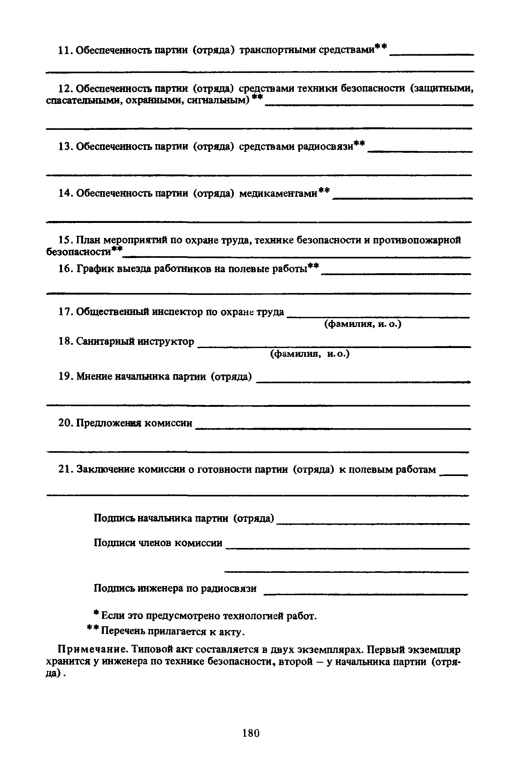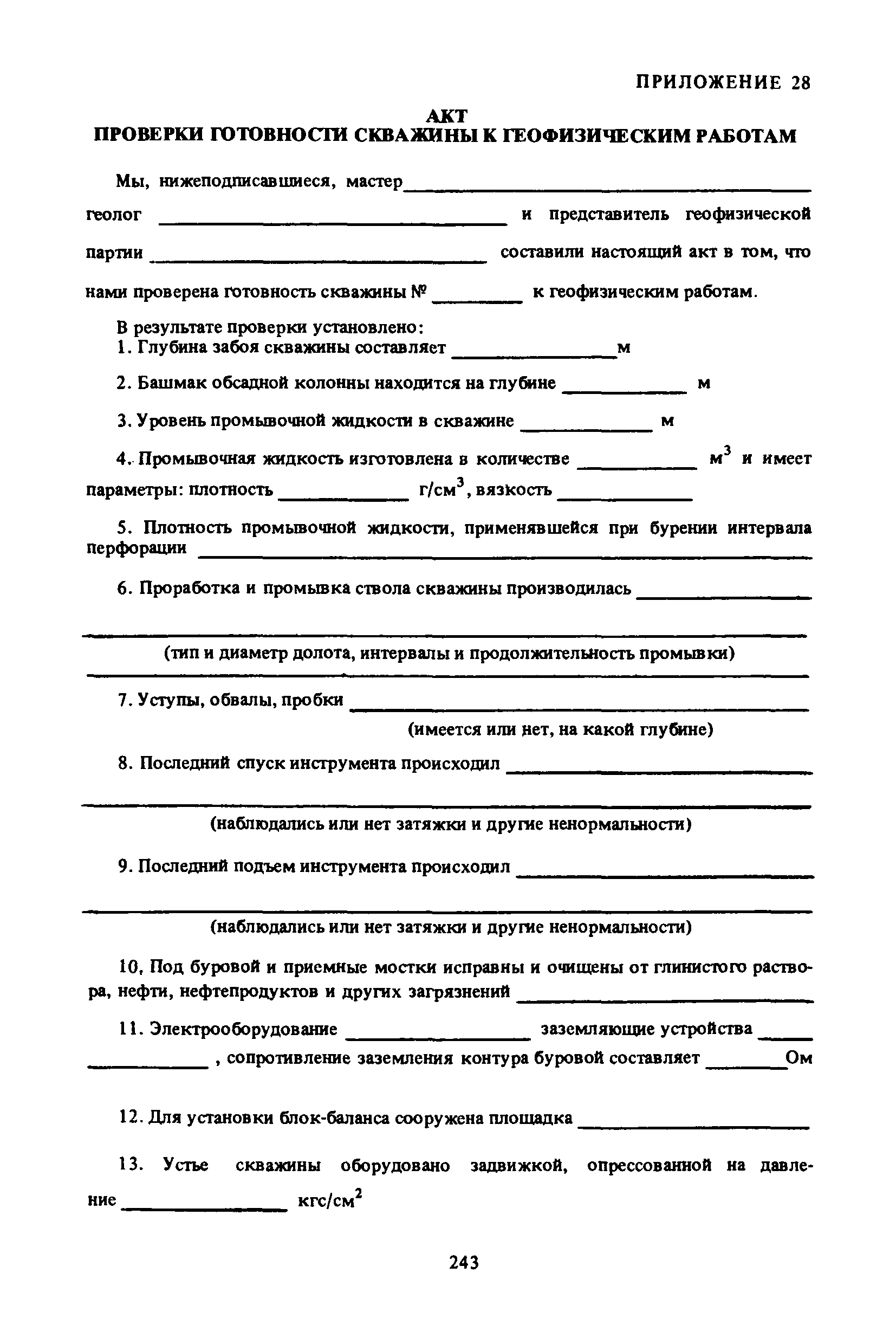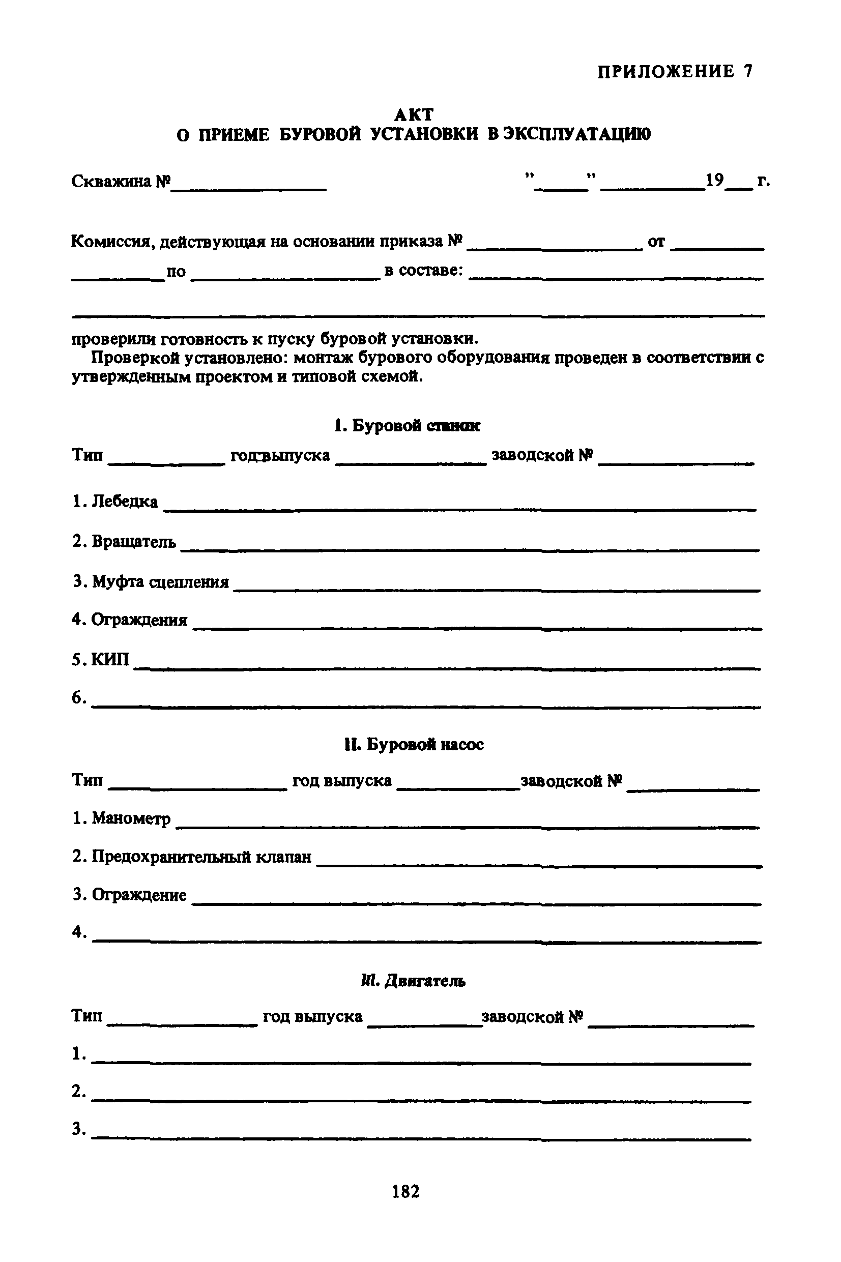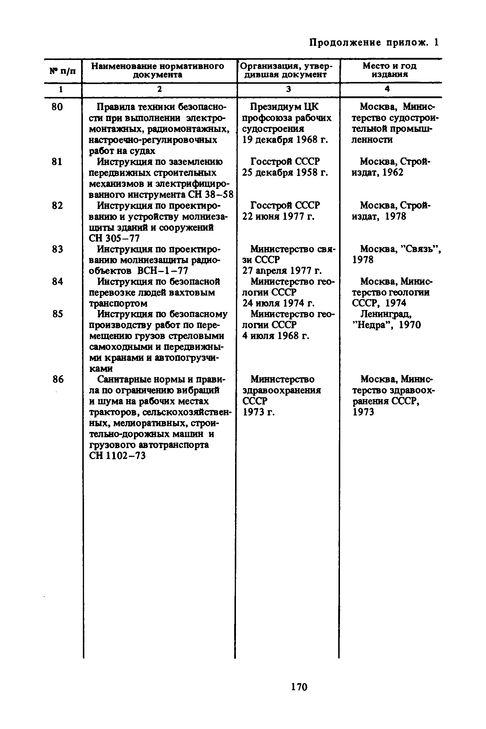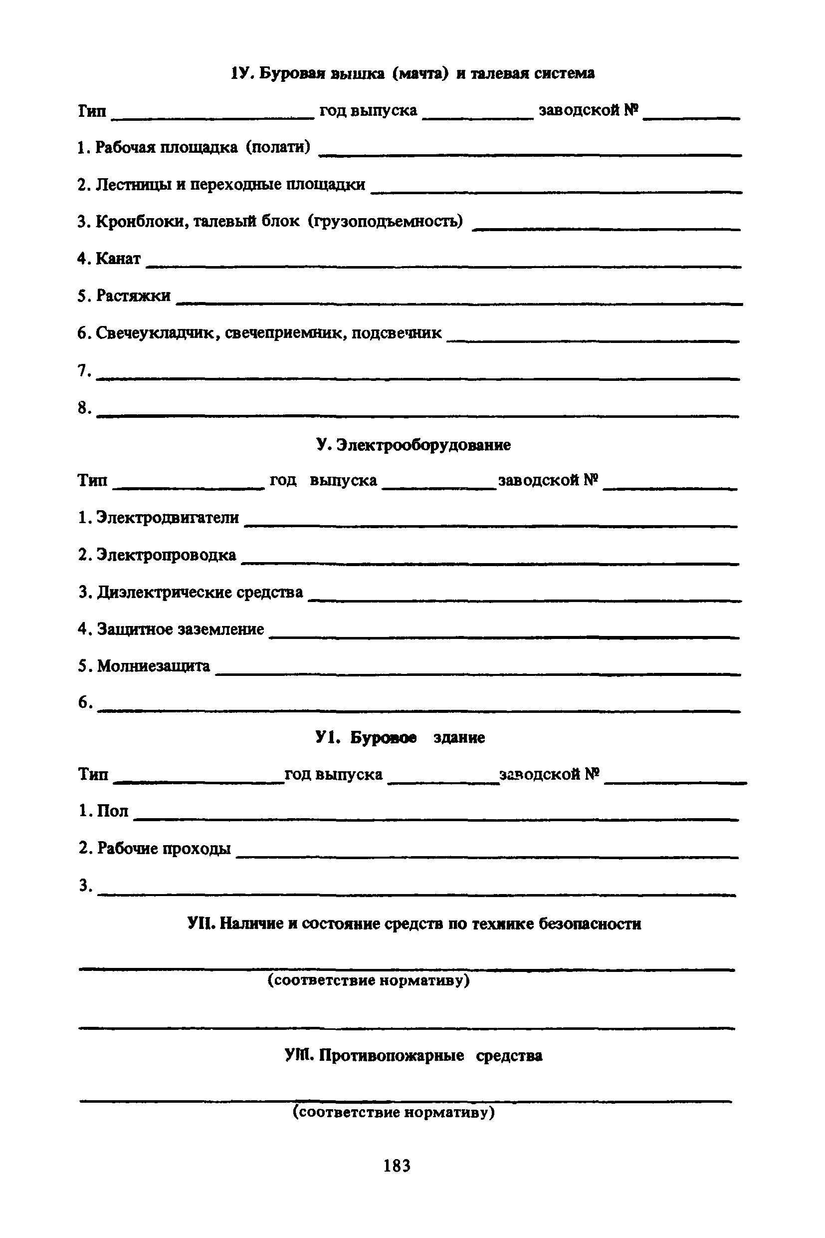 | Оглавление: | Раздел 1. Общие правила Раздел 2. Геологосъемочные и геологопоисковые работы Раздел 3. Геофизические работы Раздел 4. Гидрогеологические и инженерно-геологические работы Раздел 5. Буровые работы Раздел 6. Горноразведочные работы Раздел 7. Морские геологоразведочные работы Раздел 8. Опробовательские работы Раздел 9. Лабораторные работы Раздел 10. Электротехнические работы Раздел 11. Транспорт Раздел 12. Производственная санитария Раздел 13. Ответственность за нарушение правил безопасности Приложение 1. Перечень нормативных документов по охране труда и технике безопасности, обязательных для геологических организации Приложение 2. Журнал проверки состояния техники безопасности Приложение 3. Шкала ветров Приложение 4. Перечень средств техники безопасности и охраны труда для геологосъемочных и геологопоисковых партий и топографо-геодезических бригад Приложение 5. Типовой акт проверки готовности партии (отряда) к выезду на полевые работы Приложение 6. Журнал регистрации маршрутов (переходов) Приложение 7. Акт о приеме буровой установки в эксплуатацию Приложение 8. Акт опрессовки буровых насосов и обвязки буровой установки, смонтированной на скважине Приложение 9. Паспорта крепления и проветривания подземных горноразведочных выработок и инструкции по их составлению Приложение 10. Журнал осмотра крепи и состояния горных выработок Приложение 11. Журнал осмотра подъемной установки Приложение 12. Журнал осмотра подъемных канатов и их расхода Приложение 13. Журнал приемки и сдачи смен машинистами подъемной установки Приложение 14. Журнал осмотра водоотливных установок Приложение 15. Положение о добровольных вспомогательных горноспасательных командах в геологоразведочных организациях, ведущих подземные горные работы Приложение 16. Инструкция по составлению планов ликвидации аварий в разведочных штольнях, шахтах и шурфах с рассечками. Приложение 17. Общие технические требования к гидрометеорологическому обеспечению морских геологоразведочных работ Приложение 18. Шкала состояния моря Приложение 19. Порядок освидетельствования маломерных судов Приложение 20. Минимально допустимые нормы комплектования судовых экипажей маломерных геологоразведочных судов Приложение 21. Табель снабжения маломерных судов Приложение 22. Табель оснащения маломерных плавучих буровых установок (МПБУ) Приложение 23. Выбор массы якорей для маломерных плавучих буровых установок (МГХБУ) Приложение 24. Положение о порядке составления планов предупреждения и ликвидации аварий на маломерных плавучих буровых установках (МПБУ) Приложение 25. Типовая схема окраски маломерных плавучих буровых установок Приложение 26. Журнал осмотра и измерения заземления Приложение 27. Журнал осмотра электрооборудования Приложение 28. Акт проверки готовности скважины к геофизическим работам |