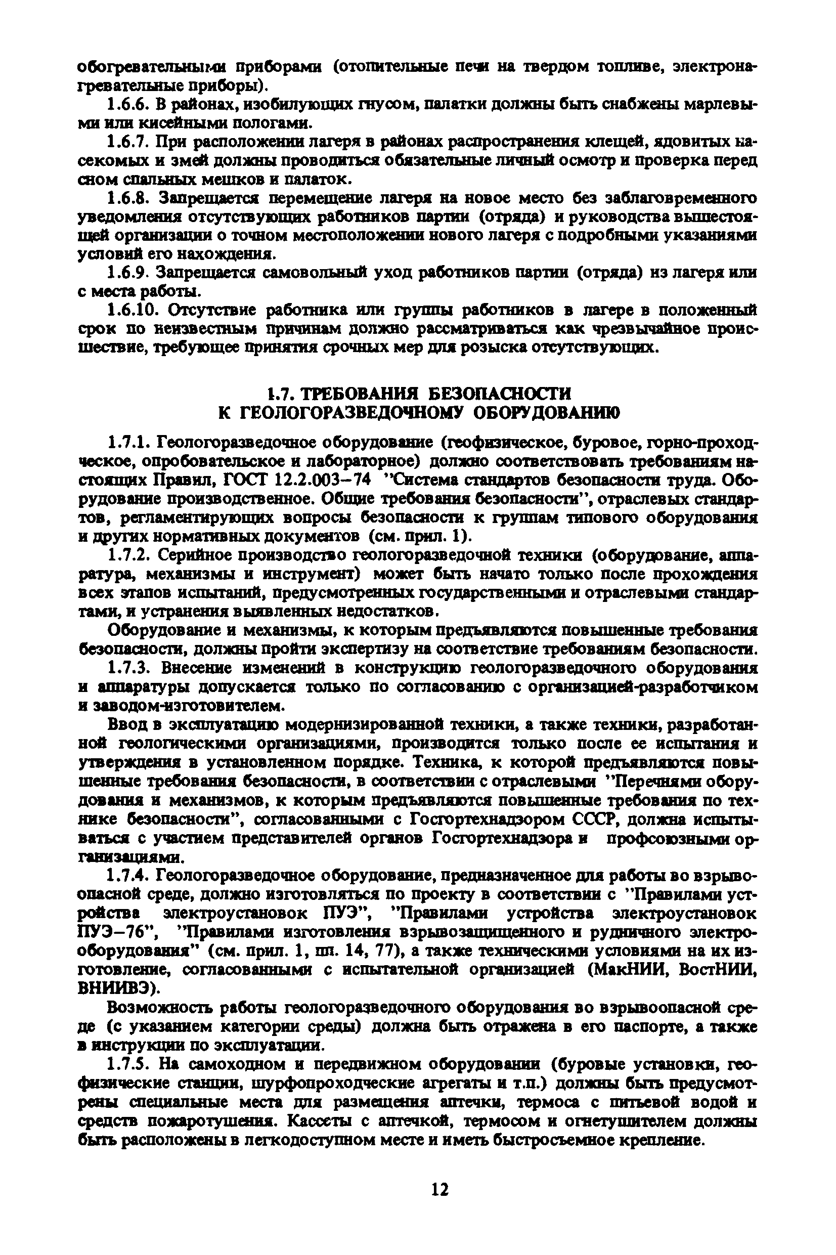 | Область применения: | Правила обязательны для всех министерств и ведомств, предприятий, организаций и учреждений, ведущих поиски и разведку месторождений полезных ископаемых, научно-исследовательские, инженерно-изыскательские, проектные и конструкторские работы для этих целей, а также для заводов-изготовителей всех видов геологоразведочного оборудования, применяемого при геологоразведочных работах. |