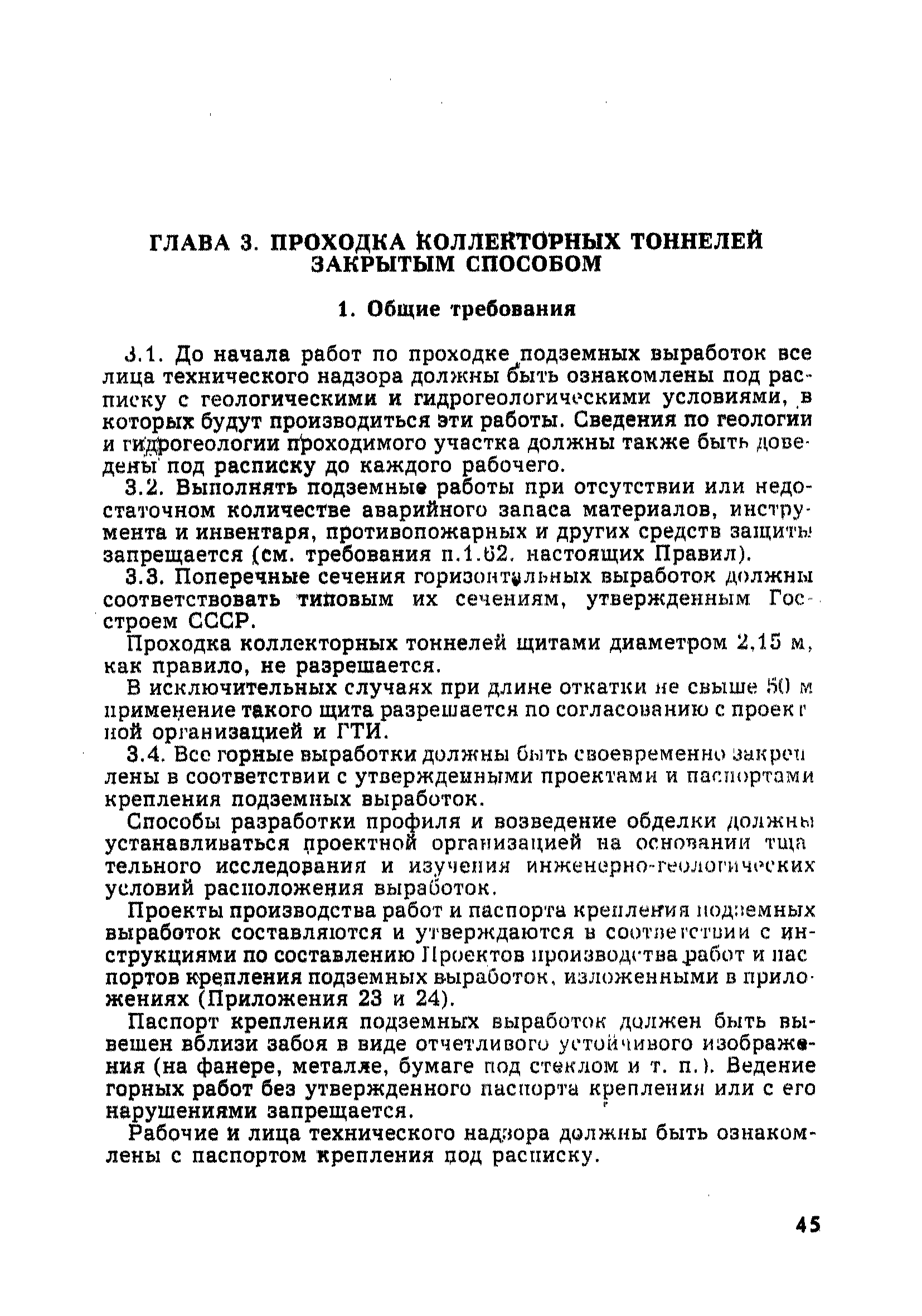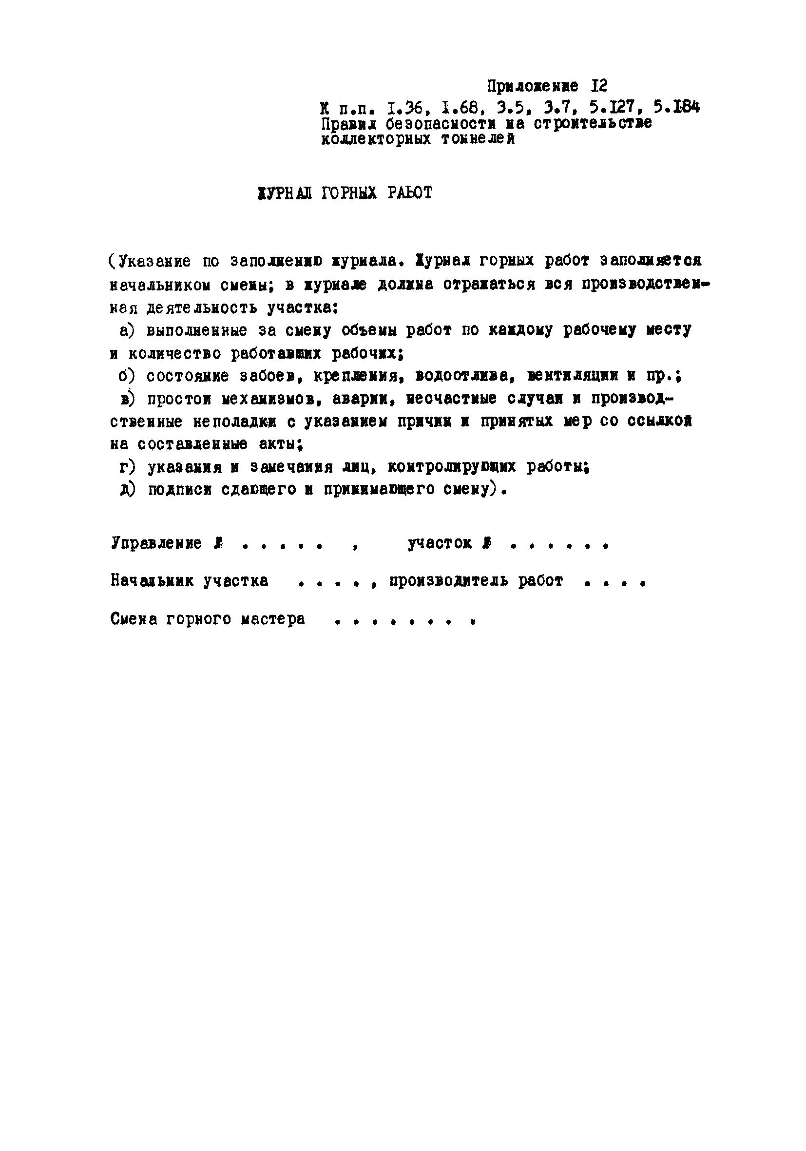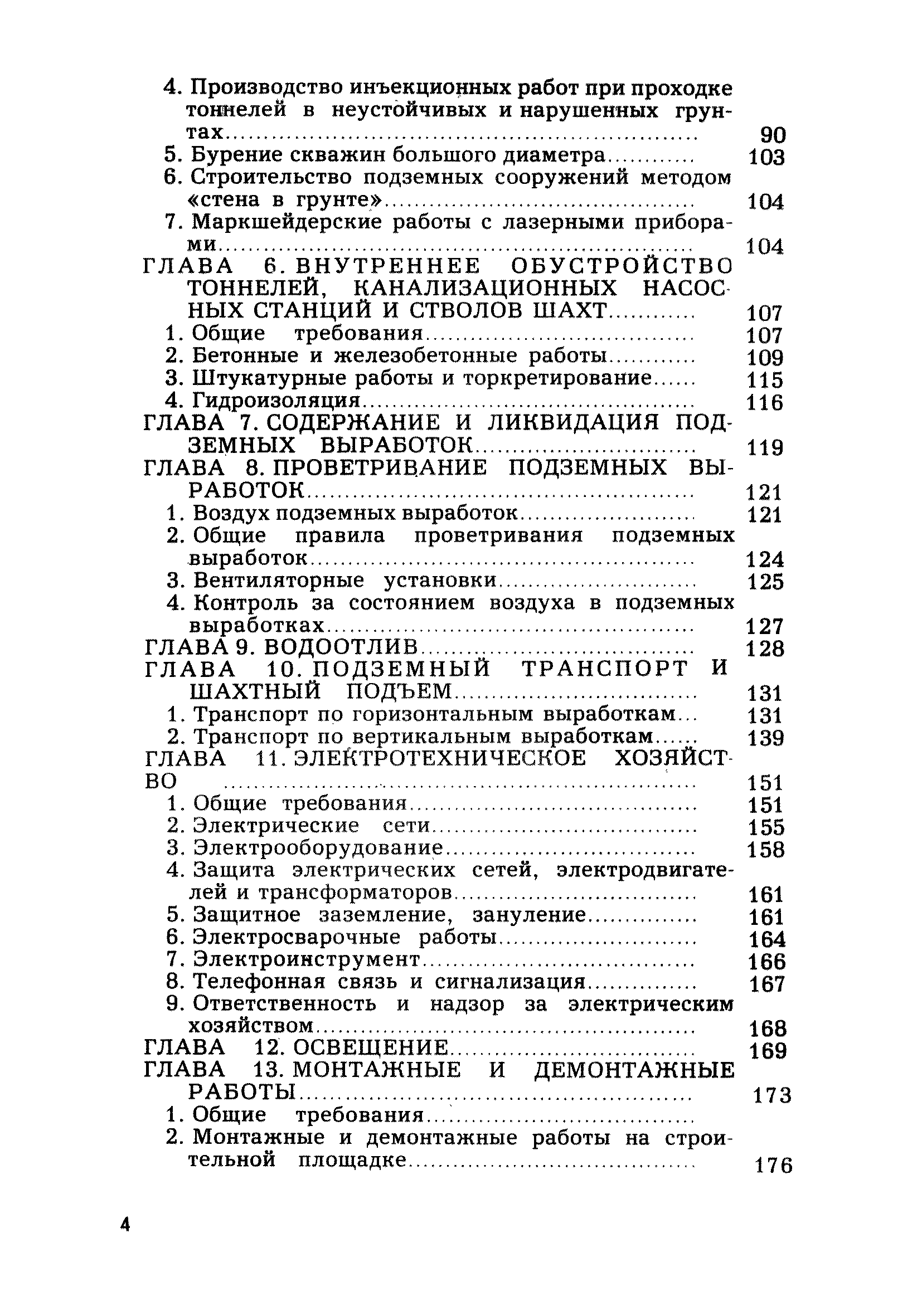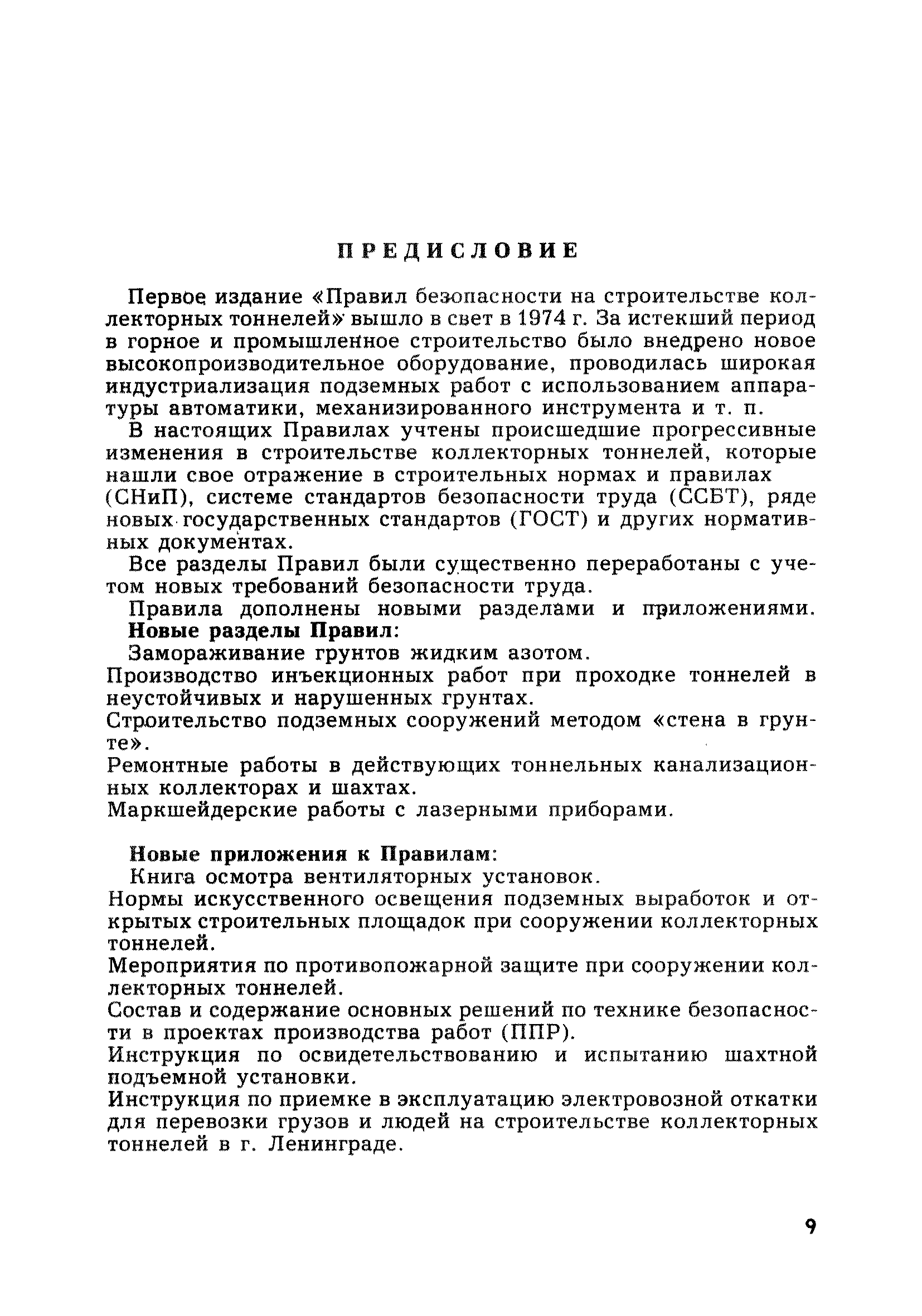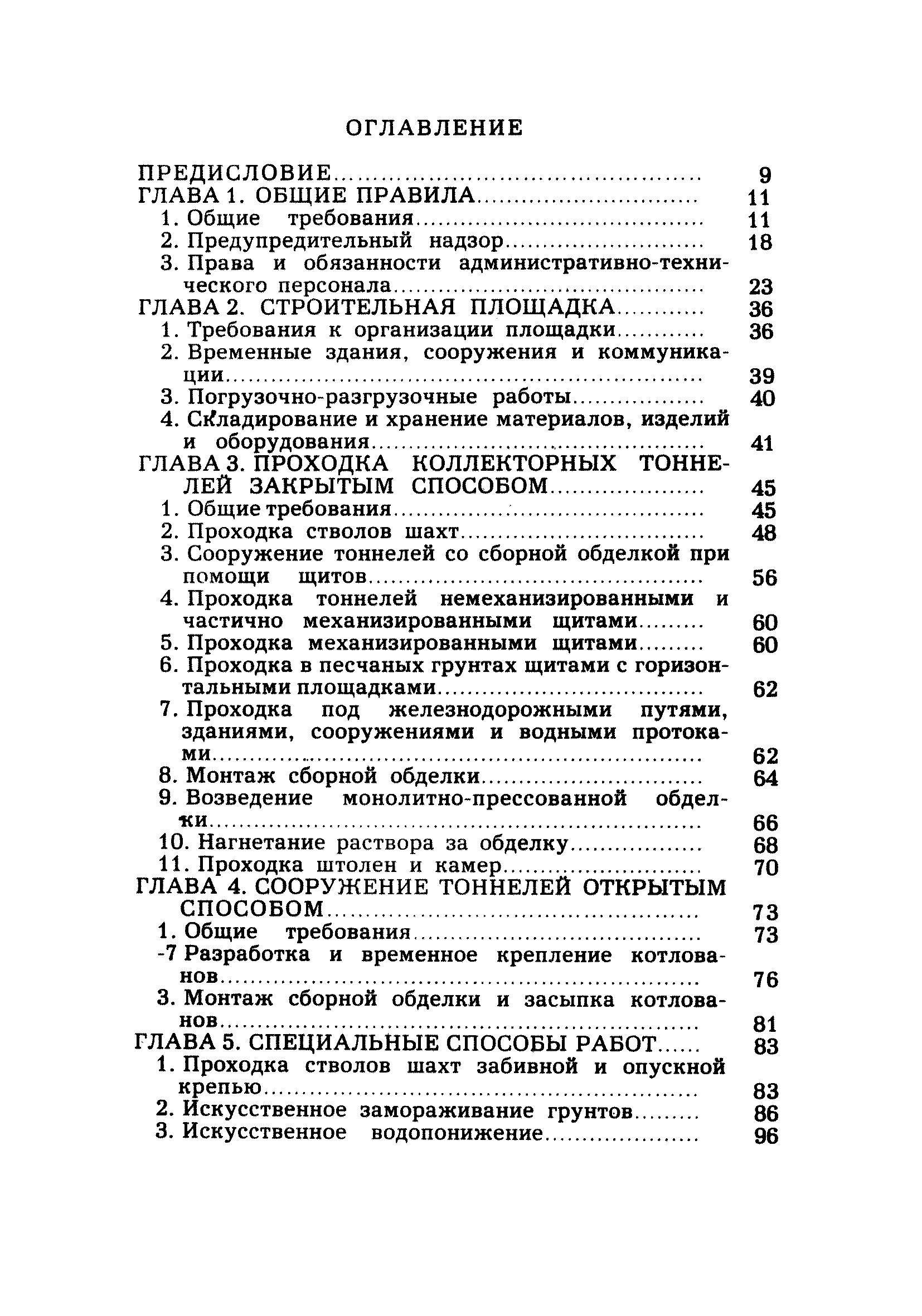 | Оглавление: | Глава 1. Общие правила Глава 2. Строительная площадка Глава 3. Проходка коллекторных тоннелей закрытым способом Глава 4. Сооружение тоннелей открытым способом Глава 5. Специальные способы работ Глава 6. Внутреннее обустройство тоннелей, канализационных насосных станций и стволов шахт Глава 7. Содержание и ликвидация подземных выработок Глава 8. Проветривание подземных выработок Глава 9. Водоотлив Глава 10. Подземный транспорт и шахтный подъем Глава 11. Электротехническое хозяйство Глава 12. Освещение Глава 13. Монтажные и демонтажные работы Глава 14. Строительные машины, механизмы и инструмент Глава 15. Ремонтные работы в действующих тоннельных канализационных коллекторах и шахтах Глава 16. Общие санитарные правила Глава 17. Ответственность за нарушение правил безопасности Приложение 1. Нормы и правила безопасности и производственной санитарии, которыми следует руководствоваться при проектировании и строительстве коллекторных тоннелей и других сооружений Приложение 2. Форма акта-допуска для производства строительно-монтажных работ на территории действующего предприятия Приложение 3. Форма наряда-допуска на производство работ повышенной опасности Приложение 4. Положение о порядке проведения инструктажа и об обучении безопасности труда Приложение 5. Журнал регистрации вводного инструктажа по охране труда Приложение 6. Журнал регистрации инструктажа на рабочем месте Приложение 7. Журнал регистрации проверки знаний работников по технике безопасности Приложение 8. Форма удостоверения для рабочих Приложение 9. Форма удостоверения для инженерно-технических работников Приложение 10. Нормы и сроки испытаний подъемных механизмов и приспособлений Приложение 11. Перечень документации по технике безопасности на объектах работ Приложение 12. Журнал горных работ Приложение 13. Положение о расследовании и учете несчастных случаев на производстве Приложение 14. Журнал проверки техники безопасности (3-ступенчатый контроль) Приложение 15. Методические указания по составлению планов ликвидации аварий Приложение 16. Журнал ознакомления рабочих с планом ликвидации аварий Приложение 17. Предельно допустимые концентрации некоторых вредных веществ в воздухе рабочей зоны Приложение 18. Инструкция по отбору проб воздуха в подземных выработках Приложение 19. Журнал учета результатов анализа воздуха Приложение 20. Книга осмотра вентиляторных установок Приложение 21. Нормы искусственного освещения подземных выработок и открытых строительных площадок при сооружении коллекторных тоннелей Приложение 22. Мероприятия по противопожарной защите при сооружении коллекторных тоннелей Приложение 23. Состав и содержание основных решений по технике безопасности в проектах производства работ (ППР) Приложение 24. Инструкция по составлению паспортов креплений подземных выработок Приложение 25. Книга осмотра крепи и состояния выработок Приложение 26. Книга № 1 для записи результатов осмотра деталей шахтного подъема Приложение 27. Книга № 2 для записи повреждений, обнаруженных на подъемной установке, и мер, принятых к их устранению Приложение 28. Книга № 3 для записи дат навески, снятия и испытания канатов Приложение 29. Нормы браковки стальных канатов Приложение 30. Журнал записи результатов осмотра состояния стволов шахт Приложение 31. Журнал для зап