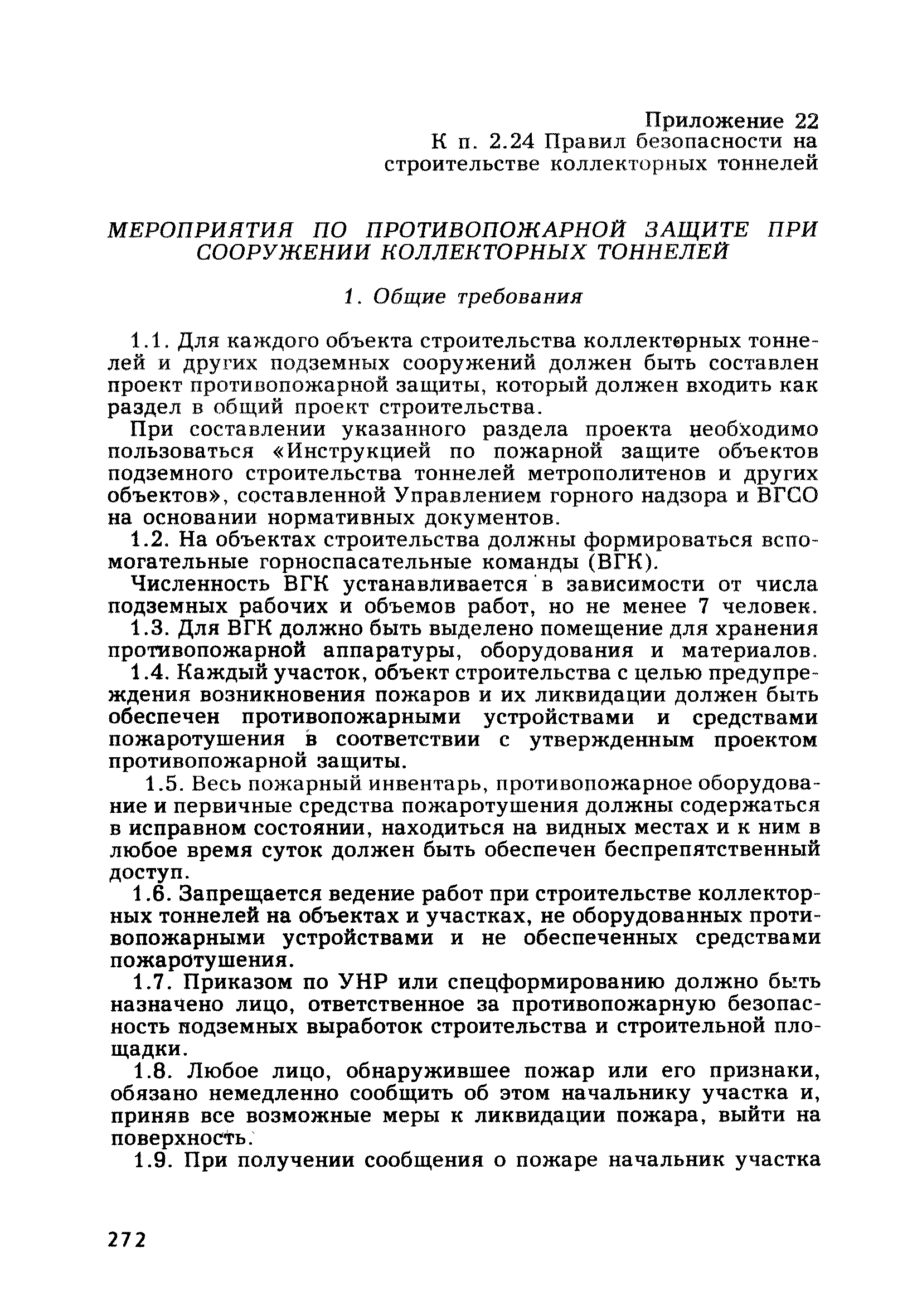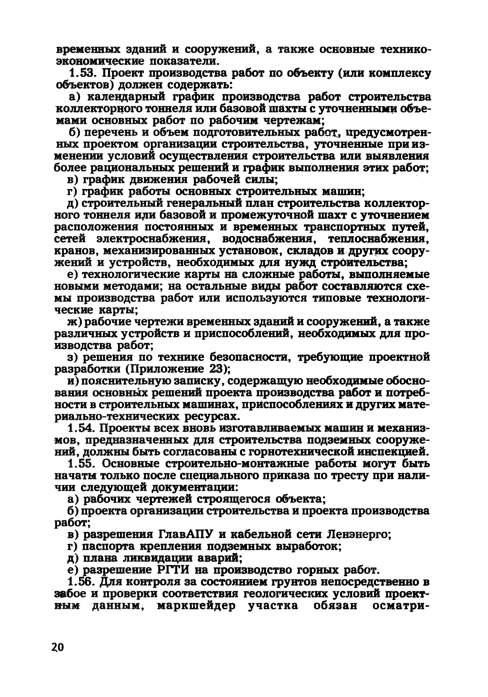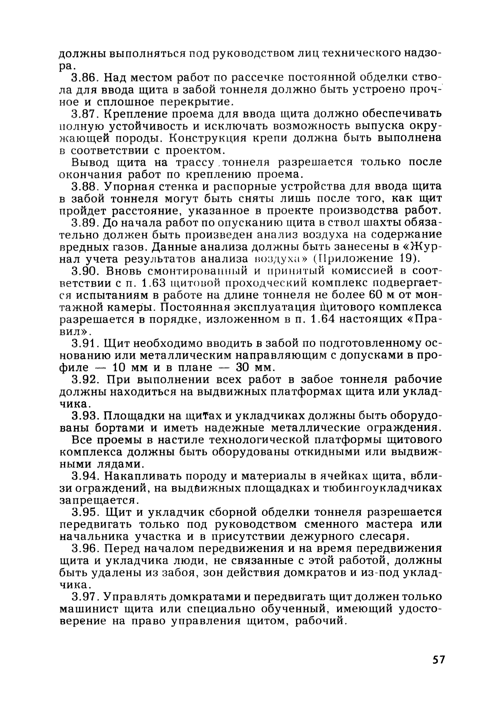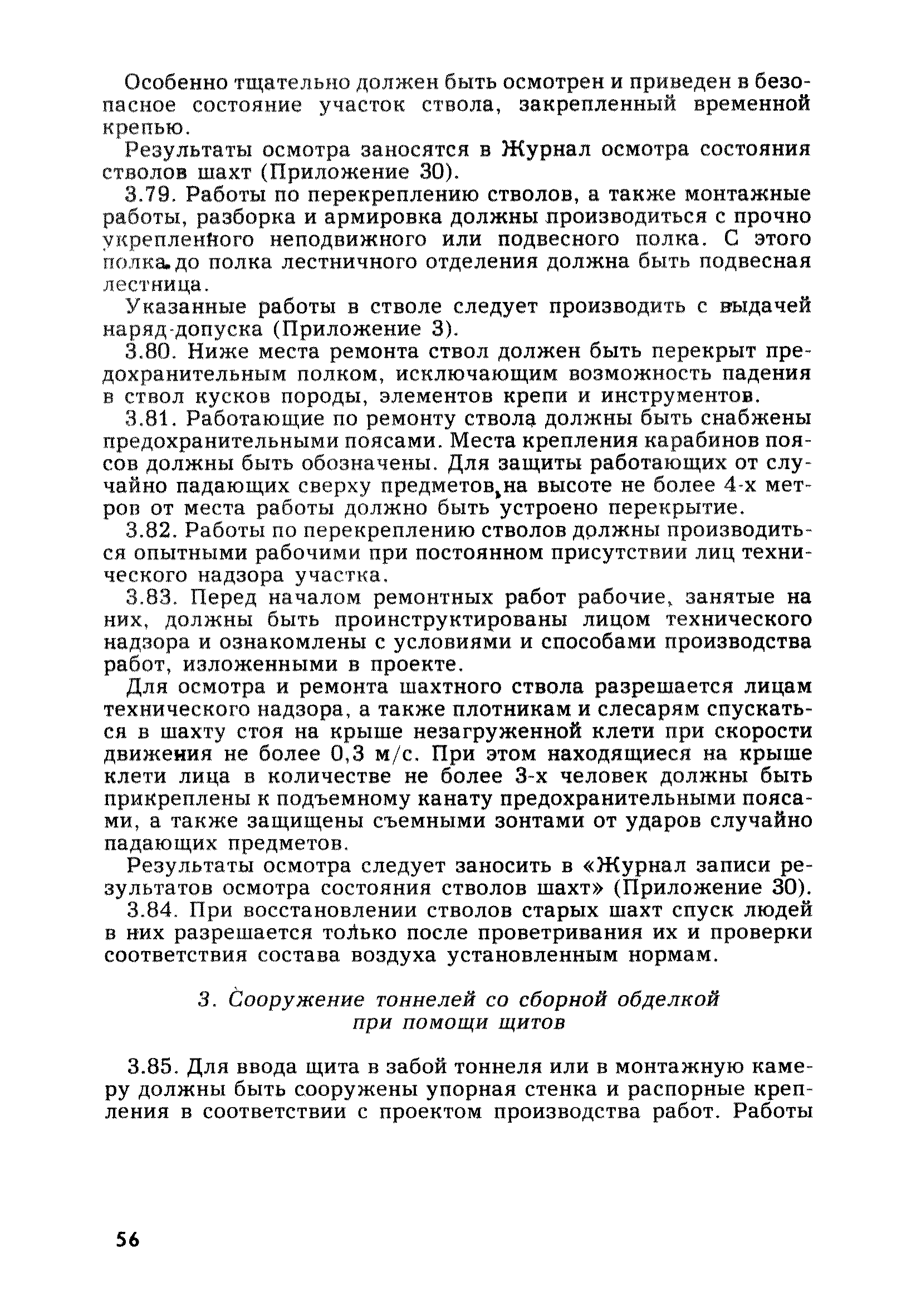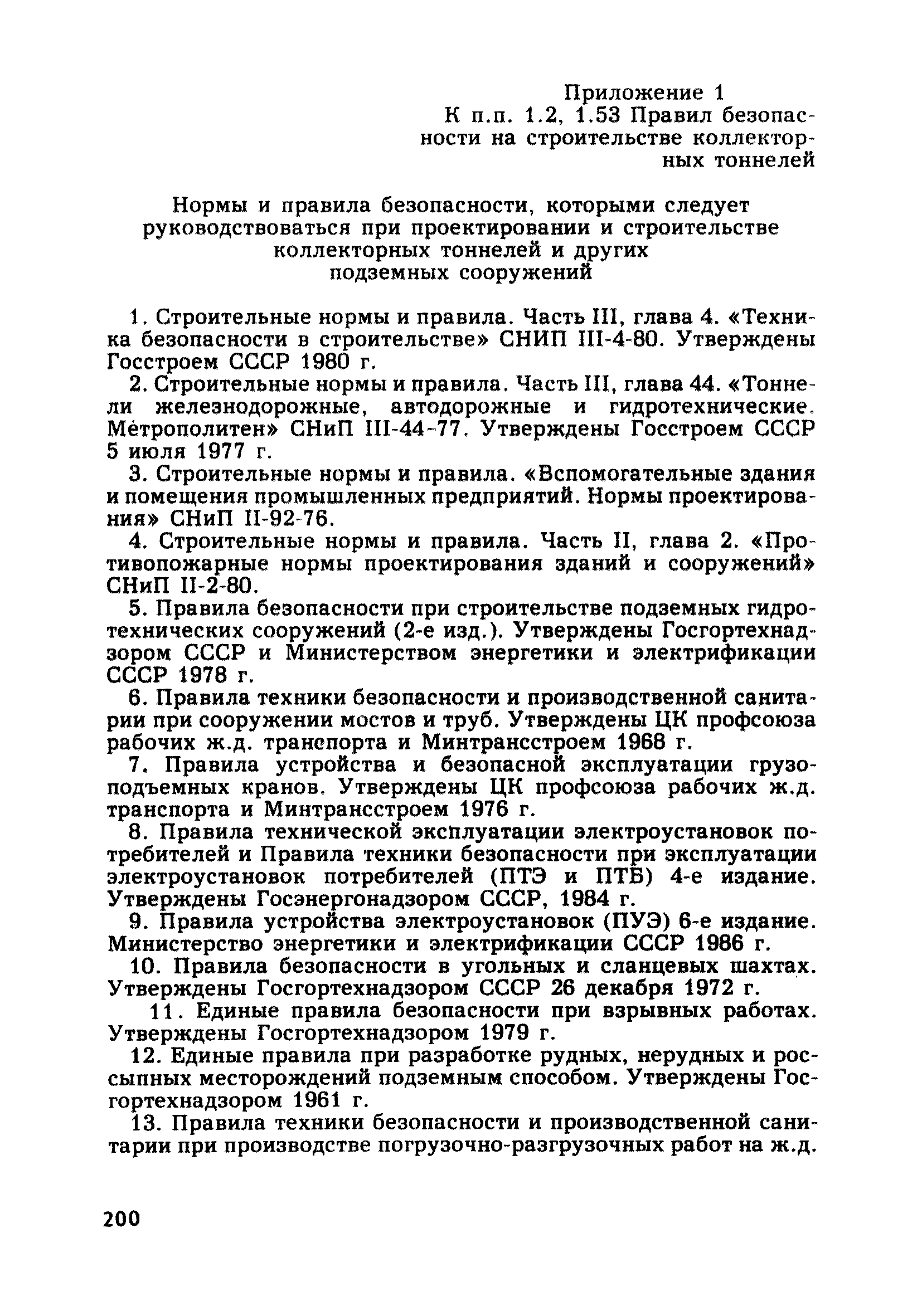 | Оглавление: | Глава 1. Общие правила Глава 2. Строительная площадка Глава 3. Проходка коллекторных тоннелей закрытым способом Глава 4. Сооружение тоннелей открытым способом Глава 5. Специальные способы работ Глава 6. Внутреннее обустройство тоннелей, канализационных насосных станций и стволов шахт Глава 7. Содержание и ликвидация подземных выработок Глава 8. Проветривание подземных выработок Глава 9. Водоотлив Глава 10. Подземный транспорт и шахтный подъем Глава 11. Электротехническое хозяйство Глава 12. Освещение Глава 13. Монтажные и демонтажные работы Глава 14. Строительные машины, механизмы и инструмент Глава 15. Ремонтные работы в действующих тоннельных канализационных коллекторах и шахтах Глава 16. Общие санитарные правила Глава 17. Ответственность за нарушение правил безопасности Приложение 1. Нормы и правила безопасности и производственной санитарии, которыми следует руководствоваться при проектировании и строительстве коллекторных тоннелей и других сооружений Приложение 2. Форма акта-допуска для производства строительно-монтажных работ на территории действующего предприятия Приложение 3. Форма наряда-допуска на производство работ повышенной опасности Приложение 4. Положение о порядке проведения инструктажа и об обучении безопасности труда Приложение 5. Журнал регистрации вводного инструктажа по охране труда Приложение 6. Журнал регистрации инструктажа на рабочем месте Приложение 7. Журнал регистрации проверки знаний работников по технике безопасности Приложение 8. Форма удостоверения для рабочих Приложение 9. Форма удостоверения для инженерно-технических работников Приложение 10. Нормы и сроки испытаний подъемных механизмов и приспособлений Приложение 11. Перечень документации по технике безопасности на объектах работ Приложение 12. Журнал горных работ Приложение 13. Положение о расследовании и учете несчастных случаев на производстве Приложение 14. Журнал проверки техники безопасности (3-ступенчатый контроль) Приложение 15. Методические указания по составлению планов ликвидации аварий Приложение 16. Журнал ознакомления рабочих с планом ликвидации аварий Приложение 17. Предельно допустимые концентрации некоторых вредных веществ в воздухе рабочей зоны Приложение 18. Инструкция по отбору проб воздуха в подземных выработках Приложение 19. Журнал учета результатов анализа воздуха Приложение 20. Книга осмотра вентиляторных установок Приложение 21. Нормы искусственного освещения подземных выработок и открытых строительных площадок при сооружении коллекторных тоннелей Приложение 22. Мероприятия по противопожарной защите при сооружении коллекторных тоннелей Приложение 23. Состав и содержание основных решений по технике безопасности в проектах производства работ (ППР) Приложение 24. Инструкция по составлению паспортов креплений подземных выработок Приложение 25. Книга осмотра крепи и состояния выработок Приложение 26. Книга № 1 для записи результатов осмотра деталей шахтного подъема Приложение 27. Книга № 2 для записи повреждений, обнаруженных на подъемной установке, и мер, принятых к их устранению Приложение 28. Книга № 3 для записи дат навески, снятия и испытания канатов Приложение 29. Нормы браковки стальных канатов Приложение 30. Журнал записи результатов осмотра состояния стволов шахт Приложение 31. Журнал для зап
