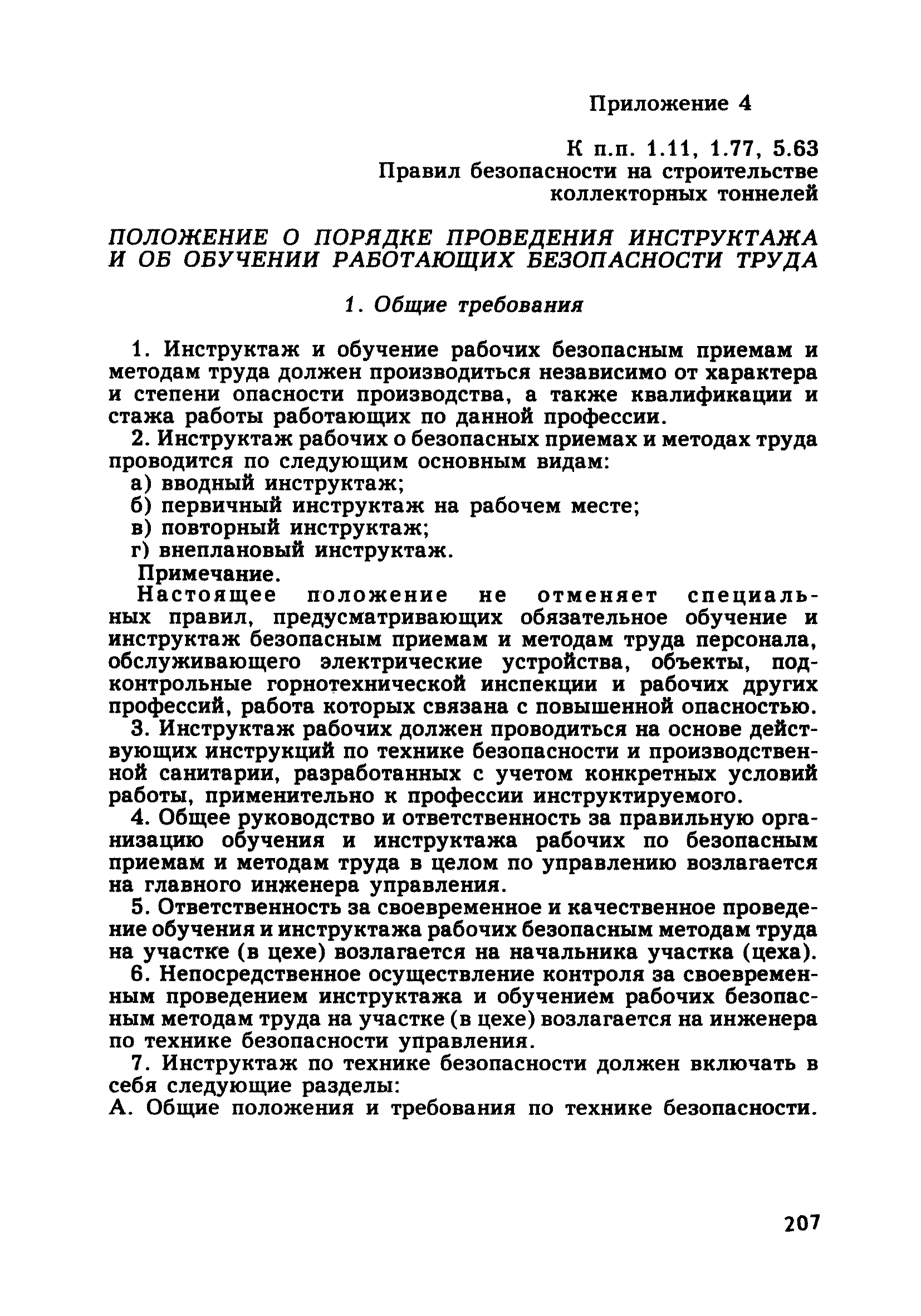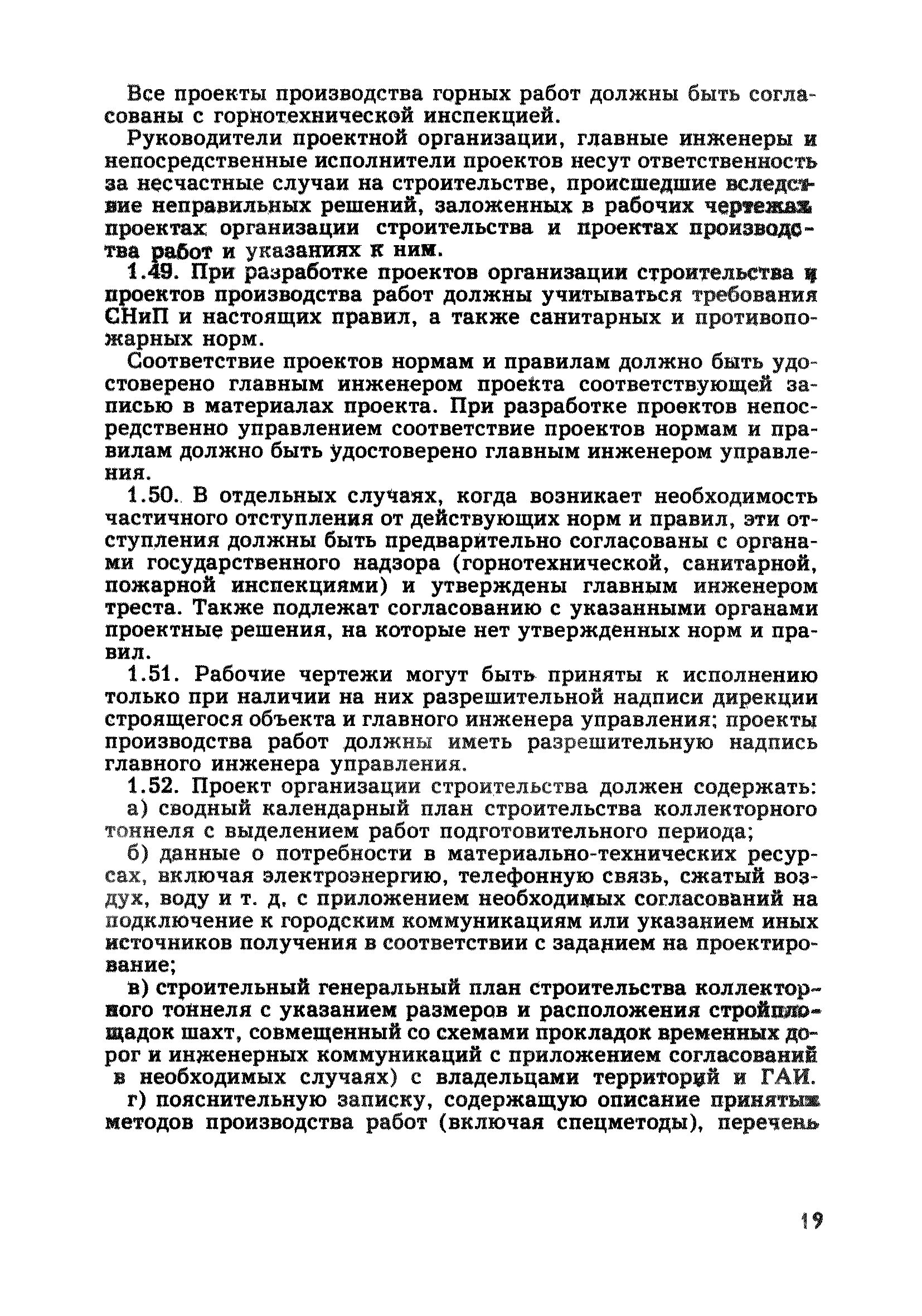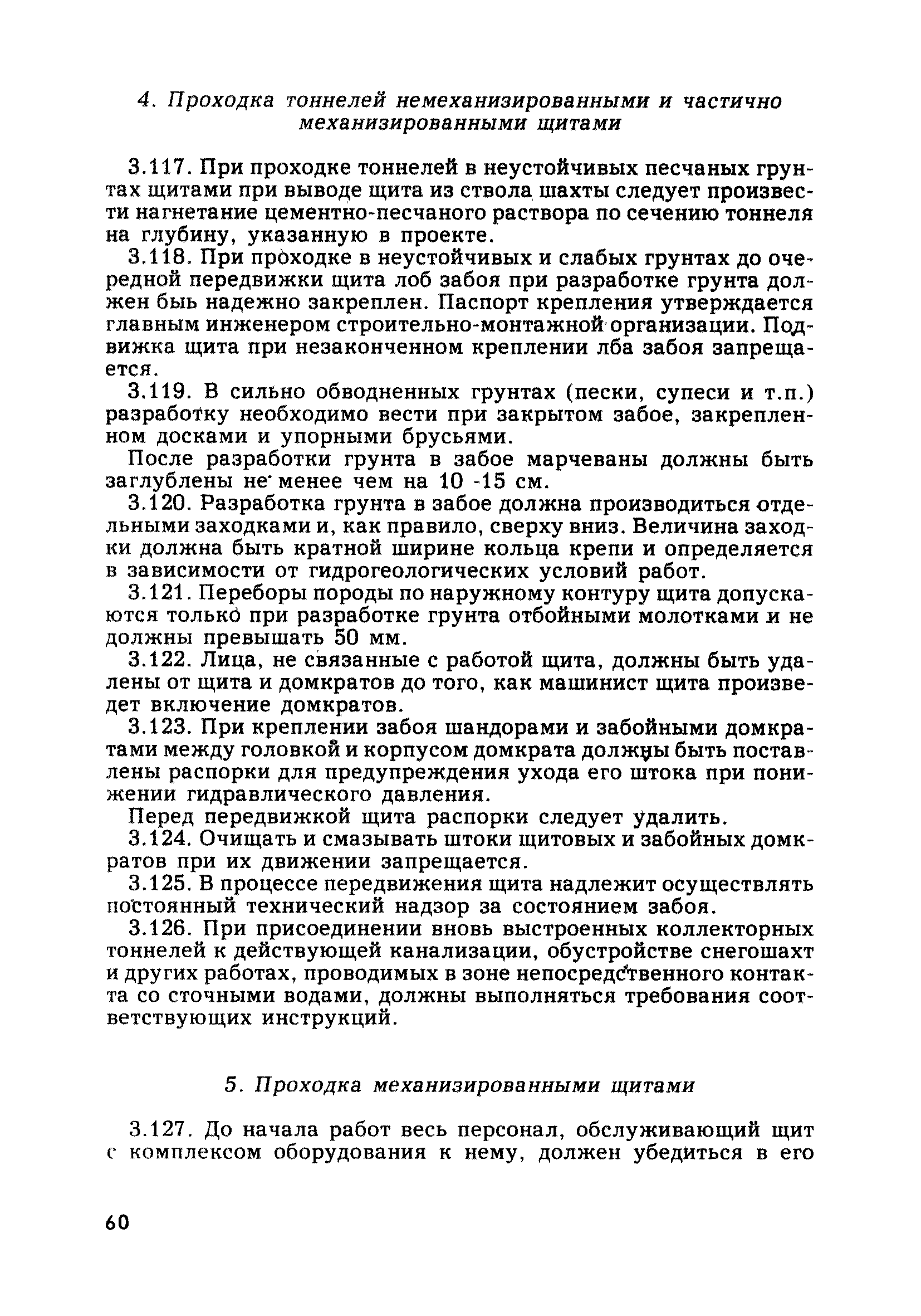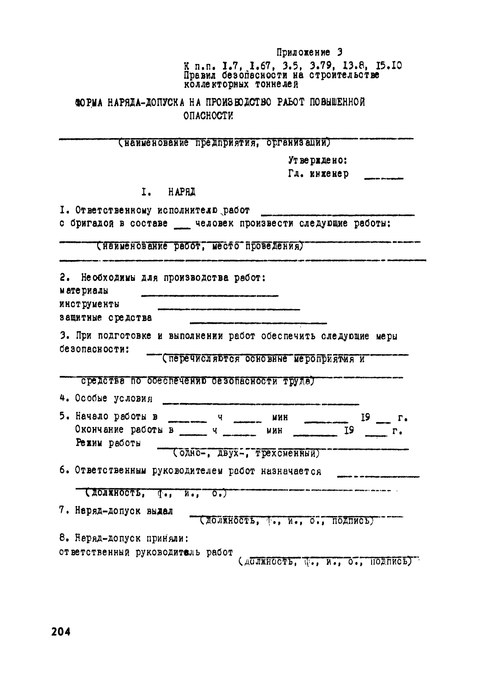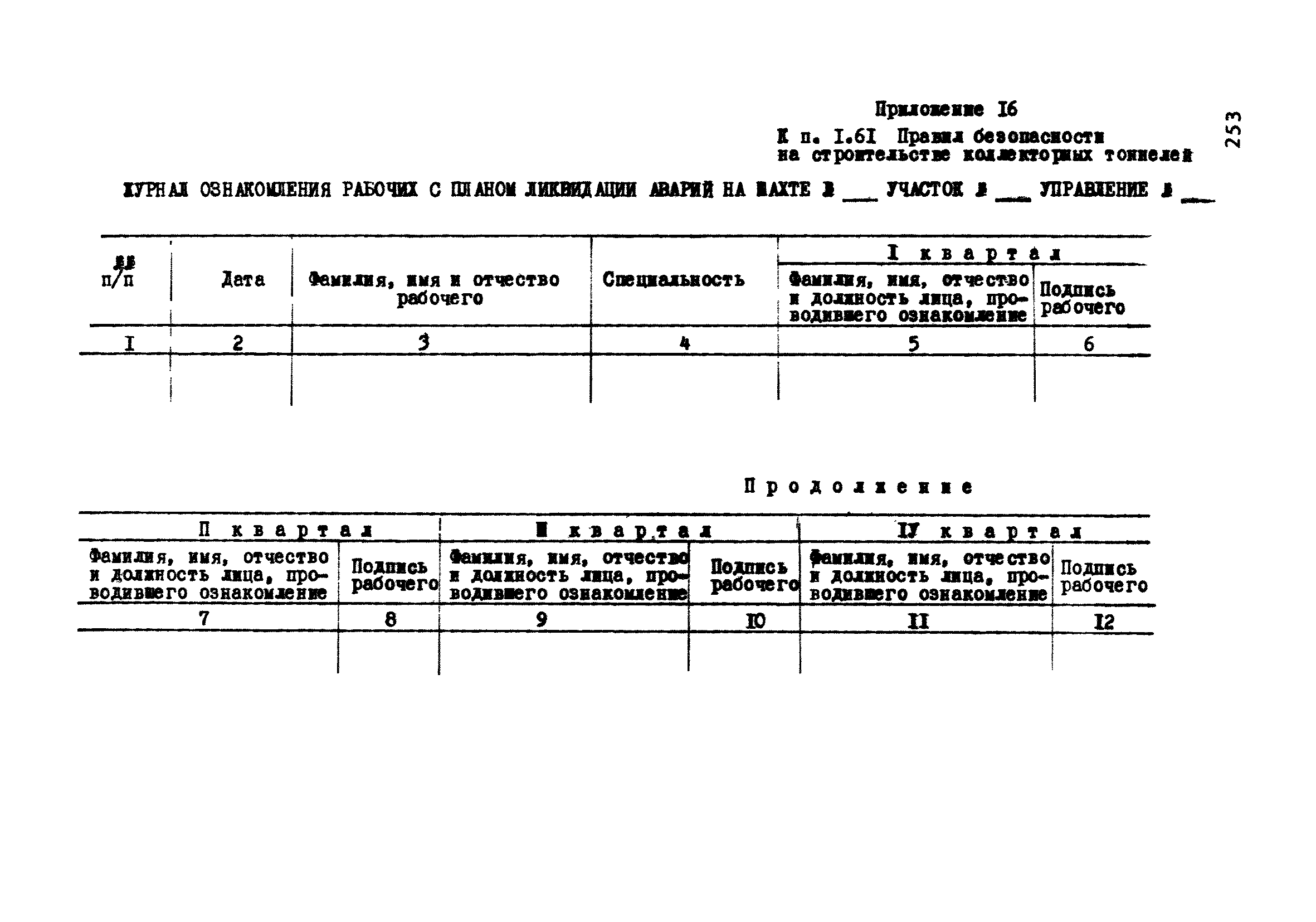 | Оглавление: | Глава 1. Общие правила Глава 2. Строительная площадка Глава 3. Проходка коллекторных тоннелей закрытым способом Глава 4. Сооружение тоннелей открытым способом Глава 5. Специальные способы работ Глава 6. Внутреннее обустройство тоннелей, канализационных насосных станций и стволов шахт Глава 7. Содержание и ликвидация подземных выработок Глава 8. Проветривание подземных выработок Глава 9. Водоотлив Глава 10. Подземный транспорт и шахтный подъем Глава 11. Электротехническое хозяйство Глава 12. Освещение Глава 13. Монтажные и демонтажные работы Глава 14. Строительные машины, механизмы и инструмент Глава 15. Ремонтные работы в действующих тоннельных канализационных коллекторах и шахтах Глава 16. Общие санитарные правила Глава 17. Ответственность за нарушение правил безопасности Приложение 1. Нормы и правила безопасности и производственной санитарии, которыми следует руководствоваться при проектировании и строительстве коллекторных тоннелей и других сооружений Приложение 2. Форма акта-допуска для производства строительно-монтажных работ на территории действующего предприятия Приложение 3. Форма наряда-допуска на производство работ повышенной опасности Приложение 4. Положение о порядке проведения инструктажа и об обучении безопасности труда Приложение 5. Журнал регистрации вводного инструктажа по охране труда Приложение 6. Журнал регистрации инструктажа на рабочем месте Приложение 7. Журнал регистрации проверки знаний работников по технике безопасности Приложение 8. Форма удостоверения для рабочих Приложение 9. Форма удостоверения для инженерно-технических работников Приложение 10. Нормы и сроки испытаний подъемных механизмов и приспособлений Приложение 11. Перечень документации по технике безопасности на объектах работ Приложение 12. Журнал горных работ Приложение 13. Положение о расследовании и учете несчастных случаев на производстве Приложение 14. Журнал проверки техники безопасности (3-ступенчатый контроль) Приложение 15. Методические указания по составлению планов ликвидации аварий Приложение 16. Журнал ознакомления рабочих с планом ликвидации аварий Приложение 17. Предельно допустимые концентрации некоторых вредных веществ в воздухе рабочей зоны Приложение 18. Инструкция по отбору проб воздуха в подземных выработках Приложение 19. Журнал учета результатов анализа воздуха Приложение 20. Книга осмотра вентиляторных установок Приложение 21. Нормы искусственного освещения подземных выработок и открытых строительных площадок при сооружении коллекторных тоннелей Приложение 22. Мероприятия по противопожарной защите при сооружении коллекторных тоннелей Приложение 23. Состав и содержание основных решений по технике безопасности в проектах производства работ (ППР) Приложение 24. Инструкция по составлению паспортов креплений подземных выработок Приложение 25. Книга осмотра крепи и состояния выработок Приложение 26. Книга № 1 для записи результатов осмотра деталей шахтного подъема Приложение 27. Книга № 2 для записи повреждений, обнаруженных на подъемной установке, и мер, принятых к их устранению Приложение 28. Книга № 3 для записи дат навески, снятия и испытания канатов Приложение 29. Нормы браковки стальных канатов Приложение 30. Журнал записи результатов осмотра состояния стволов шахт Приложение 31. Журнал для зап