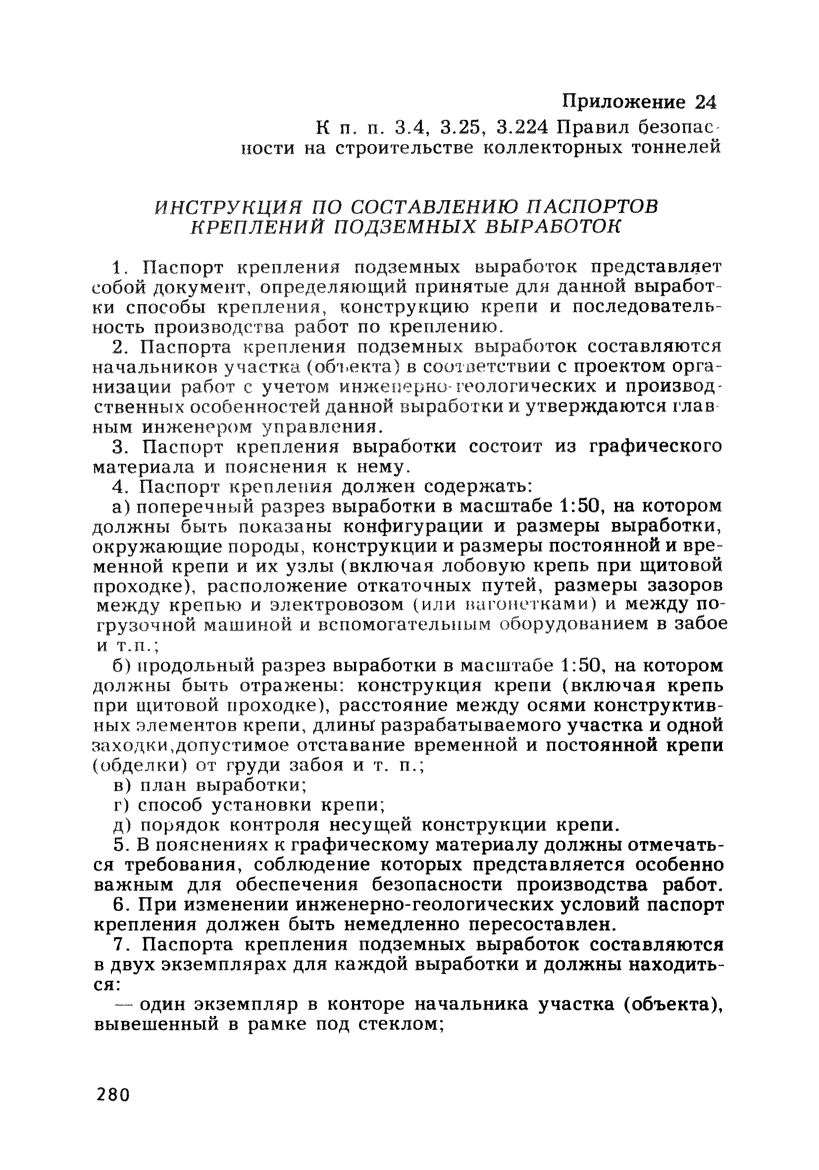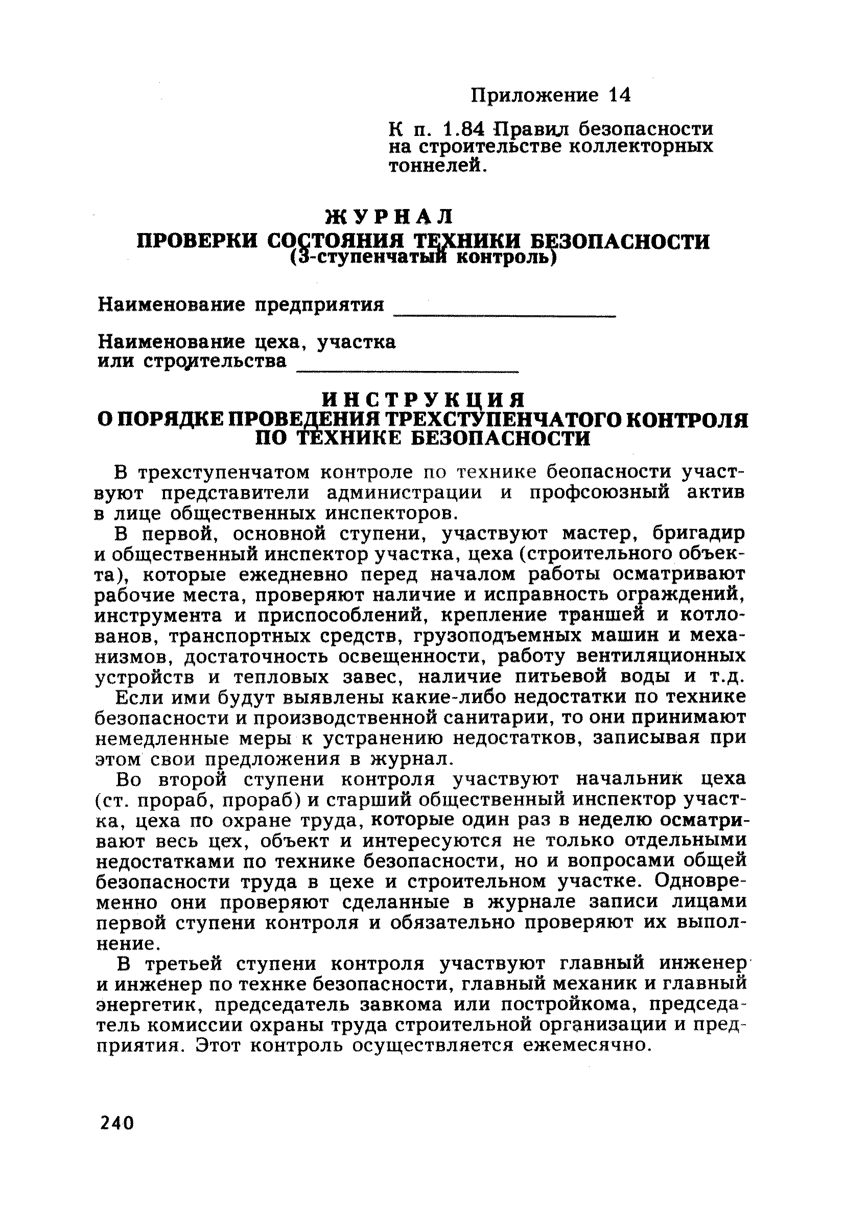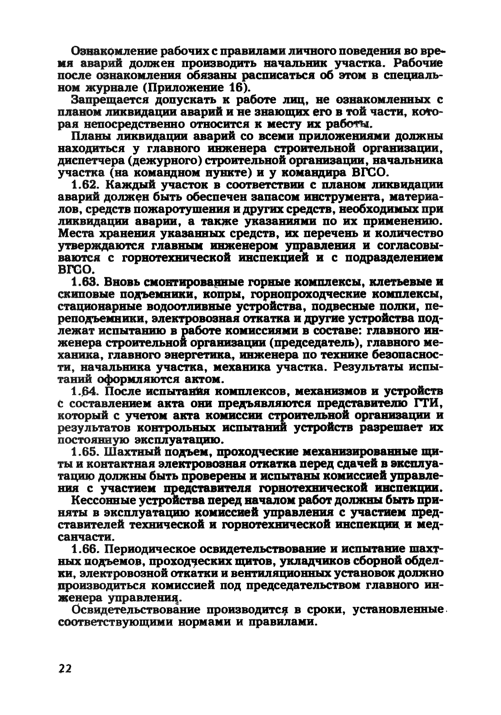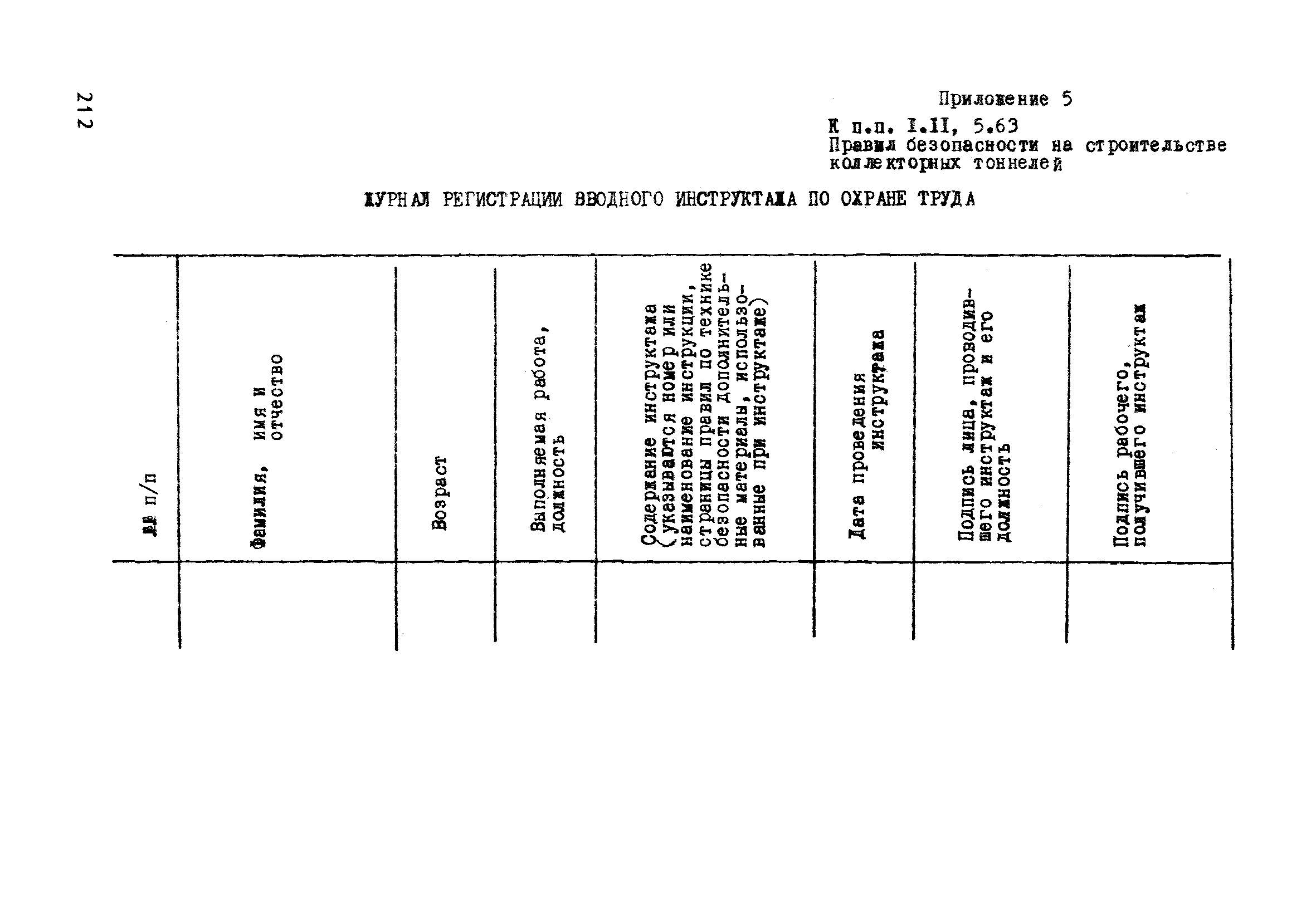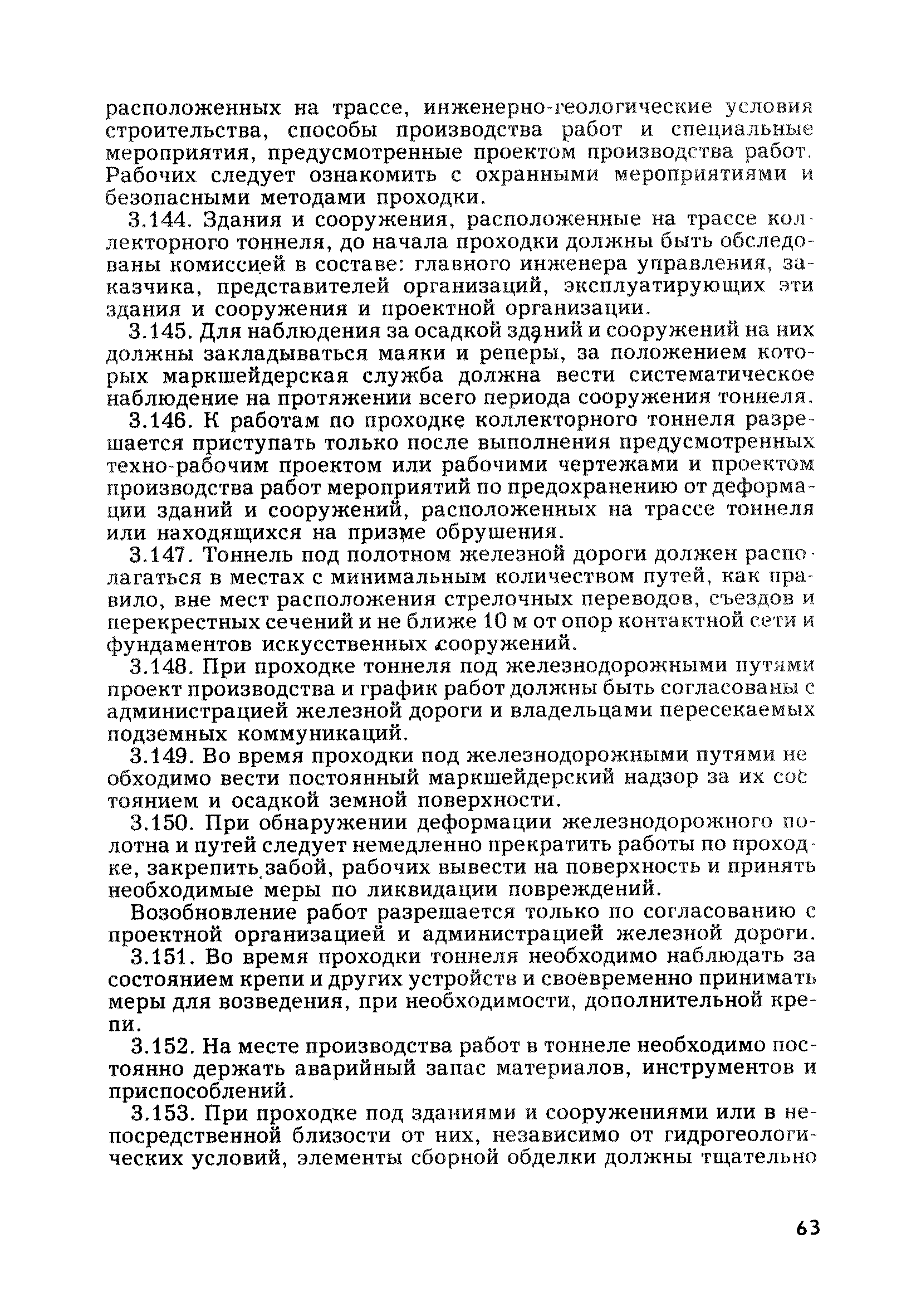 | Оглавление: | Глава 1. Общие правила Глава 2. Строительная площадка Глава 3. Проходка коллекторных тоннелей закрытым способом Глава 4. Сооружение тоннелей открытым способом Глава 5. Специальные способы работ Глава 6. Внутреннее обустройство тоннелей, канализационных насосных станций и стволов шахт Глава 7. Содержание и ликвидация подземных выработок Глава 8. Проветривание подземных выработок Глава 9. Водоотлив Глава 10. Подземный транспорт и шахтный подъем Глава 11. Электротехническое хозяйство Глава 12. Освещение Глава 13. Монтажные и демонтажные работы Глава 14. Строительные машины, механизмы и инструмент Глава 15. Ремонтные работы в действующих тоннельных канализационных коллекторах и шахтах Глава 16. Общие санитарные правила Глава 17. Ответственность за нарушение правил безопасности Приложение 1. Нормы и правила безопасности и производственной санитарии, которыми следует руководствоваться при проектировании и строительстве коллекторных тоннелей и других сооружений Приложение 2. Форма акта-допуска для производства строительно-монтажных работ на территории действующего предприятия Приложение 3. Форма наряда-допуска на производство работ повышенной опасности Приложение 4. Положение о порядке проведения инструктажа и об обучении безопасности труда Приложение 5. Журнал регистрации вводного инструктажа по охране труда Приложение 6. Журнал регистрации инструктажа на рабочем месте Приложение 7. Журнал регистрации проверки знаний работников по технике безопасности Приложение 8. Форма удостоверения для рабочих Приложение 9. Форма удостоверения для инженерно-технических работников Приложение 10. Нормы и сроки испытаний подъемных механизмов и приспособлений Приложение 11. Перечень документации по технике безопасности на объектах работ Приложение 12. Журнал горных работ Приложение 13. Положение о расследовании и учете несчастных случаев на производстве Приложение 14. Журнал проверки техники безопасности (3-ступенчатый контроль) Приложение 15. Методические указания по составлению планов ликвидации аварий Приложение 16. Журнал ознакомления рабочих с планом ликвидации аварий Приложение 17. Предельно допустимые концентрации некоторых вредных веществ в воздухе рабочей зоны Приложение 18. Инструкция по отбору проб воздуха в подземных выработках Приложение 19. Журнал учета результатов анализа воздуха Приложение 20. Книга осмотра вентиляторных установок Приложение 21. Нормы искусственного освещения подземных выработок и открытых строительных площадок при сооружении коллекторных тоннелей Приложение 22. Мероприятия по противопожарной защите при сооружении коллекторных тоннелей Приложение 23. Состав и содержание основных решений по технике безопасности в проектах производства работ (ППР) Приложение 24. Инструкция по составлению паспортов креплений подземных выработок Приложение 25. Книга осмотра крепи и состояния выработок Приложение 26. Книга № 1 для записи результатов осмотра деталей шахтного подъема Приложение 27. Книга № 2 для записи повреждений, обнаруженных на подъемной установке, и мер, принятых к их устранению Приложение 28. Книга № 3 для записи дат навески, снятия и испытания канатов Приложение 29. Нормы браковки стальных канатов Приложение 30. Журнал записи результатов осмотра состояния стволов шахт Приложение 31. Журнал для зап