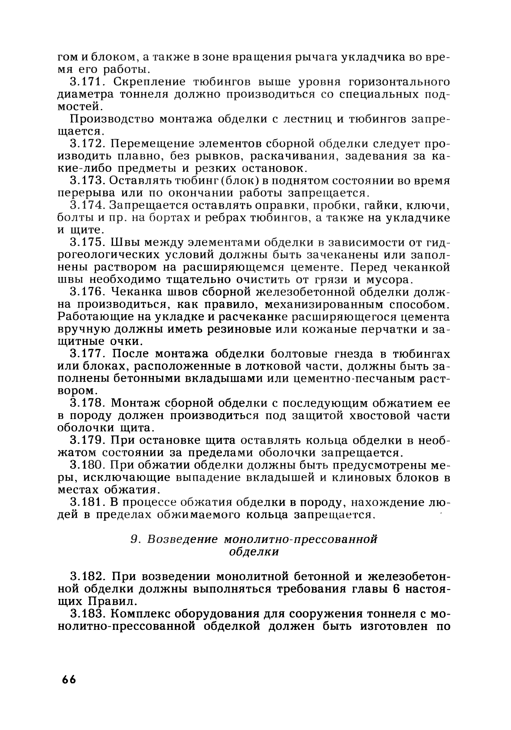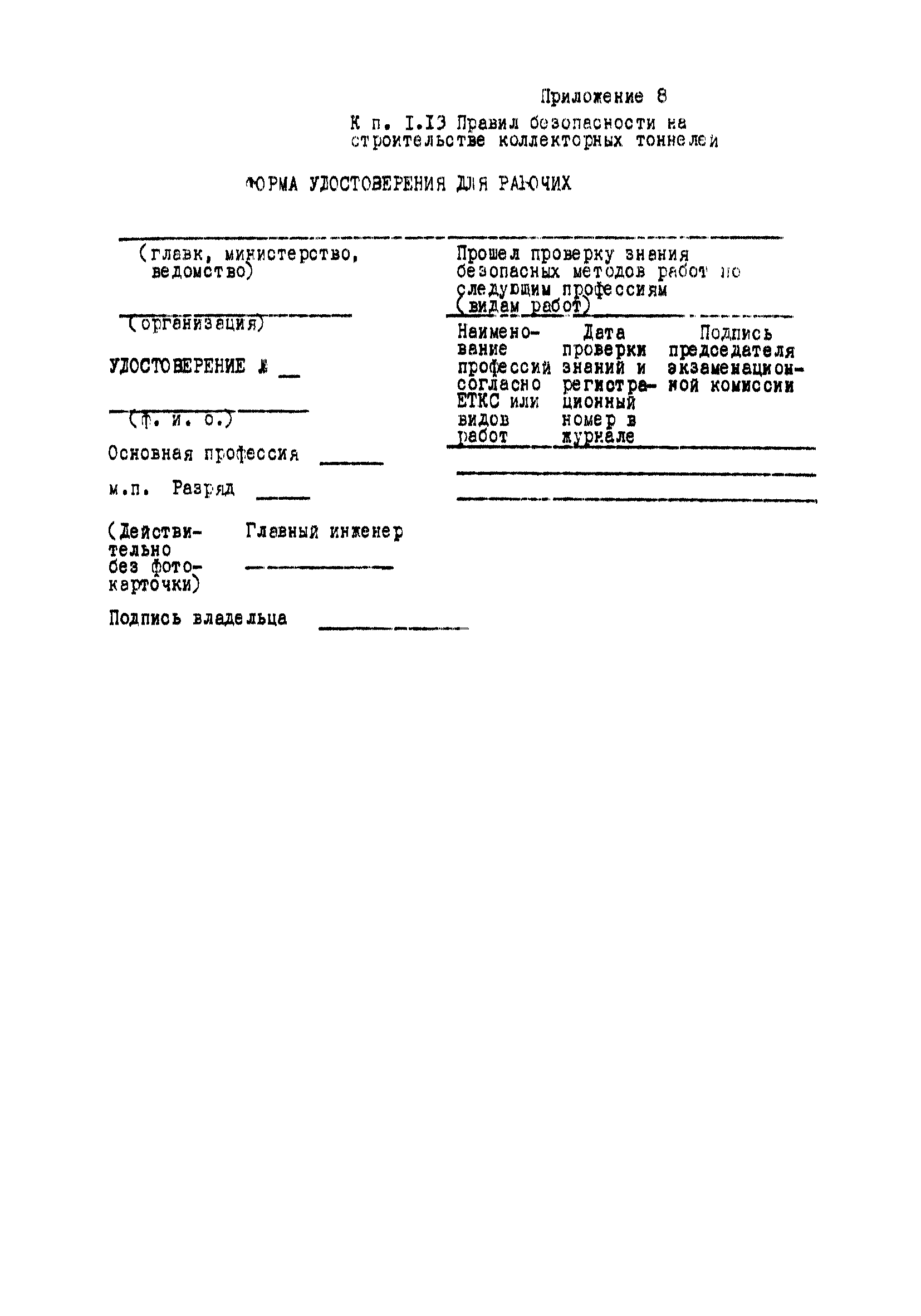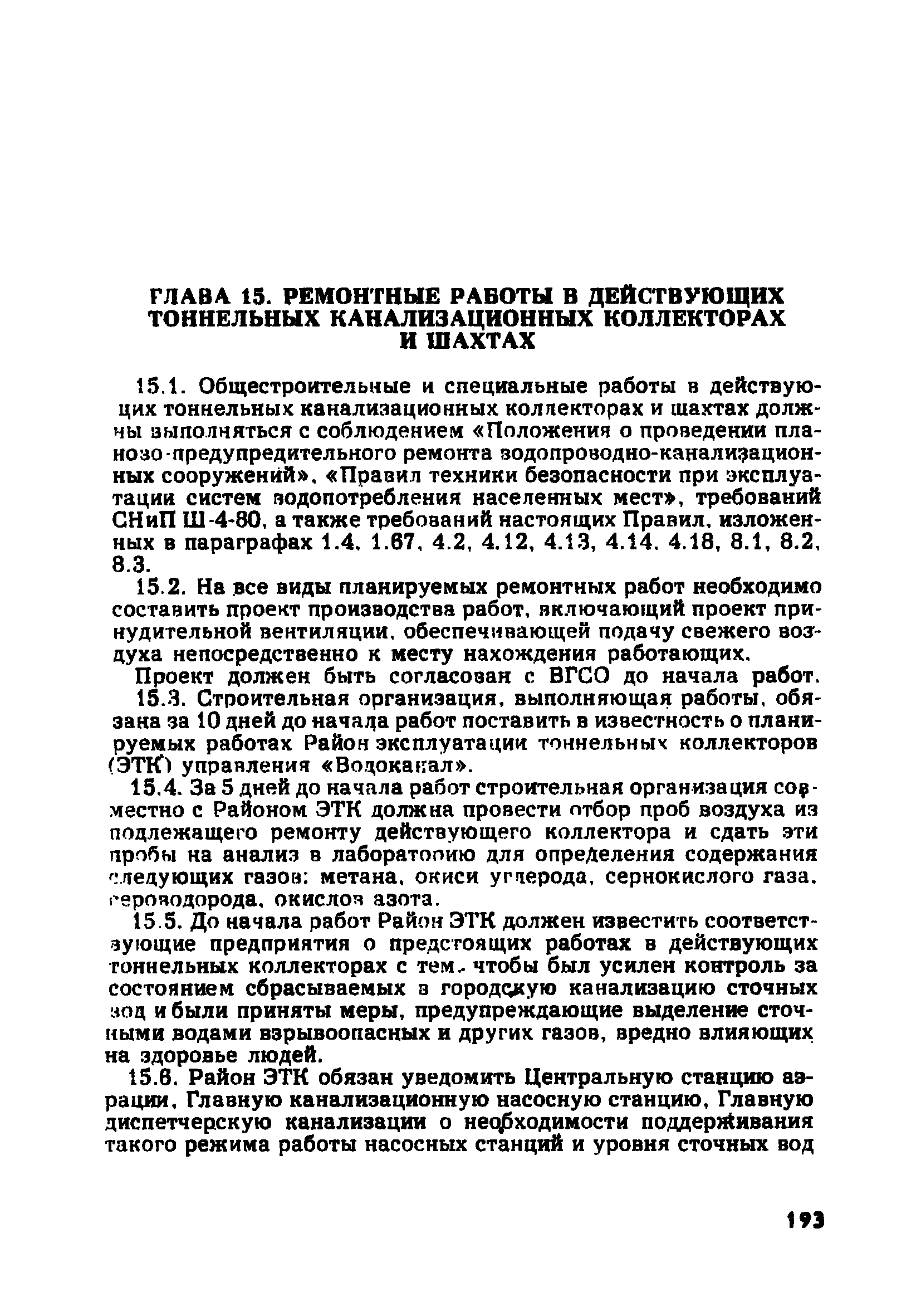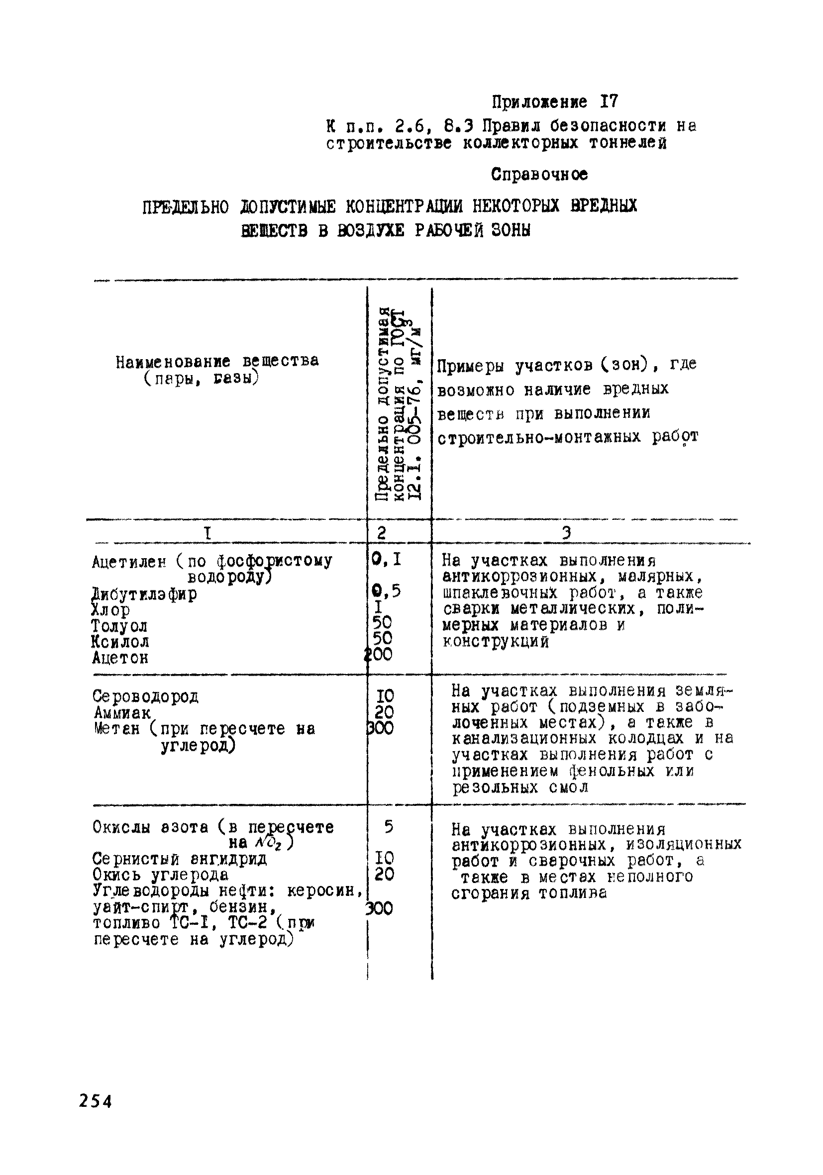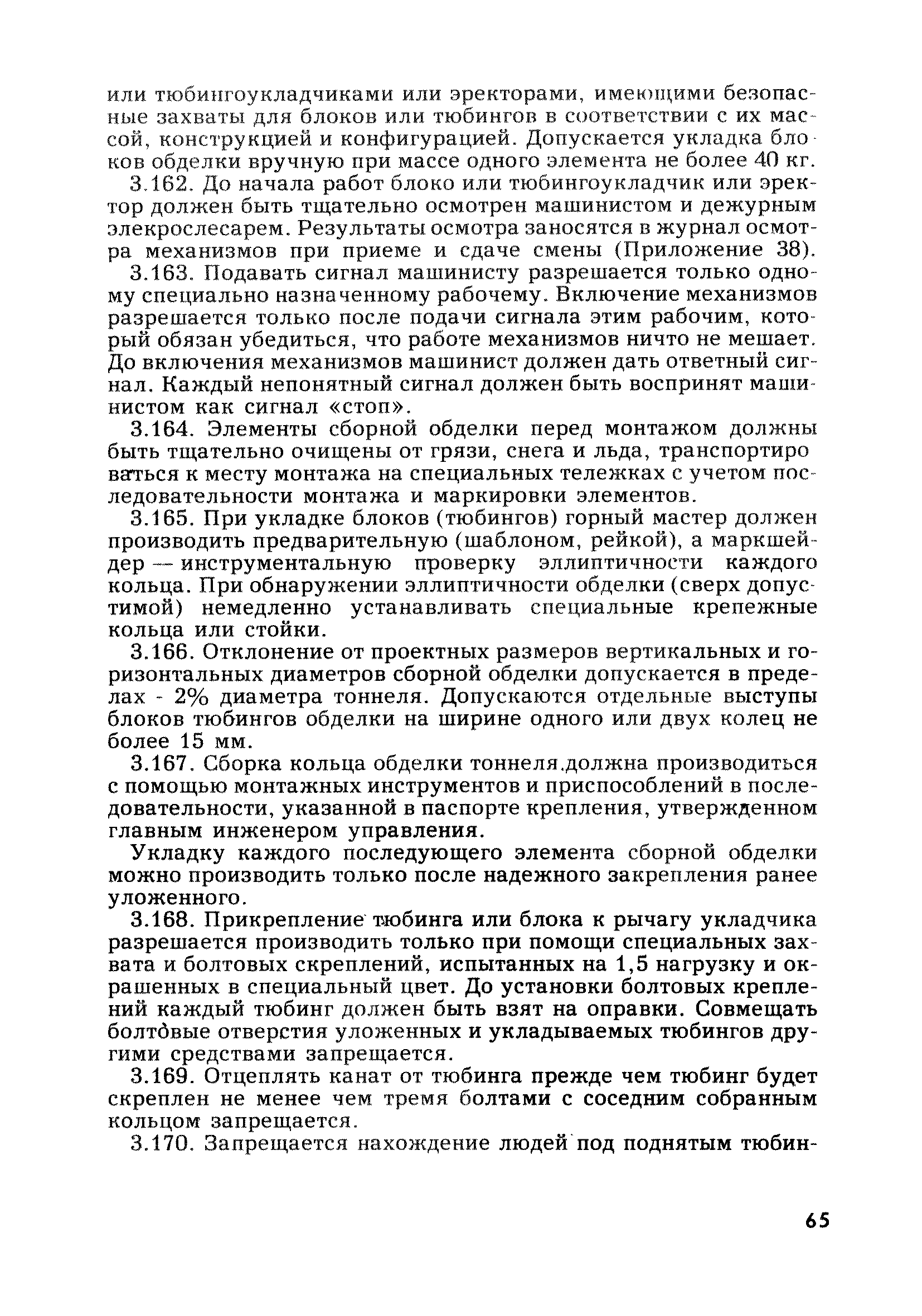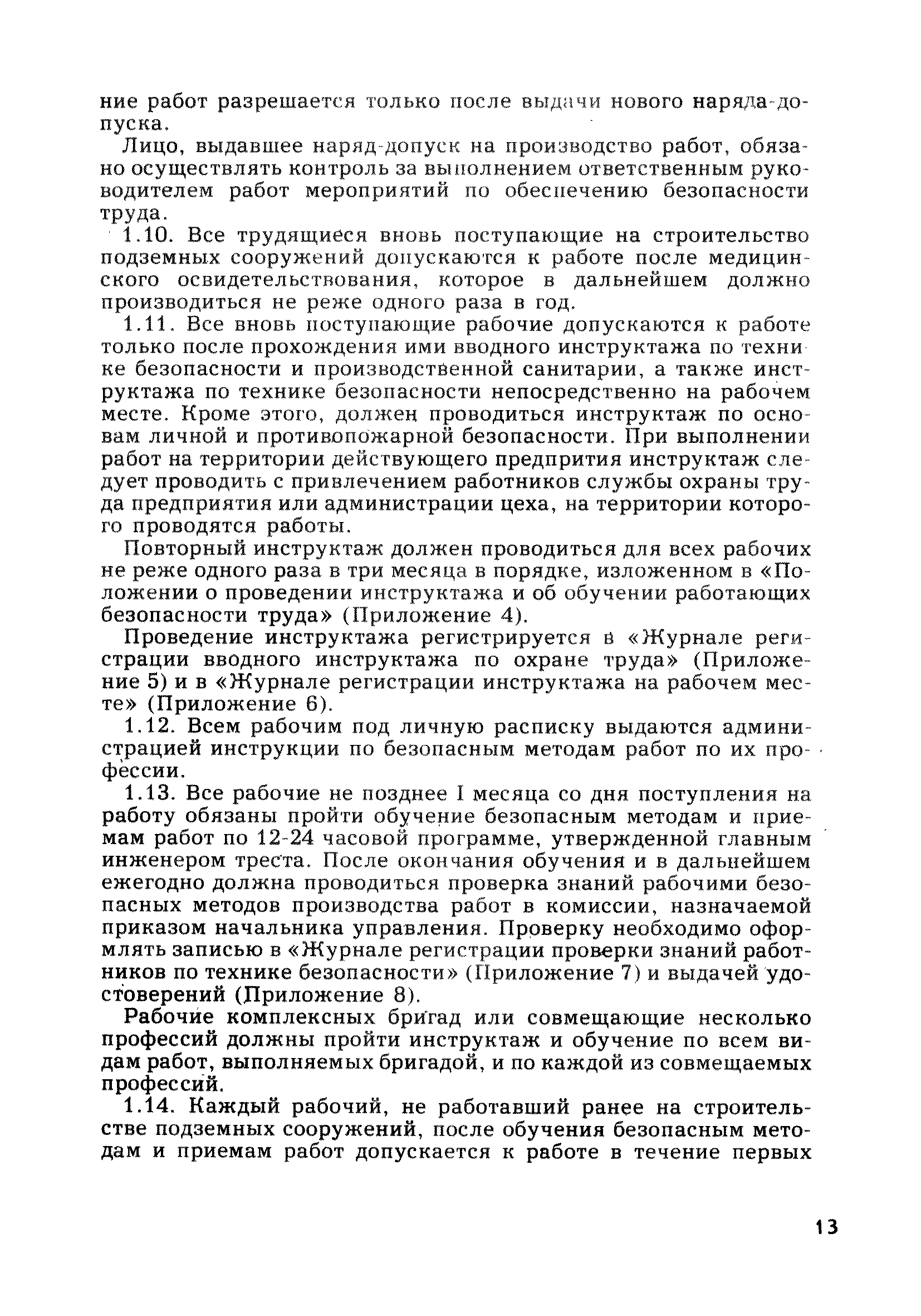 | Оглавление: | Глава 1. Общие правила Глава 2. Строительная площадка Глава 3. Проходка коллекторных тоннелей закрытым способом Глава 4. Сооружение тоннелей открытым способом Глава 5. Специальные способы работ Глава 6. Внутреннее обустройство тоннелей, канализационных насосных станций и стволов шахт Глава 7. Содержание и ликвидация подземных выработок Глава 8. Проветривание подземных выработок Глава 9. Водоотлив Глава 10. Подземный транспорт и шахтный подъем Глава 11. Электротехническое хозяйство Глава 12. Освещение Глава 13. Монтажные и демонтажные работы Глава 14. Строительные машины, механизмы и инструмент Глава 15. Ремонтные работы в действующих тоннельных канализационных коллекторах и шахтах Глава 16. Общие санитарные правила Глава 17. Ответственность за нарушение правил безопасности Приложение 1. Нормы и правила безопасности и производственной санитарии, которыми следует руководствоваться при проектировании и строительстве коллекторных тоннелей и других сооружений Приложение 2. Форма акта-допуска для производства строительно-монтажных работ на территории действующего предприятия Приложение 3. Форма наряда-допуска на производство работ повышенной опасности Приложение 4. Положение о порядке проведения инструктажа и об обучении безопасности труда Приложение 5. Журнал регистрации вводного инструктажа по охране труда Приложение 6. Журнал регистрации инструктажа на рабочем месте Приложение 7. Журнал регистрации проверки знаний работников по технике безопасности Приложение 8. Форма удостоверения для рабочих Приложение 9. Форма удостоверения для инженерно-технических работников Приложение 10. Нормы и сроки испытаний подъемных механизмов и приспособлений Приложение 11. Перечень документации по технике безопасности на объектах работ Приложение 12. Журнал горных работ Приложение 13. Положение о расследовании и учете несчастных случаев на производстве Приложение 14. Журнал проверки техники безопасности (3-ступенчатый контроль) Приложение 15. Методические указания по составлению планов ликвидации аварий Приложение 16. Журнал ознакомления рабочих с планом ликвидации аварий Приложение 17. Предельно допустимые концентрации некоторых вредных веществ в воздухе рабочей зоны Приложение 18. Инструкция по отбору проб воздуха в подземных выработках Приложение 19. Журнал учета результатов анализа воздуха Приложение 20. Книга осмотра вентиляторных установок Приложение 21. Нормы искусственного освещения подземных выработок и открытых строительных площадок при сооружении коллекторных тоннелей Приложение 22. Мероприятия по противопожарной защите при сооружении коллекторных тоннелей Приложение 23. Состав и содержание основных решений по технике безопасности в проектах производства работ (ППР) Приложение 24. Инструкция по составлению паспортов креплений подземных выработок Приложение 25. Книга осмотра крепи и состояния выработок Приложение 26. Книга № 1 для записи результатов осмотра деталей шахтного подъема Приложение 27. Книга № 2 для записи повреждений, обнаруженных на подъемной установке, и мер, принятых к их устранению Приложение 28. Книга № 3 для записи дат навески, снятия и испытания канатов Приложение 29. Нормы браковки стальных канатов Приложение 30. Журнал записи результатов осмотра состояния стволов шахт Приложение 31. Журнал для зап