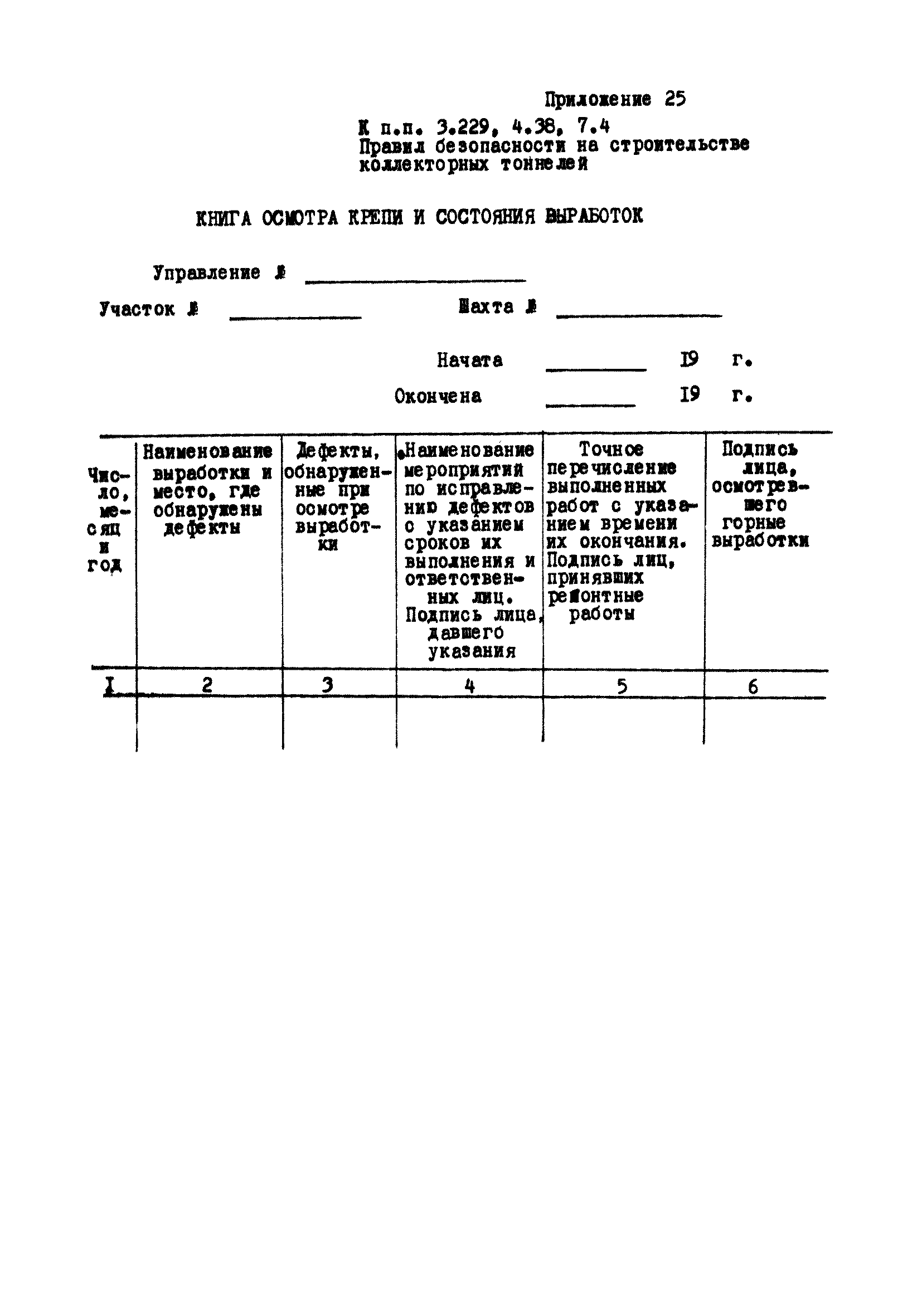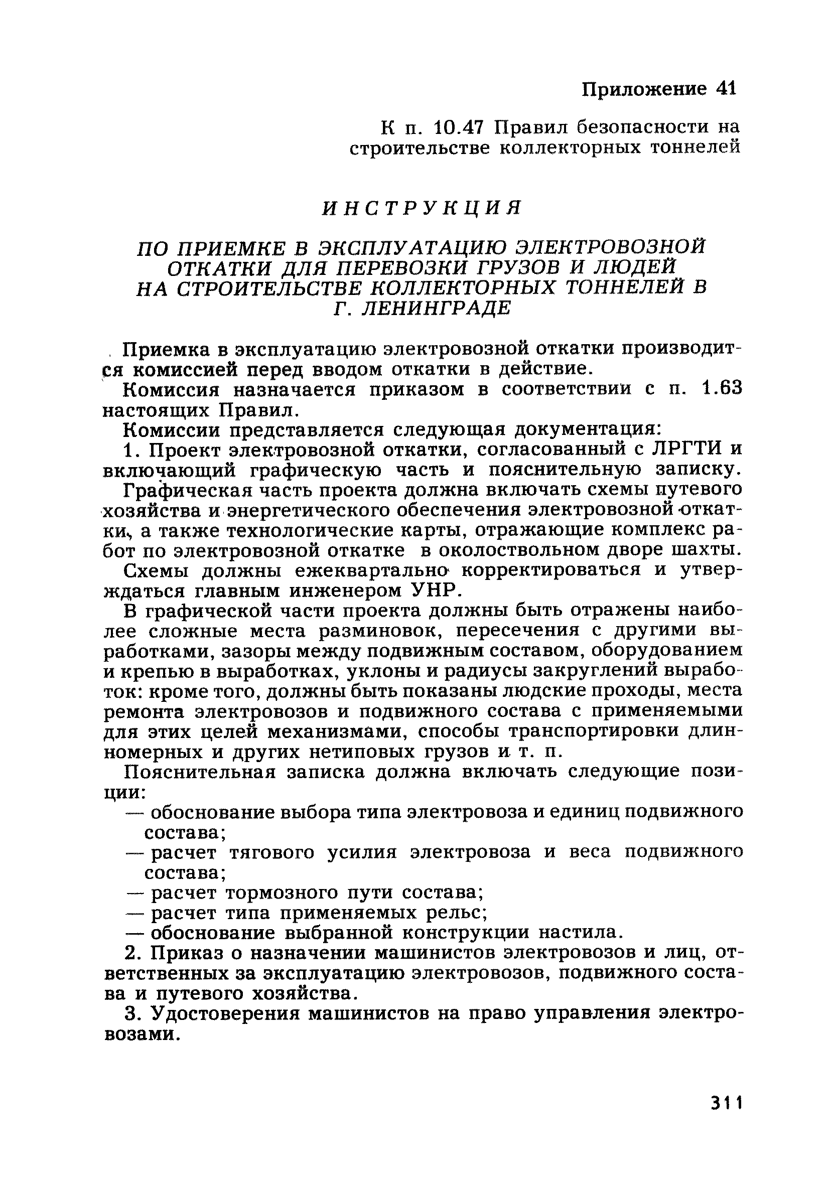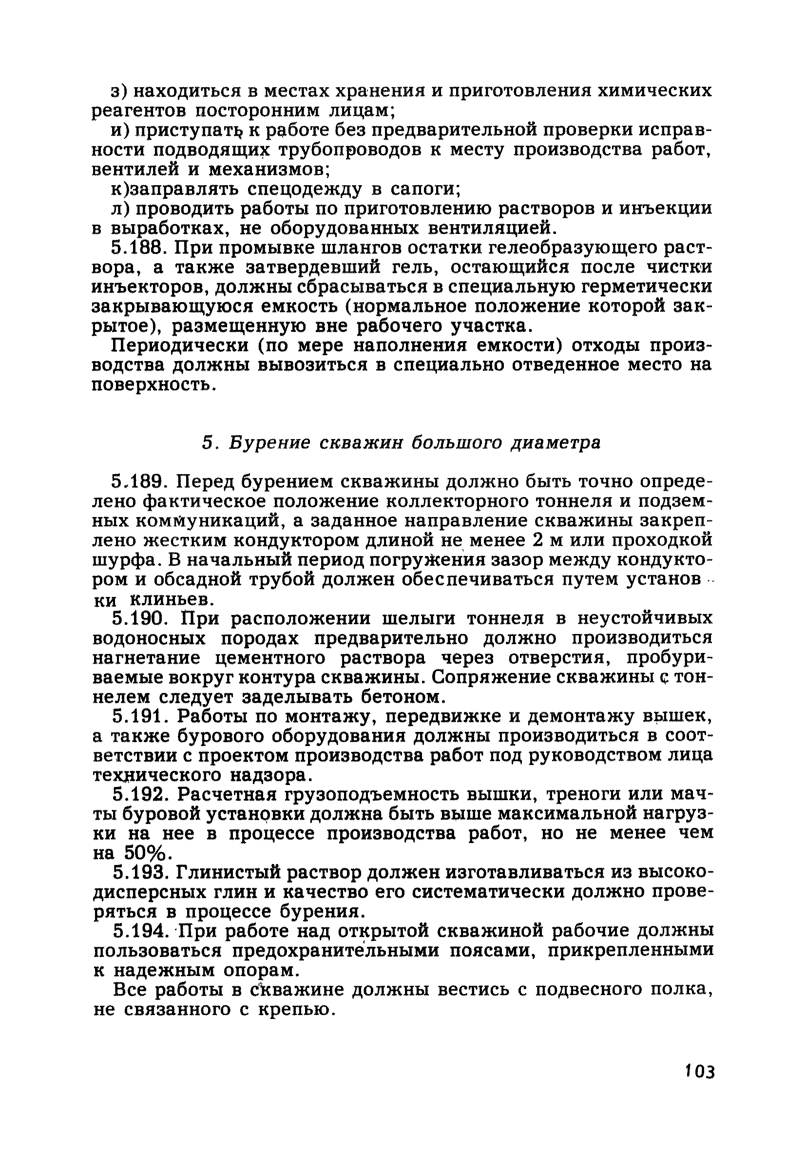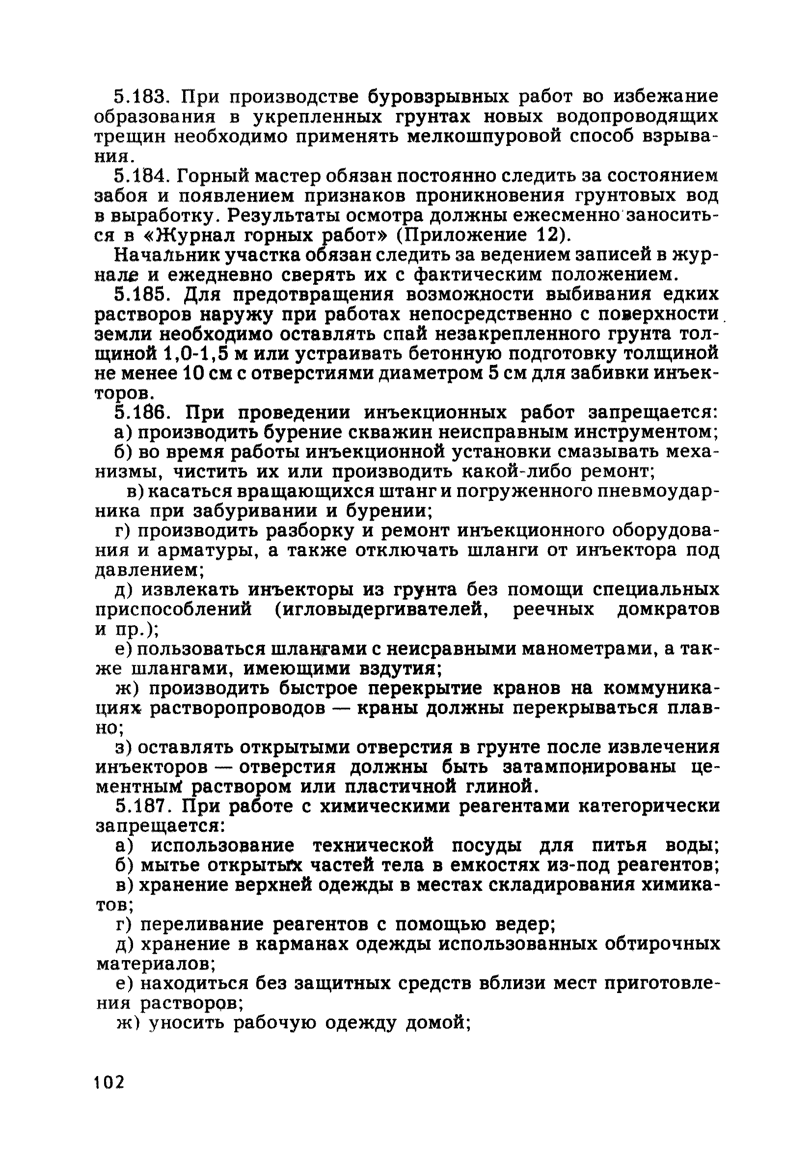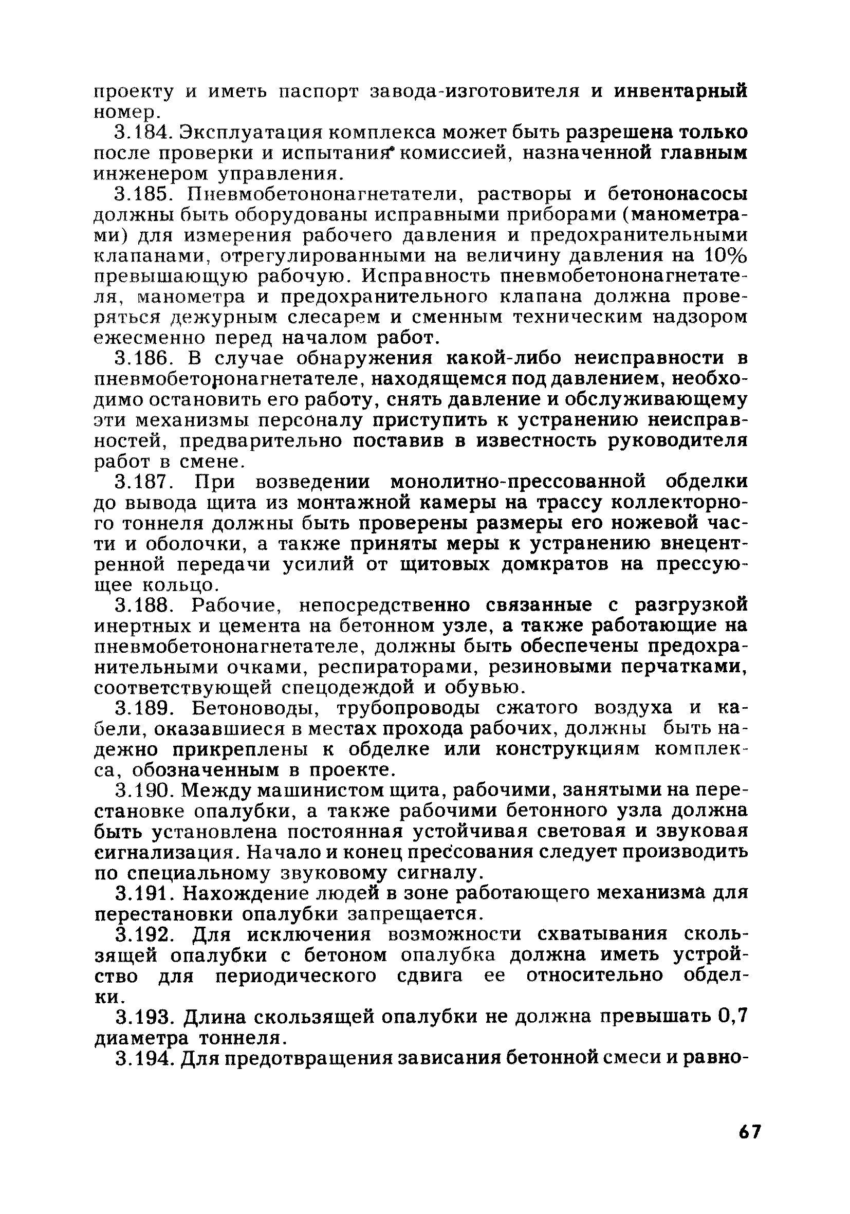 | Оглавление: | Глава 1. Общие правила Глава 2. Строительная площадка Глава 3. Проходка коллекторных тоннелей закрытым способом Глава 4. Сооружение тоннелей открытым способом Глава 5. Специальные способы работ Глава 6. Внутреннее обустройство тоннелей, канализационных насосных станций и стволов шахт Глава 7. Содержание и ликвидация подземных выработок Глава 8. Проветривание подземных выработок Глава 9. Водоотлив Глава 10. Подземный транспорт и шахтный подъем Глава 11. Электротехническое хозяйство Глава 12. Освещение Глава 13. Монтажные и демонтажные работы Глава 14. Строительные машины, механизмы и инструмент Глава 15. Ремонтные работы в действующих тоннельных канализационных коллекторах и шахтах Глава 16. Общие санитарные правила Глава 17. Ответственность за нарушение правил безопасности Приложение 1. Нормы и правила безопасности и производственной санитарии, которыми следует руководствоваться при проектировании и строительстве коллекторных тоннелей и других сооружений Приложение 2. Форма акта-допуска для производства строительно-монтажных работ на территории действующего предприятия Приложение 3. Форма наряда-допуска на производство работ повышенной опасности Приложение 4. Положение о порядке проведения инструктажа и об обучении безопасности труда Приложение 5. Журнал регистрации вводного инструктажа по охране труда Приложение 6. Журнал регистрации инструктажа на рабочем месте Приложение 7. Журнал регистрации проверки знаний работников по технике безопасности Приложение 8. Форма удостоверения для рабочих Приложение 9. Форма удостоверения для инженерно-технических работников Приложение 10. Нормы и сроки испытаний подъемных механизмов и приспособлений Приложение 11. Перечень документации по технике безопасности на объектах работ Приложение 12. Журнал горных работ Приложение 13. Положение о расследовании и учете несчастных случаев на производстве Приложение 14. Журнал проверки техники безопасности (3-ступенчатый контроль) Приложение 15. Методические указания по составлению планов ликвидации аварий Приложение 16. Журнал ознакомления рабочих с планом ликвидации аварий Приложение 17. Предельно допустимые концентрации некоторых вредных веществ в воздухе рабочей зоны Приложение 18. Инструкция по отбору проб воздуха в подземных выработках Приложение 19. Журнал учета результатов анализа воздуха Приложение 20. Книга осмотра вентиляторных установок Приложение 21. Нормы искусственного освещения подземных выработок и открытых строительных площадок при сооружении коллекторных тоннелей Приложение 22. Мероприятия по противопожарной защите при сооружении коллекторных тоннелей Приложение 23. Состав и содержание основных решений по технике безопасности в проектах производства работ (ППР) Приложение 24. Инструкция по составлению паспортов креплений подземных выработок Приложение 25. Книга осмотра крепи и состояния выработок Приложение 26. Книга № 1 для записи результатов осмотра деталей шахтного подъема Приложение 27. Книга № 2 для записи повреждений, обнаруженных на подъемной установке, и мер, принятых к их устранению Приложение 28. Книга № 3 для записи дат навески, снятия и испытания канатов Приложение 29. Нормы браковки стальных канатов Приложение 30. Журнал записи результатов осмотра состояния стволов шахт Приложение 31. Журнал для зап